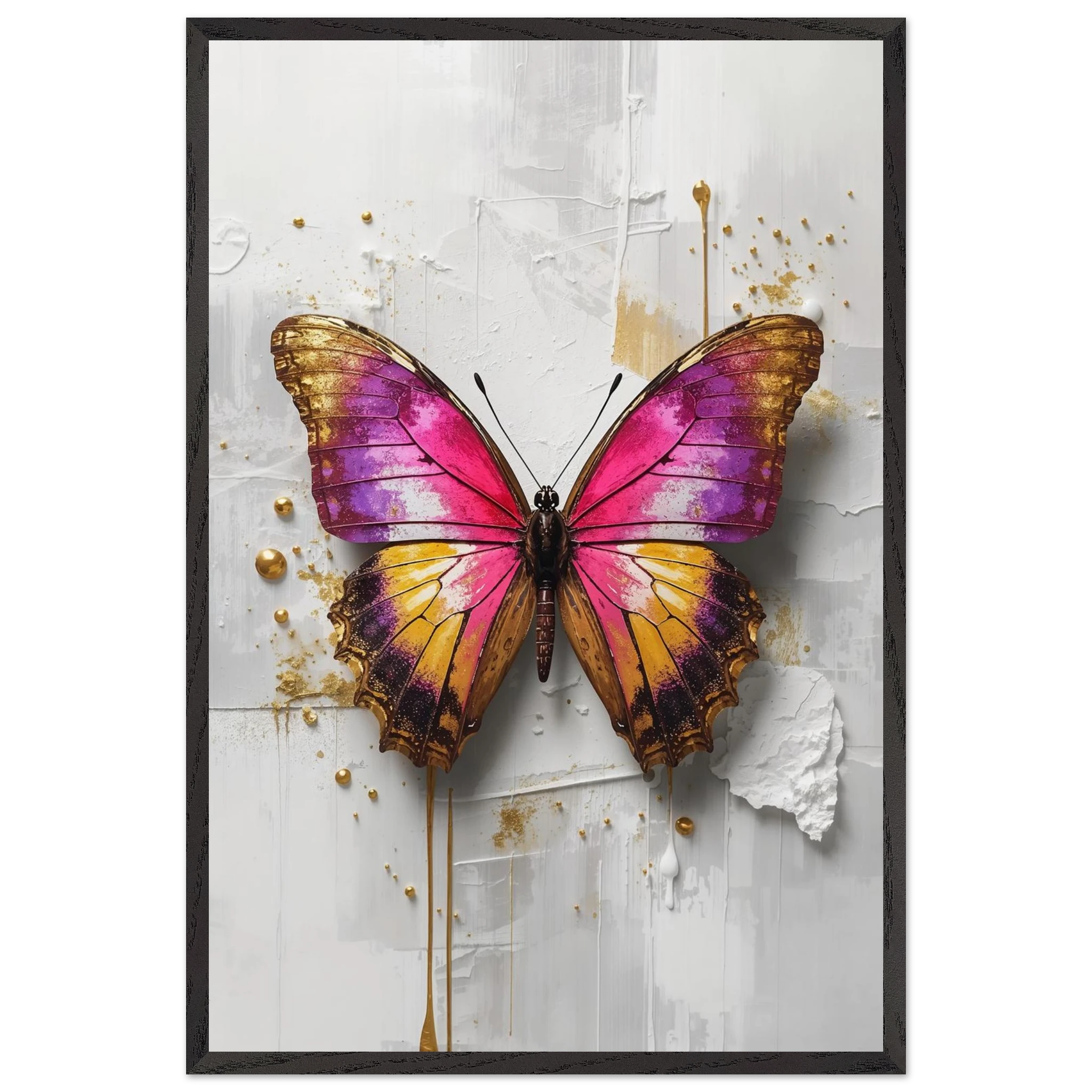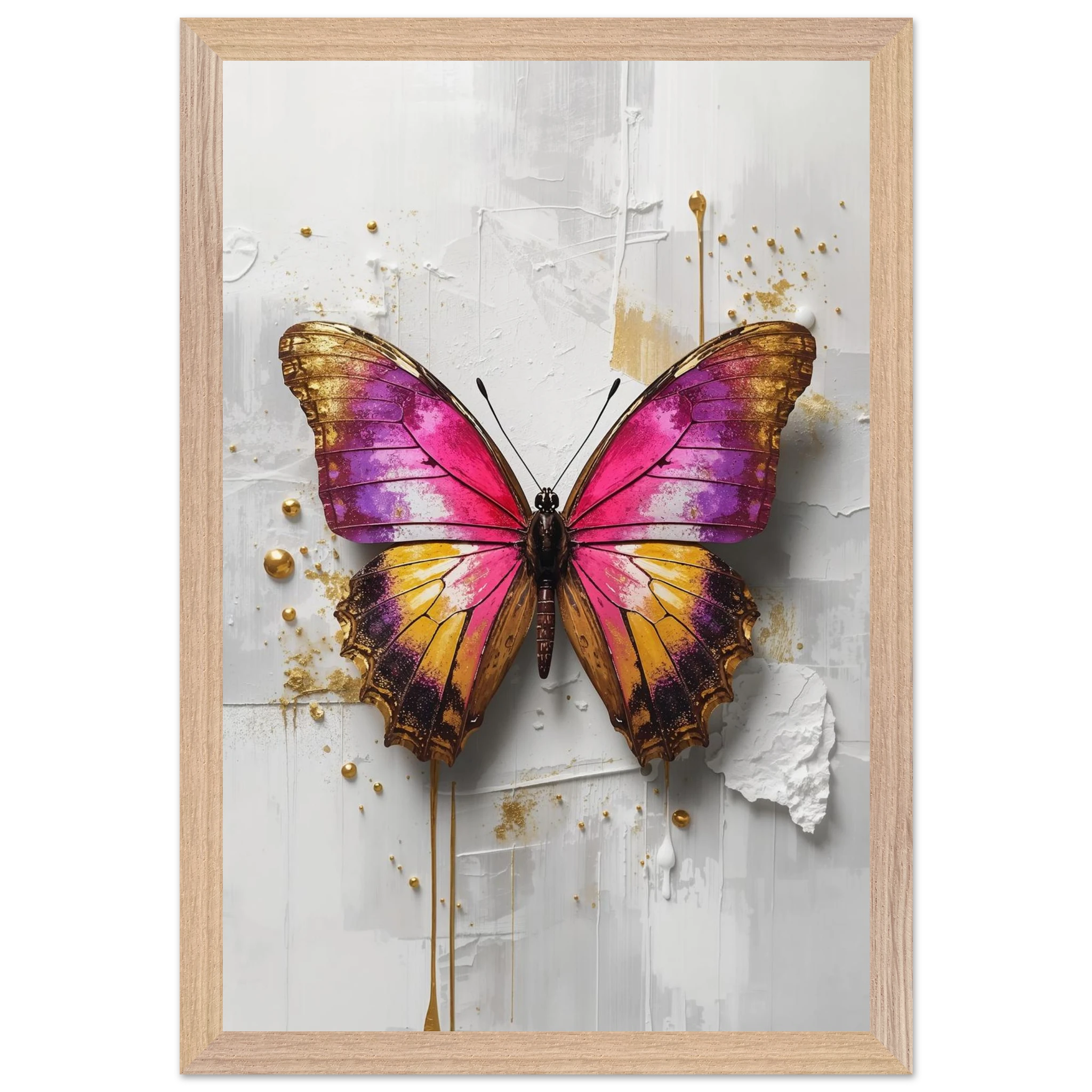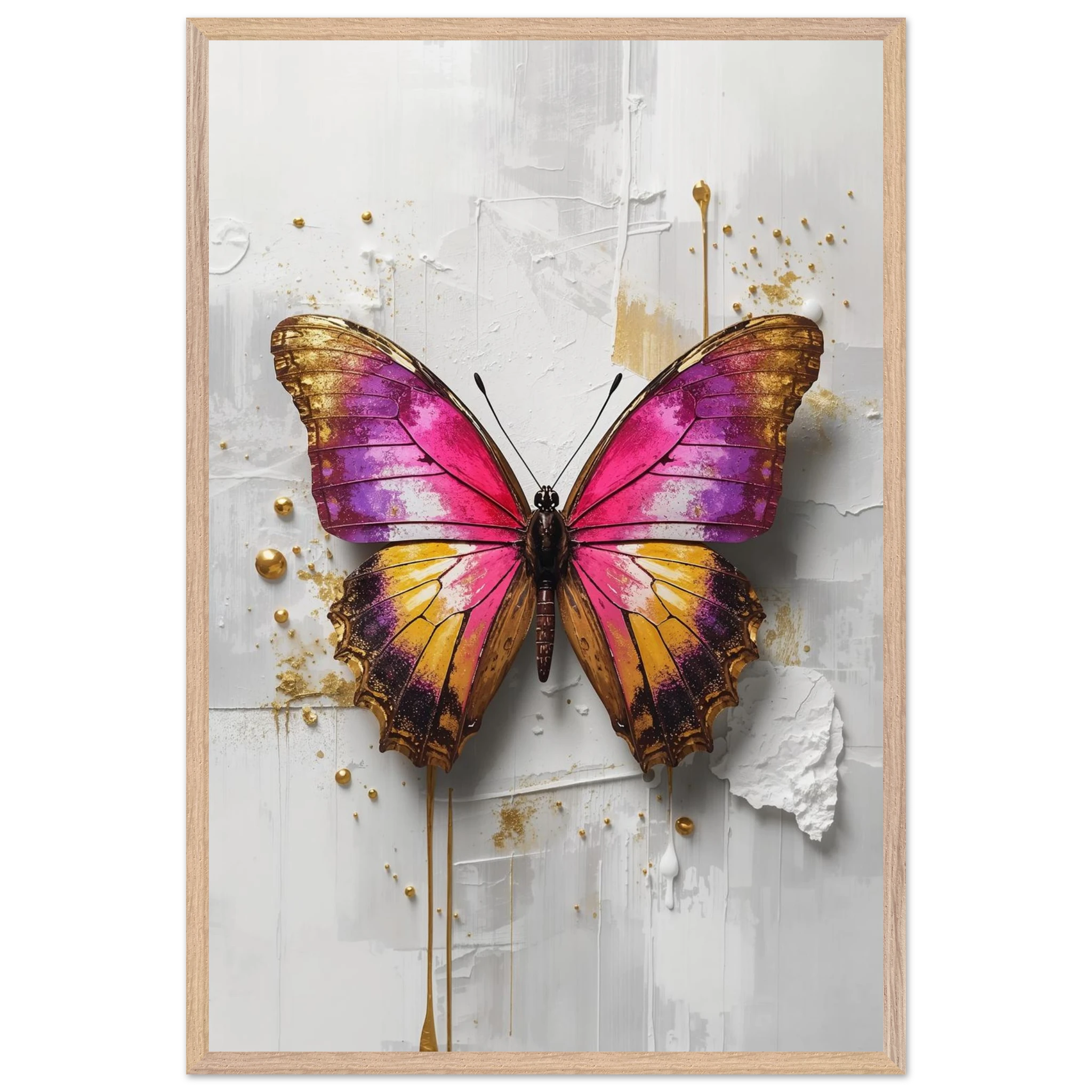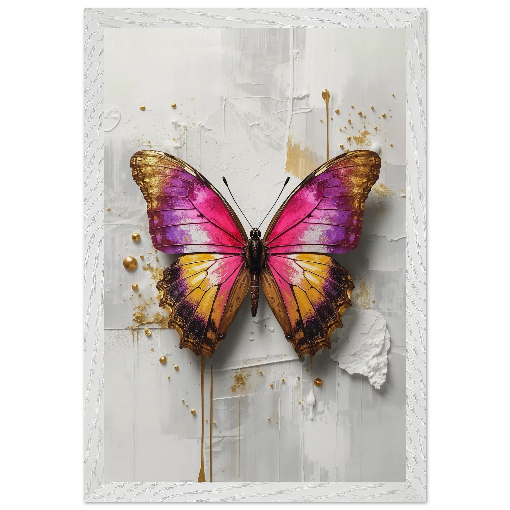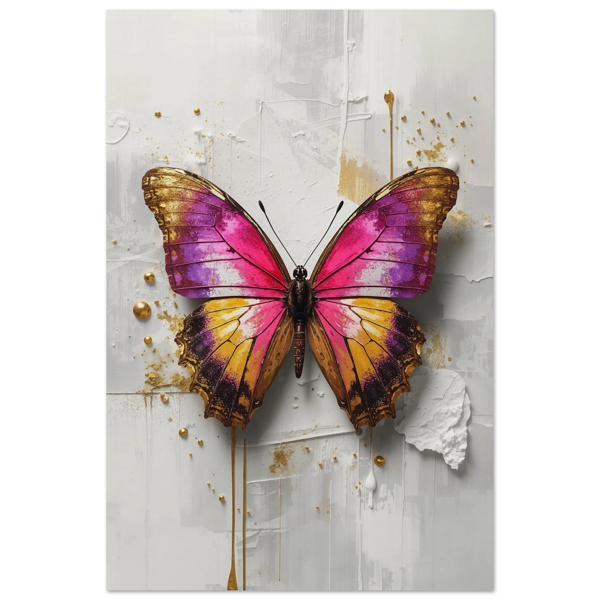 This vibrant print features a large, stylised butterfly with intricate wings in pink, purple, yellow, and gold. Textured brushstrokes and metallic gold accents create a luxurious, modern aesthetic against a soft white abstract background. Perfect for bold, contemporary wall decor.