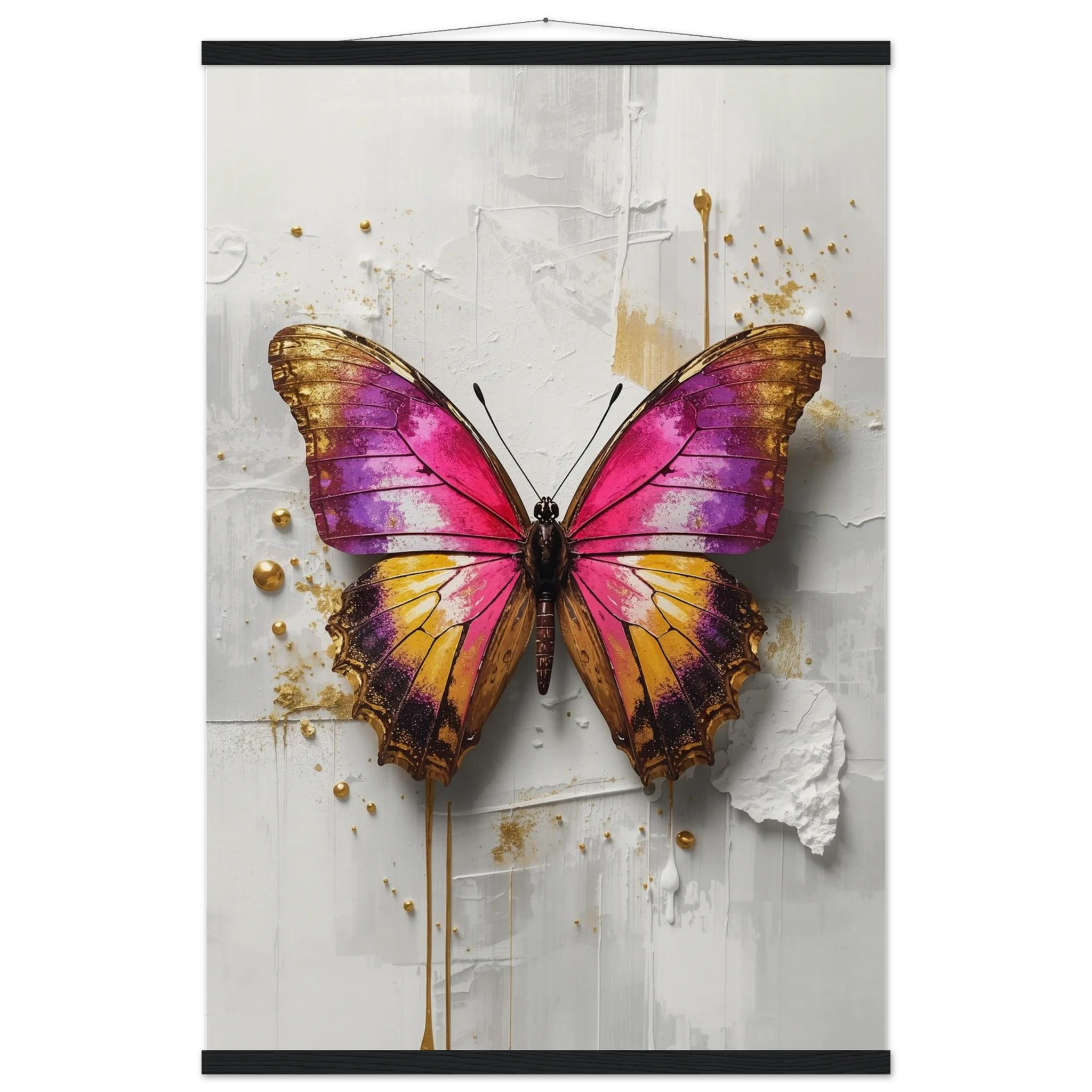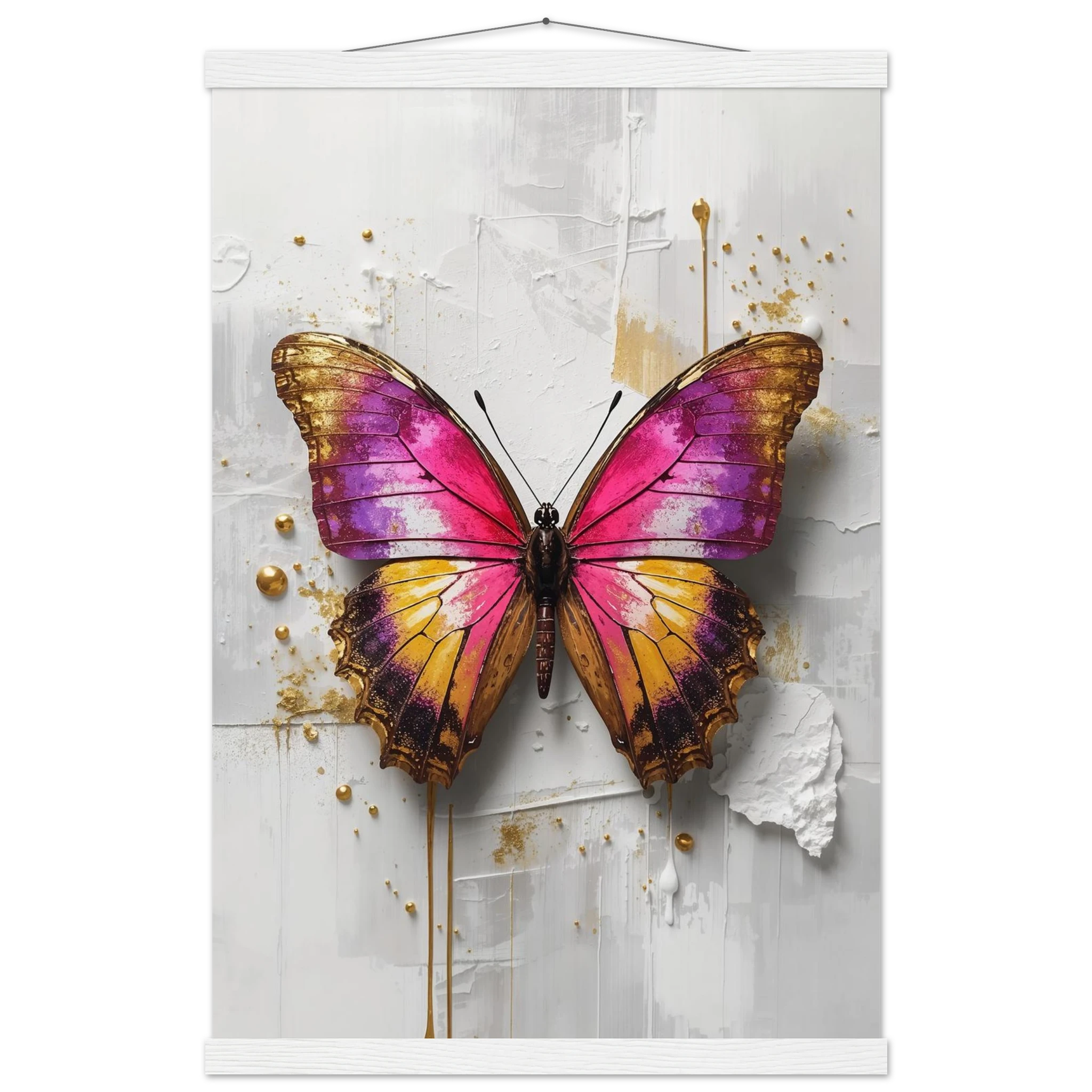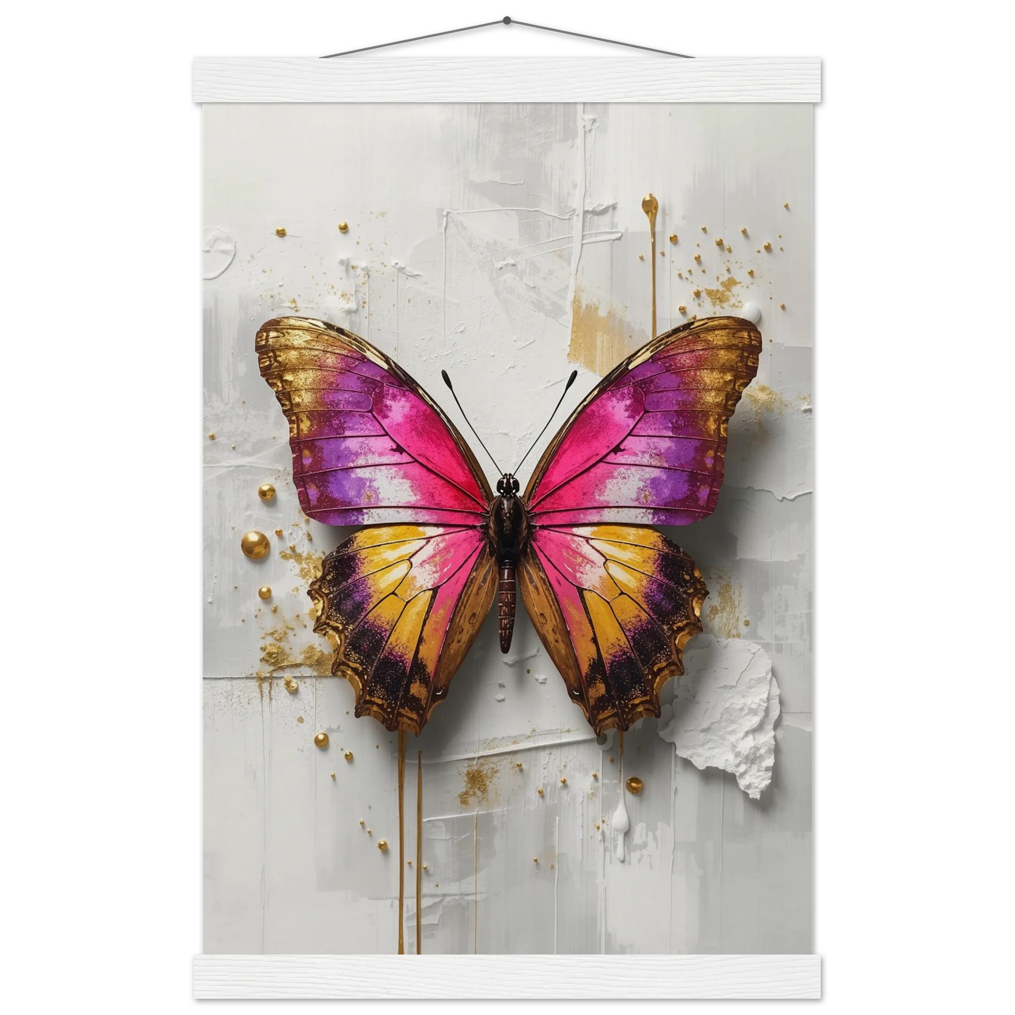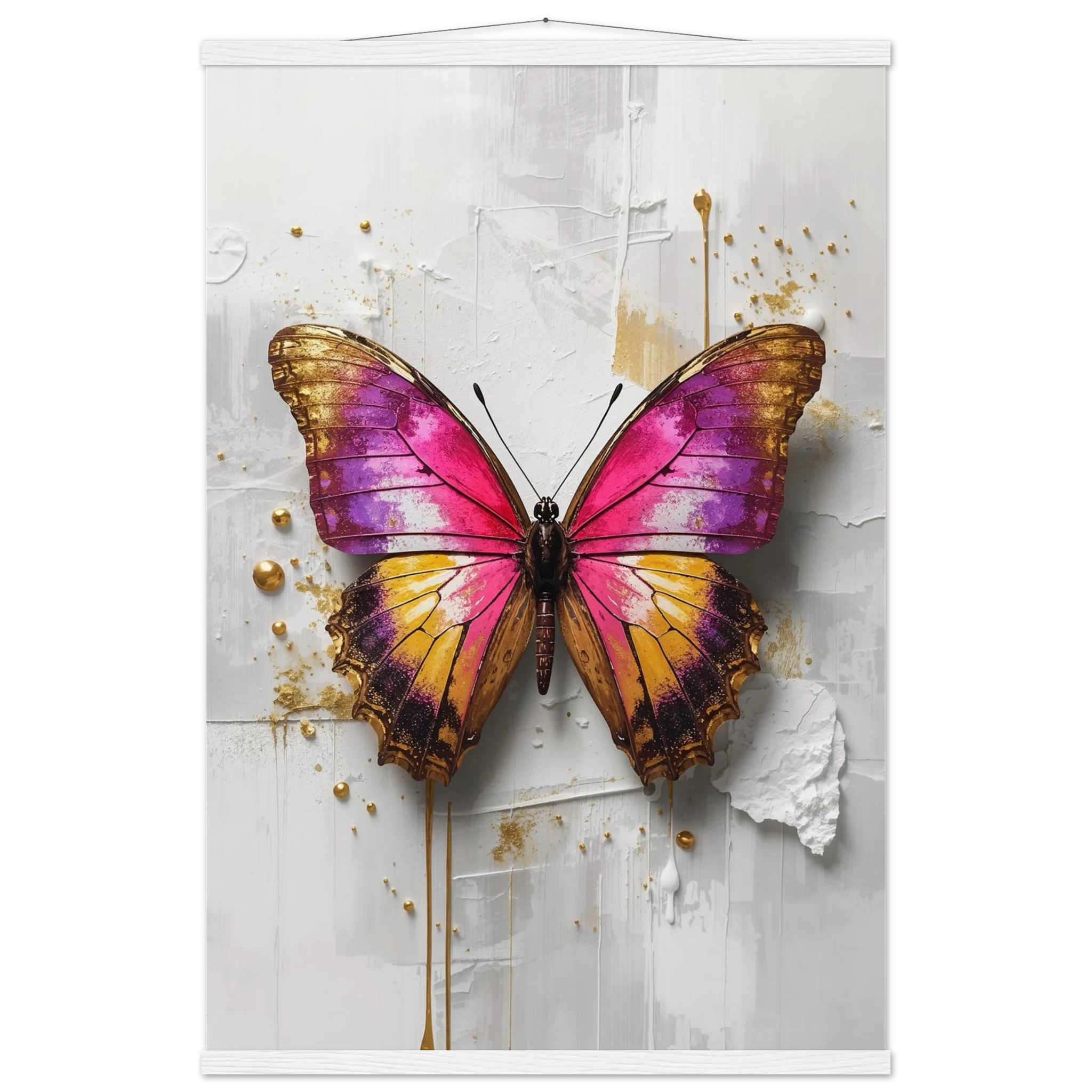 This vibrant print features a large, stylised butterfly with intricate wings in pink, purple, yellow, and gold. Textured brushstrokes and metallic gold accents create a luxurious, modern aesthetic against a soft white abstract background. Perfect for bold, contemporary wall decor.