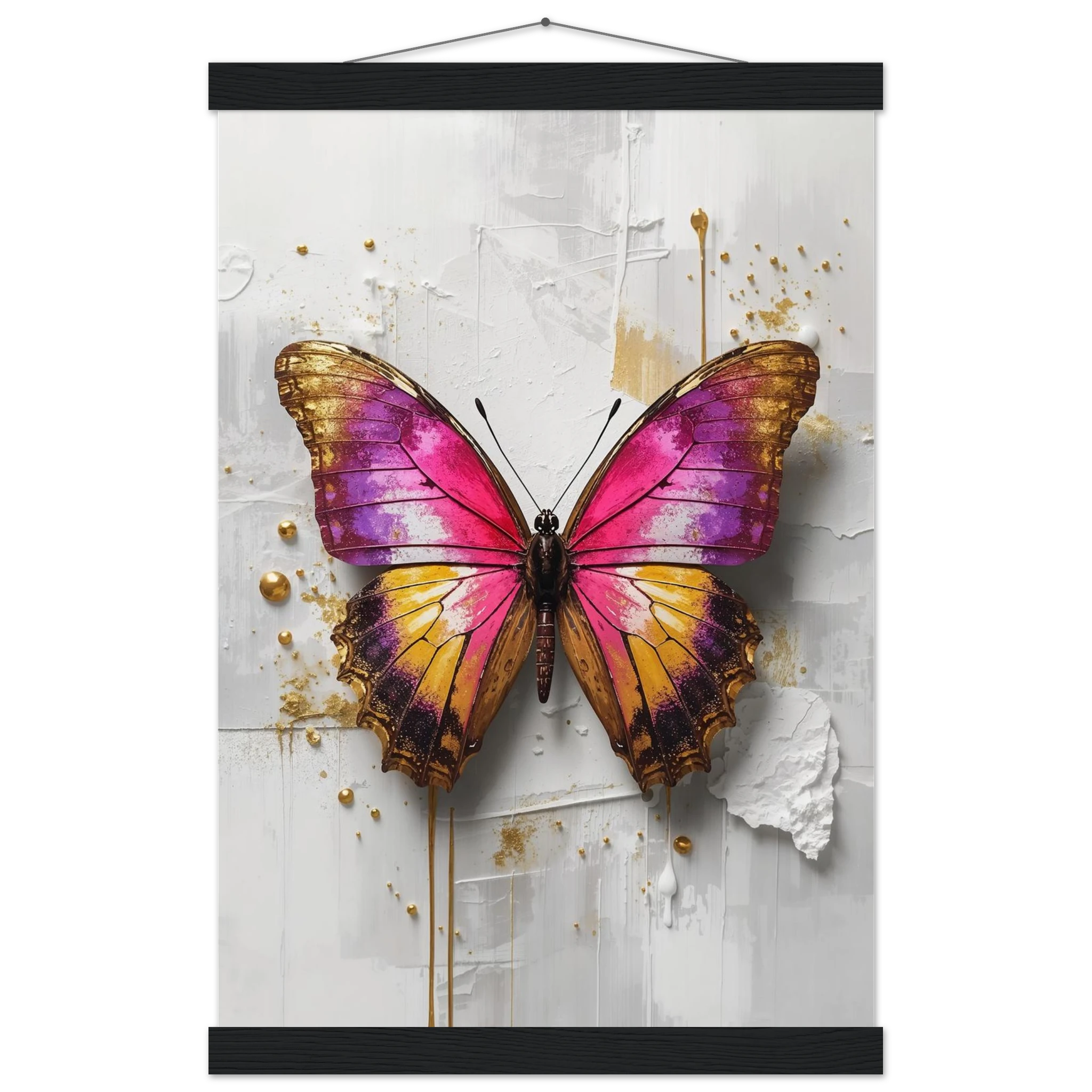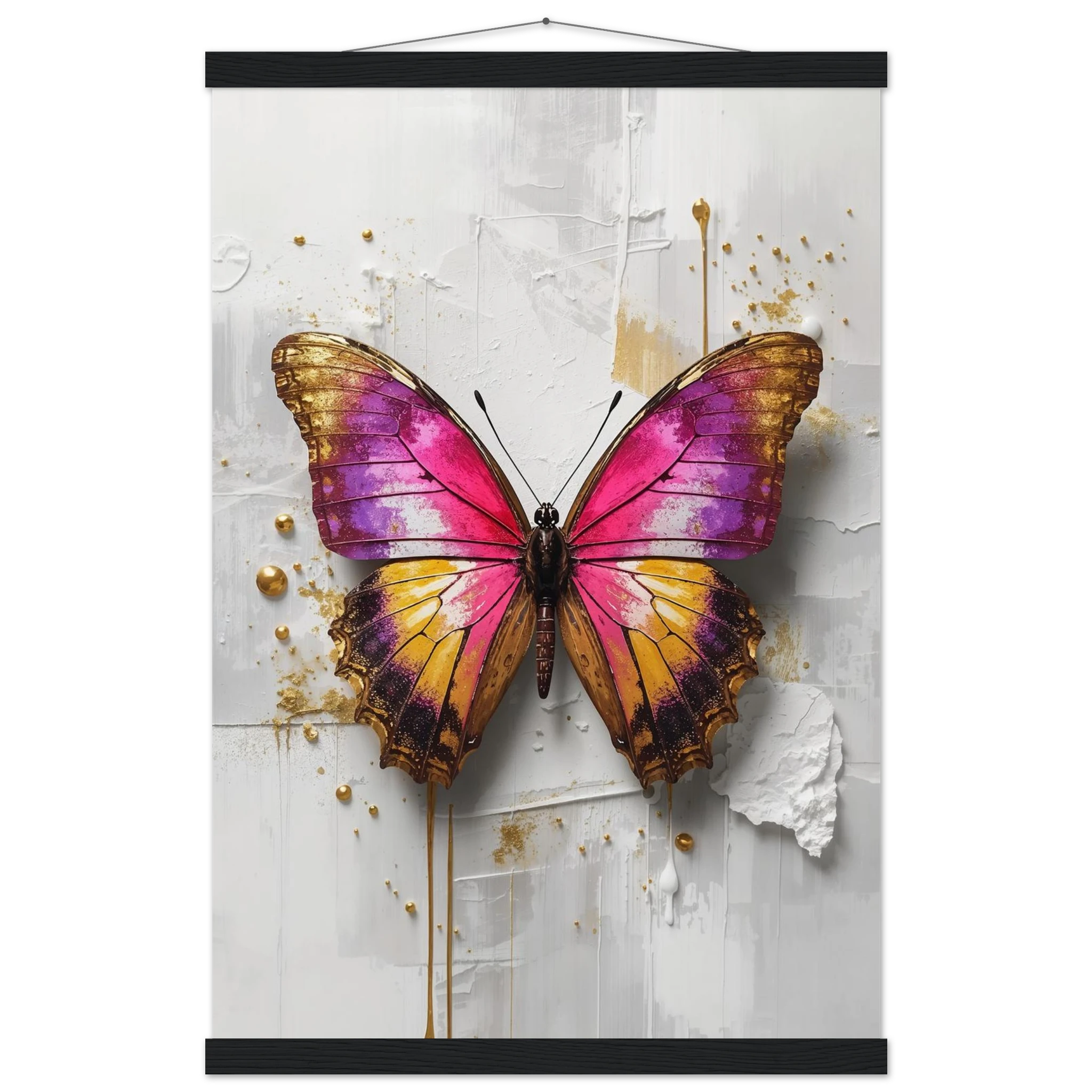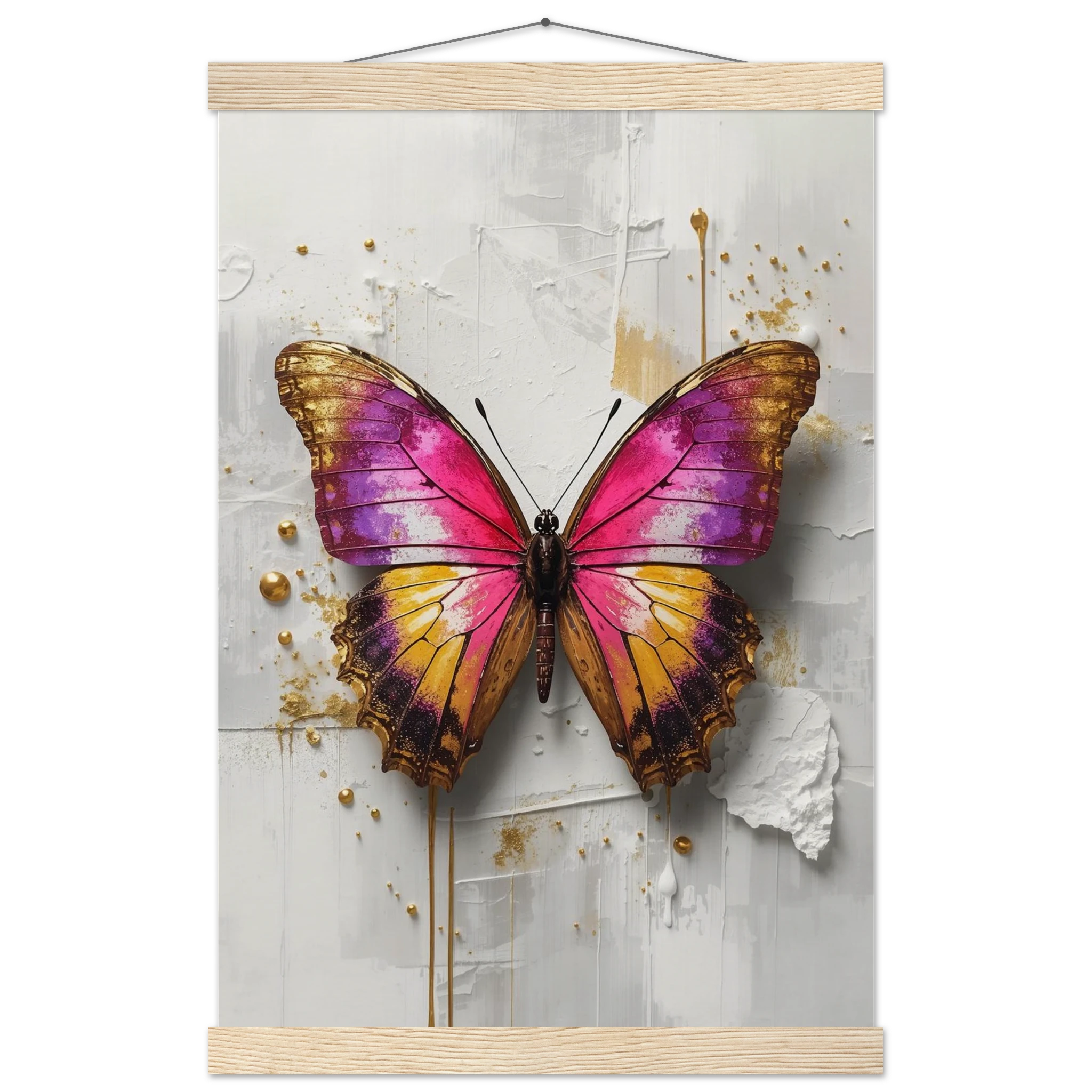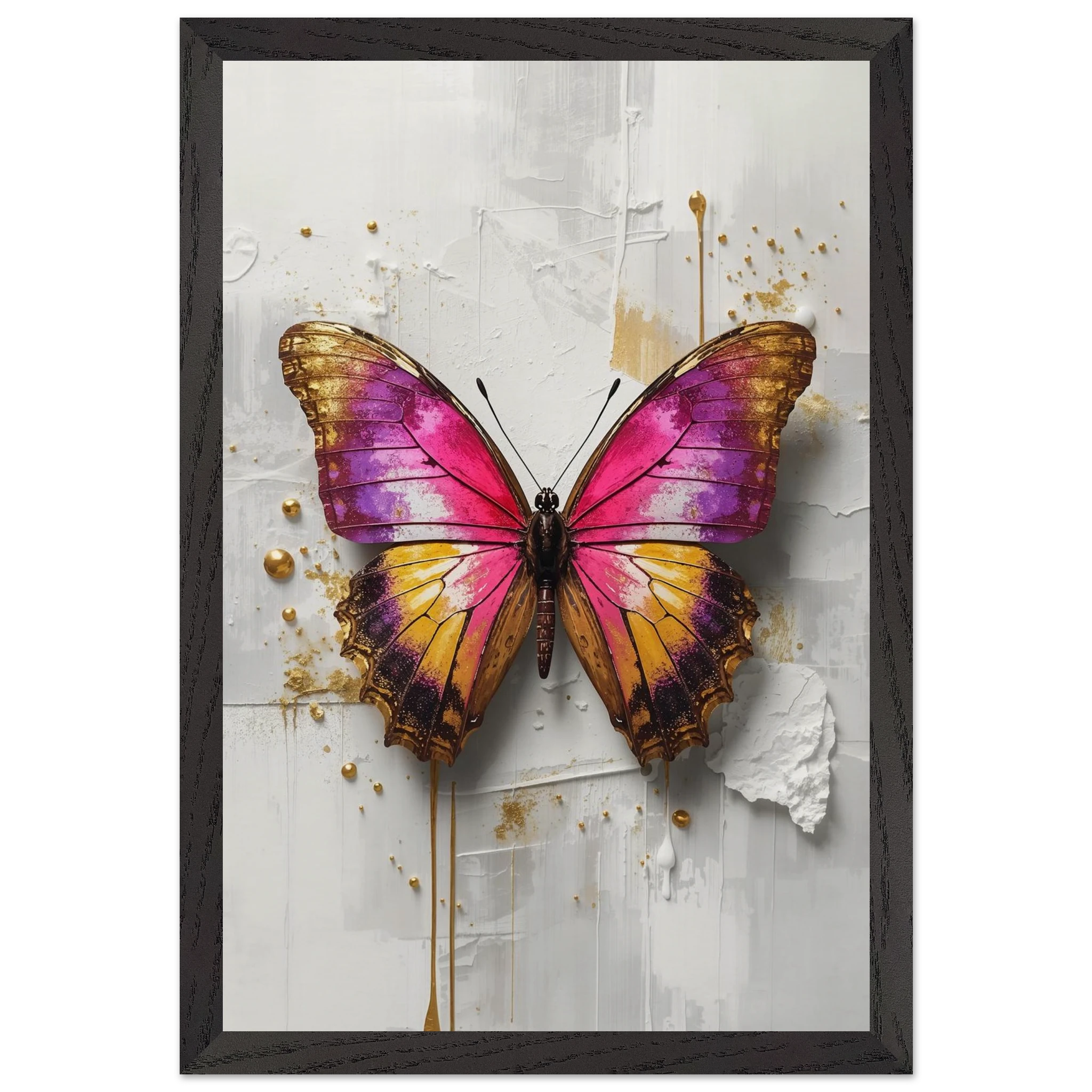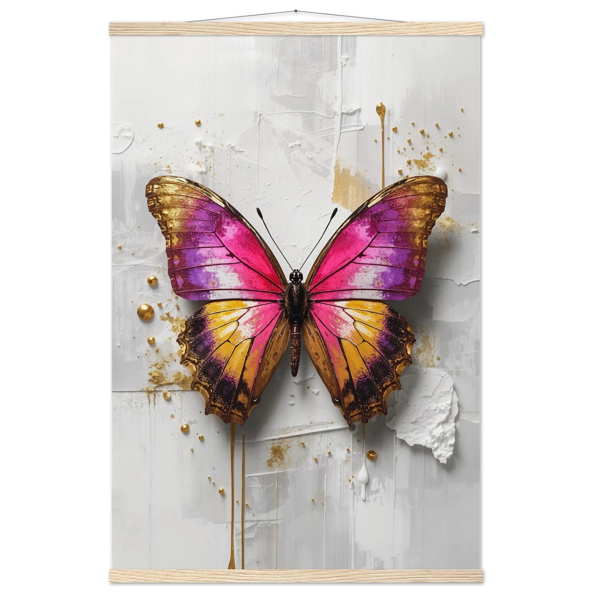 This vibrant print features a large, stylised butterfly with intricate wings in pink, purple, yellow, and gold. Textured brushstrokes and metallic gold accents create a luxurious, modern aesthetic against a soft white abstract background. Perfect for bold, contemporary wall decor.