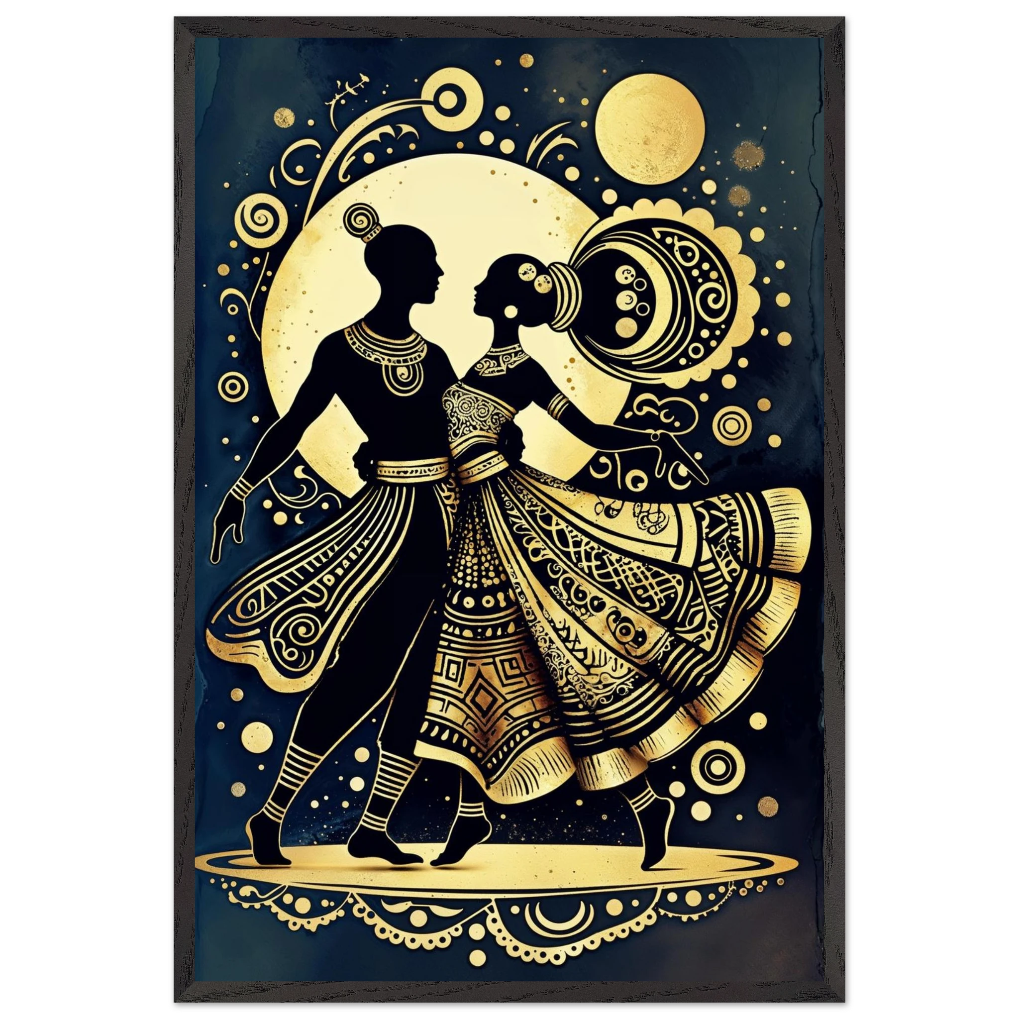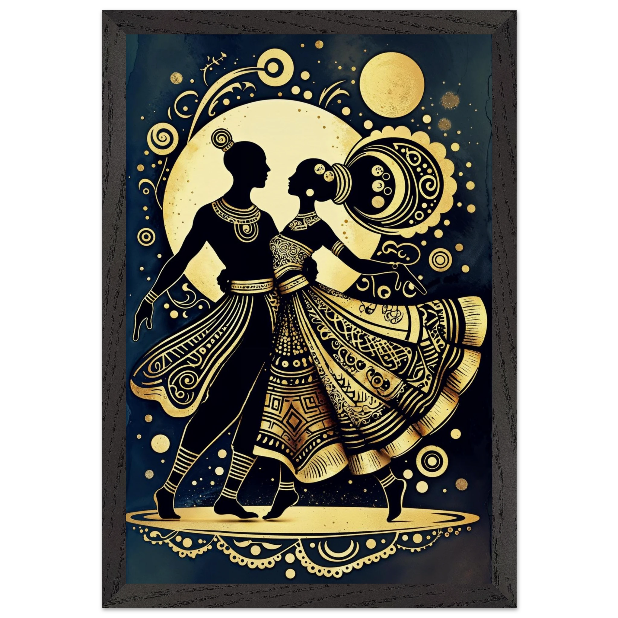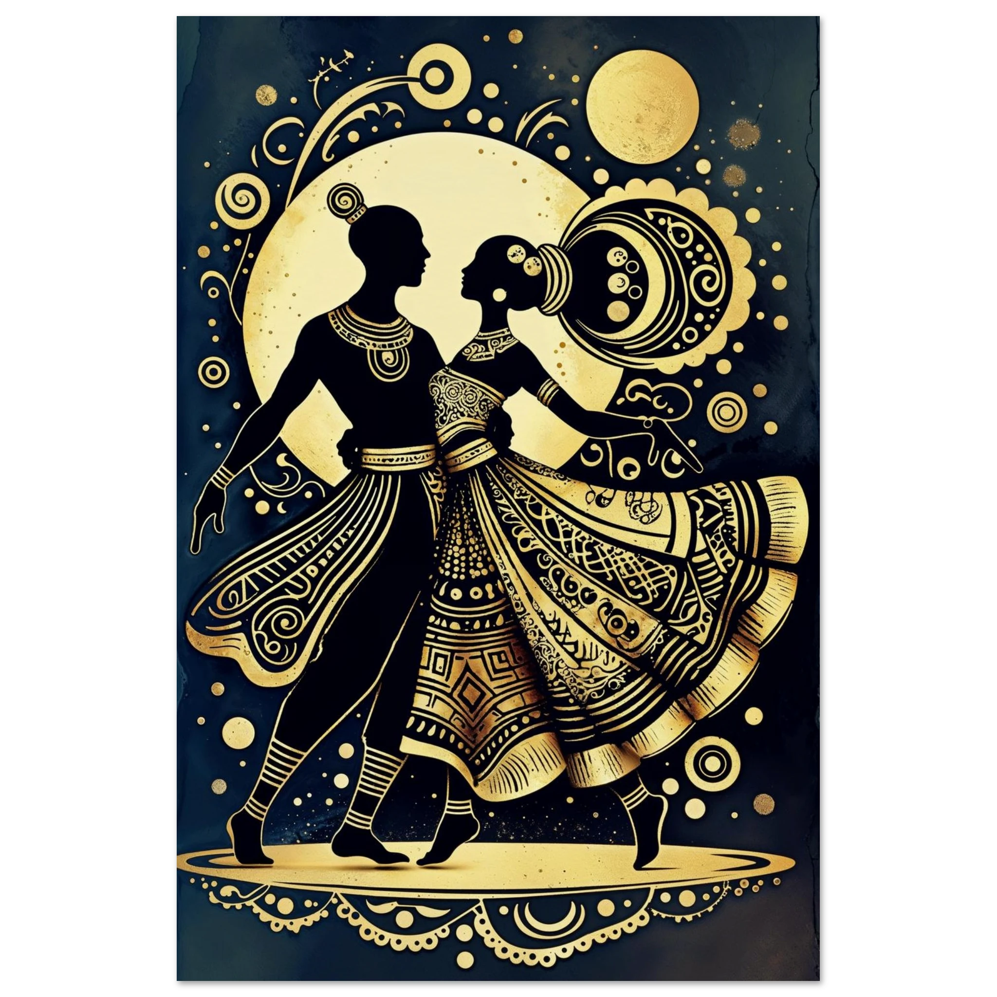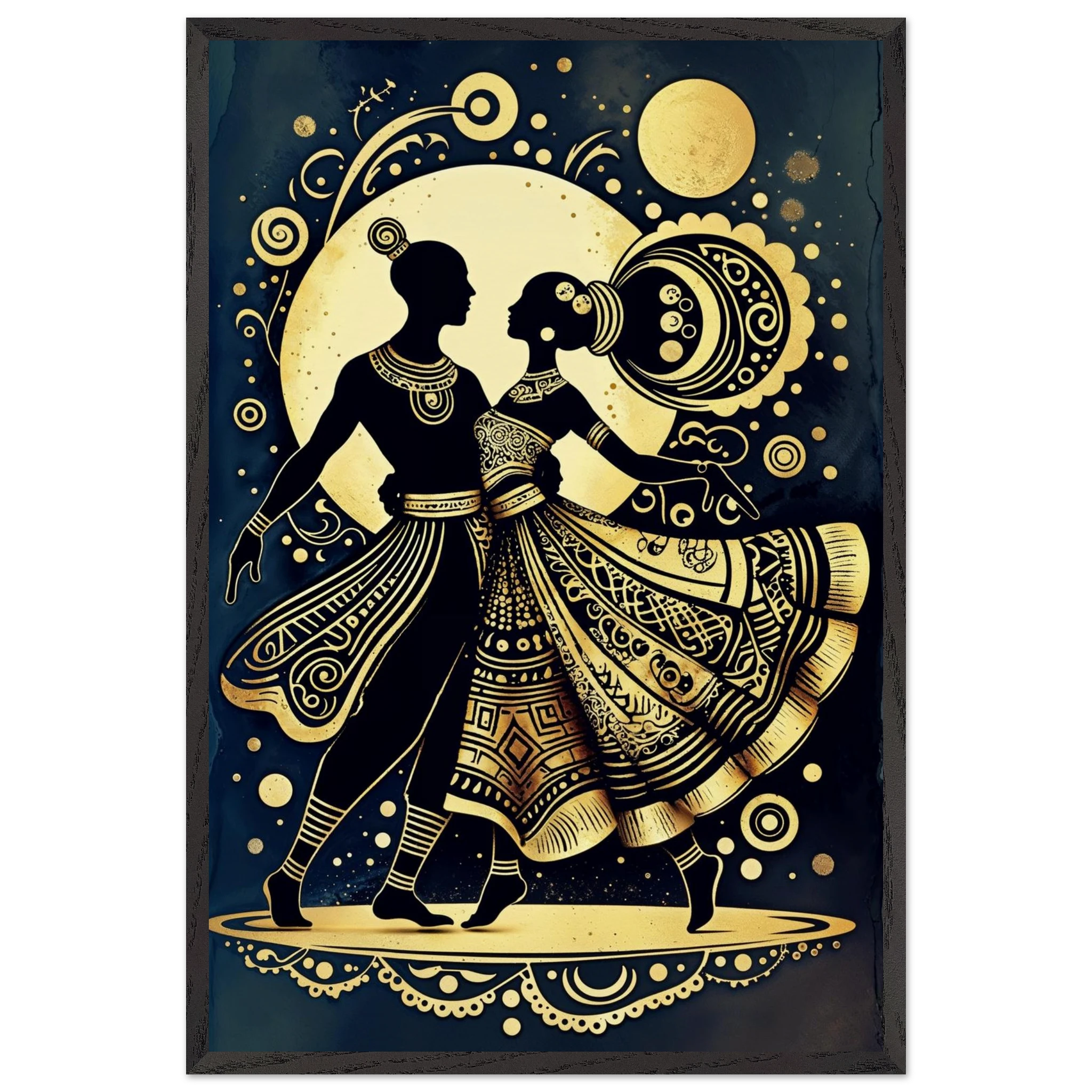 Celebrate rhythm and movement with this stylised abstract artwork featuring two graceful human figures in a dynamic dance pose. Rendered in a stunning gold and black colour scheme, the figures are powerful silhouettes set against a dark background, highlighted by intricate geometric patterns and swirling motifs. The composition is symmetrical and harmonious, blending traditional cultural richness with a sleek modern aesthetic. This Gold and Black Dancers print is a visually striking statement piece perfect for adding elegance and drama to any contemporary space.