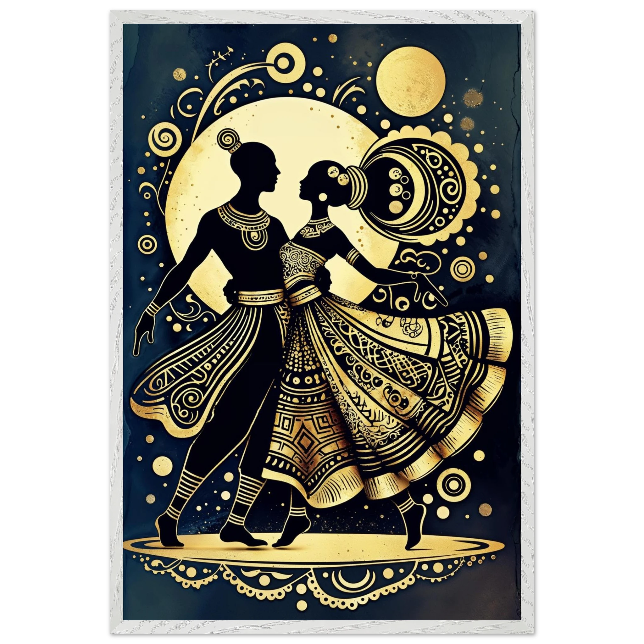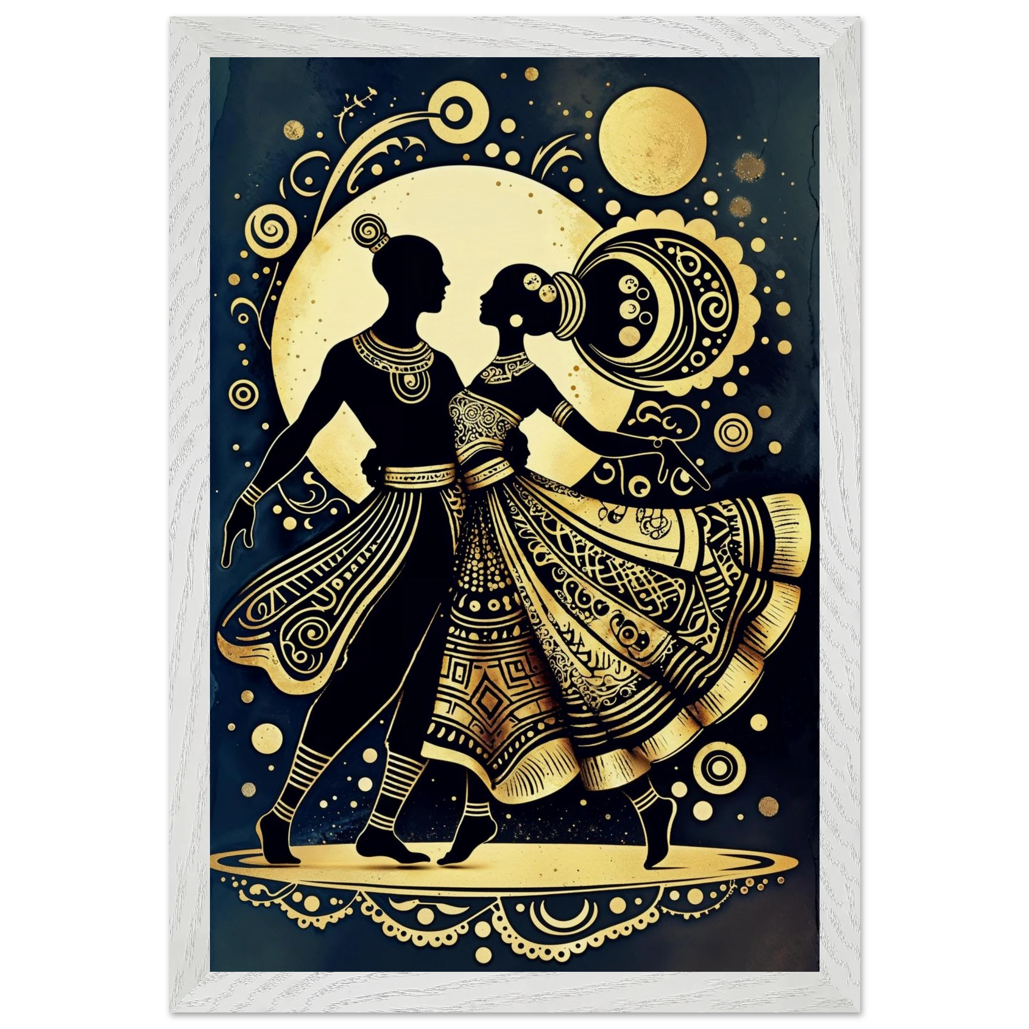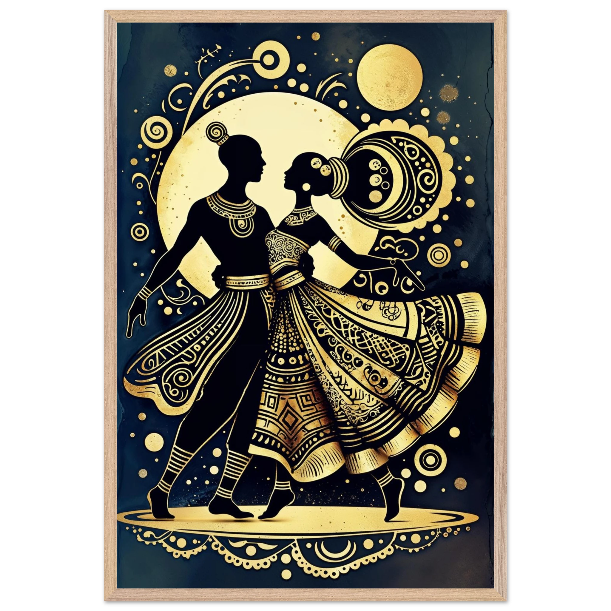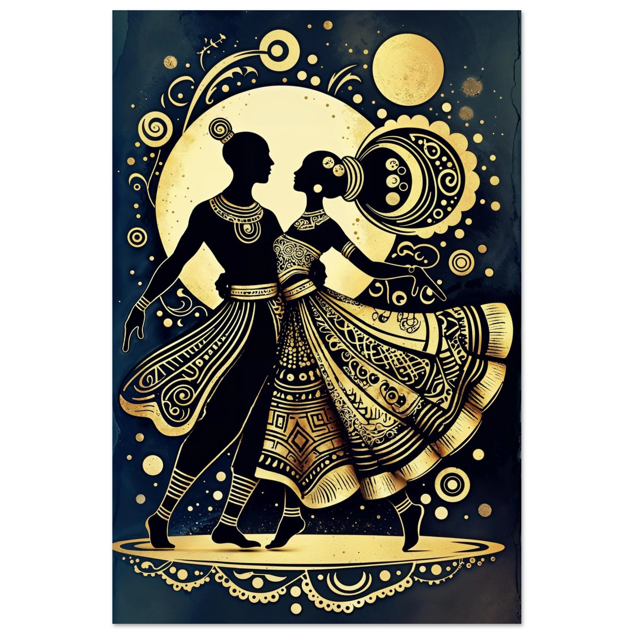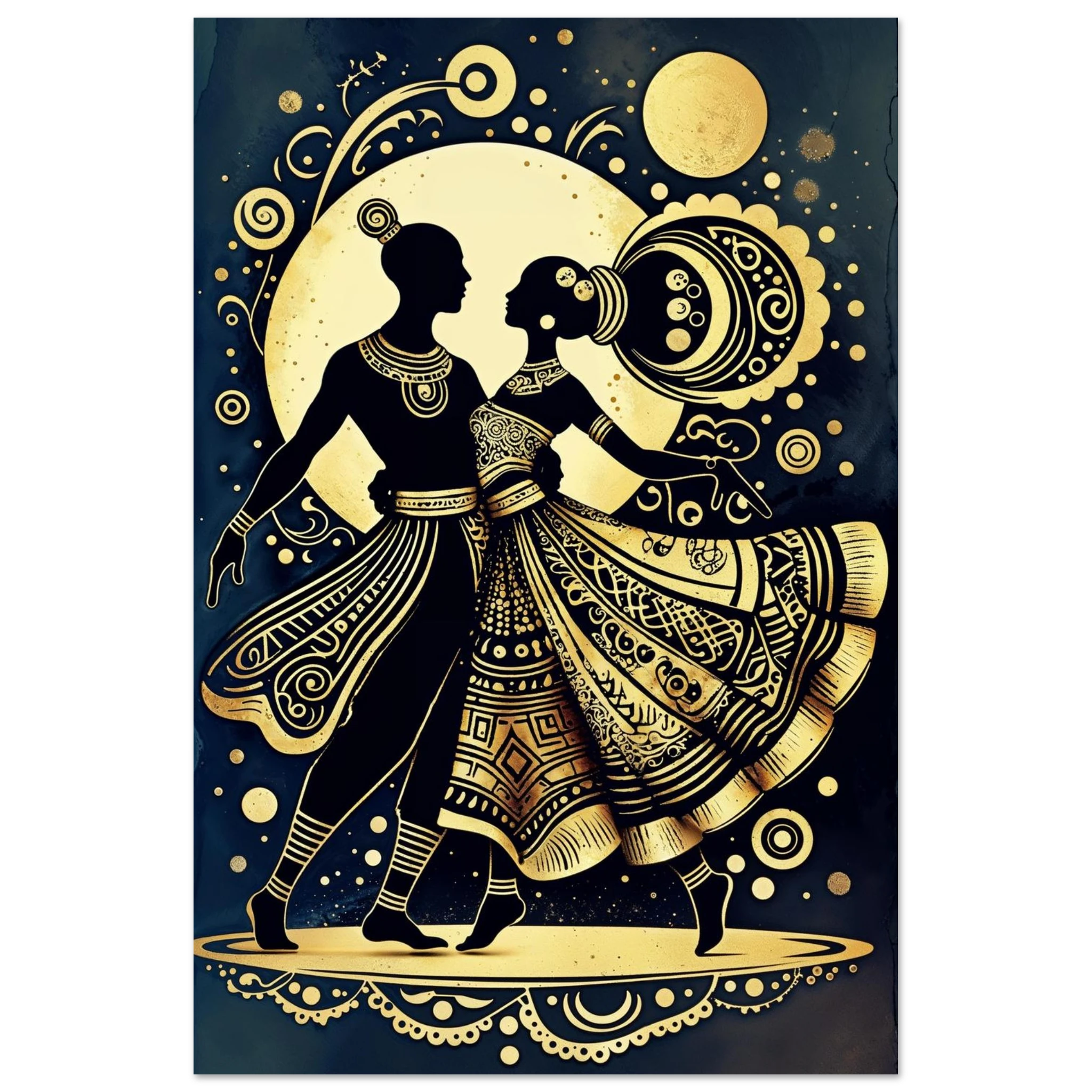 Celebrate rhythm and movement with this stylised abstract artwork featuring two graceful human figures in a dynamic dance pose. Rendered in a stunning gold and black colour scheme, the figures are powerful silhouettes set against a dark background, highlighted by intricate geometric patterns and swirling motifs. The composition is symmetrical and harmonious, blending traditional cultural richness with a sleek modern aesthetic. This Gold and Black Dancers print is a visually striking statement piece perfect for adding elegance and drama to any contemporary space.