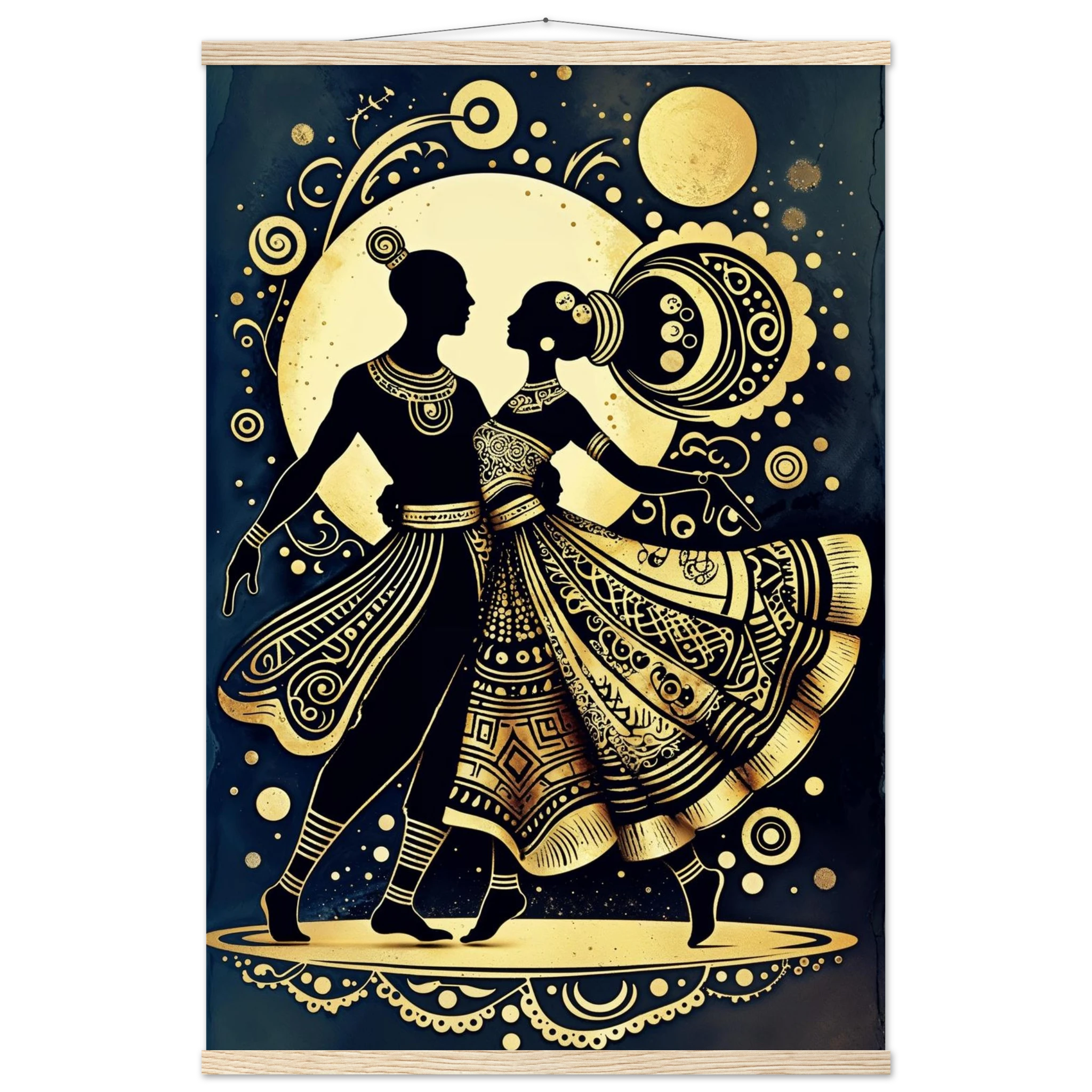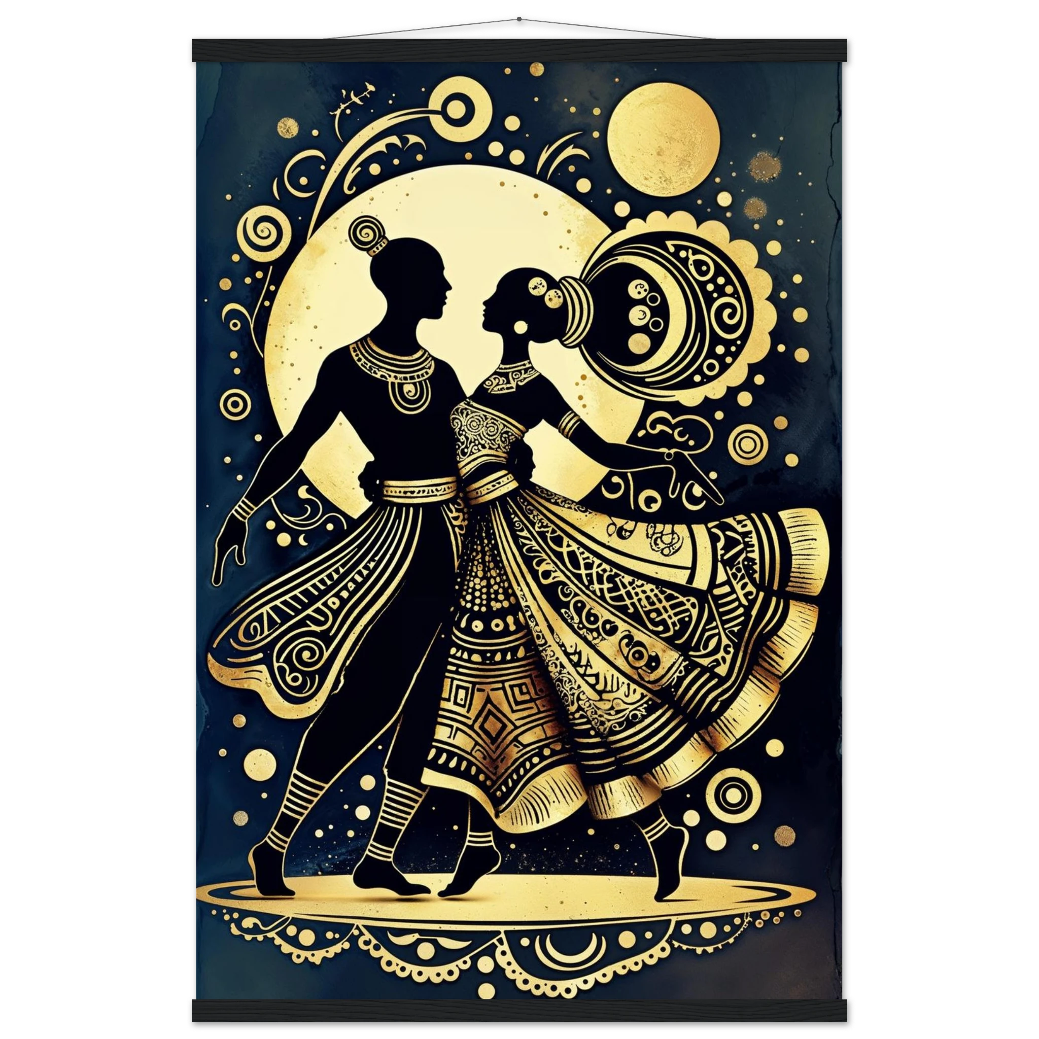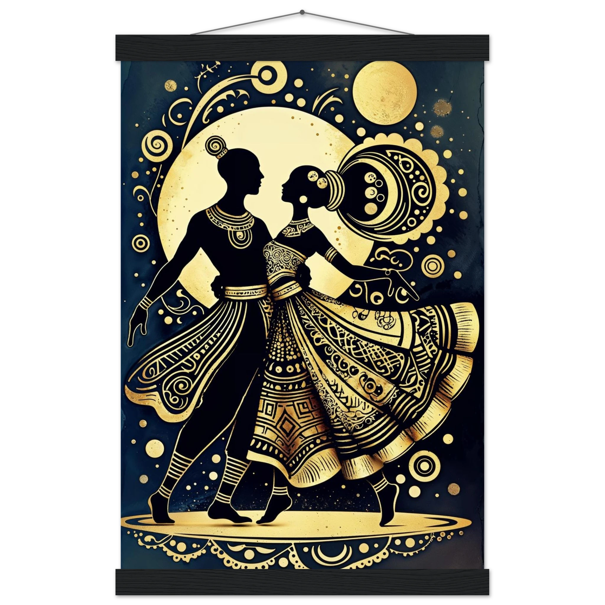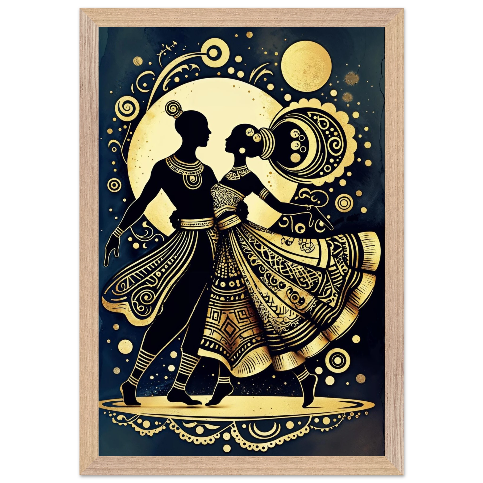 Celebrate rhythm and movement with this stylised abstract artwork featuring two graceful human figures in a dynamic dance pose. Rendered in a stunning gold and black colour scheme, the figures are powerful silhouettes set against a dark background, highlighted by intricate geometric patterns and swirling motifs. The composition is symmetrical and harmonious, blending traditional cultural richness with a sleek modern aesthetic. This Gold and Black Dancers print is a visually striking statement piece perfect for adding elegance and drama to any contemporary space.