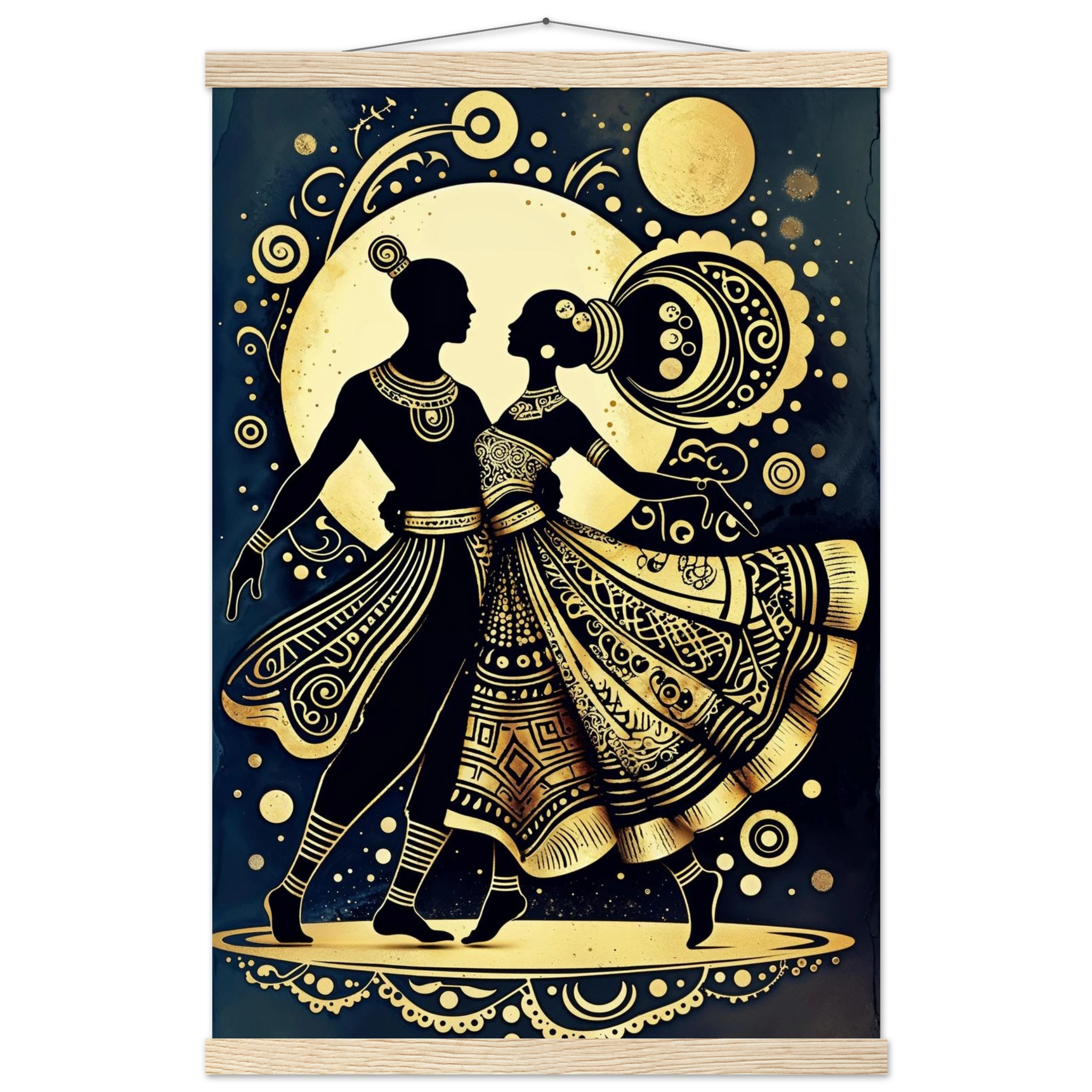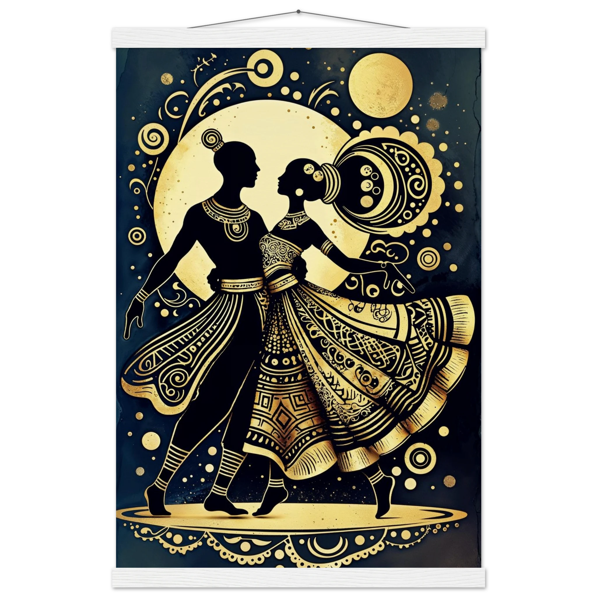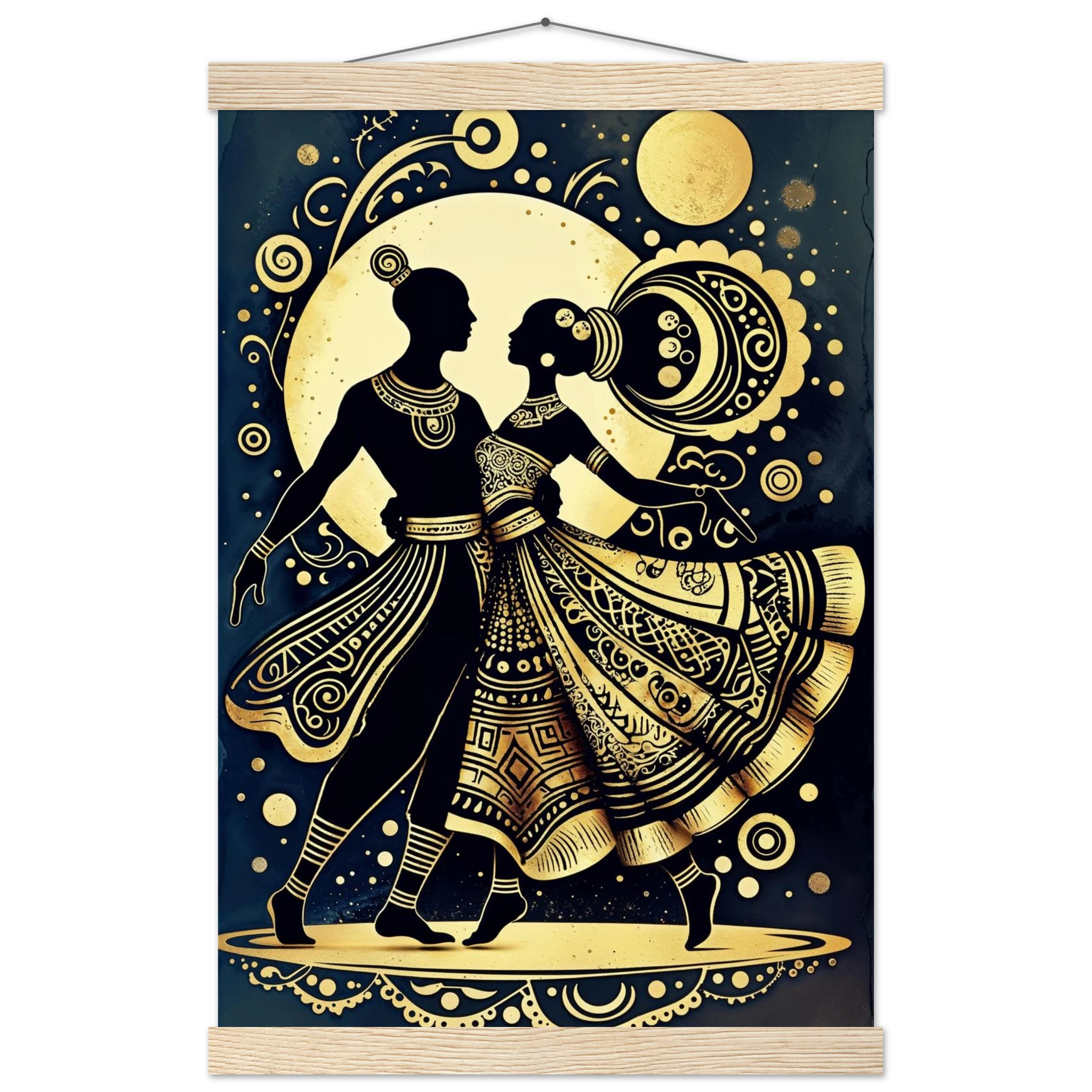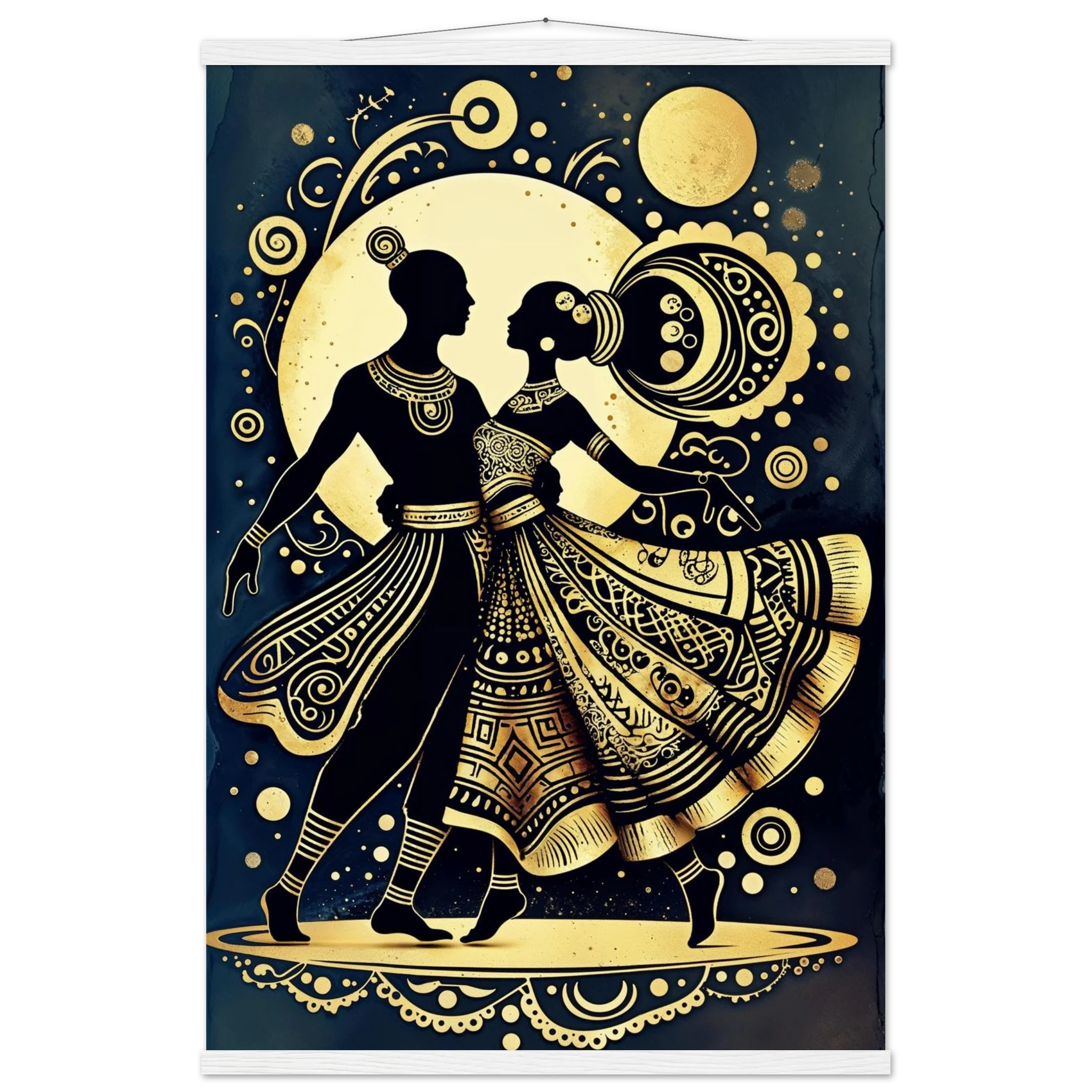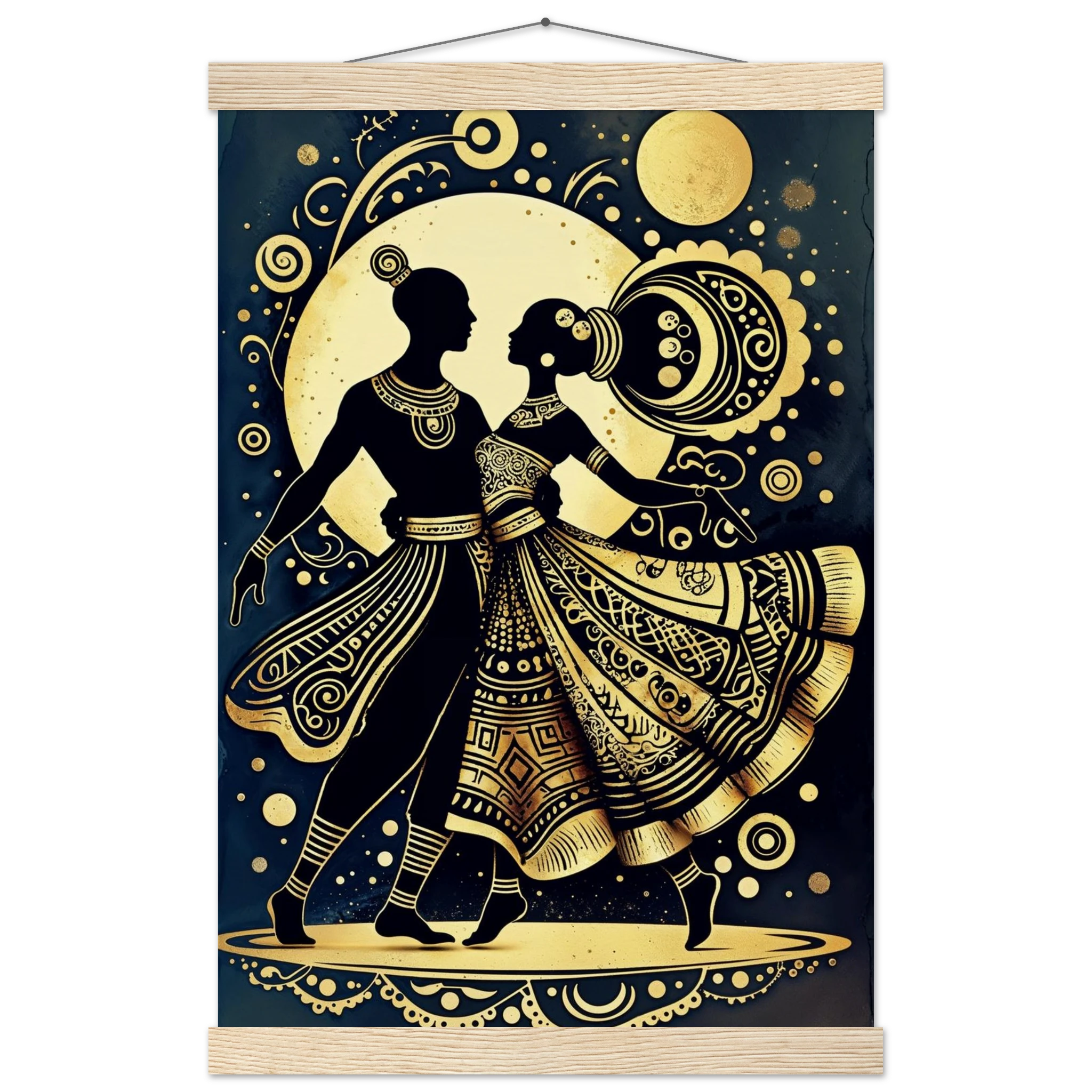 Celebrate rhythm and movement with this stylised abstract artwork featuring two graceful human figures in a dynamic dance pose. Rendered in a stunning gold and black colour scheme, the figures are powerful silhouettes set against a dark background, highlighted by intricate geometric patterns and swirling motifs. The composition is symmetrical and harmonious, blending traditional cultural richness with a sleek modern aesthetic. This Gold and Black Dancers print is a visually striking statement piece perfect for adding elegance and drama to any contemporary space.