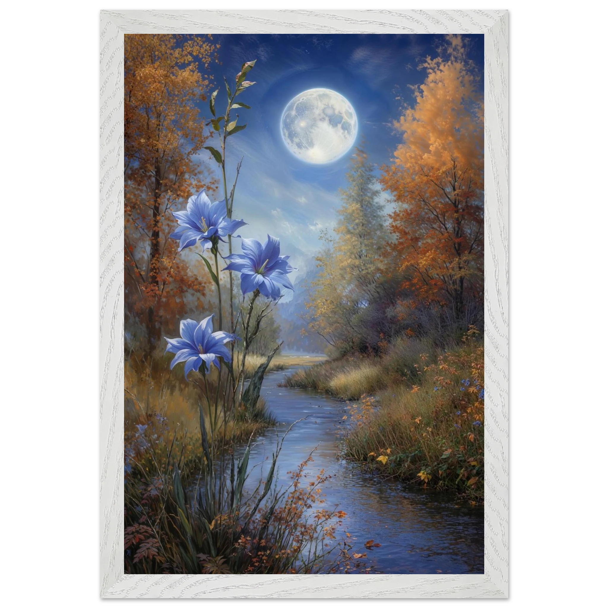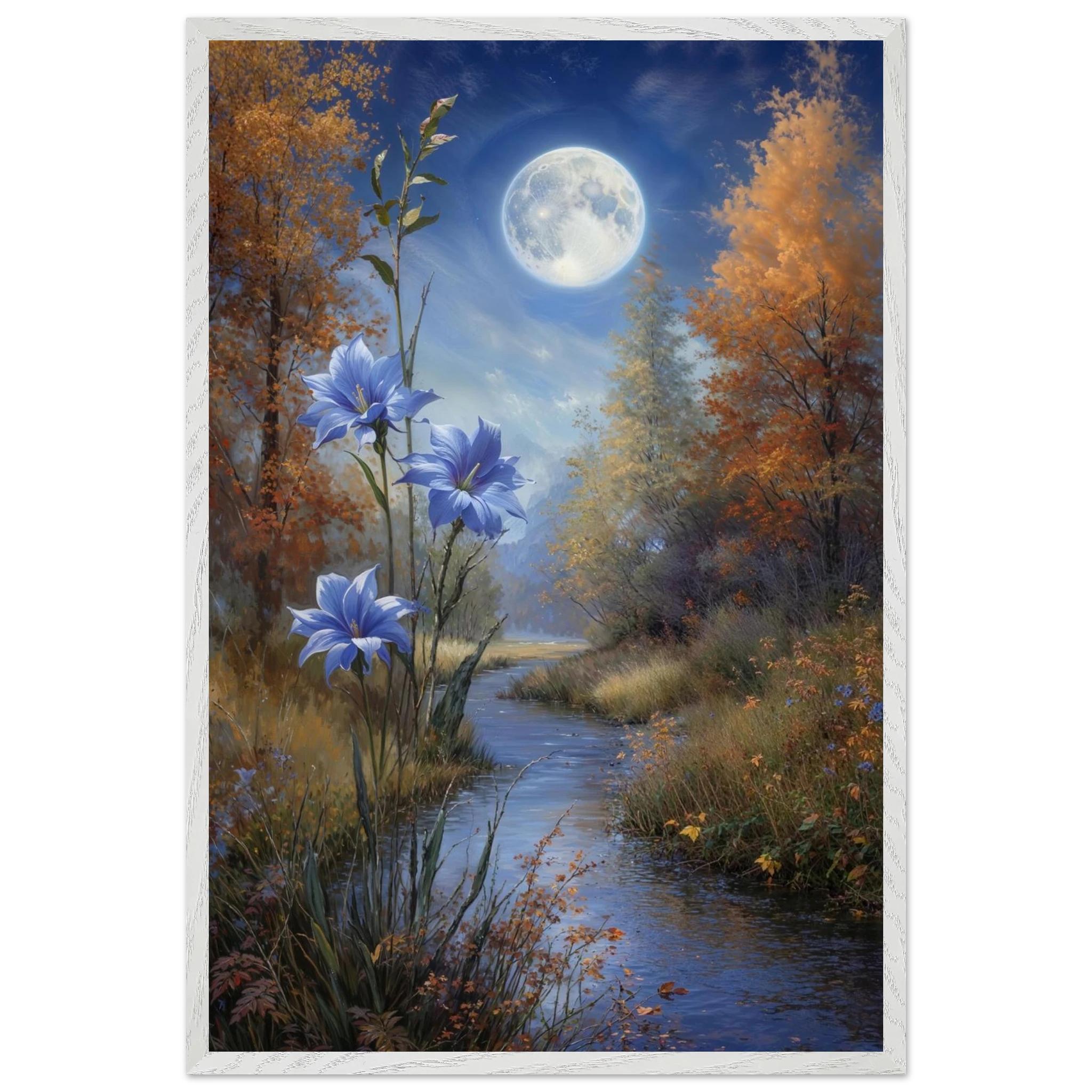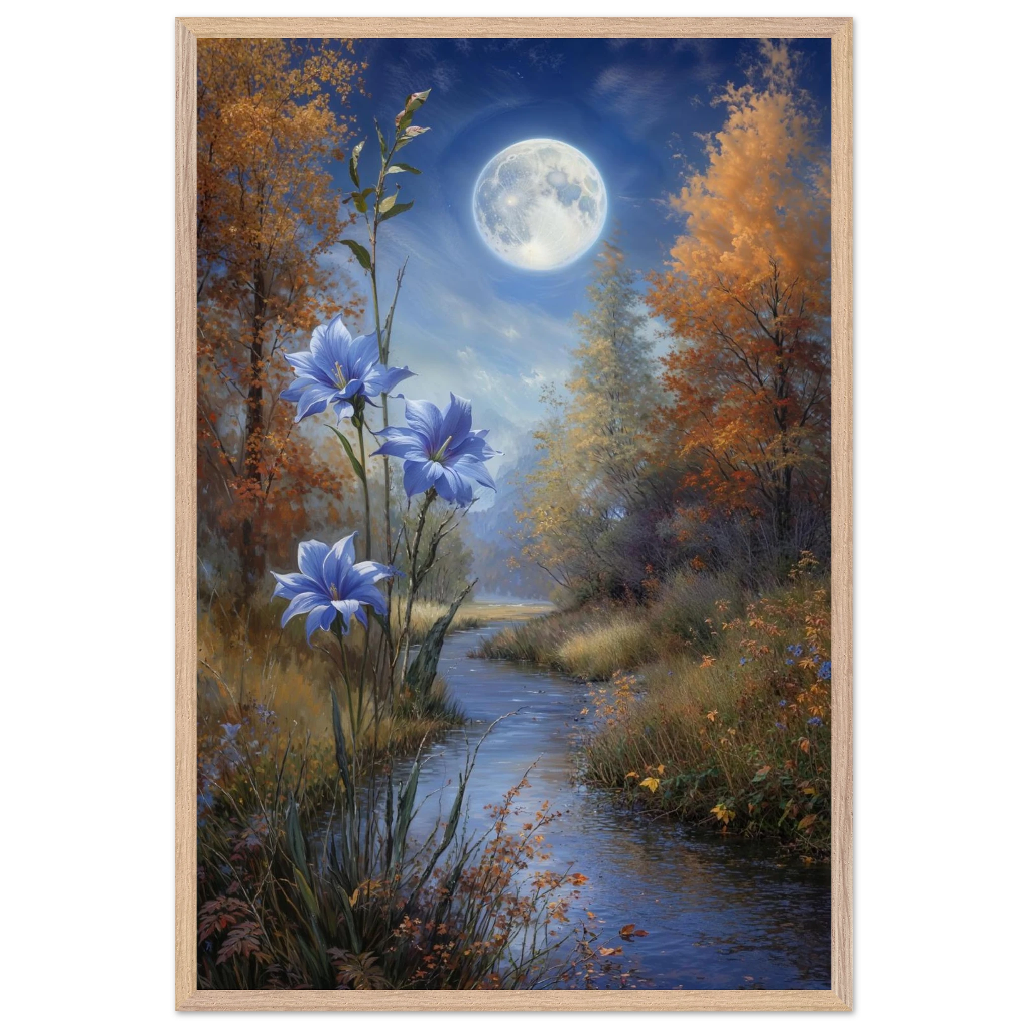 A luminous full moon hangs in the deep blue, star-dotted sky, casting a soft, ethereal glow over a tranquil stream that winds through the scene. Blending realistic detail with a touch of fantasy, this moonlit artwork captures the peaceful essence of nature’s transition. It is an ideal piece for creating a calm, mystical atmosphere in a bedroom, reading nook, or any space inspired by the magic of the night.