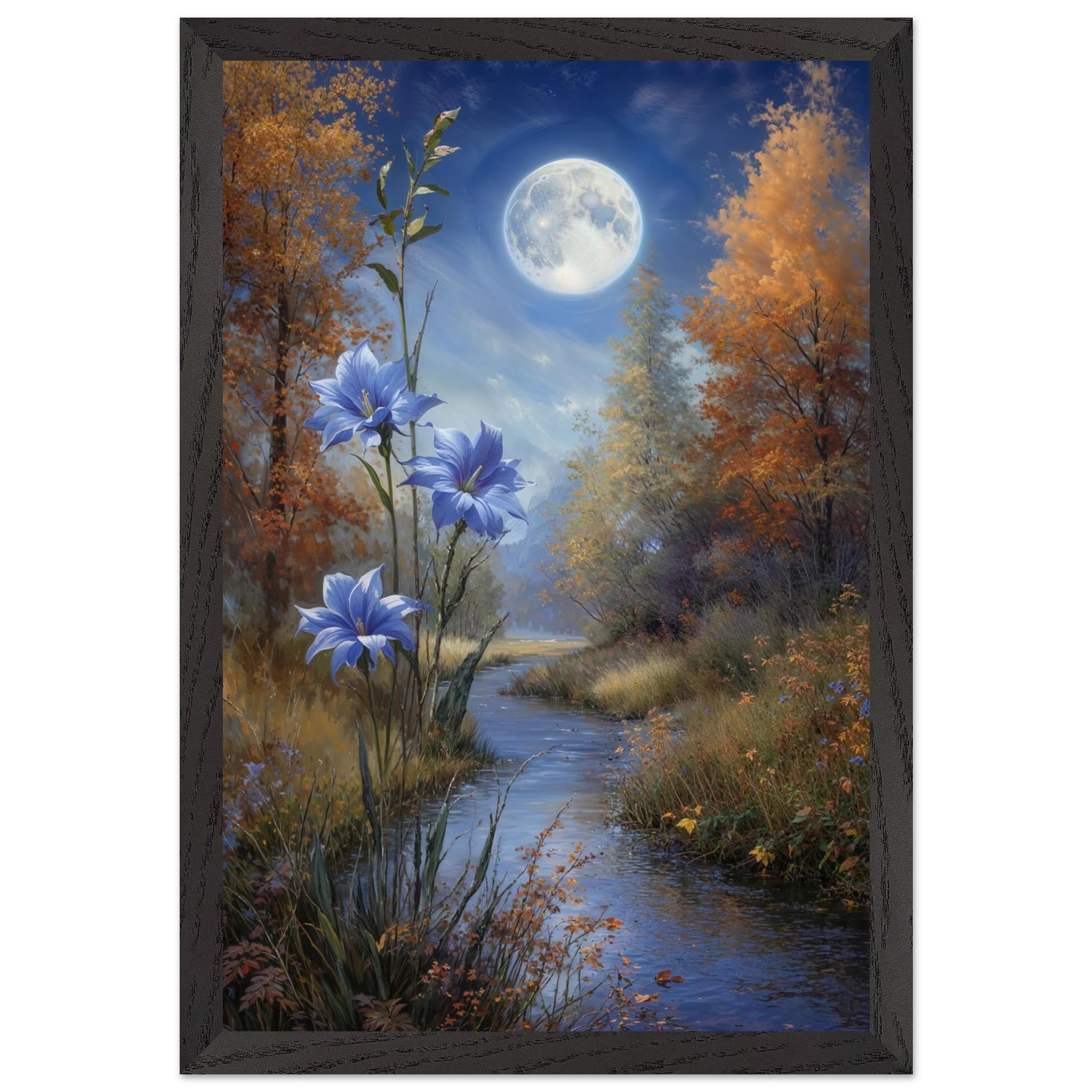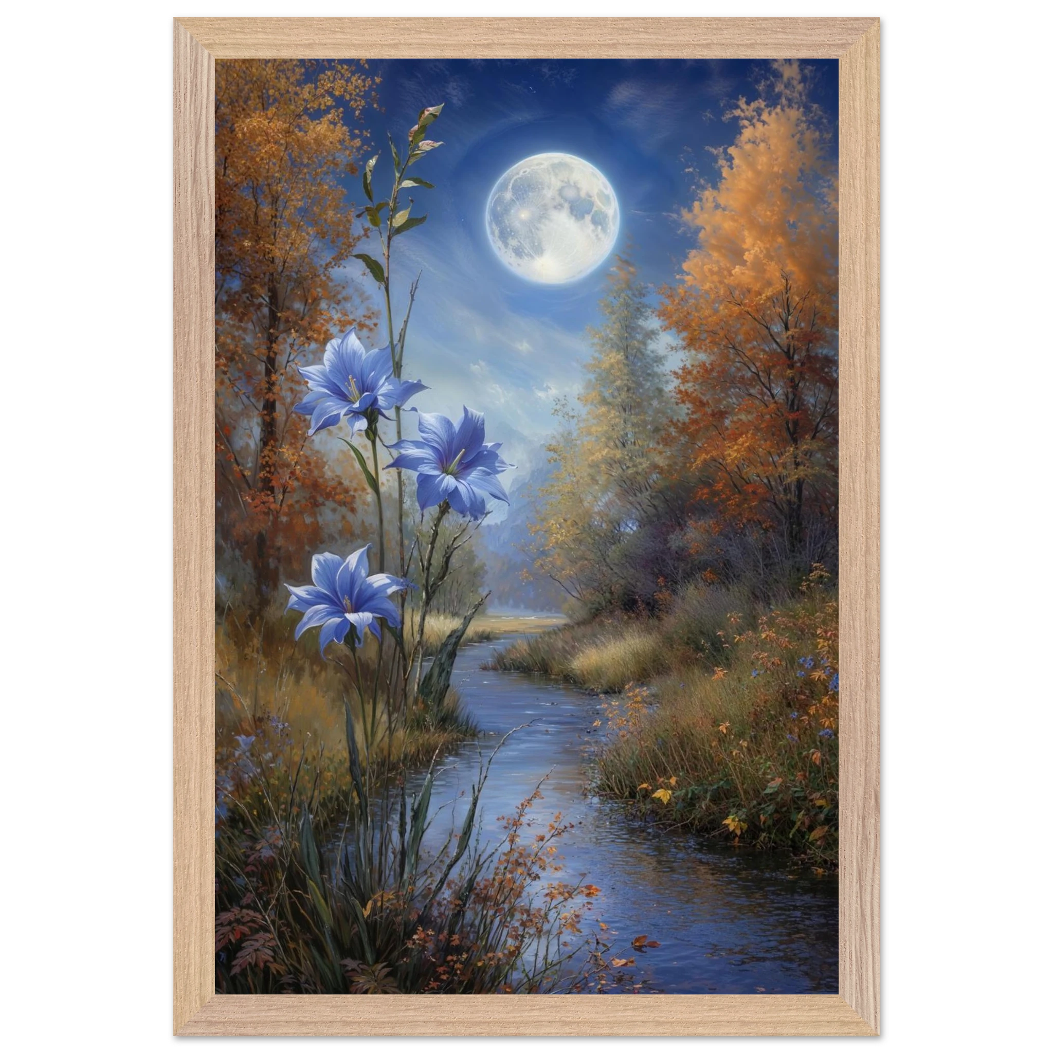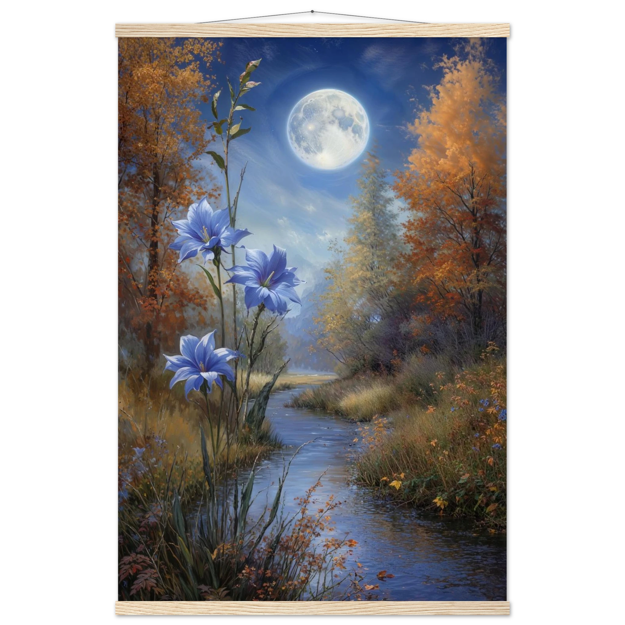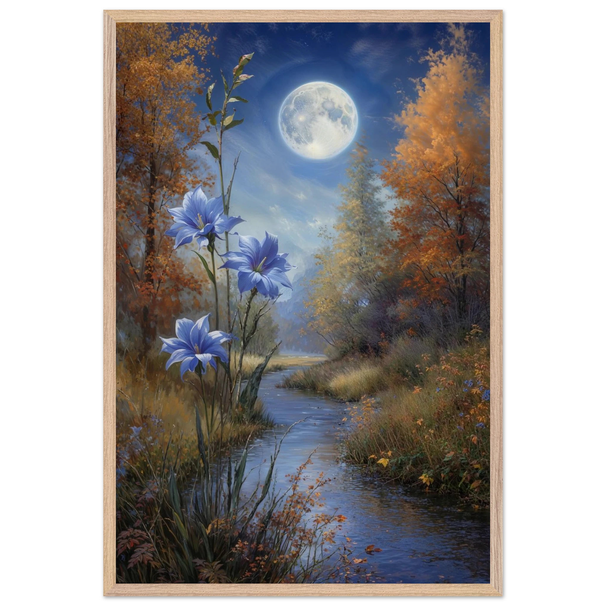 A luminous full moon hangs in the deep blue, star-dotted sky, casting a soft, ethereal glow over a tranquil stream that winds through the scene. Blending realistic detail with a touch of fantasy, this moonlit artwork captures the peaceful essence of nature’s transition. It is an ideal piece for creating a calm, mystical atmosphere in a bedroom, reading nook, or any space inspired by the magic of the night.