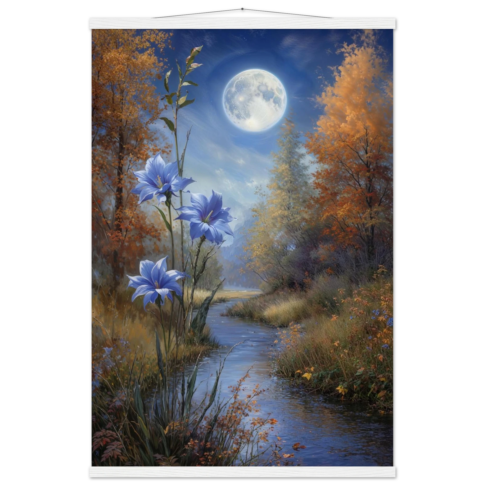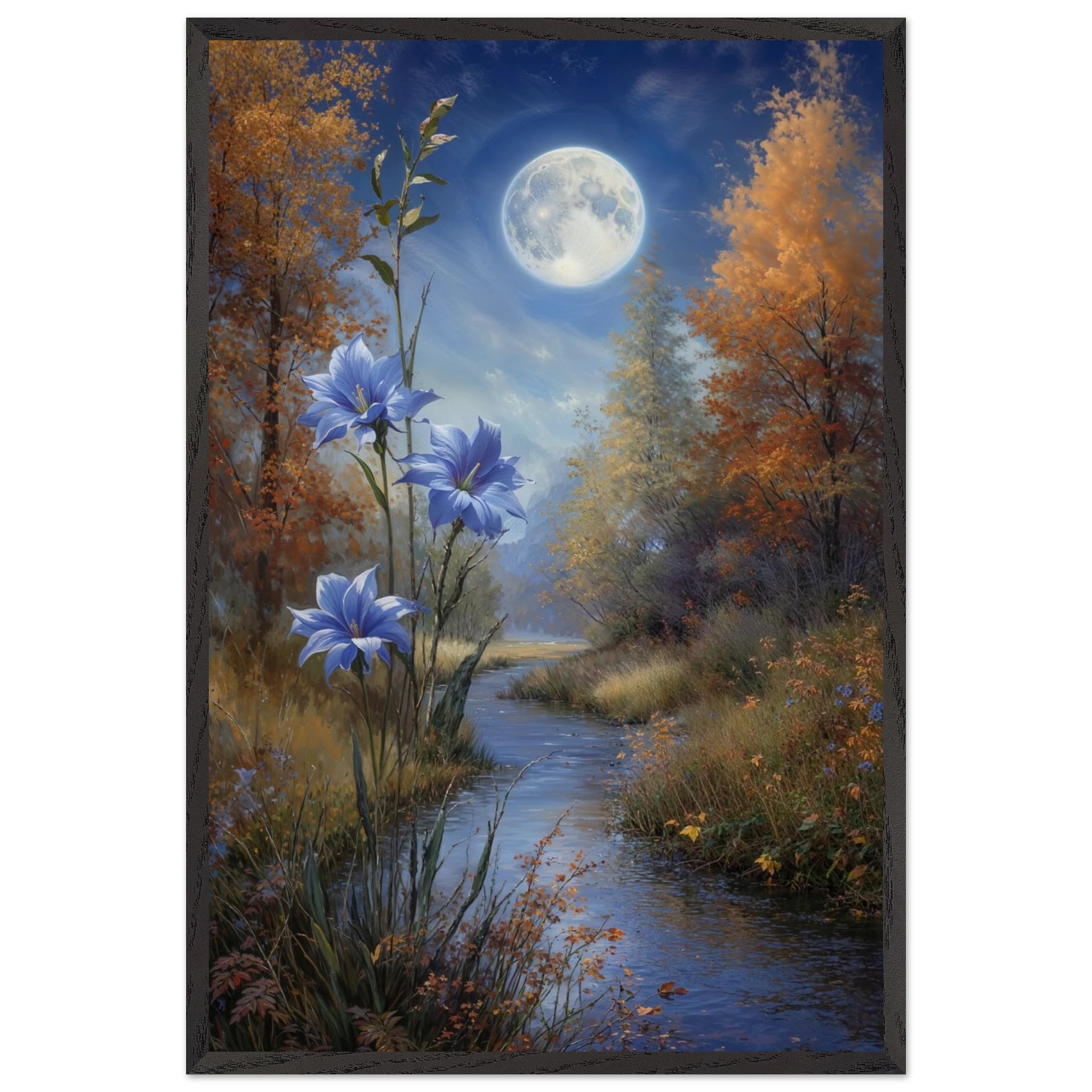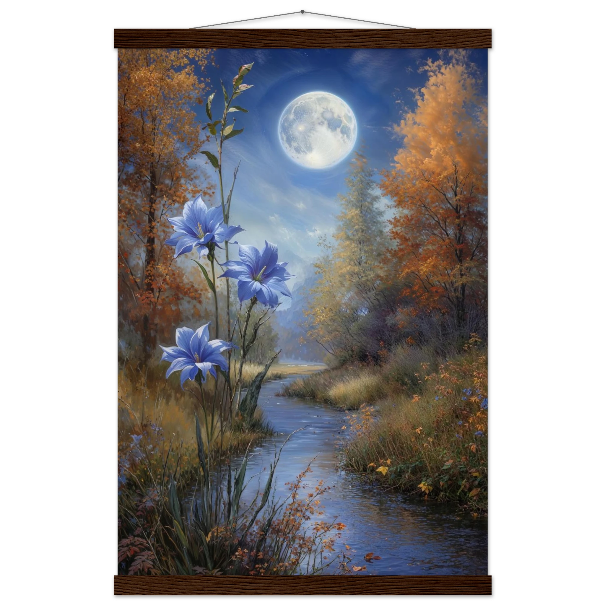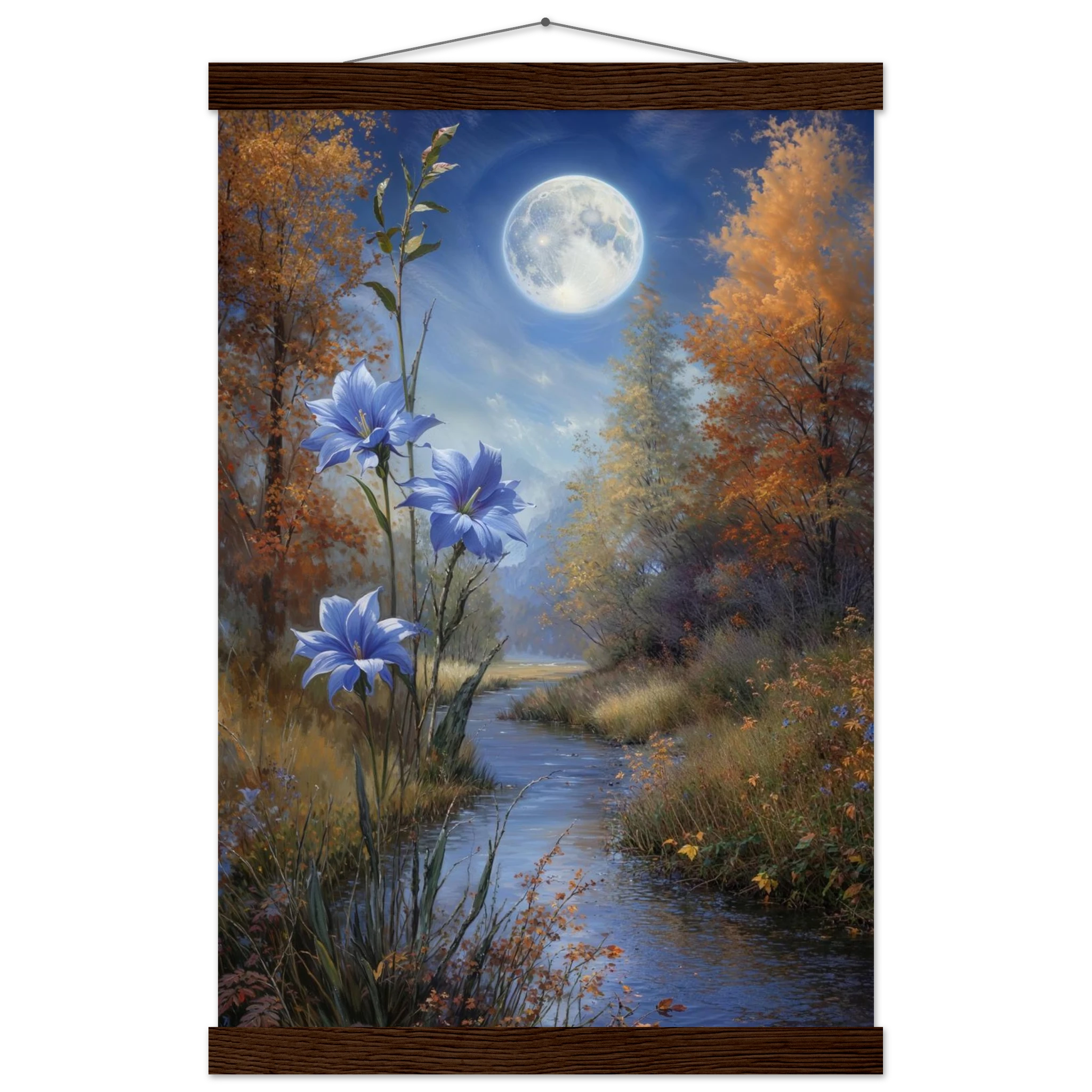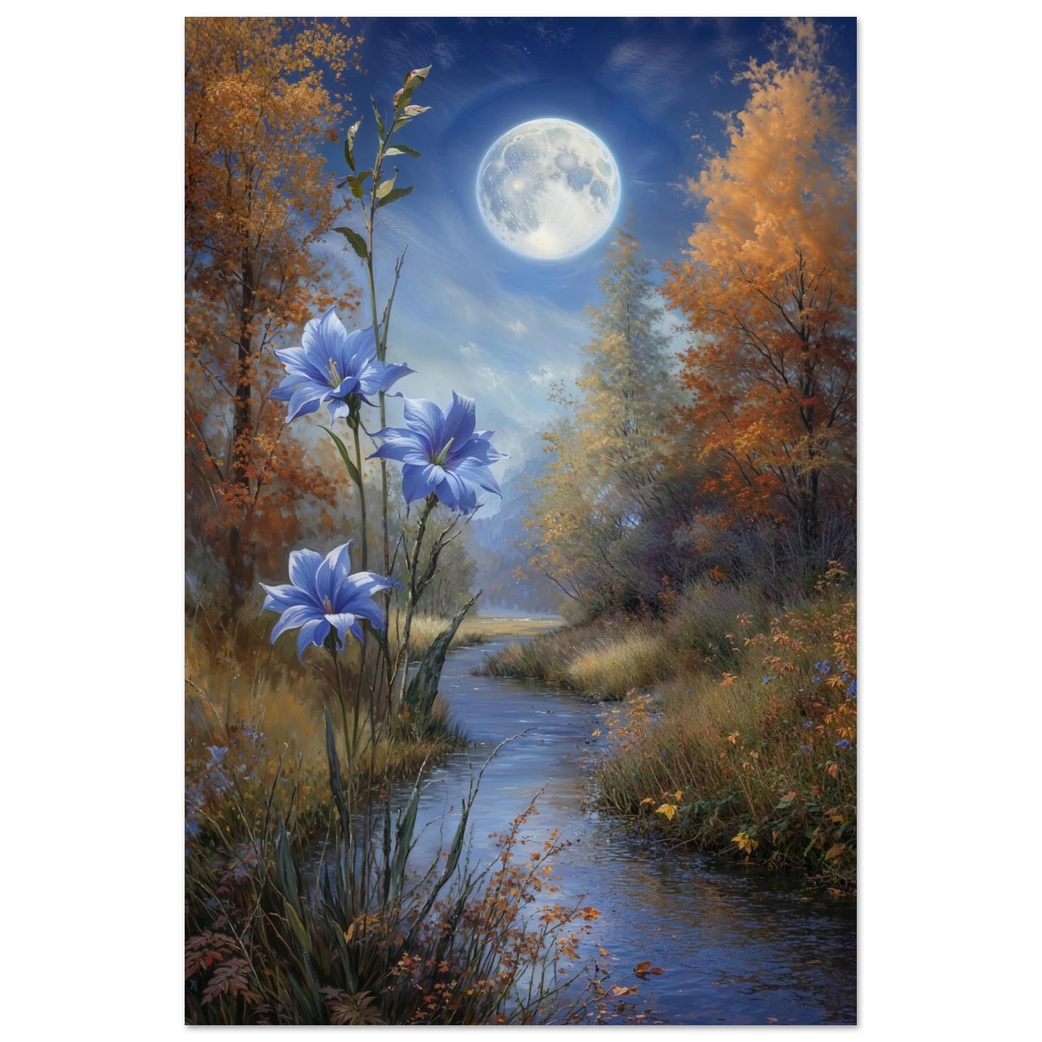 Embrace the quiet beauty of a crisp October night with this serene digital painting of an autumn landscape. This vertical composition features elegant blue flowers in the foreground, their petals arching gracefully against a rich tapestry of orange, red, and brown autumn leaves.