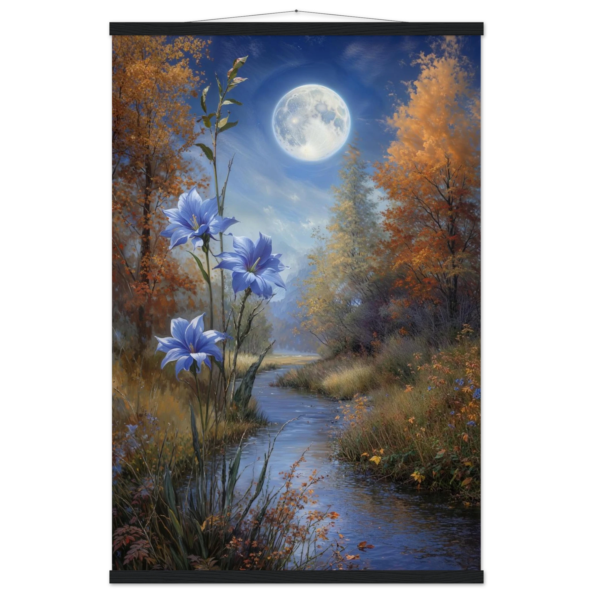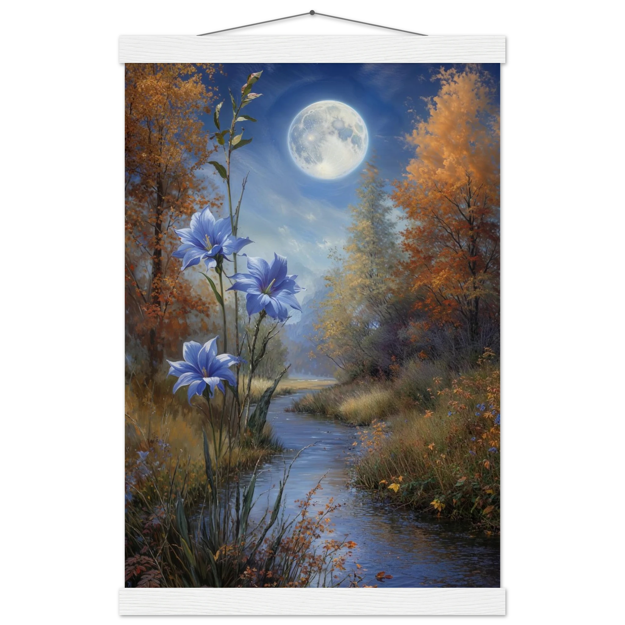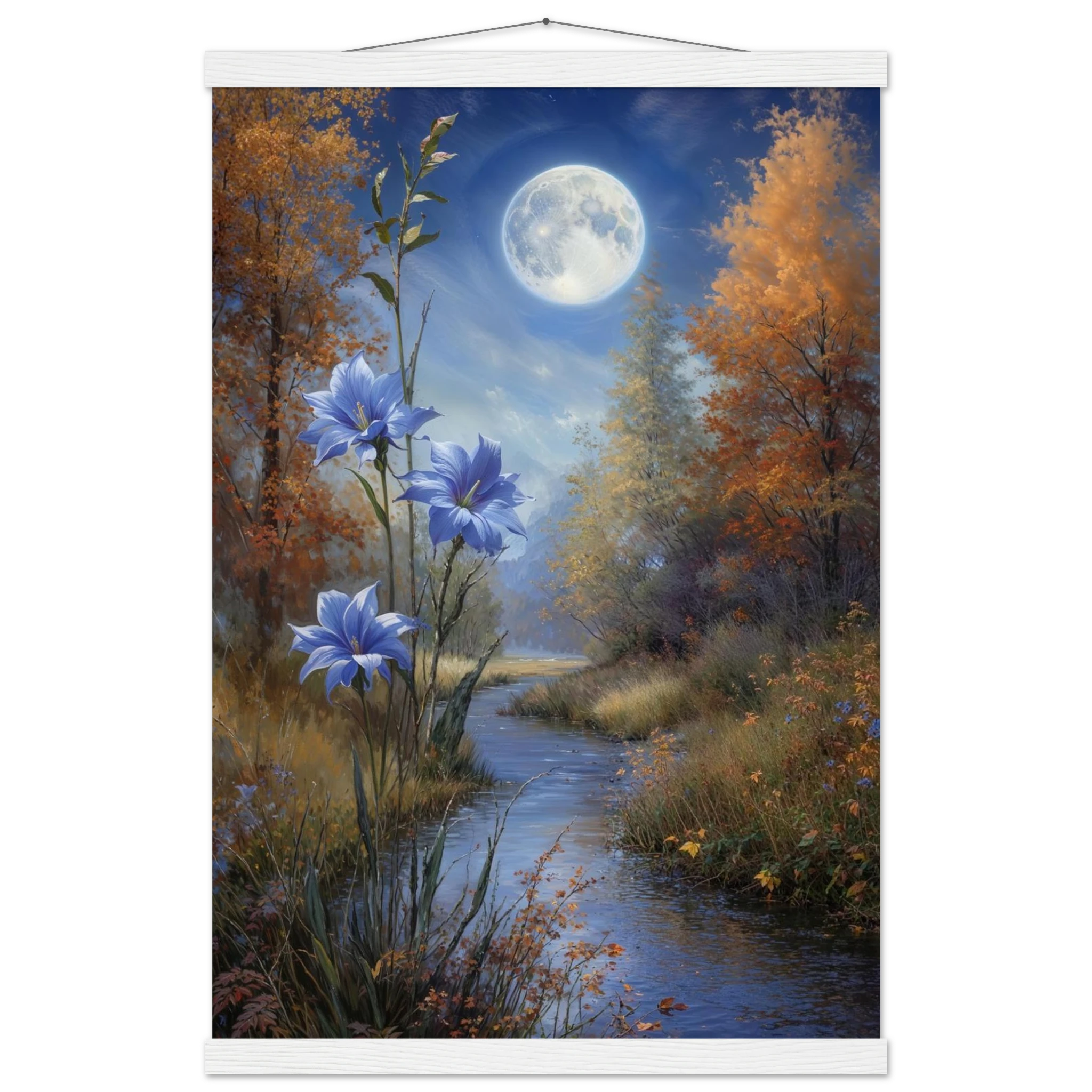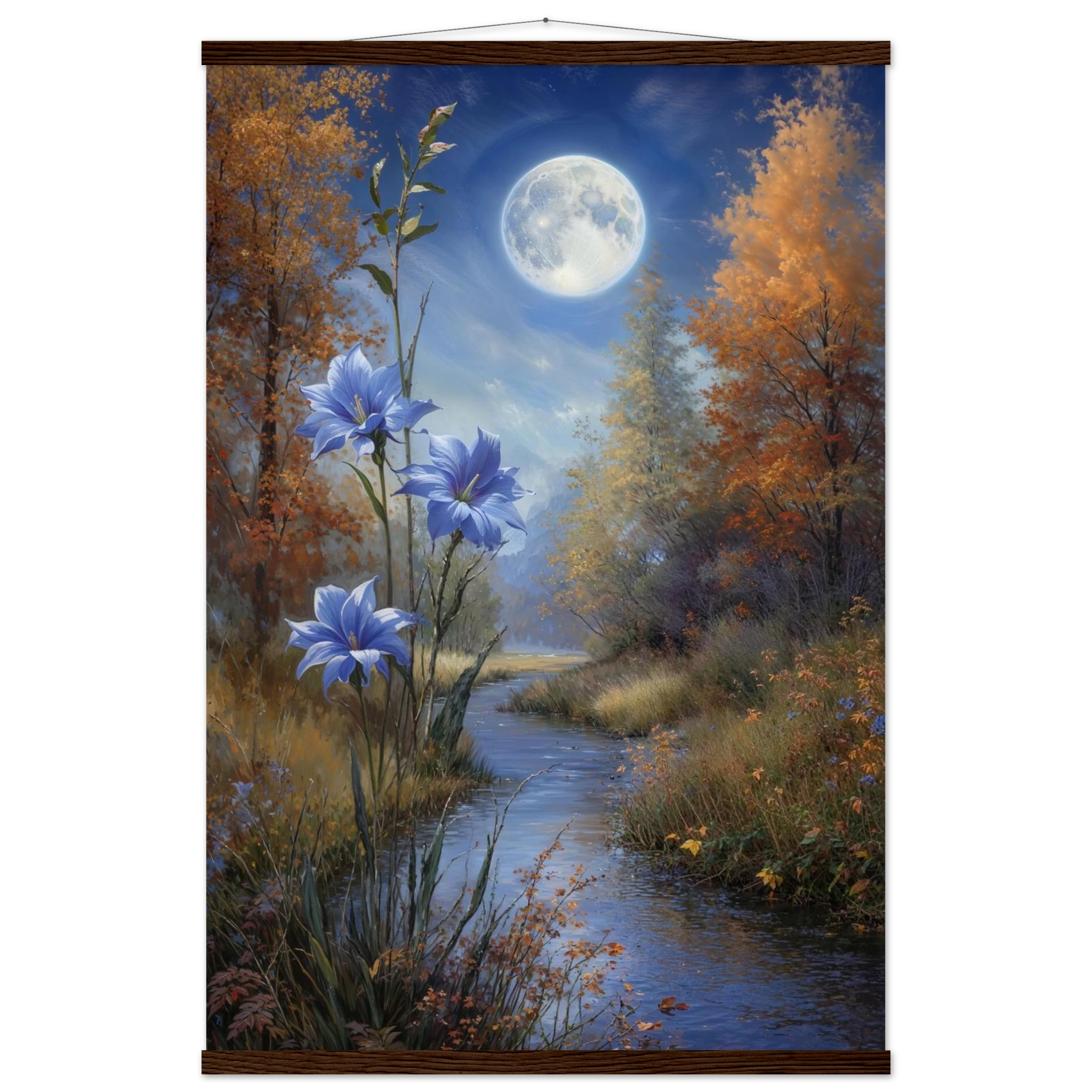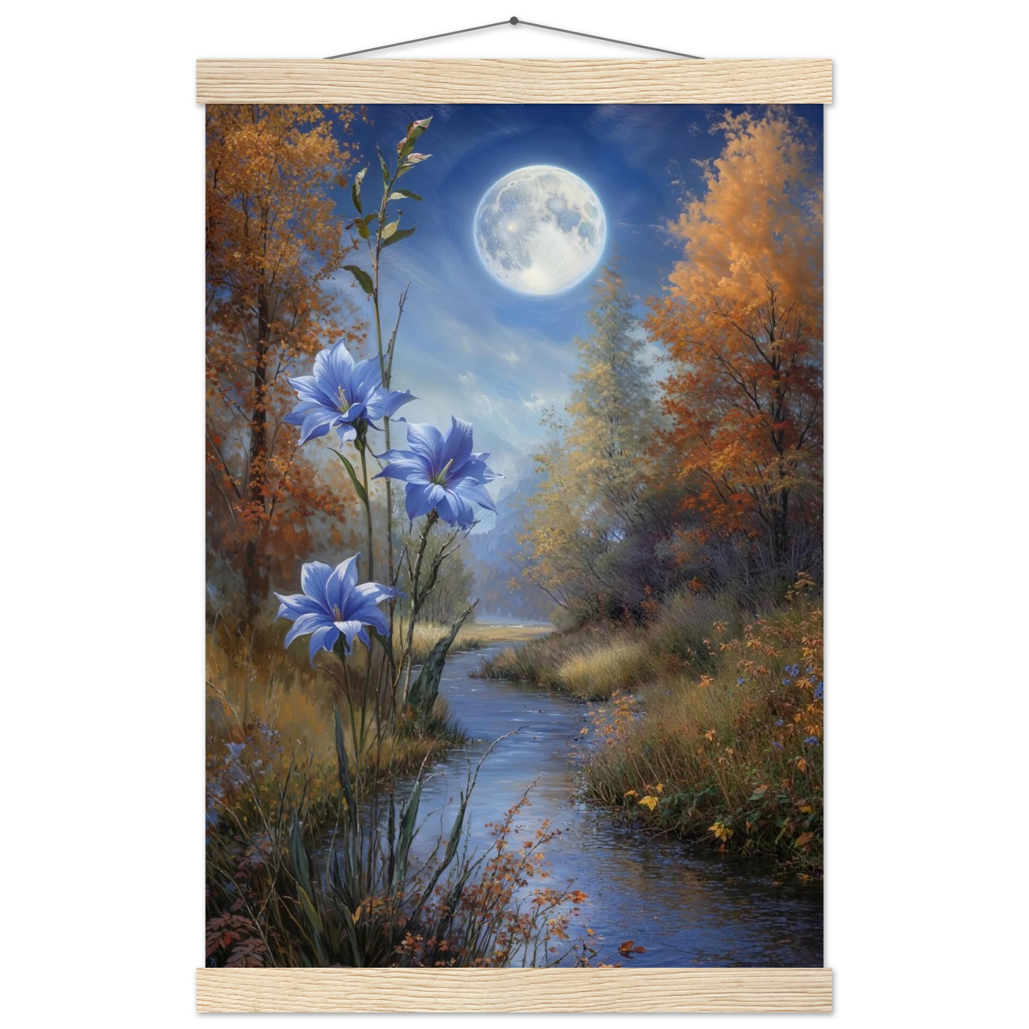 Embrace the quiet beauty of a crisp October night with this serene digital painting of an autumn landscape. This vertical composition features elegant blue flowers in the foreground, their petals arching gracefully against a rich tapestry of orange, red, and brown autumn leaves.