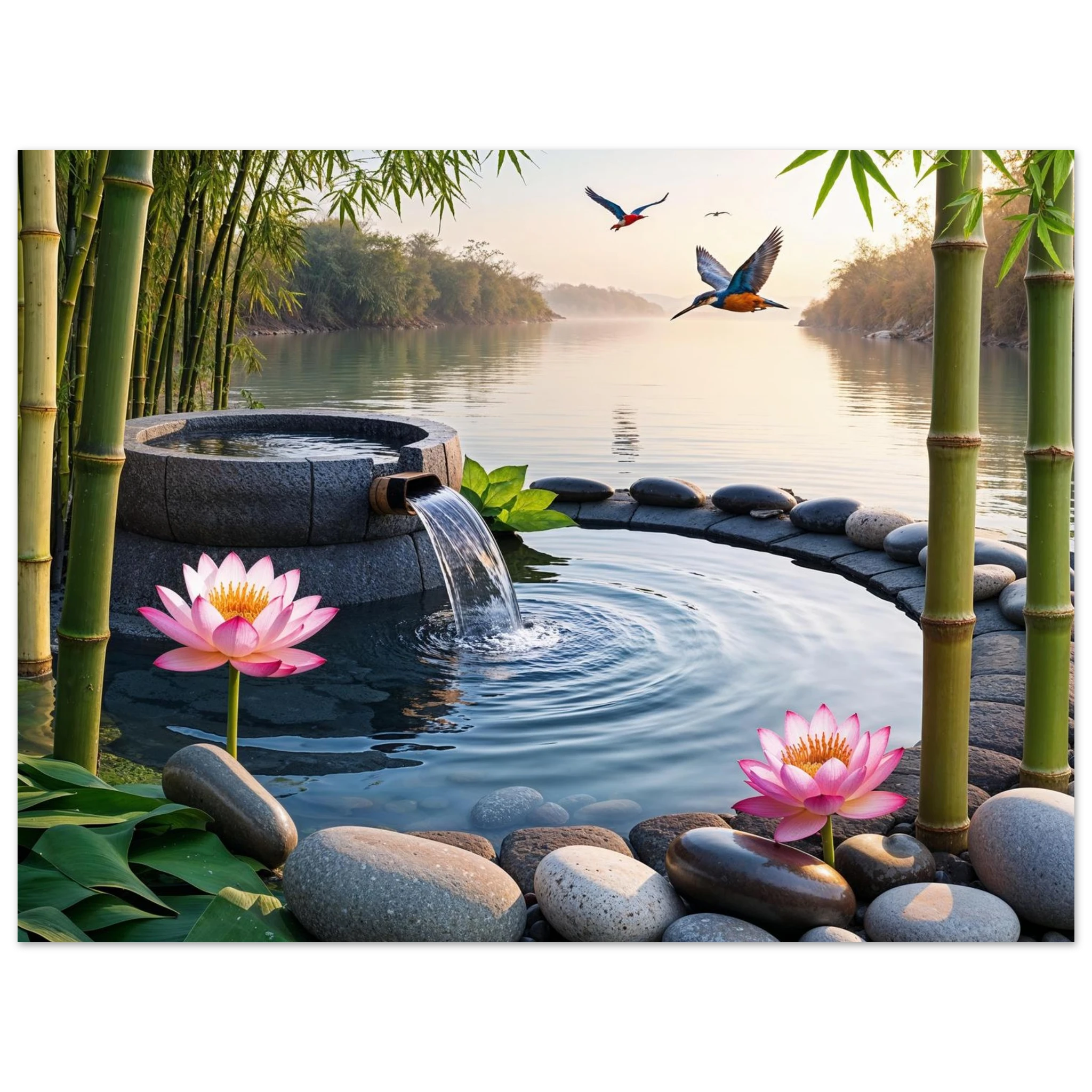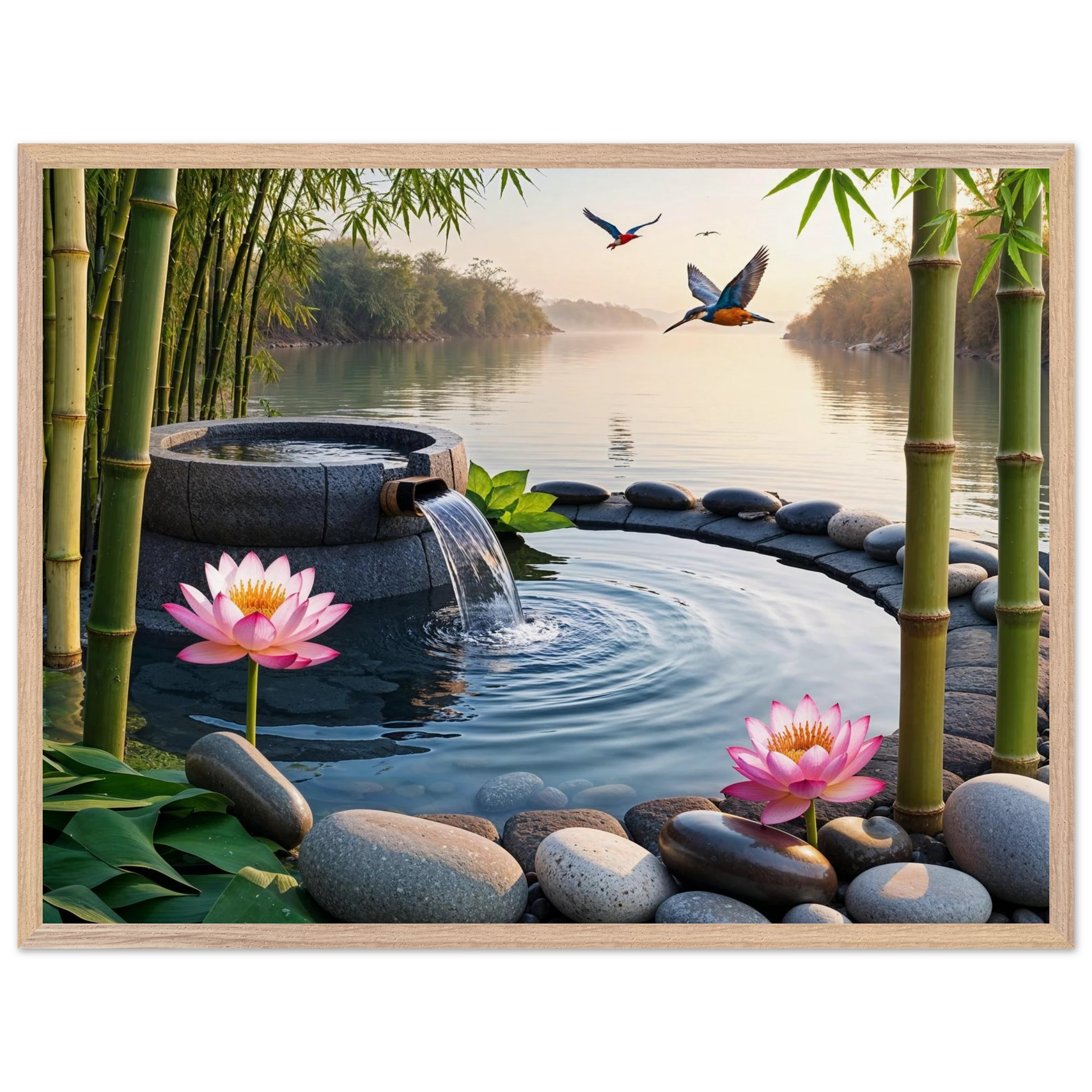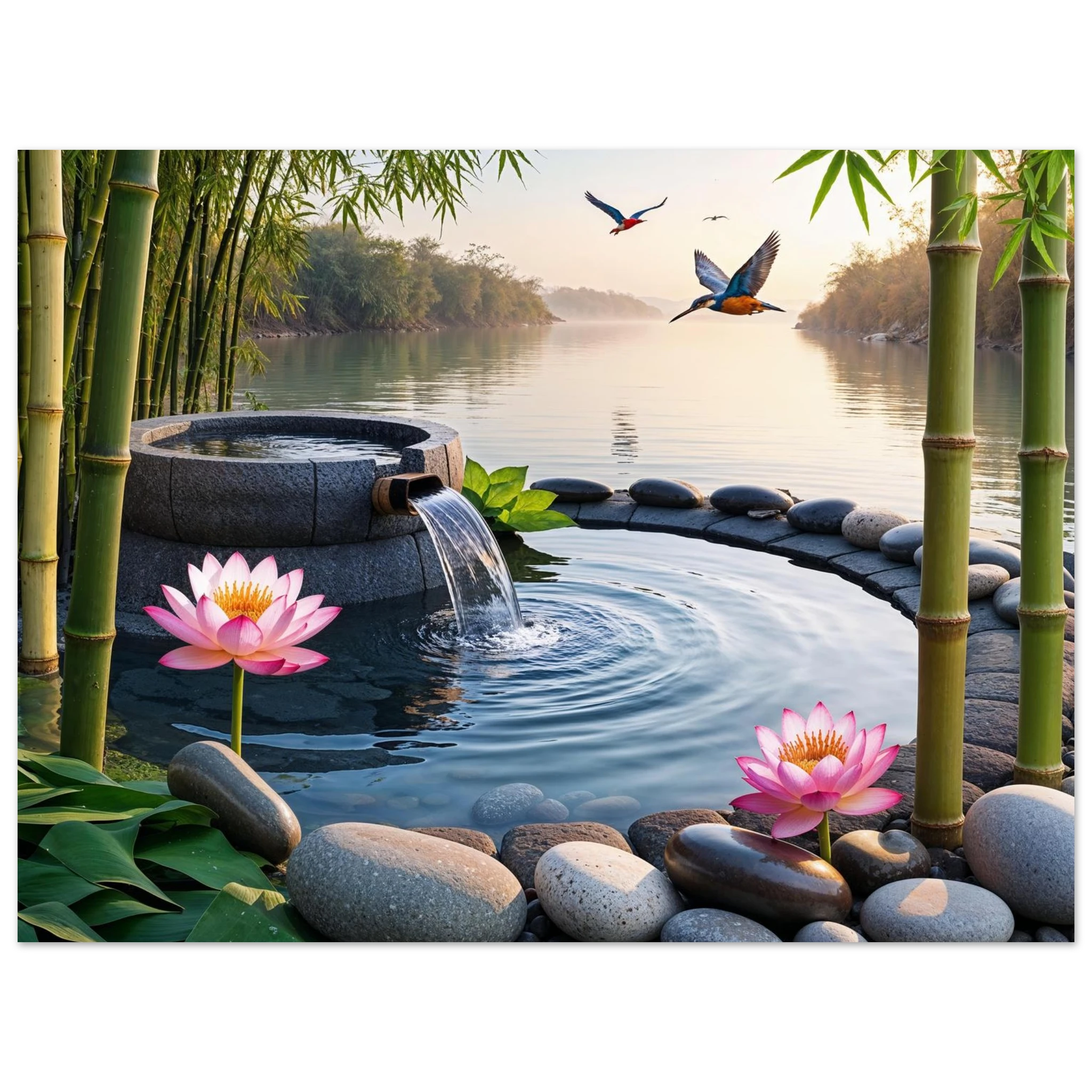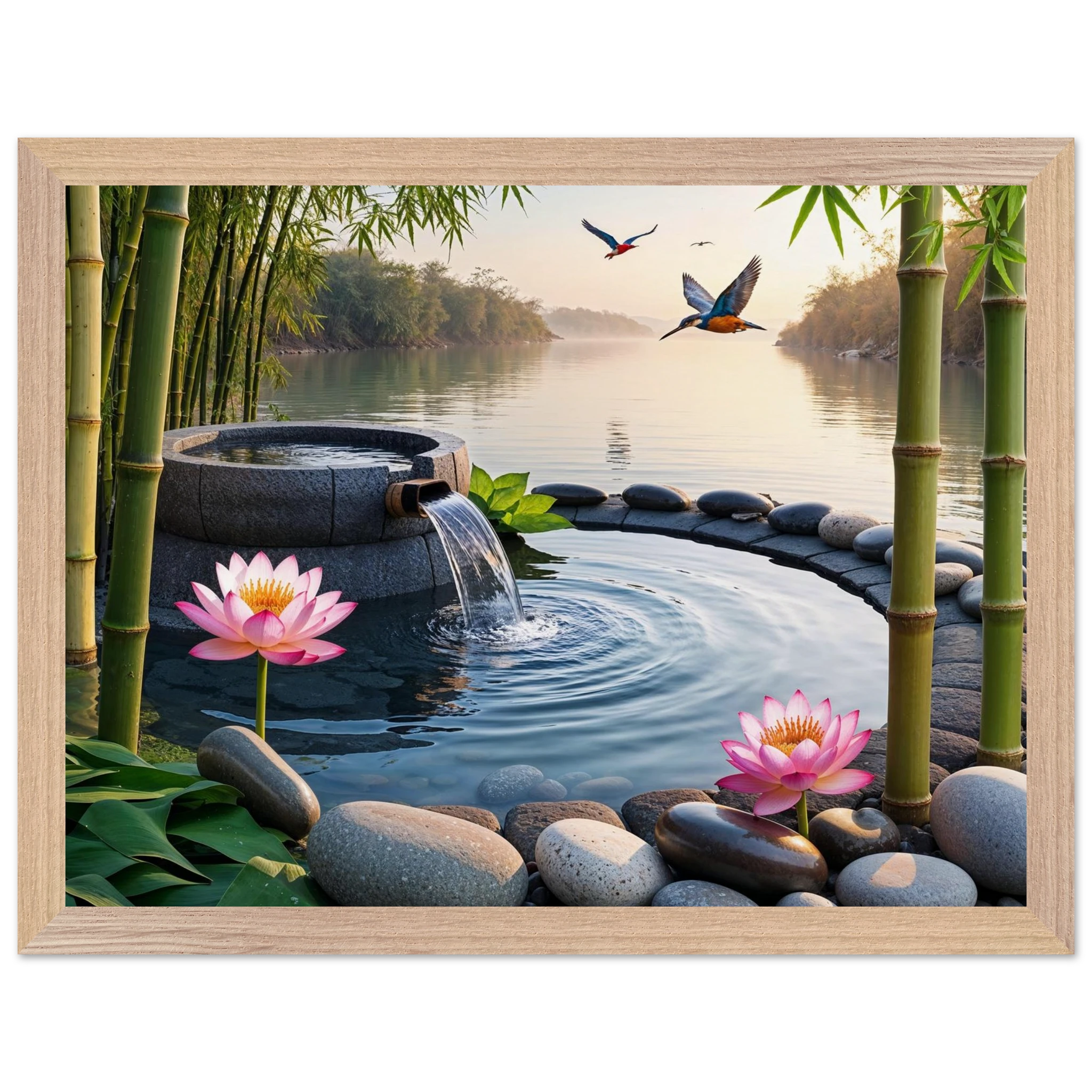 This beautiful art print features a peaceful and detailed landscape. At the centre, a gentle stream of water flows from a bamboo pipe into a smooth stone basin. The scene is rich with natural details, including lush bamboo stalks, two vibrant lotus flowers, and a kingfisher bird gracefully flying overhead. A collection of smooth, aesthetically pleasing stones adds to the calm, meditative feel. The entire piece is illuminated by the warm, golden light of a sunset, making it a perfect addition to a zen decor or meditation space. This high-quality print is ideal for adding a touch of tranquil nature to your walls.