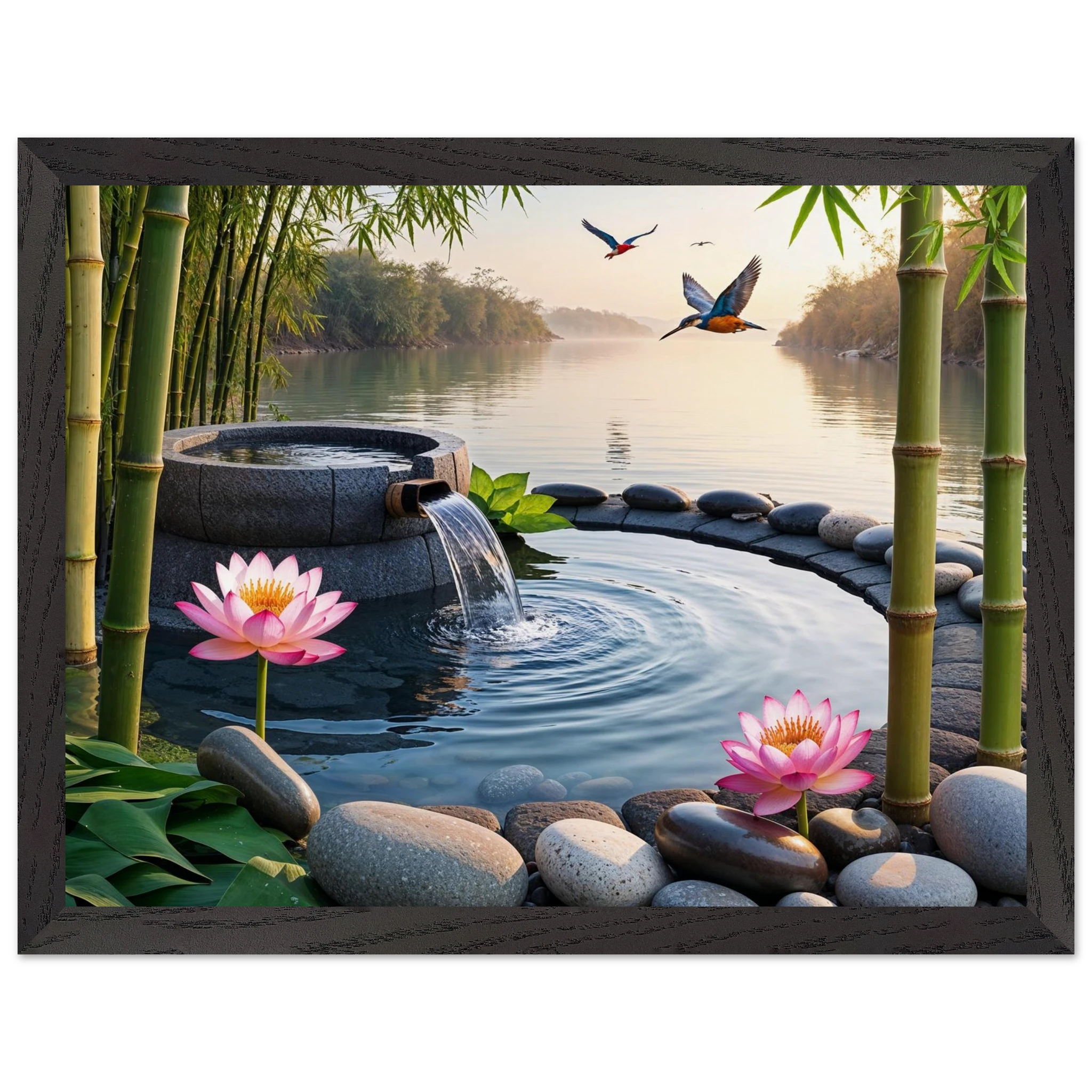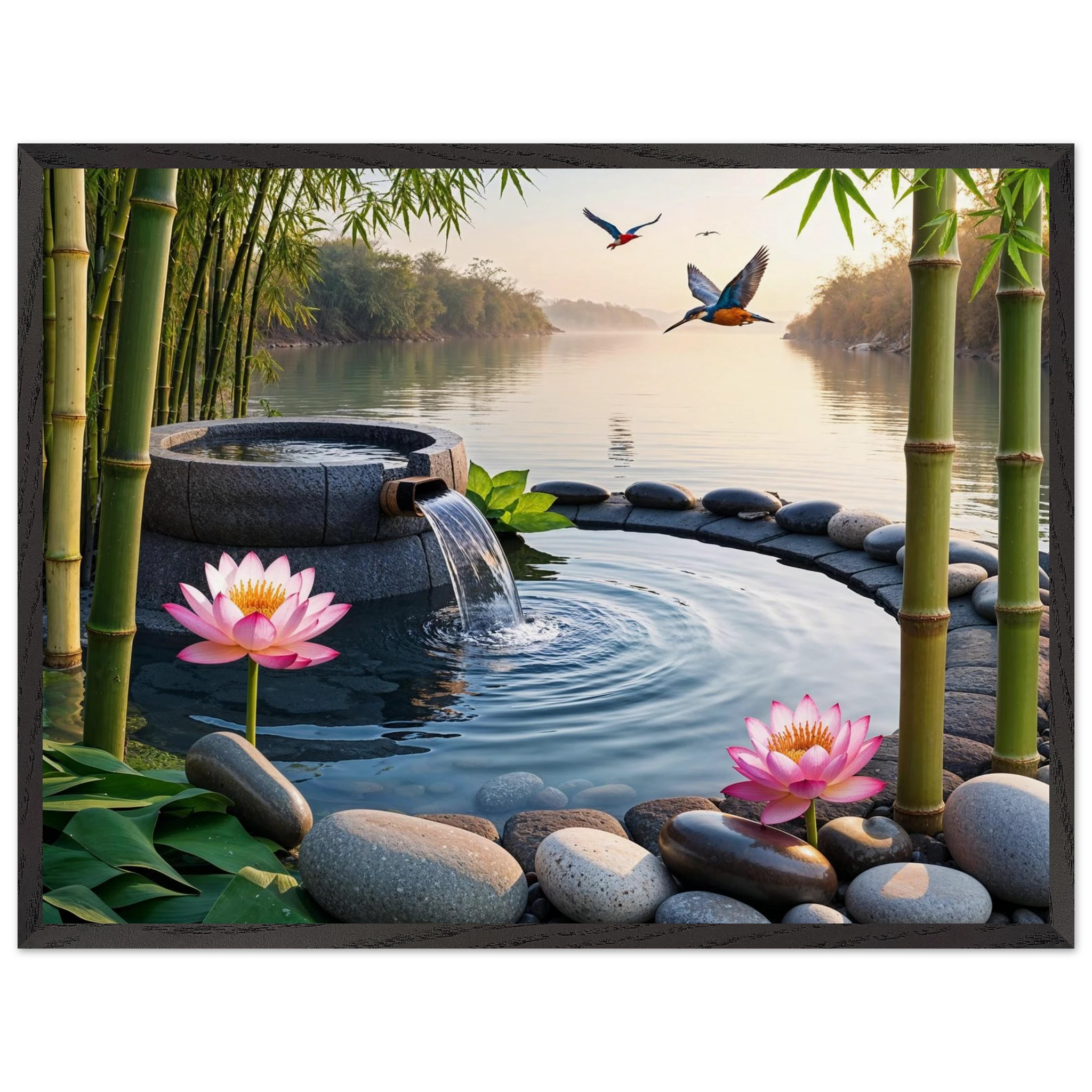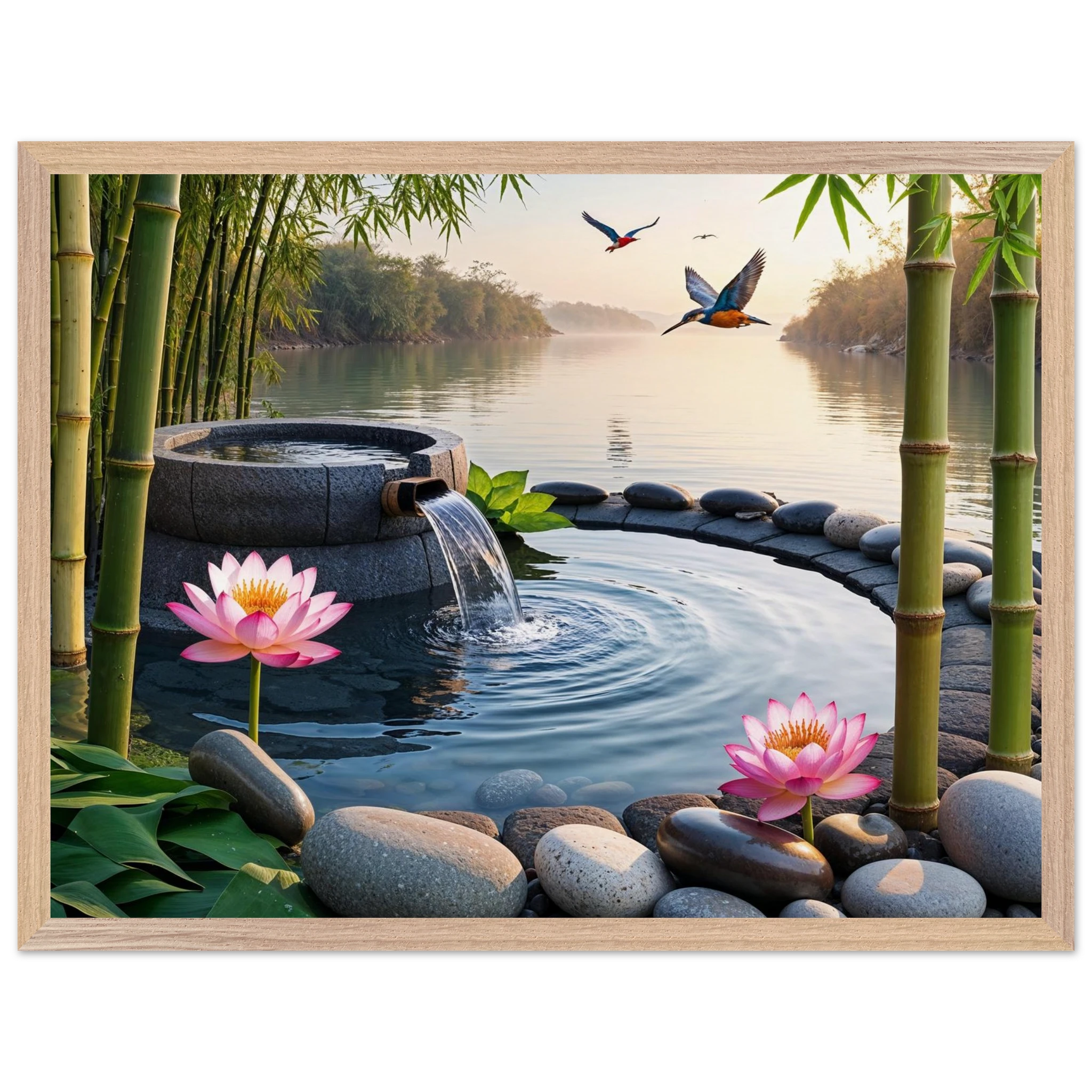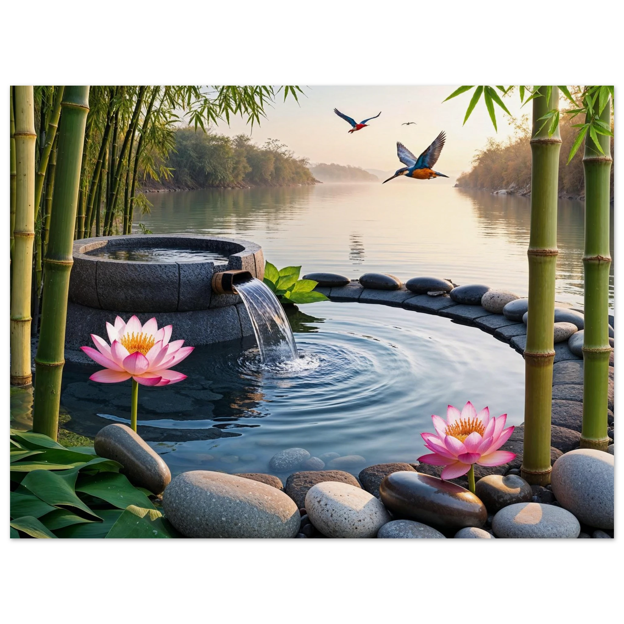This beautiful art print features a peaceful and detailed landscape. At the centre, a gentle stream of water flows from a bamboo pipe into a smooth stone basin. The scene is rich with natural details, including lush bamboo stalks, two vibrant lotus flowers, and a kingfisher bird gracefully flying overhead. A collection of smooth, aesthetically pleasing stones adds to the calm, meditative feel. The entire piece is illuminated by the warm, golden light of a sunset, making it a perfect addition to a zen decor or meditation space. This high-quality print is ideal for adding a touch of tranquil nature to your walls.