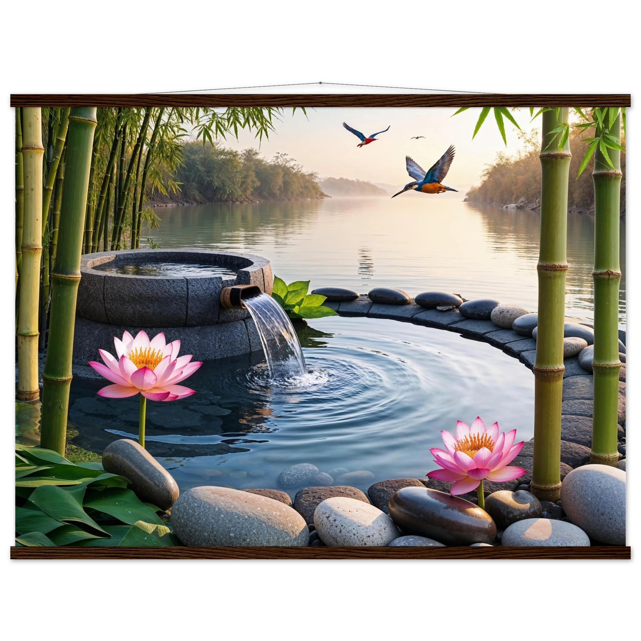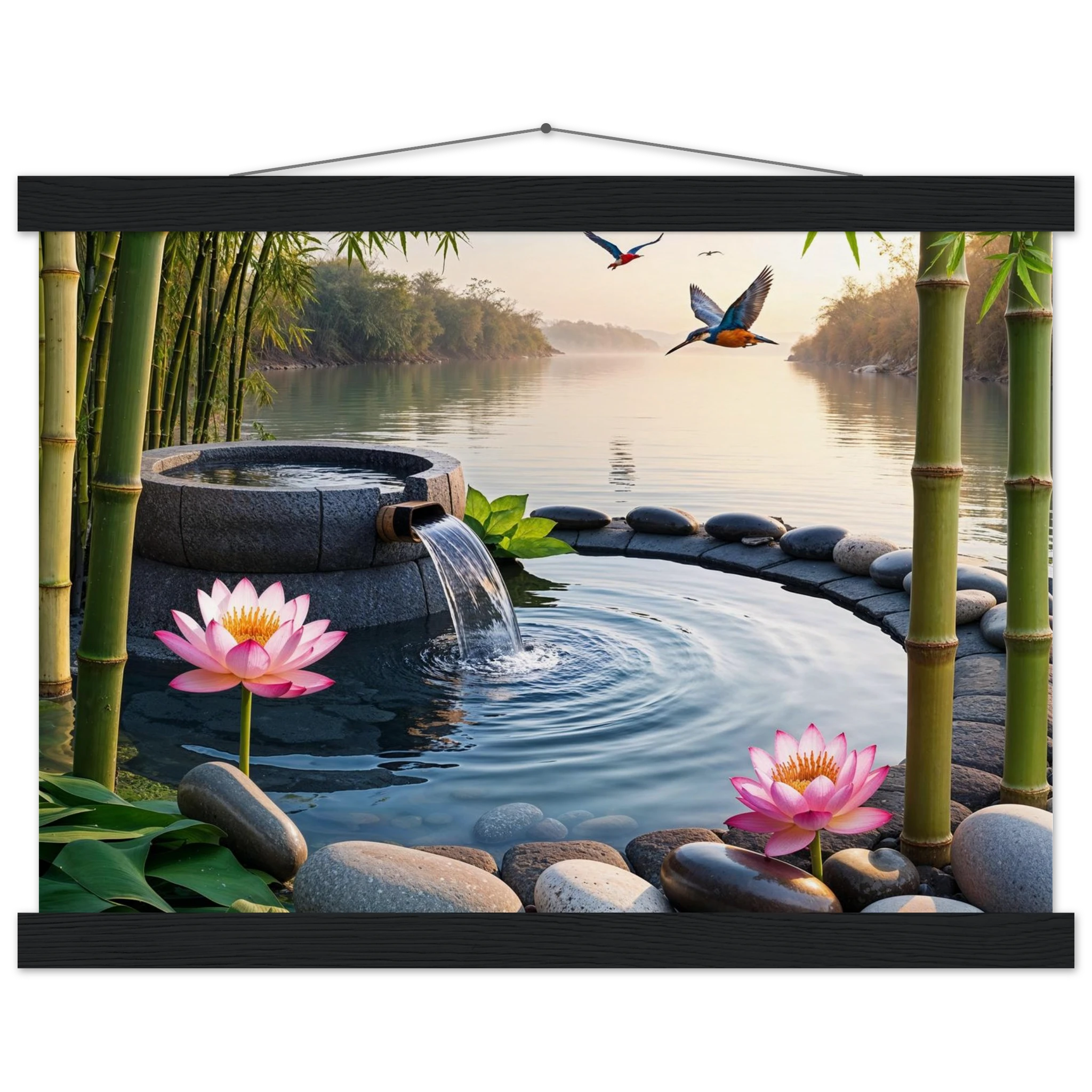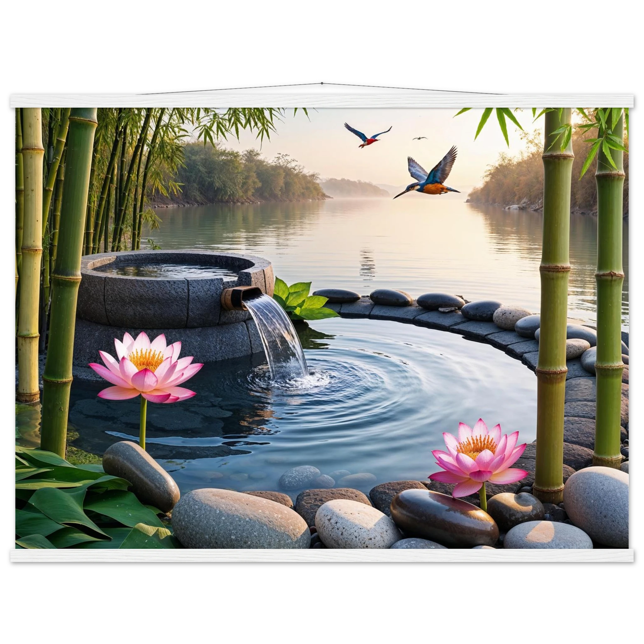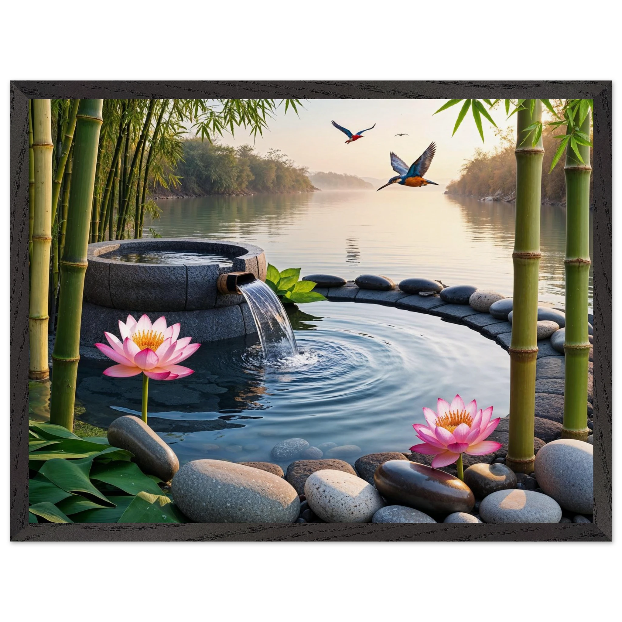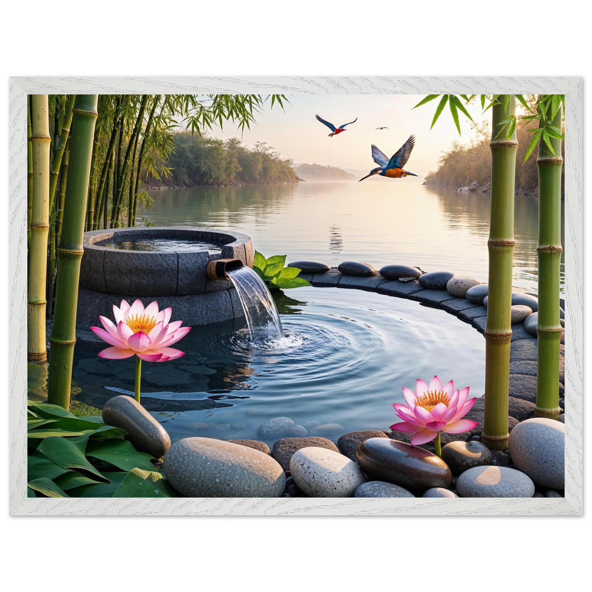 This beautiful art print features a peaceful and detailed landscape. At the centre, a gentle stream of water flows from a bamboo pipe into a smooth stone basin. The scene is rich with natural details, including lush bamboo stalks, two vibrant lotus flowers, and a kingfisher bird gracefully flying overhead. A collection of smooth, aesthetically pleasing stones adds to the calm, meditative feel. The entire piece is illuminated by the warm, golden light of a sunset, making it a perfect addition to a zen decor or meditation space. This high-quality print is ideal for adding a touch of tranquil nature to your walls.