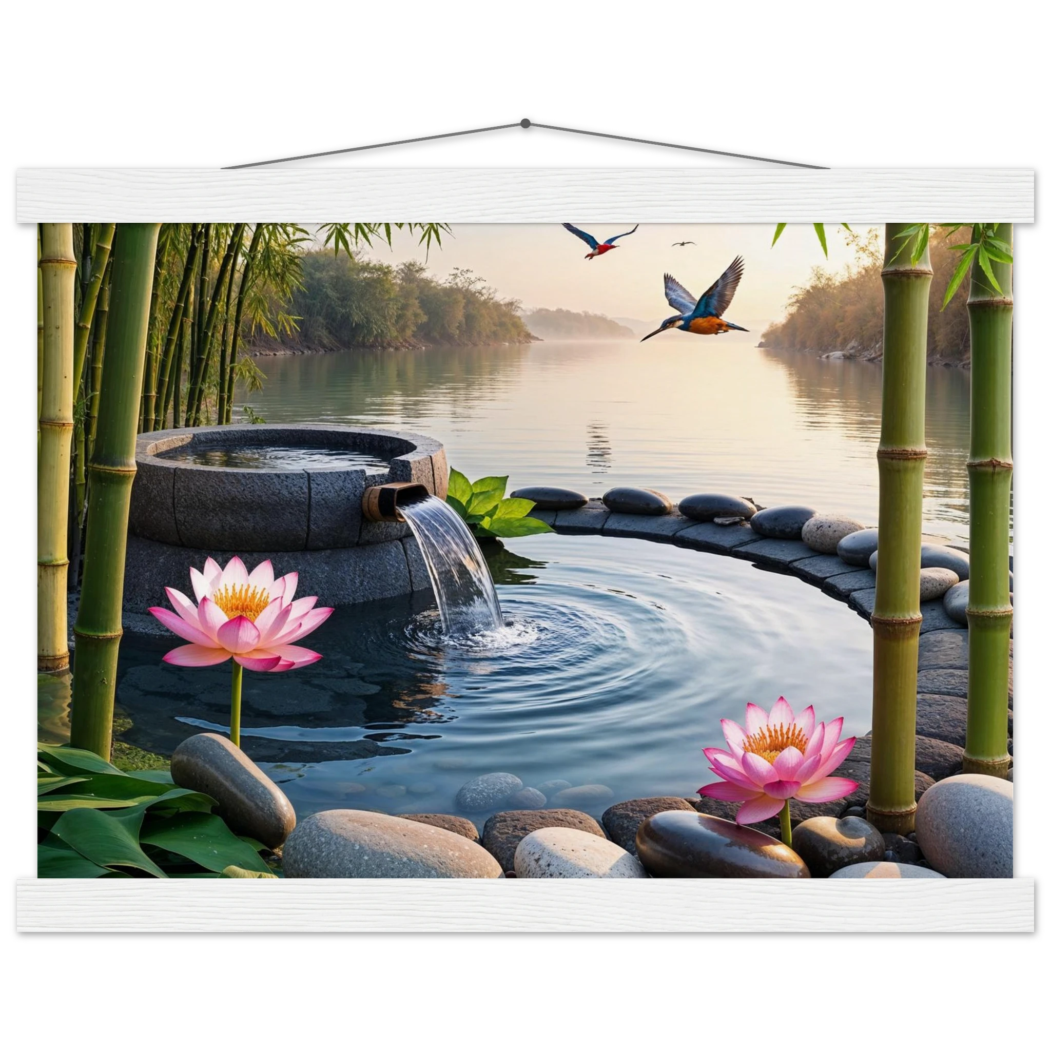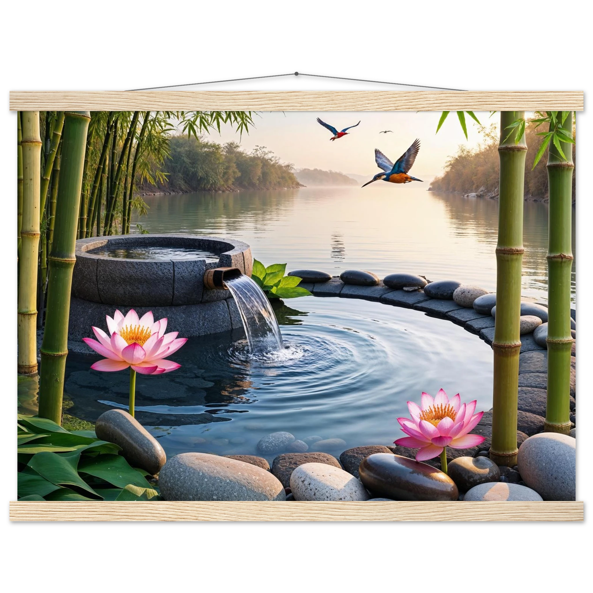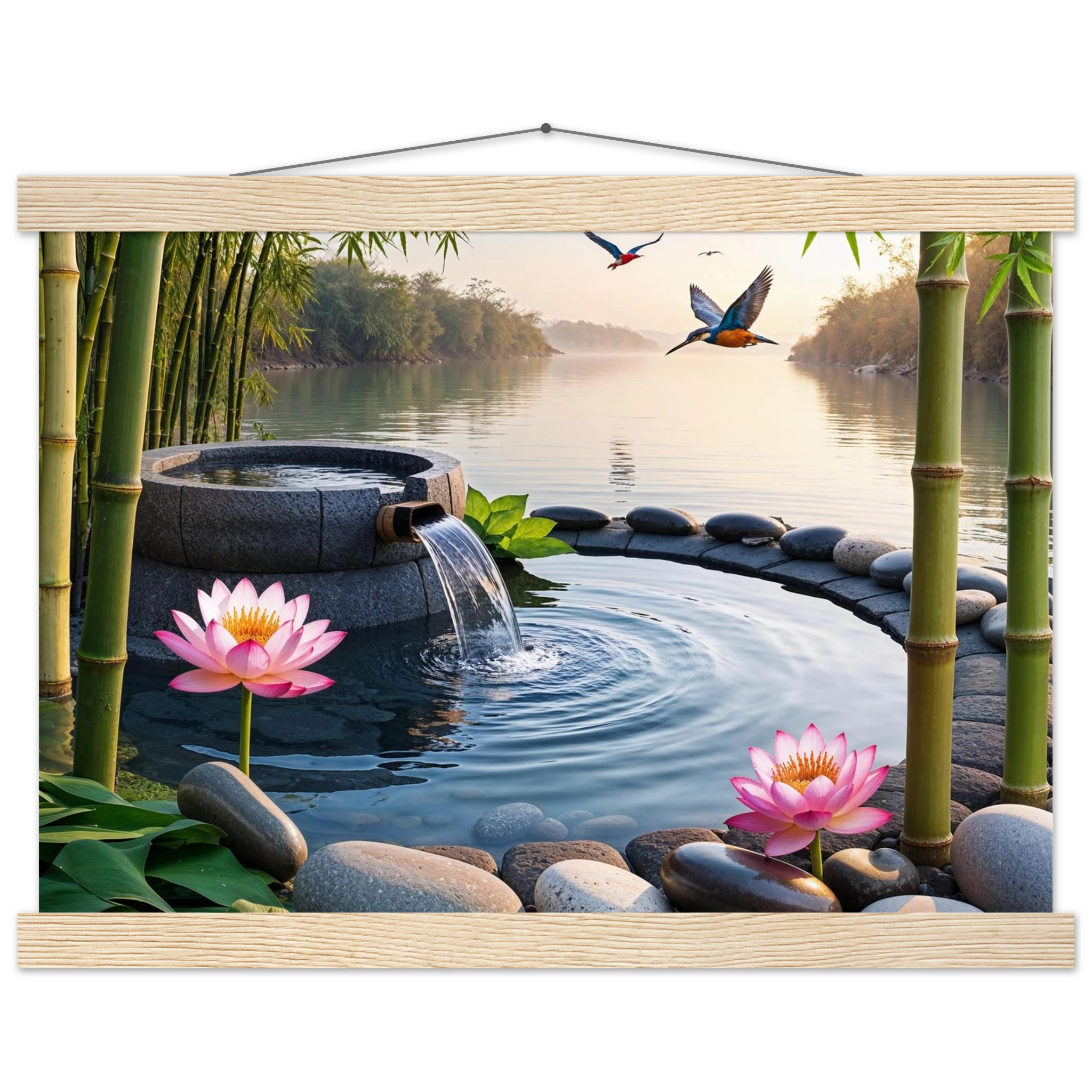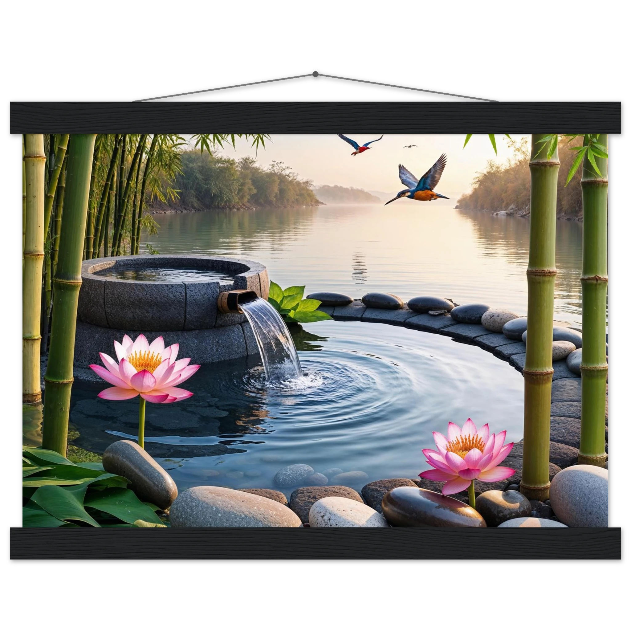 This beautiful art print features a peaceful and detailed landscape. At the centre, a gentle stream of water flows from a bamboo pipe into a smooth stone basin. The scene is rich with natural details, including lush bamboo stalks, two vibrant lotus flowers, and a kingfisher bird gracefully flying overhead. A collection of smooth, aesthetically pleasing stones adds to the calm, meditative feel. The entire piece is illuminated by the warm, golden light of a sunset, making it a perfect addition to a zen decor or meditation space. This high-quality print is ideal for adding a touch of tranquil nature to your walls.