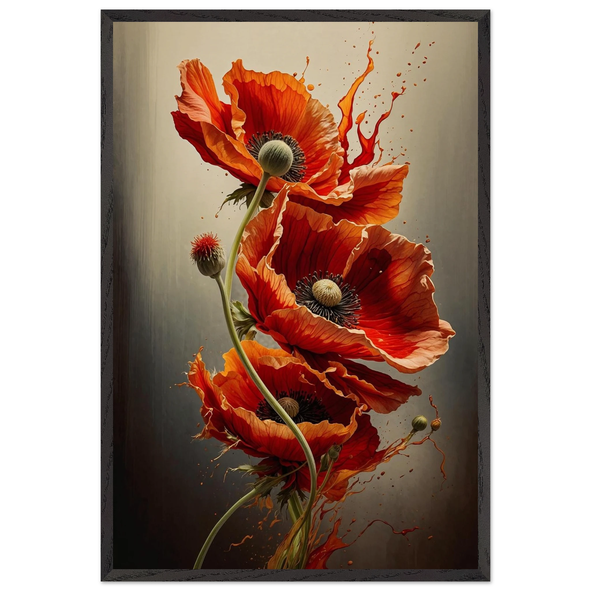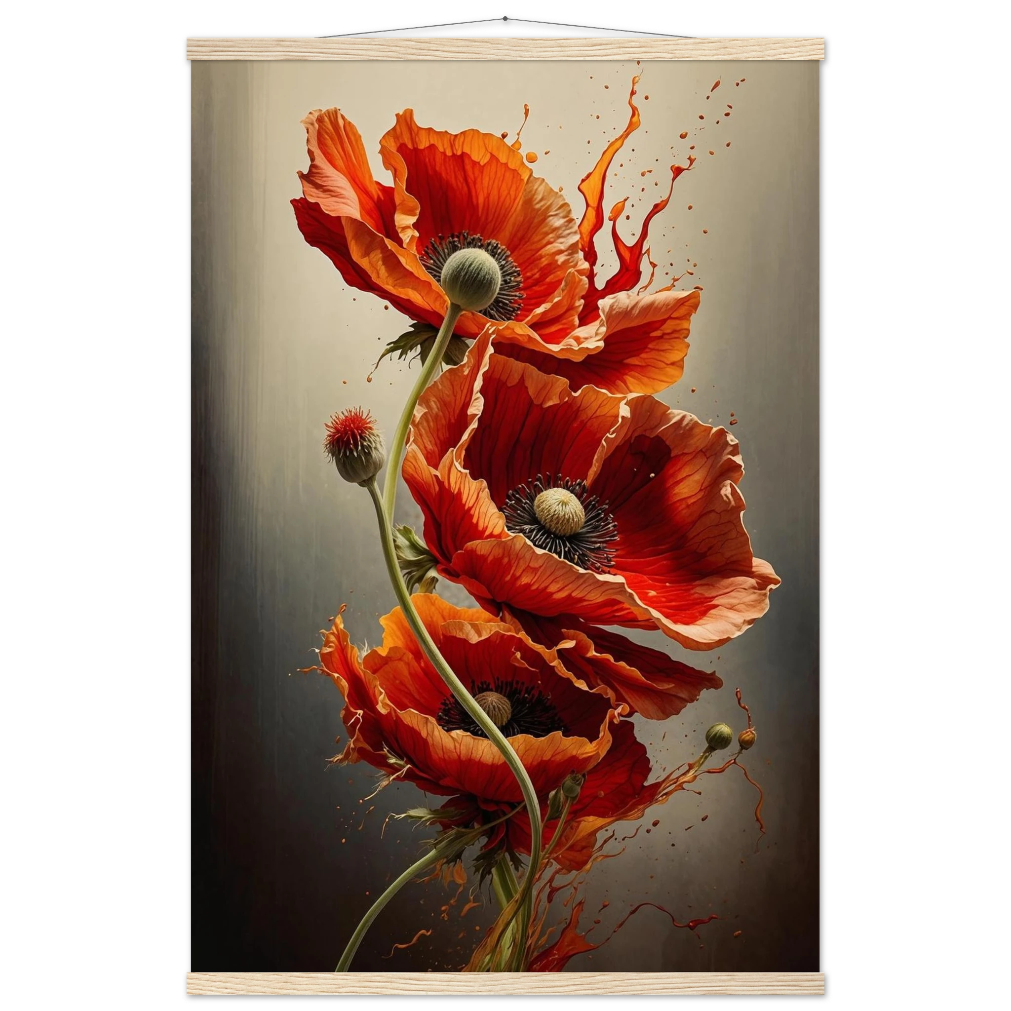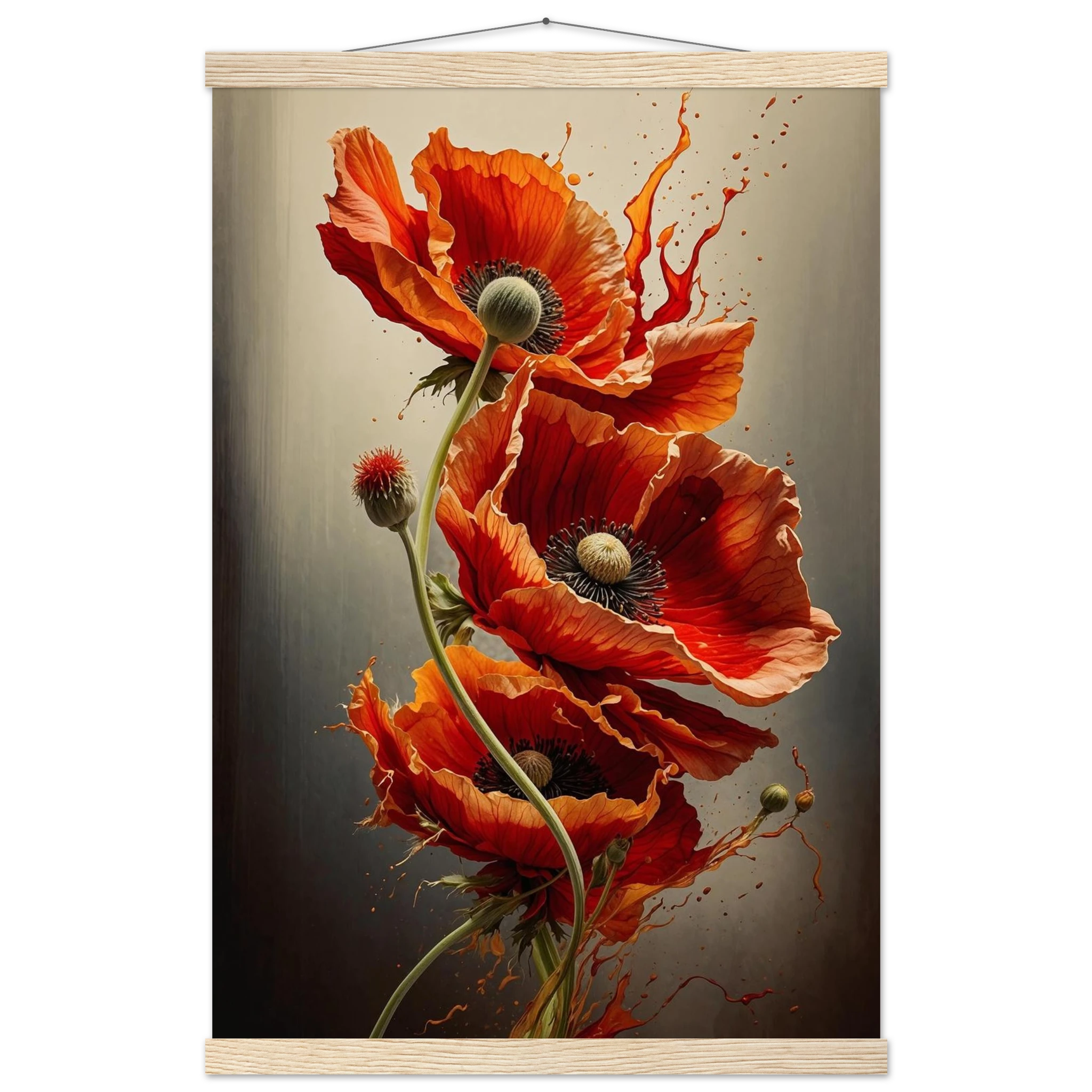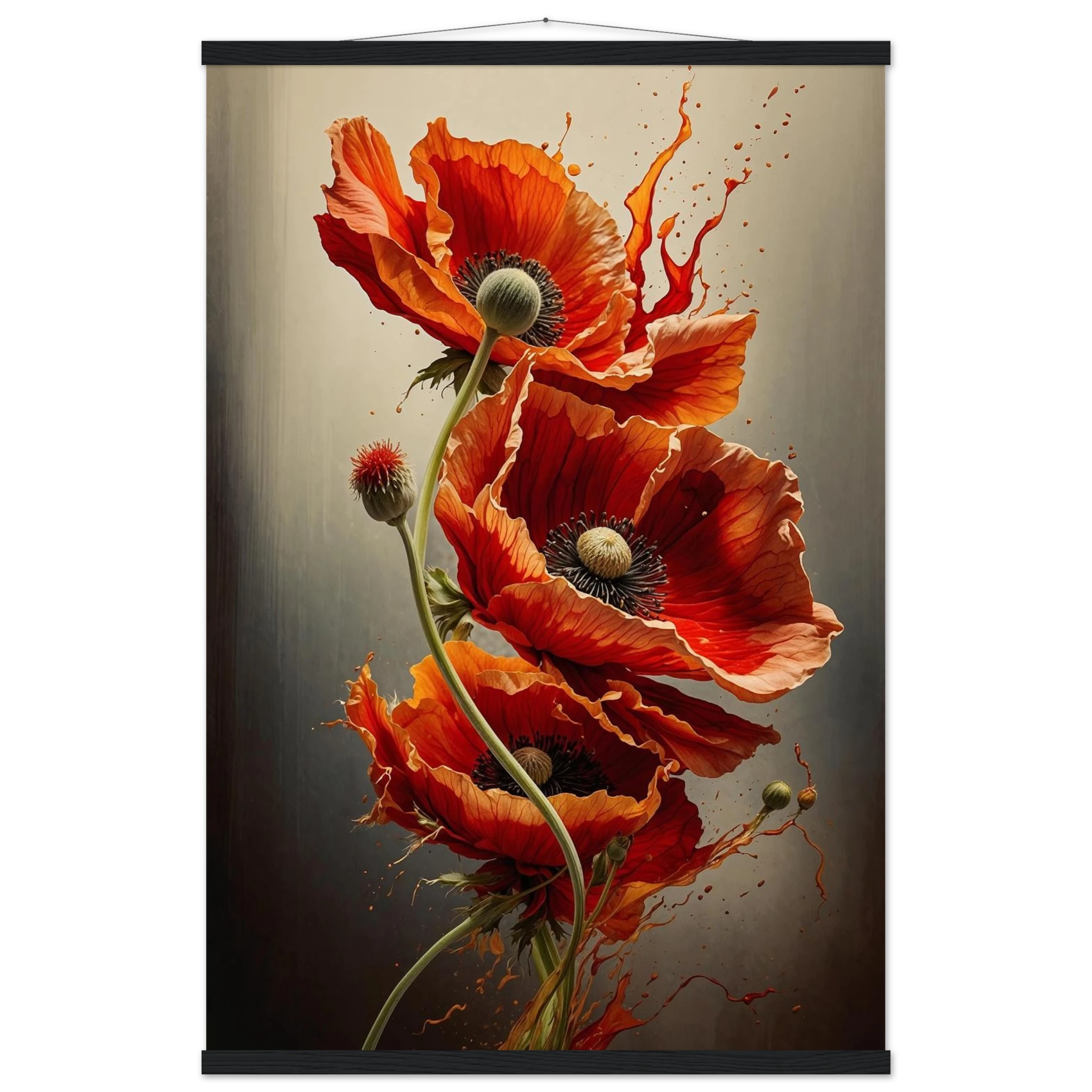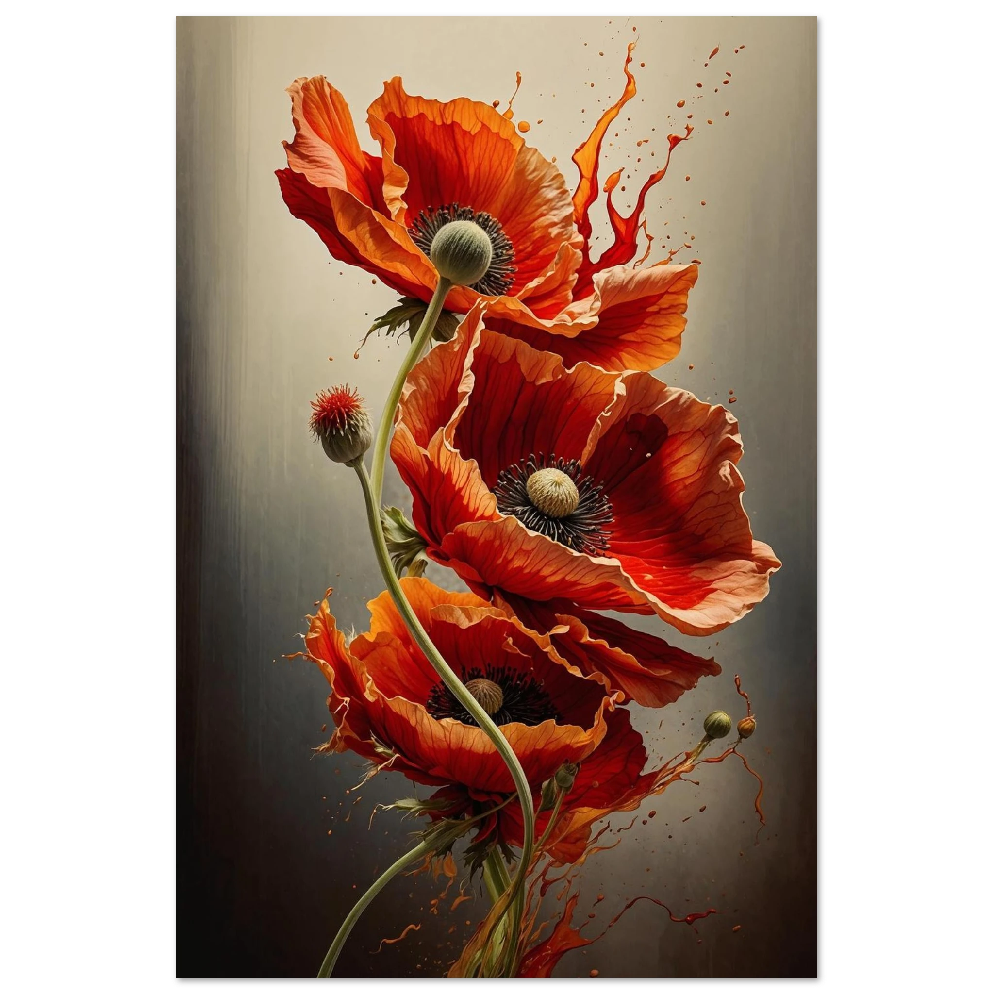 Make a bold statement with this striking red poppy digital artwork. This vertical composition features a dynamic arrangement of poppies, each rendered with intricate detail—from their delicate, paper-thin petals to their deep, textured centres. The gracefully curved stems create a sense of fluid movement, making the flowers appear as if they are dancing across the canvas.