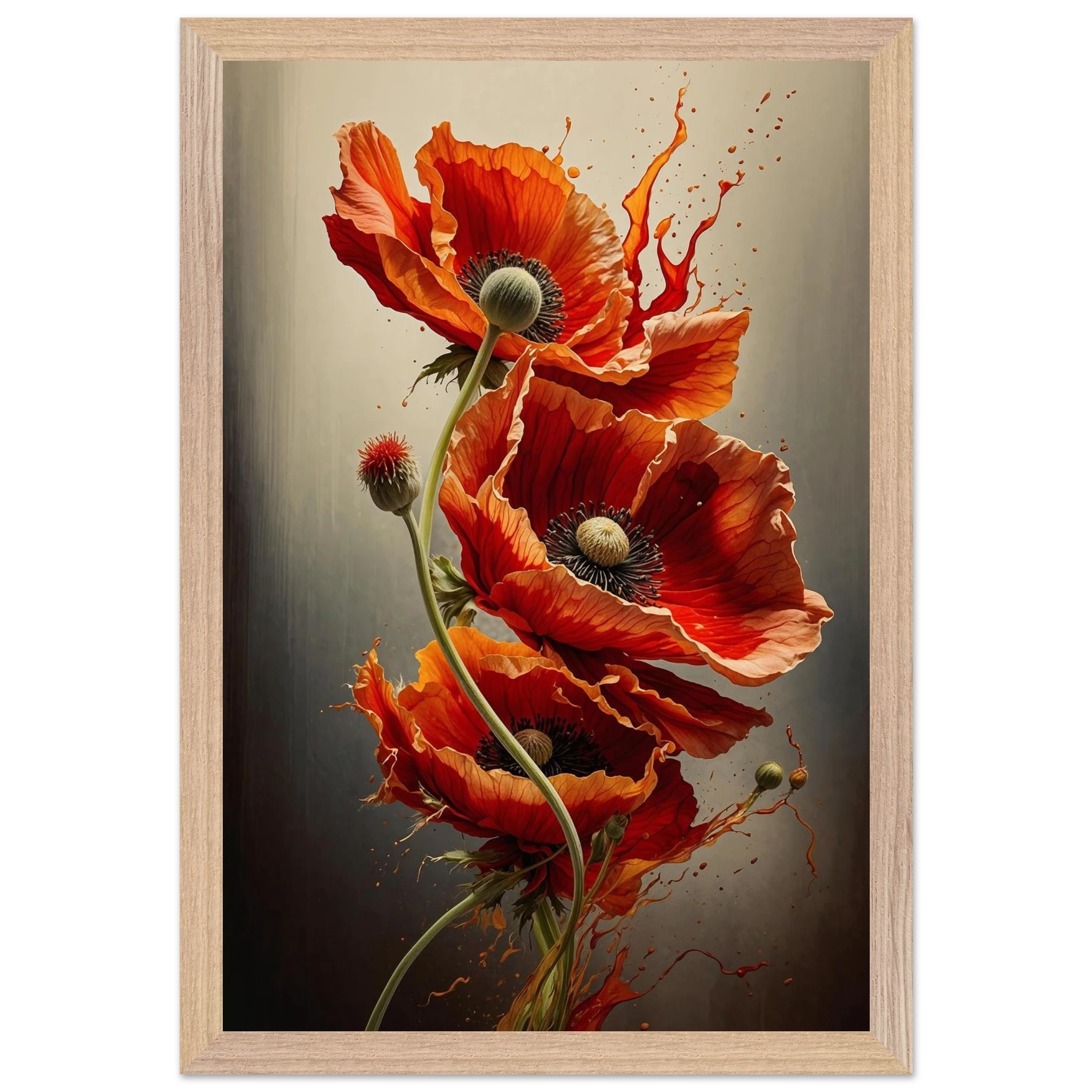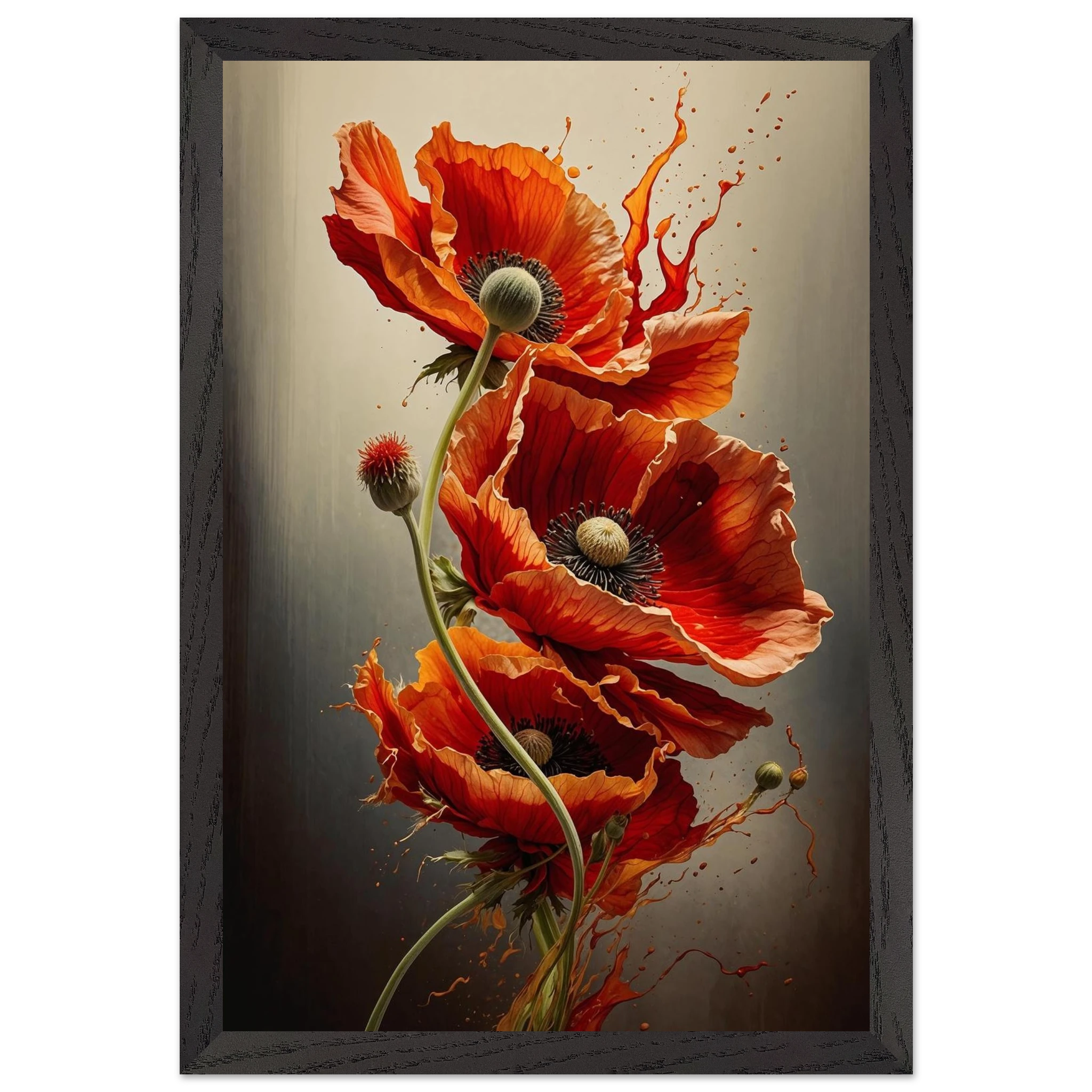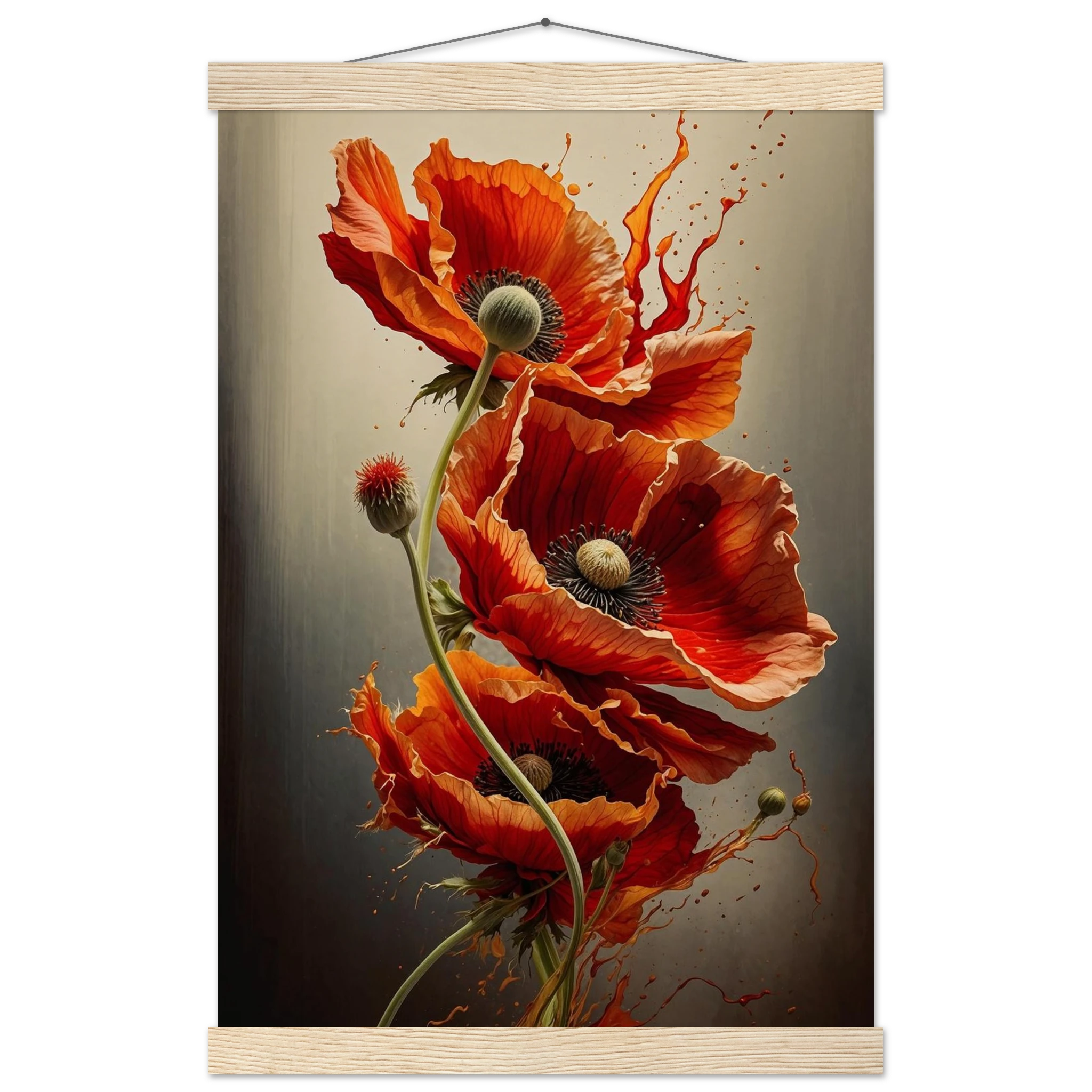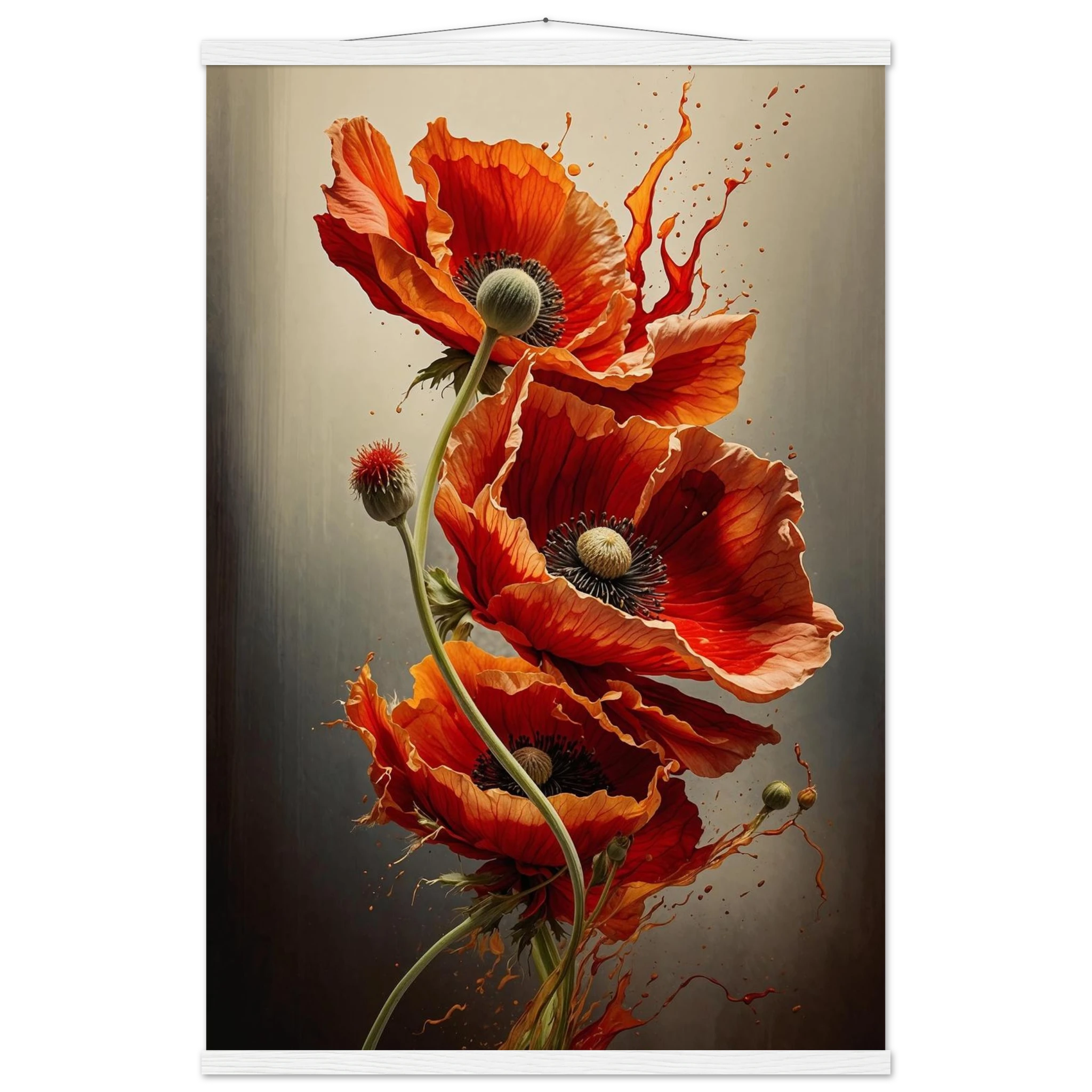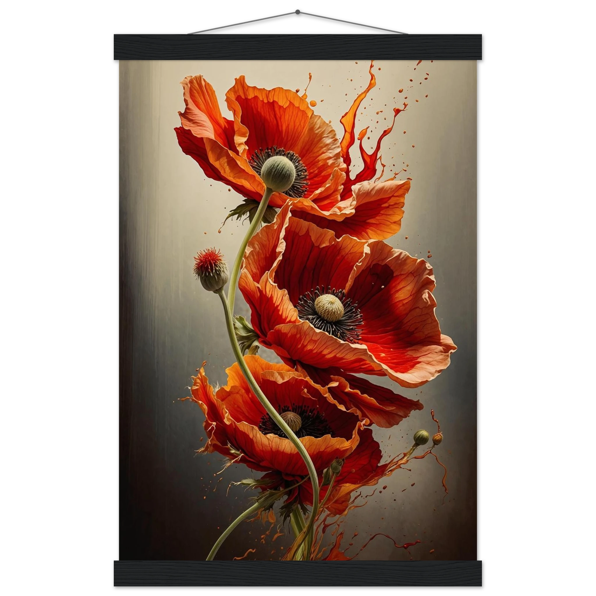 Make a bold statement with this striking red poppy digital artwork. This vertical composition features a dynamic arrangement of poppies, each rendered with intricate detail—from their delicate, paper-thin petals to their deep, textured centres. The gracefully curved stems create a sense of fluid movement, making the flowers appear as if they are dancing across the canvas.