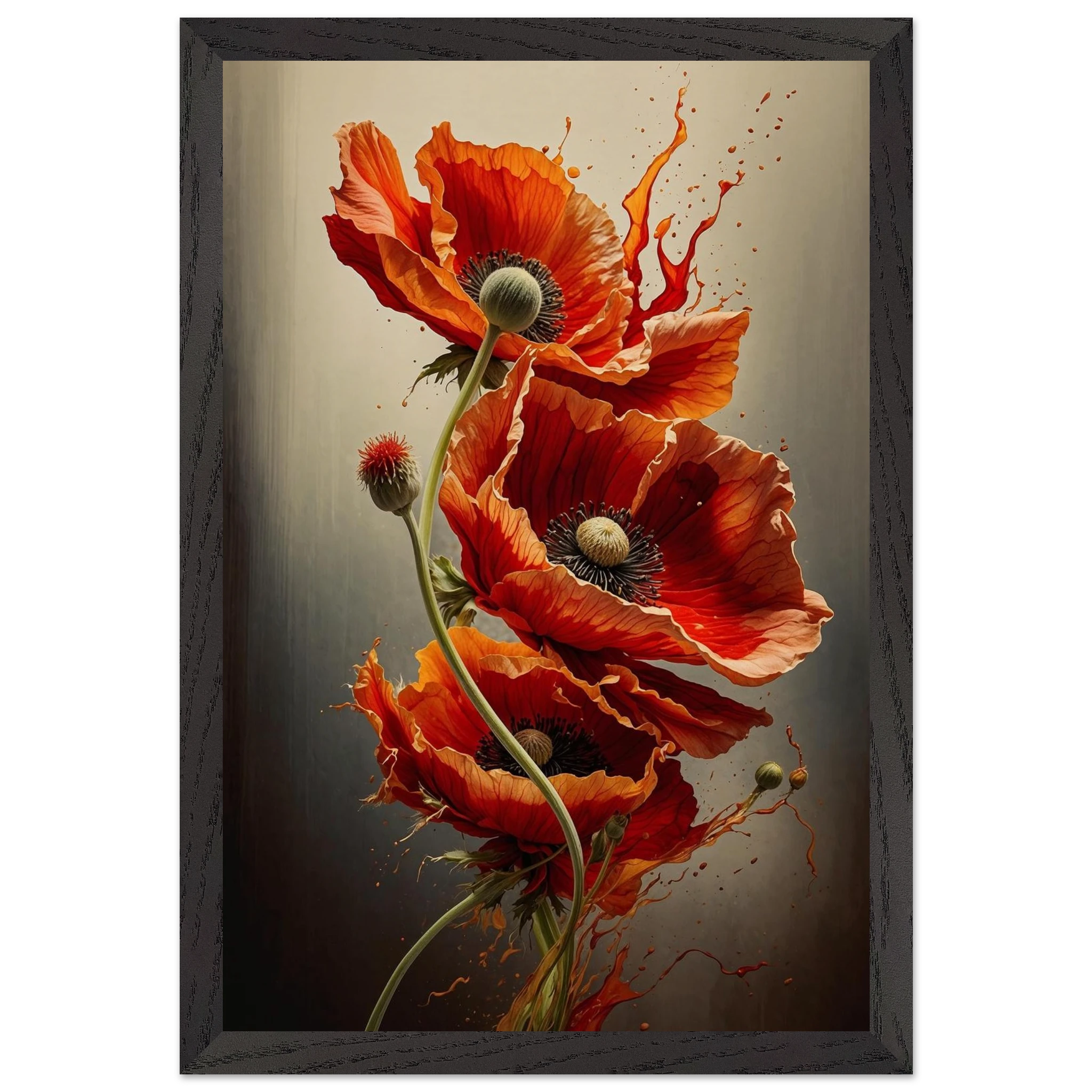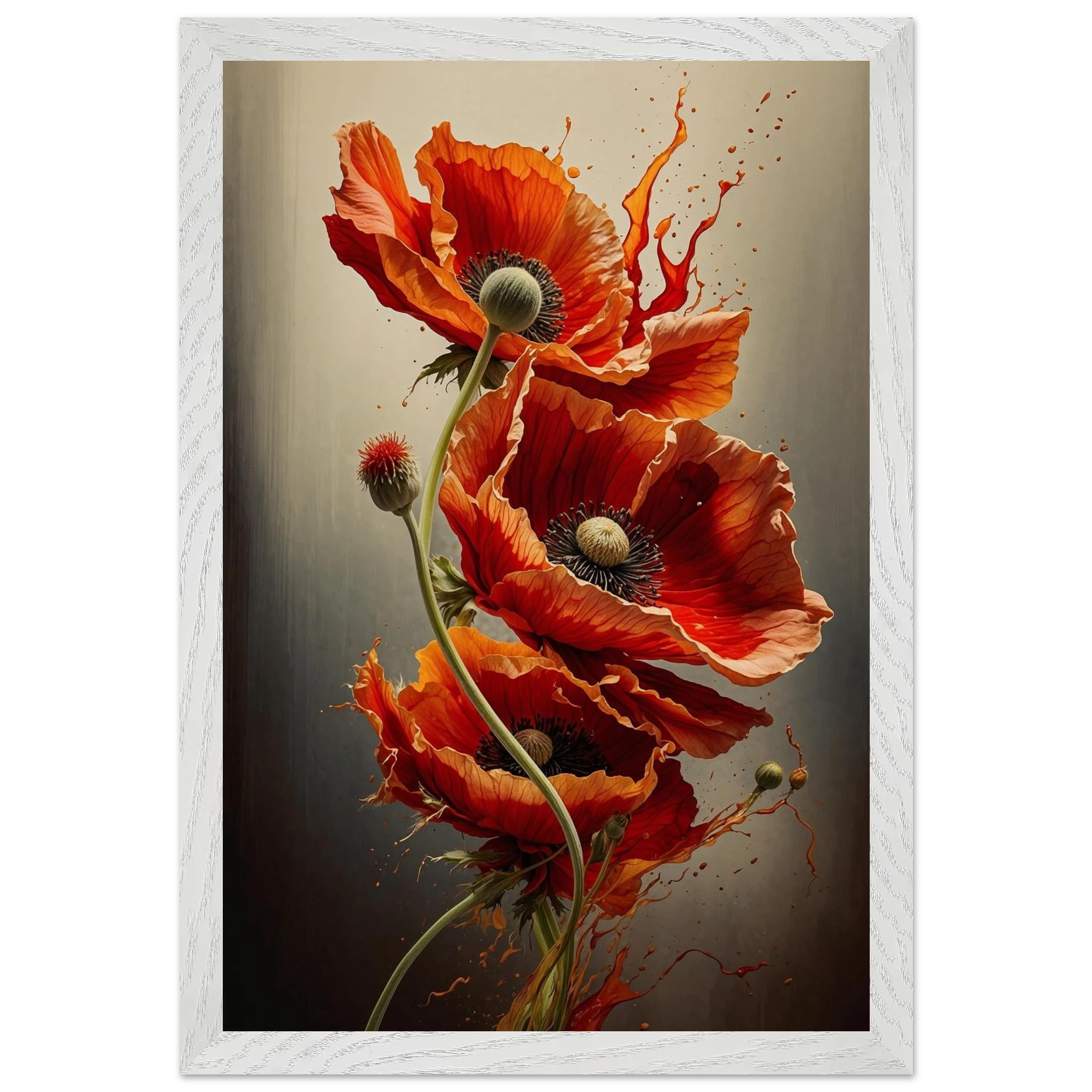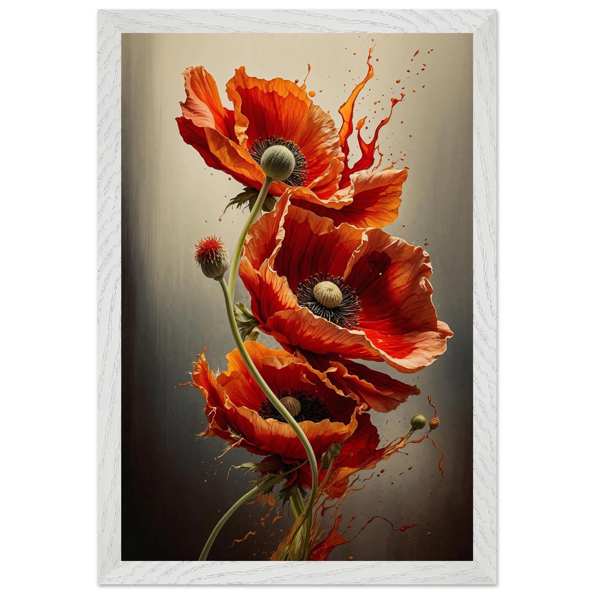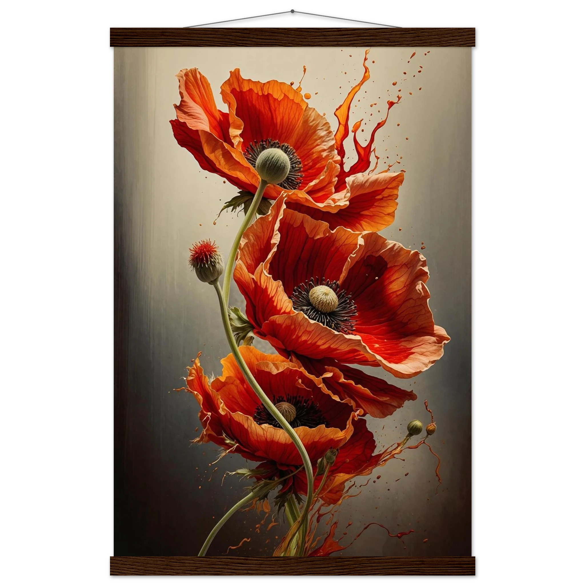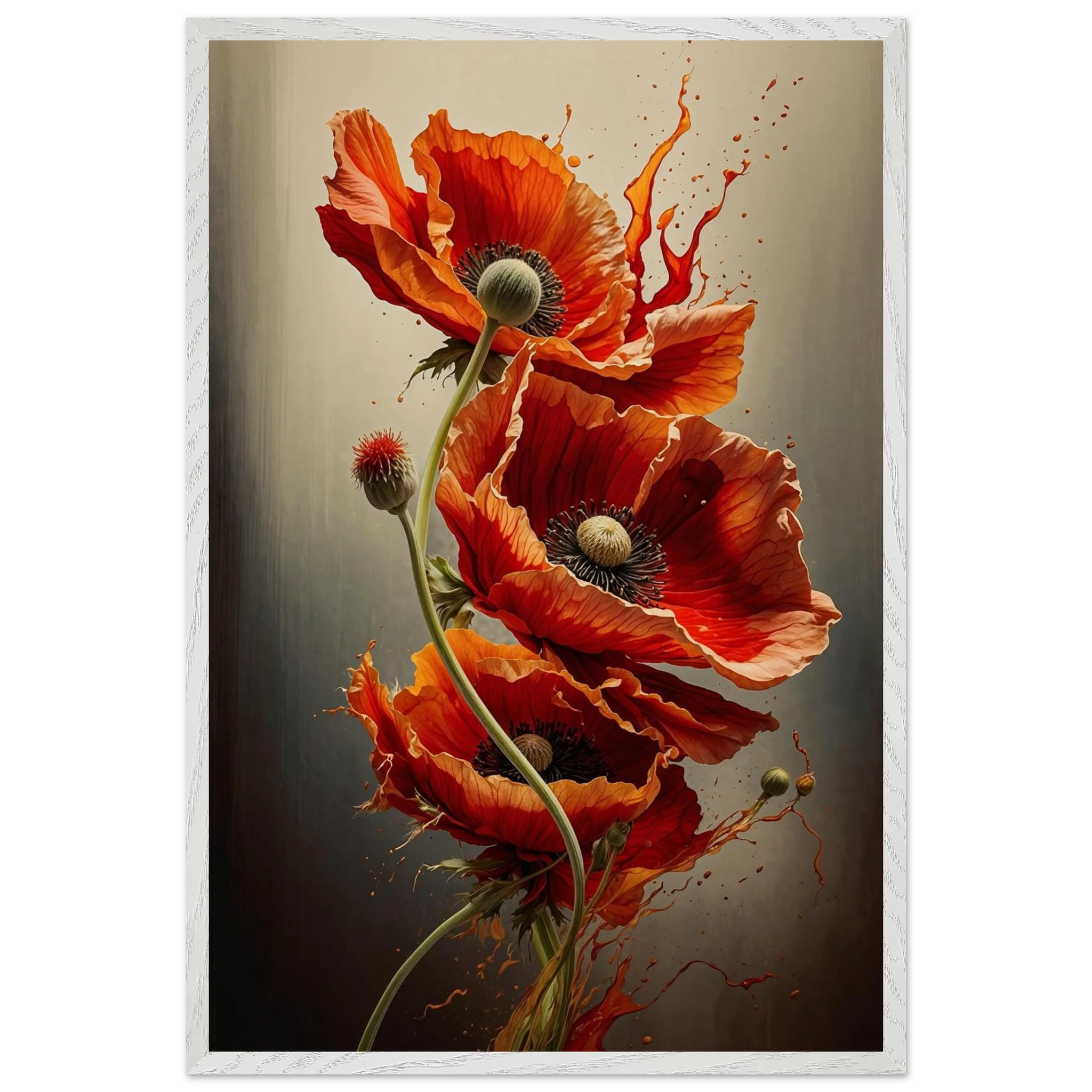 Make a bold statement with this striking red poppy digital artwork. This vertical composition features a dynamic arrangement of poppies, each rendered with intricate detail—from their delicate, paper-thin petals to their deep, textured centres. The gracefully curved stems create a sense of fluid movement, making the flowers appear as if they are dancing across the canvas.