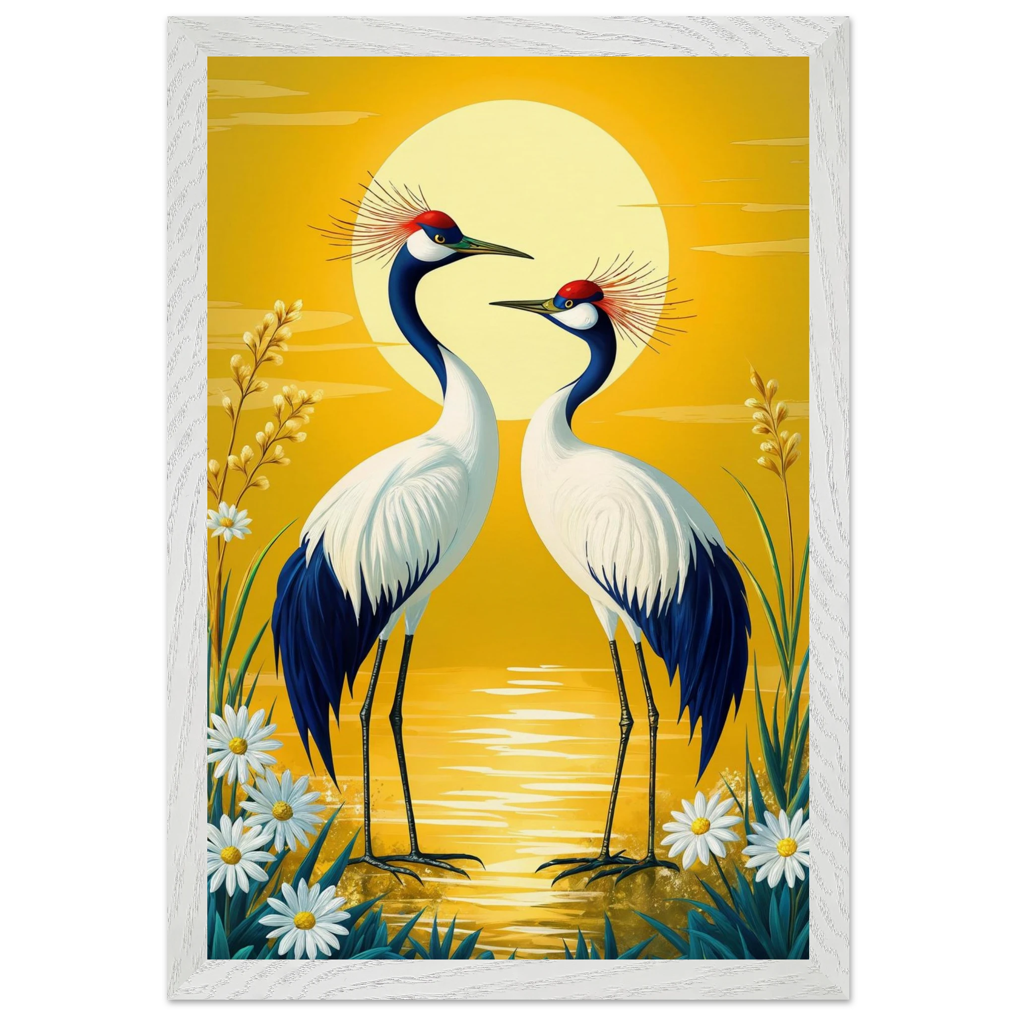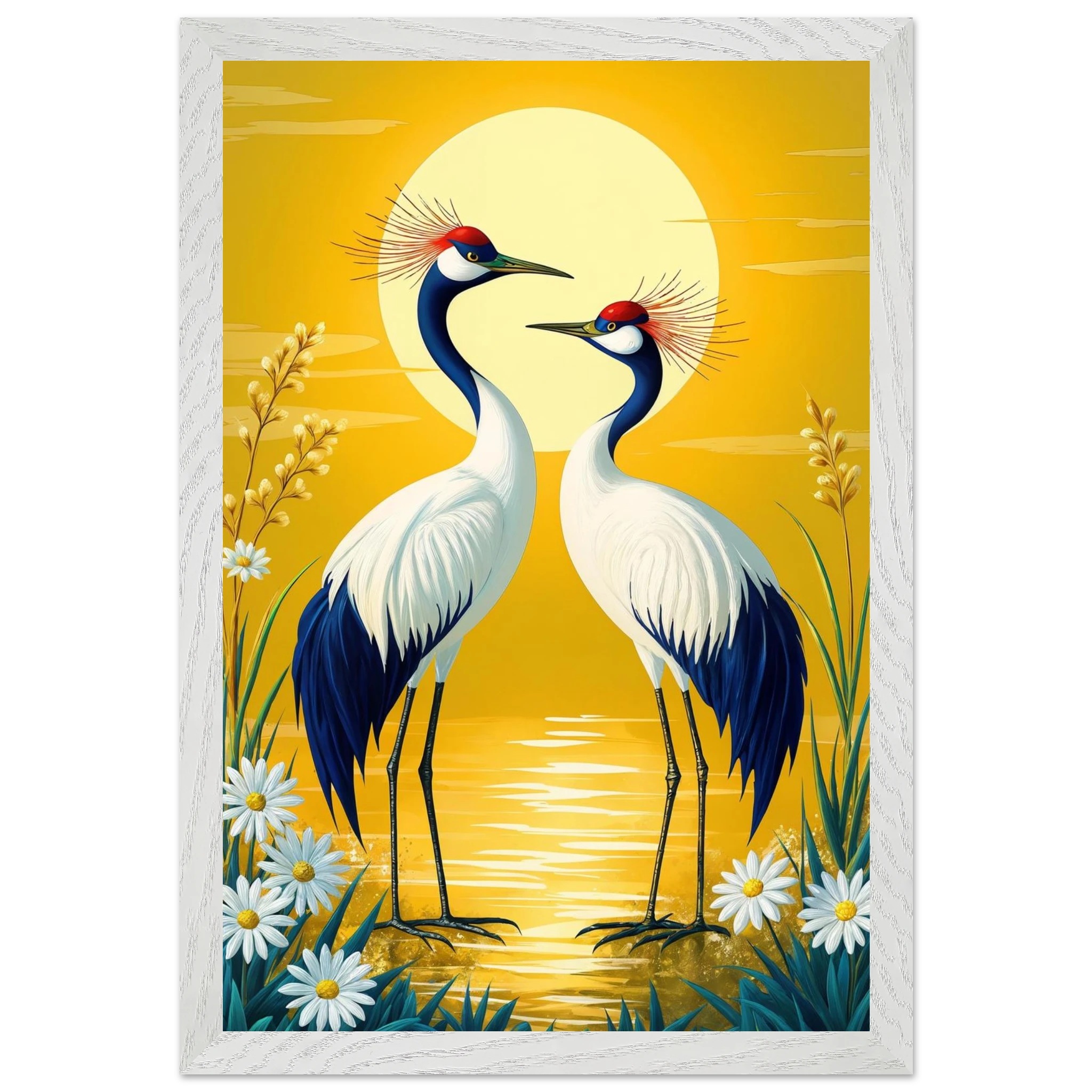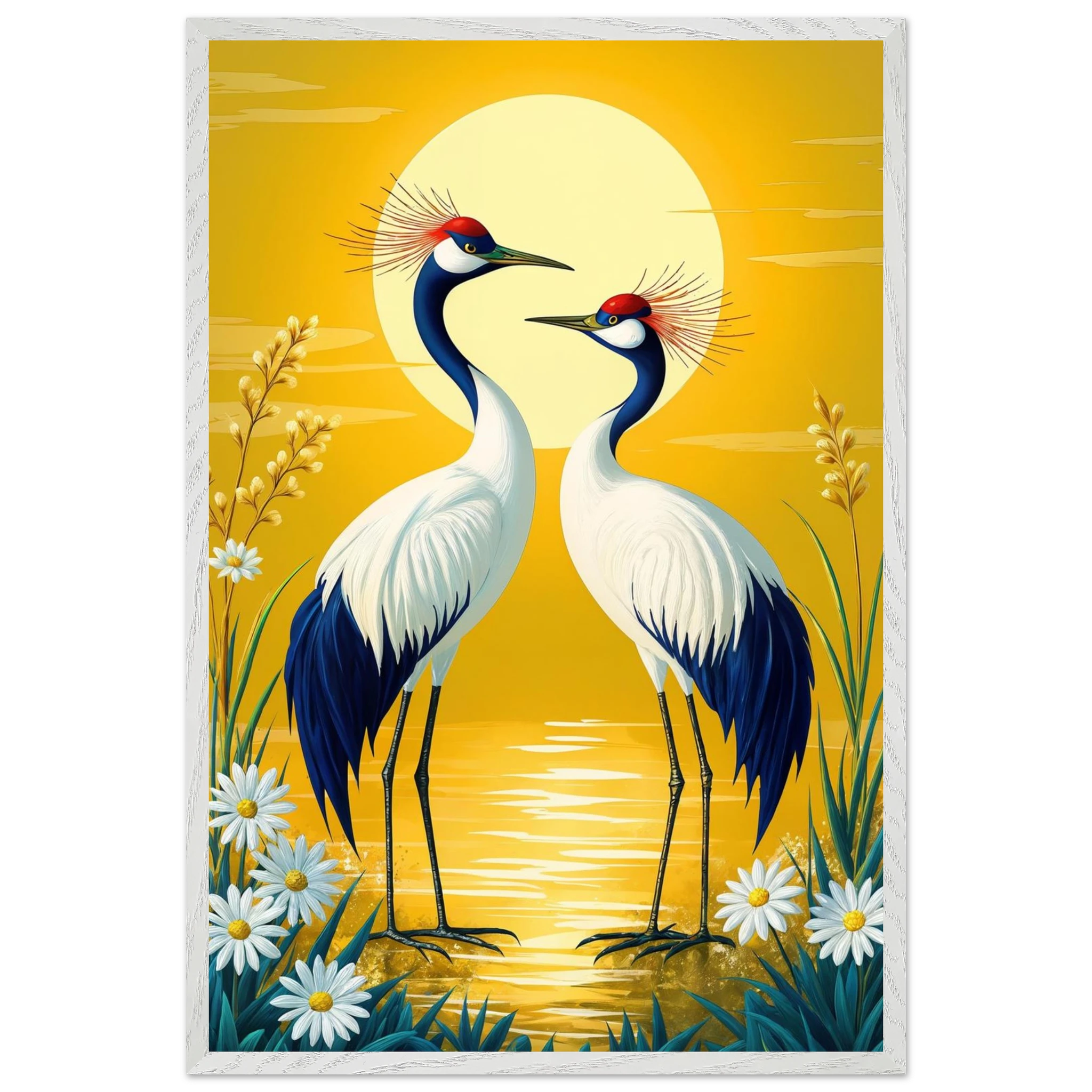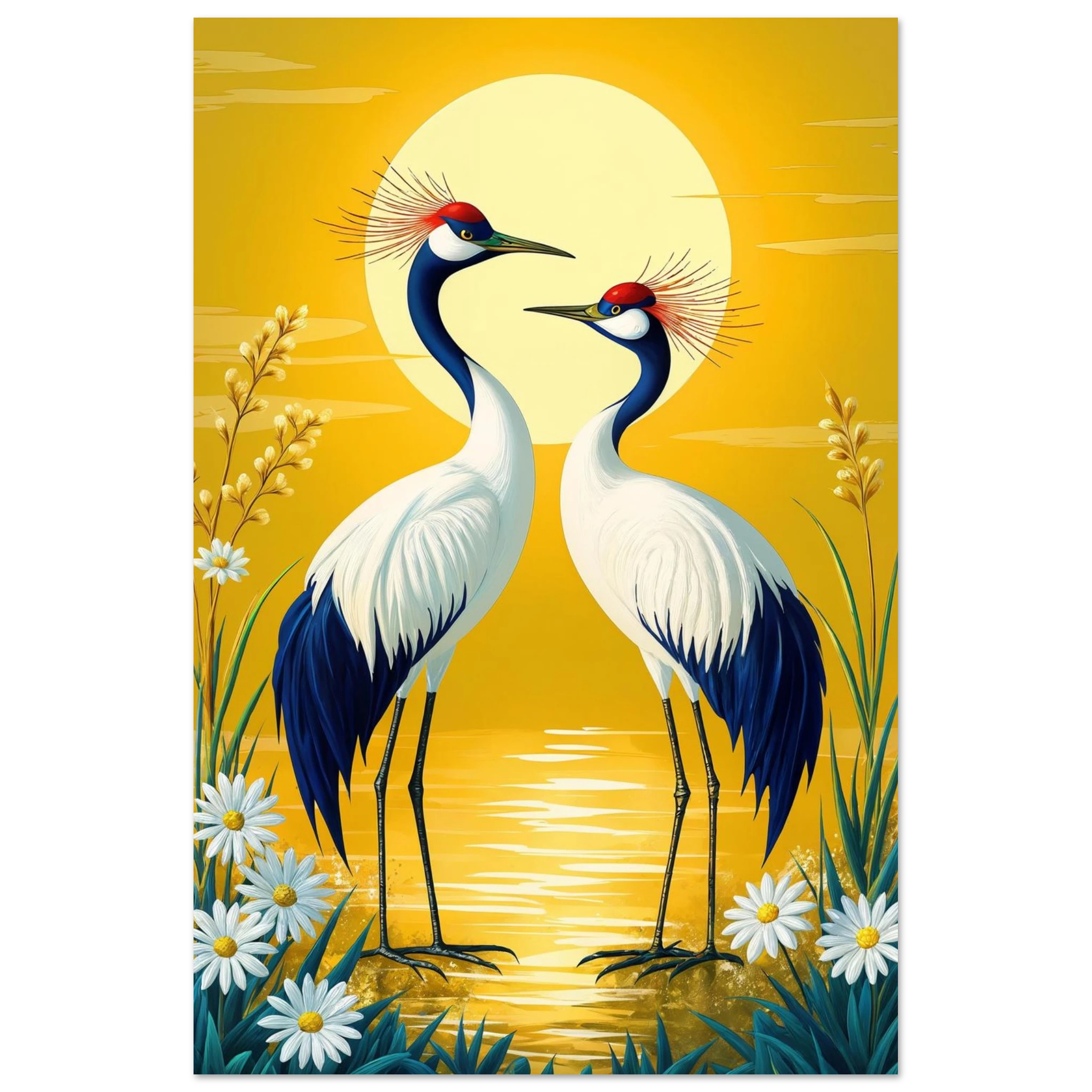 Bring harmony and grace to your space with this stylised, tranquil digital painting. Two elegant cranes with striking red crowns stand face-to-face, their plumage a beautiful contrast of deep blue and crisp white. The serene landscape is dominated by a large, glowing sun casting a warm yellow hue across the scene. Delicate white daisies and tall grasses frame the birds, enhancing the natural setting. This harmonious and picturesque print captures the beauty of nature and balance, making it a perfect, tranquil addition to modern, nature-inspired, or Japanese-style decor.