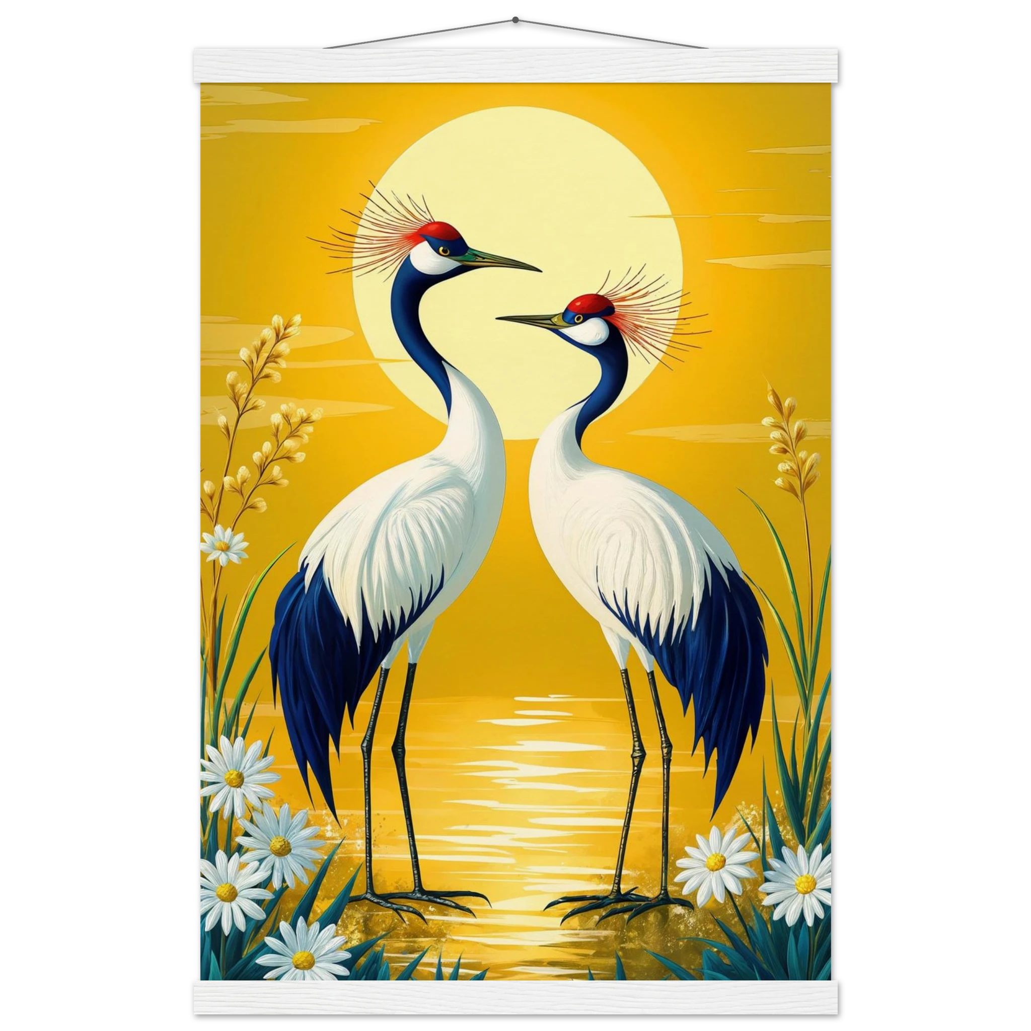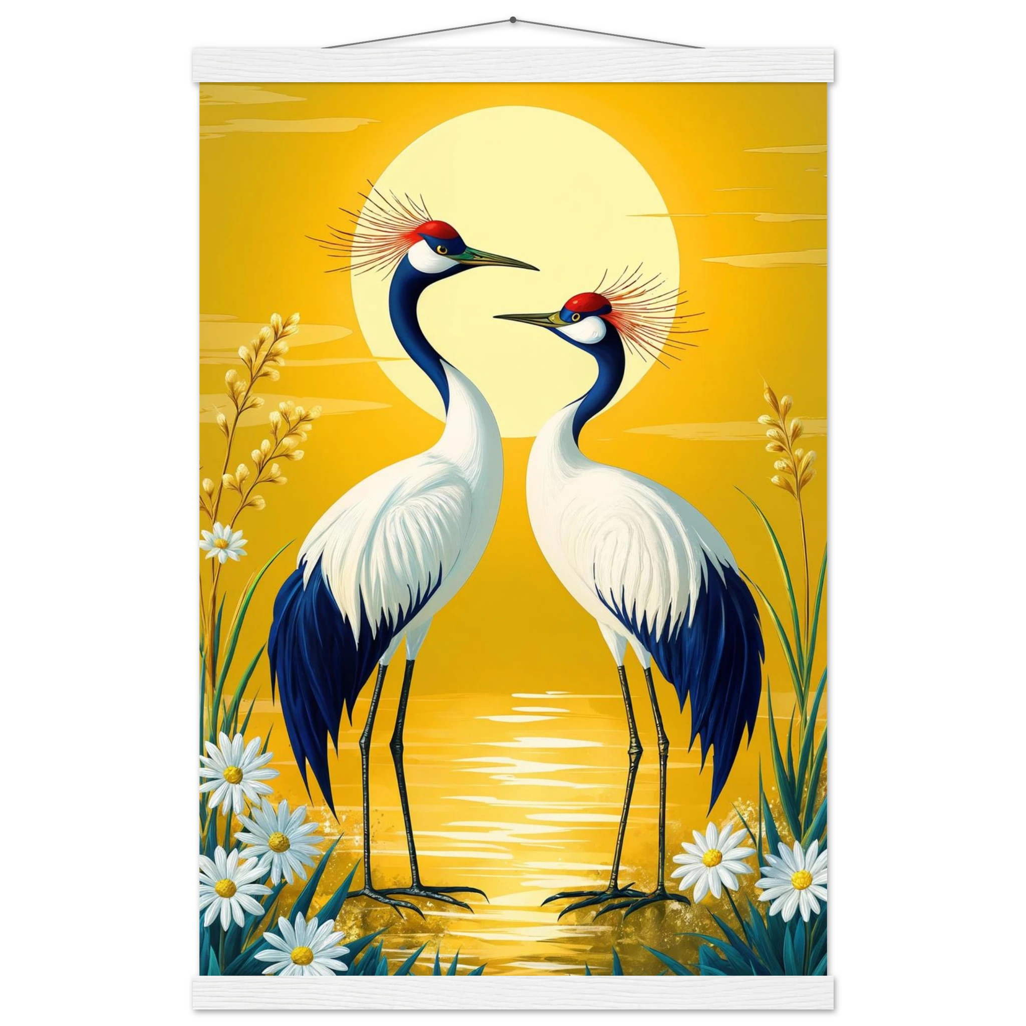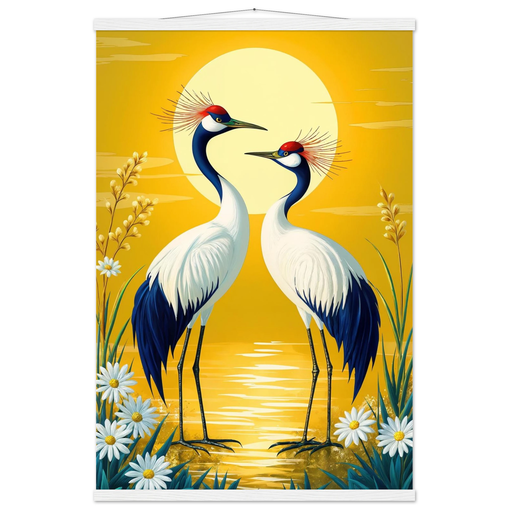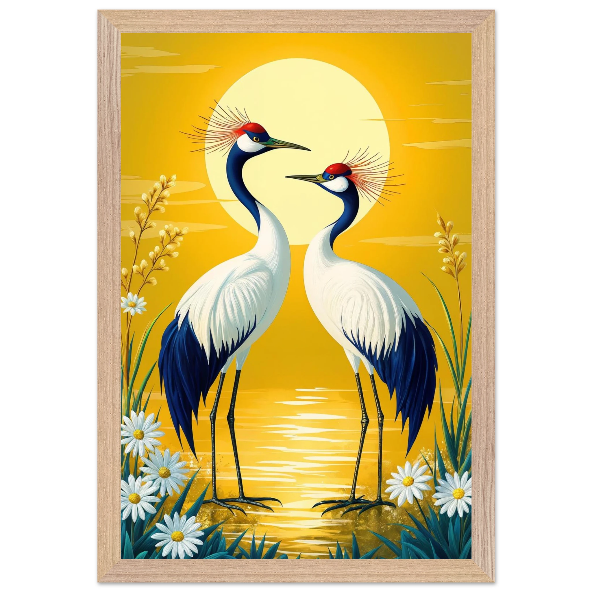 Bring harmony and grace to your space with this stylised, tranquil digital painting. Two elegant cranes with striking red crowns stand face-to-face, their plumage a beautiful contrast of deep blue and crisp white. The serene landscape is dominated by a large, glowing sun casting a warm yellow hue across the scene. Delicate white daisies and tall grasses frame the birds, enhancing the natural setting. This harmonious and picturesque print captures the beauty of nature and balance, making it a perfect, tranquil addition to modern, nature-inspired, or Japanese-style decor.
