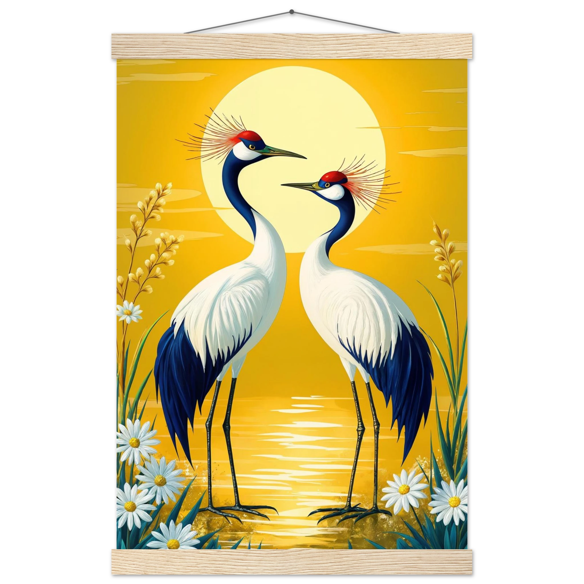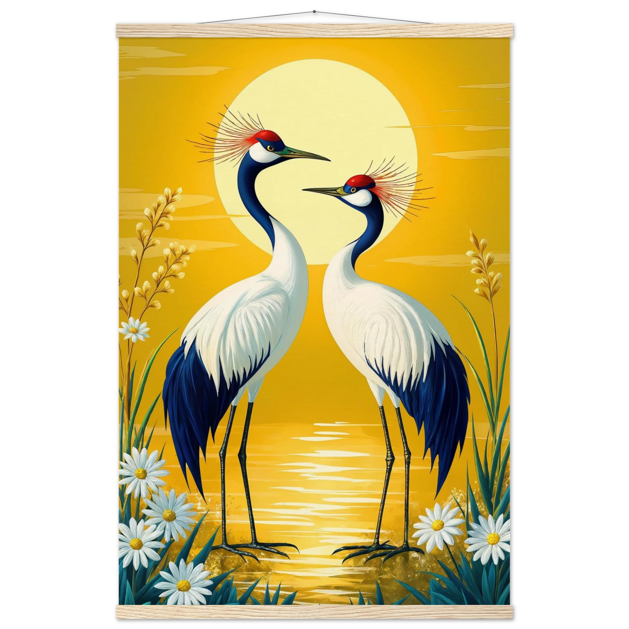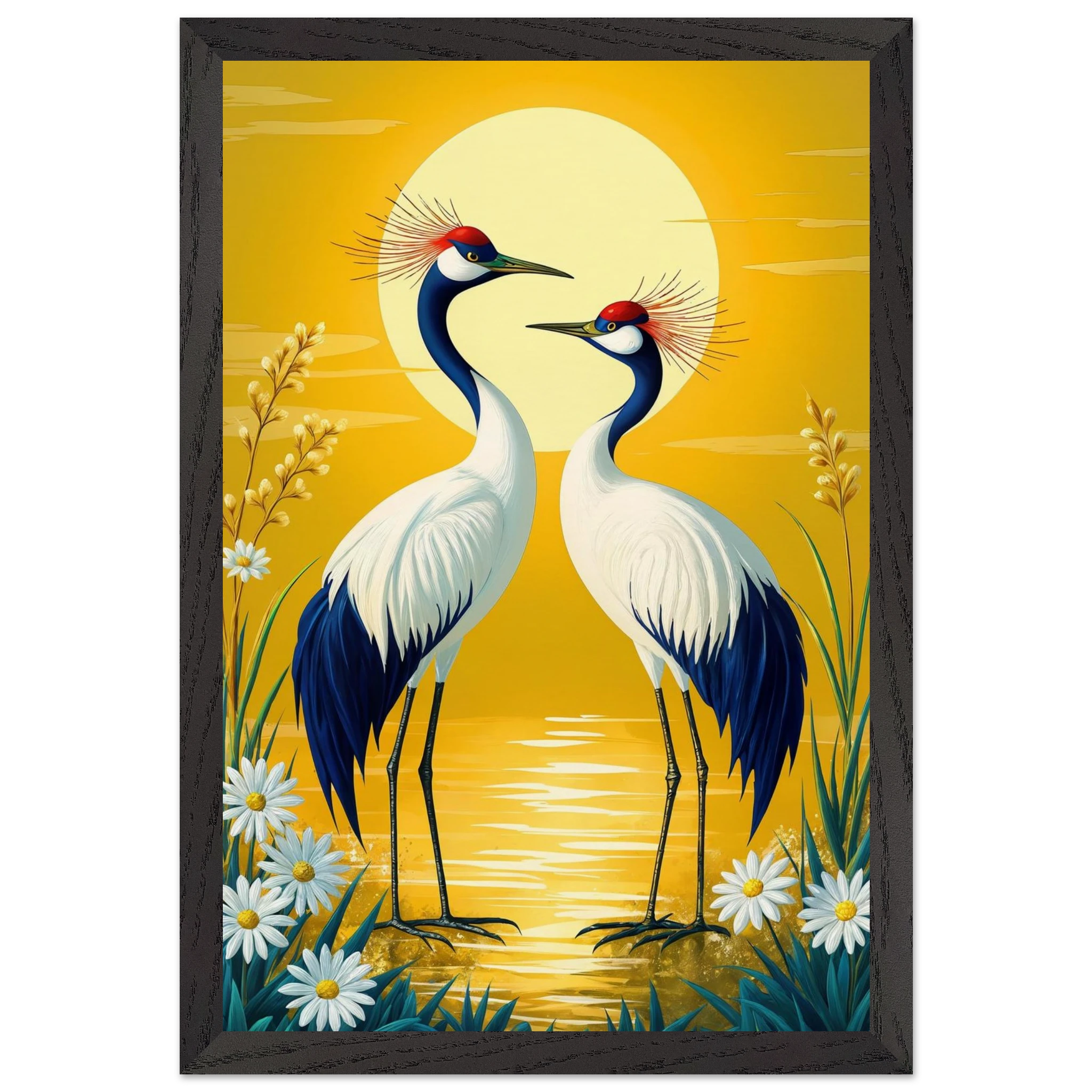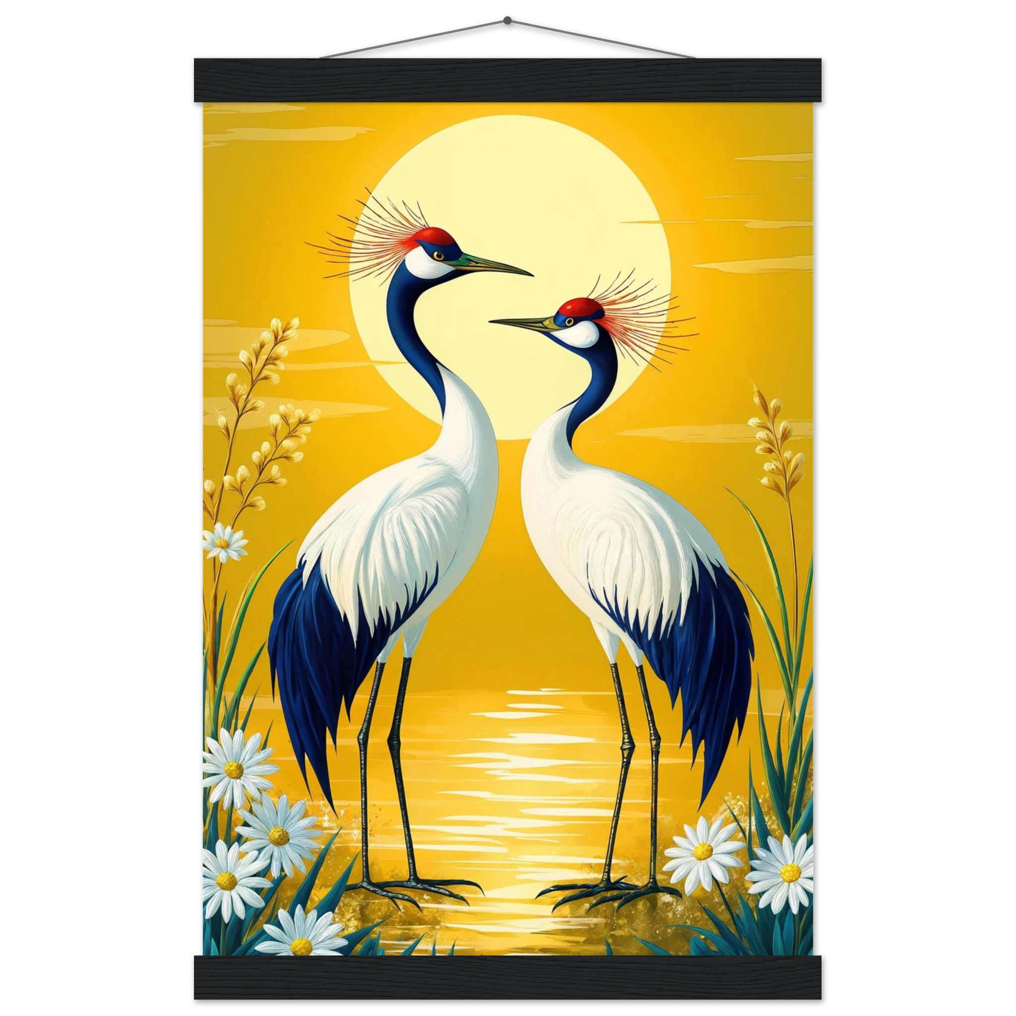 Bring harmony and grace to your space with this stylised, tranquil digital painting. Two elegant cranes with striking red crowns stand face-to-face, their plumage a beautiful contrast of deep blue and crisp white. The serene landscape is dominated by a large, glowing sun casting a warm yellow hue across the scene. Delicate white daisies and tall grasses frame the birds, enhancing the natural setting. This harmonious and picturesque print captures the beauty of nature and balance, making it a perfect, tranquil addition to modern, nature-inspired, or Japanese-style decor.