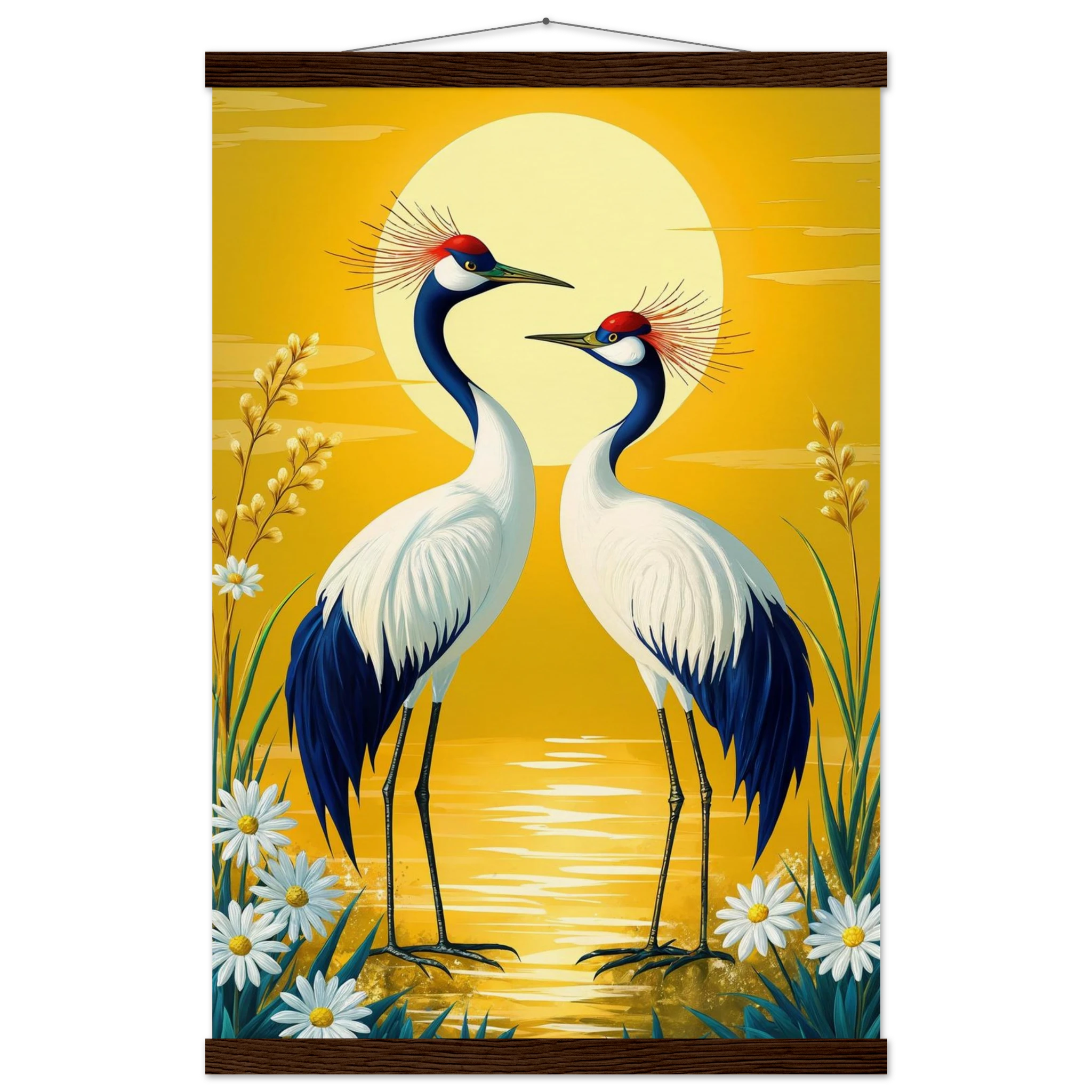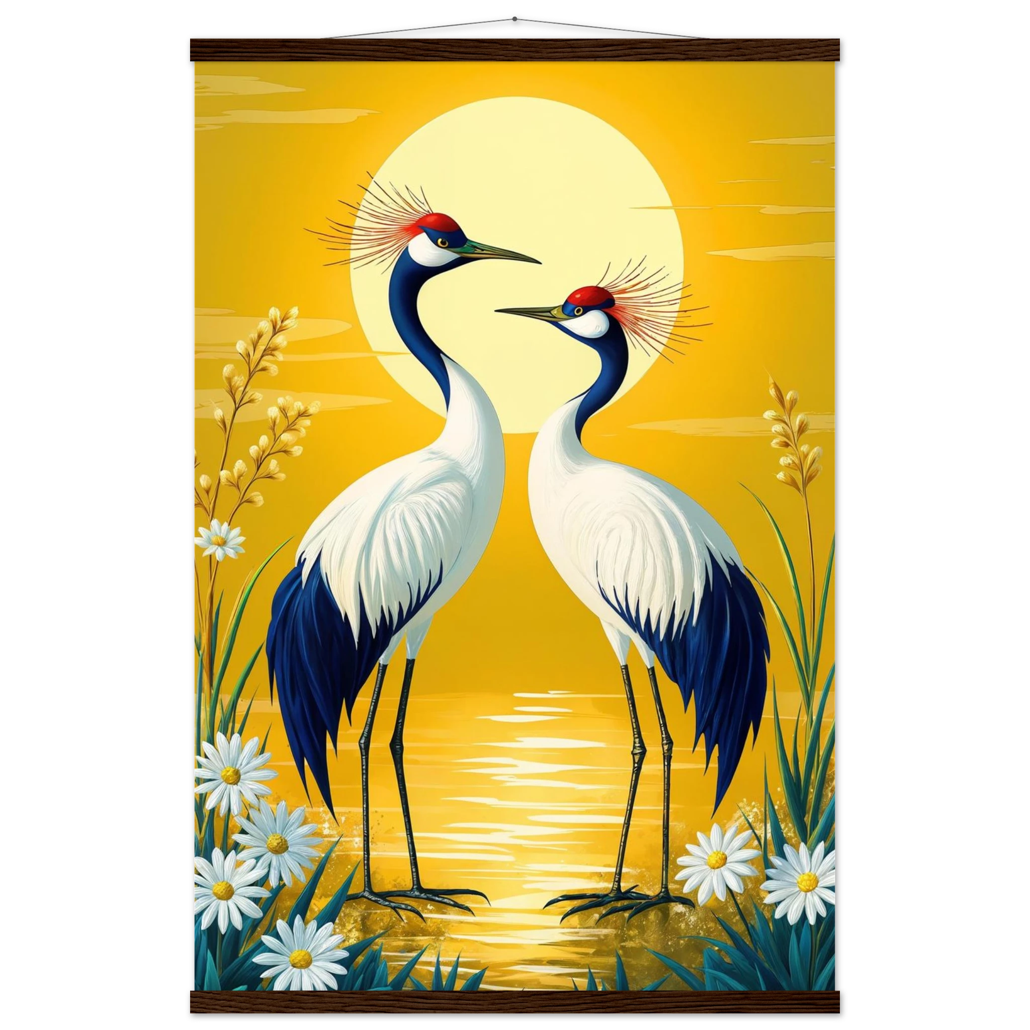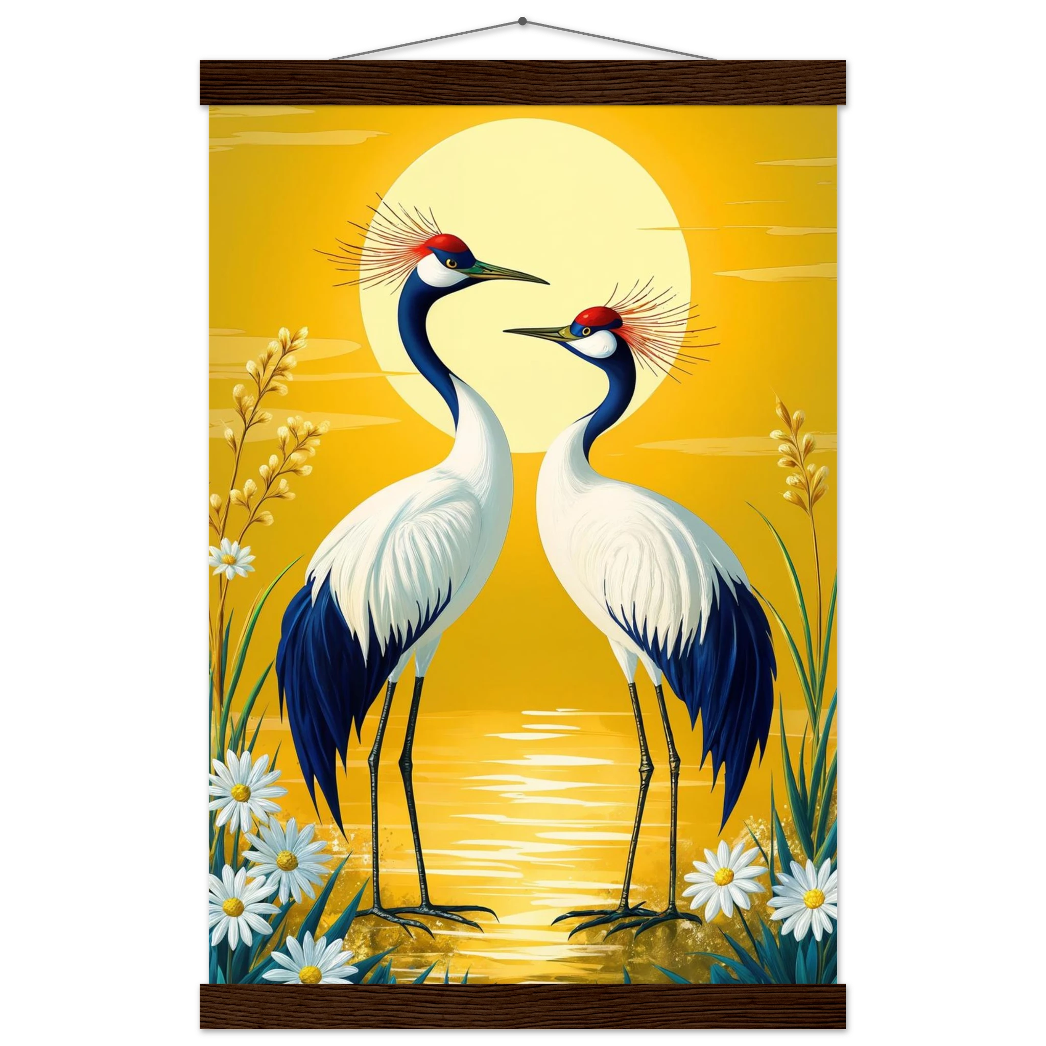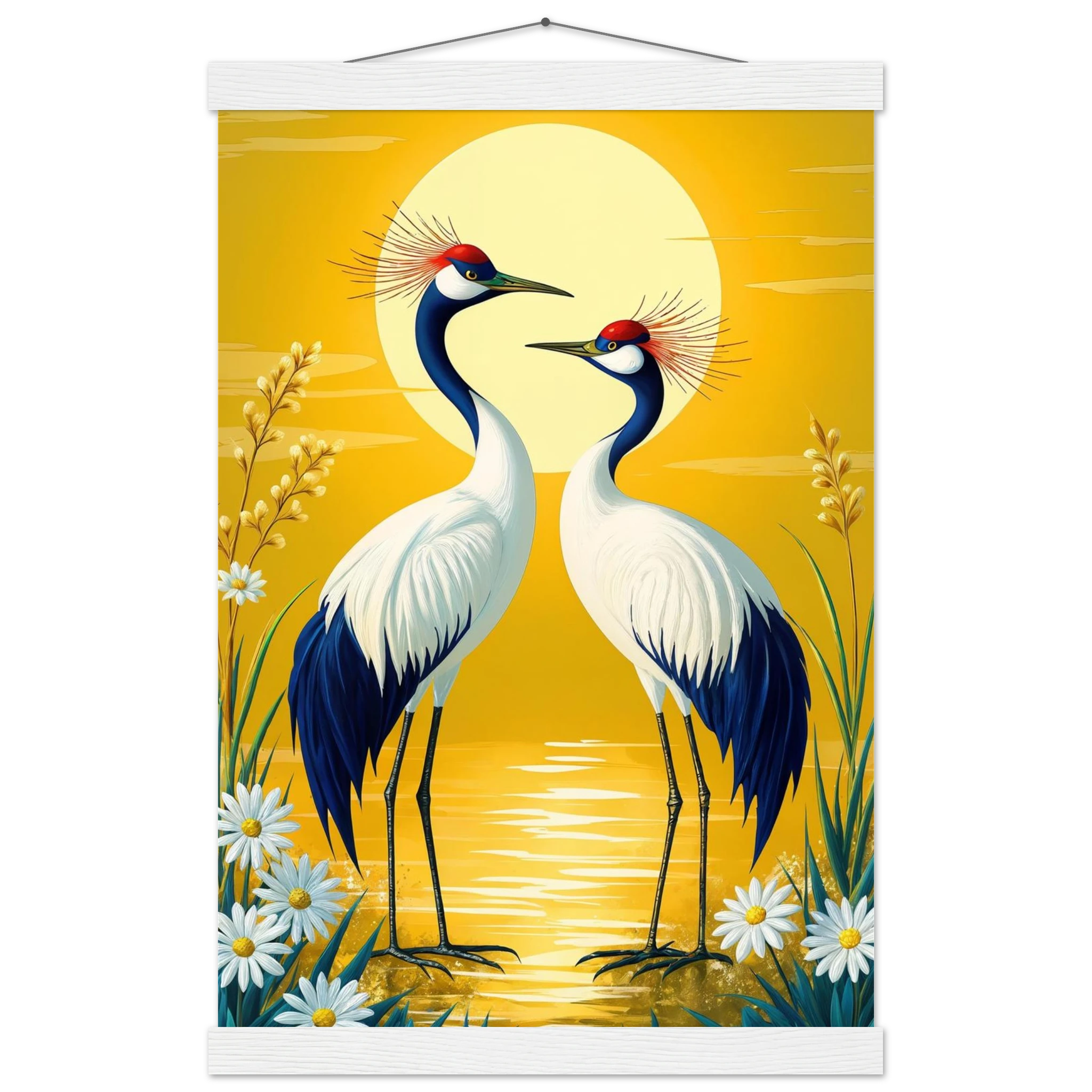 Bring harmony and grace to your space with this stylised, tranquil digital painting. Two elegant cranes with striking red crowns stand face-to-face, their plumage a beautiful contrast of deep blue and crisp white. The serene landscape is dominated by a large, glowing sun casting a warm yellow hue across the scene. Delicate white daisies and tall grasses frame the birds, enhancing the natural setting. This harmonious and picturesque print captures the beauty of nature and balance, making it a perfect, tranquil addition to modern, nature-inspired, or Japanese-style decor.