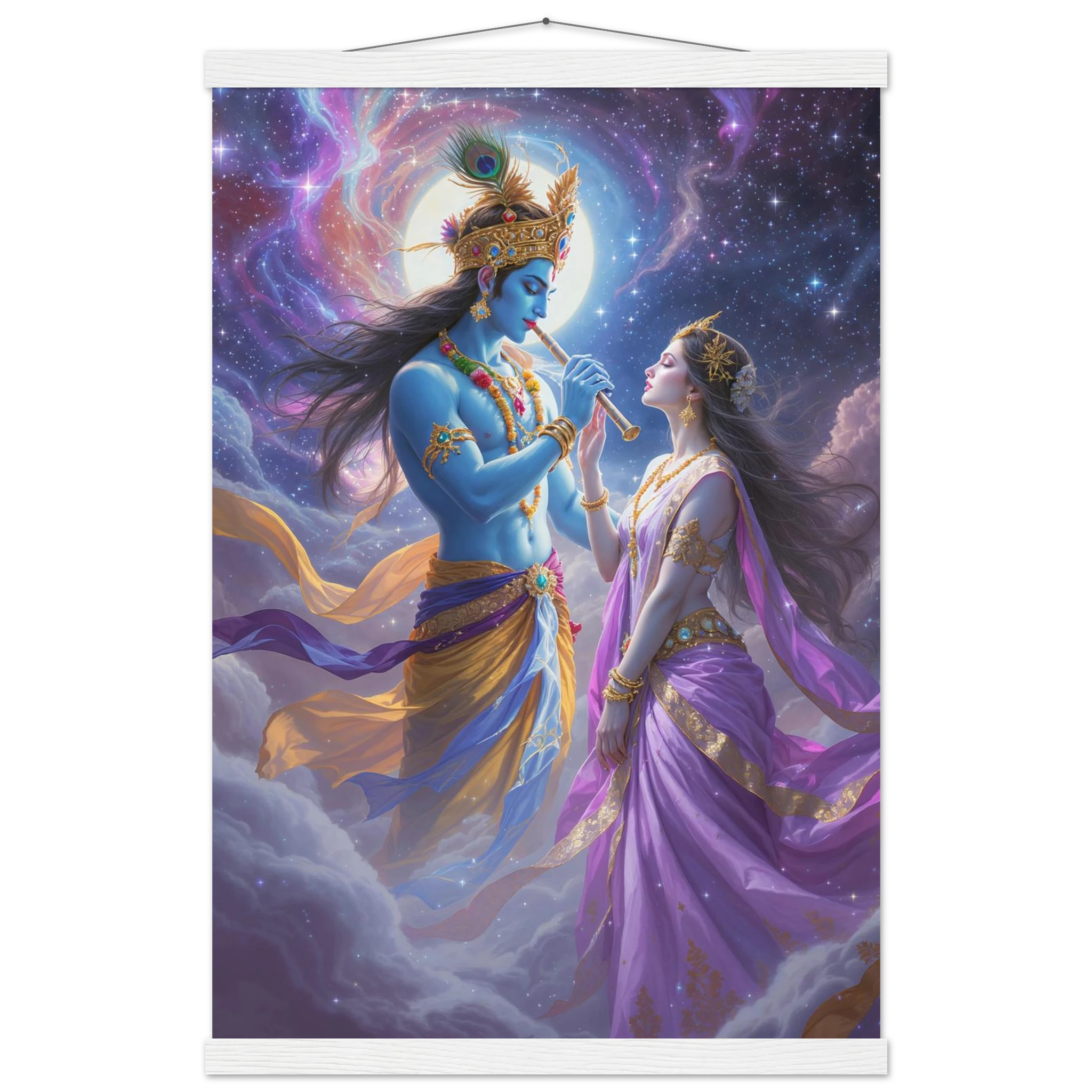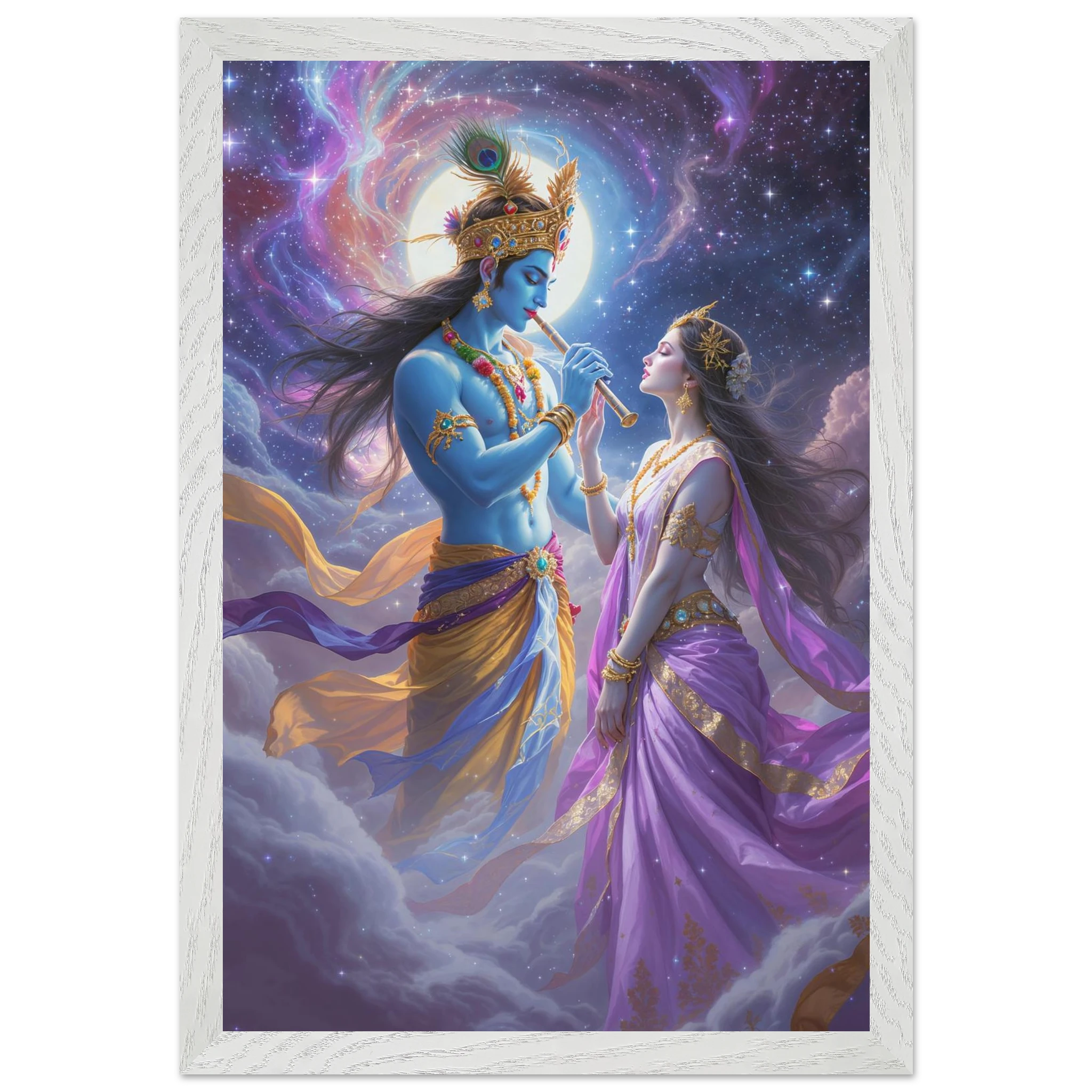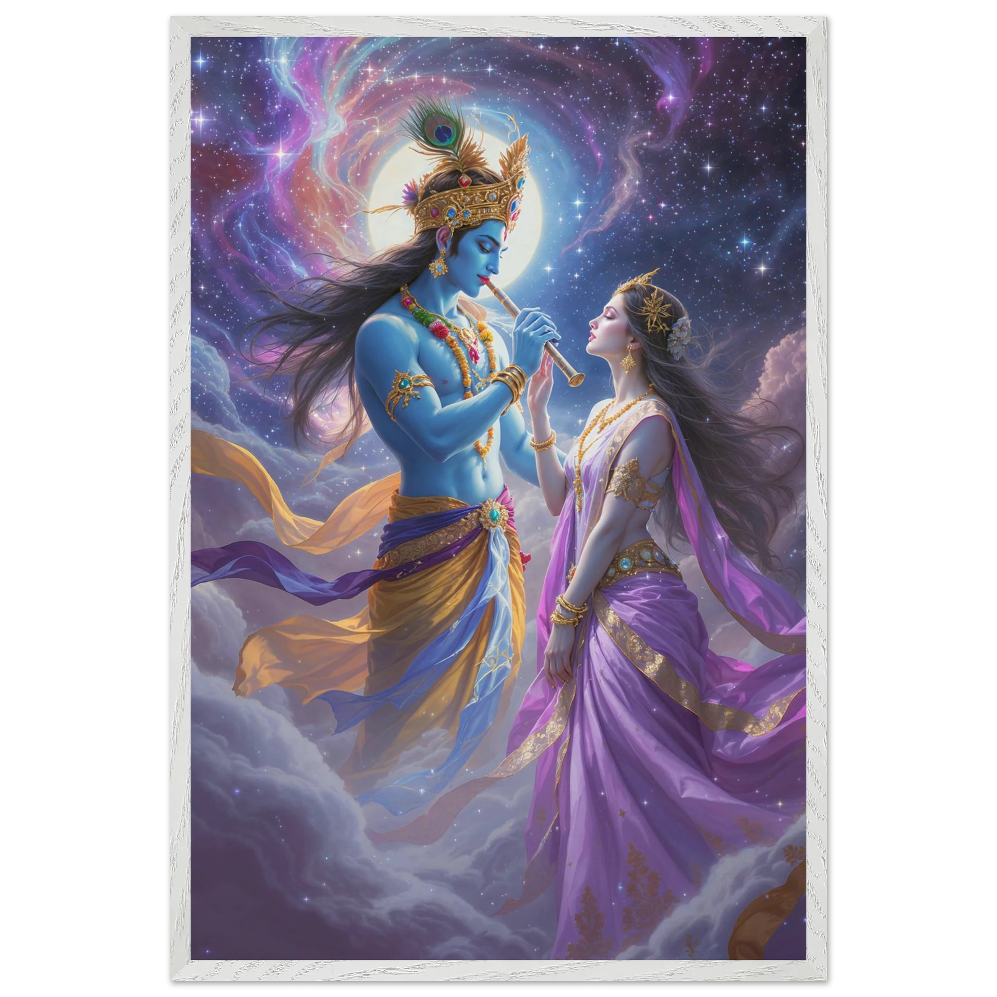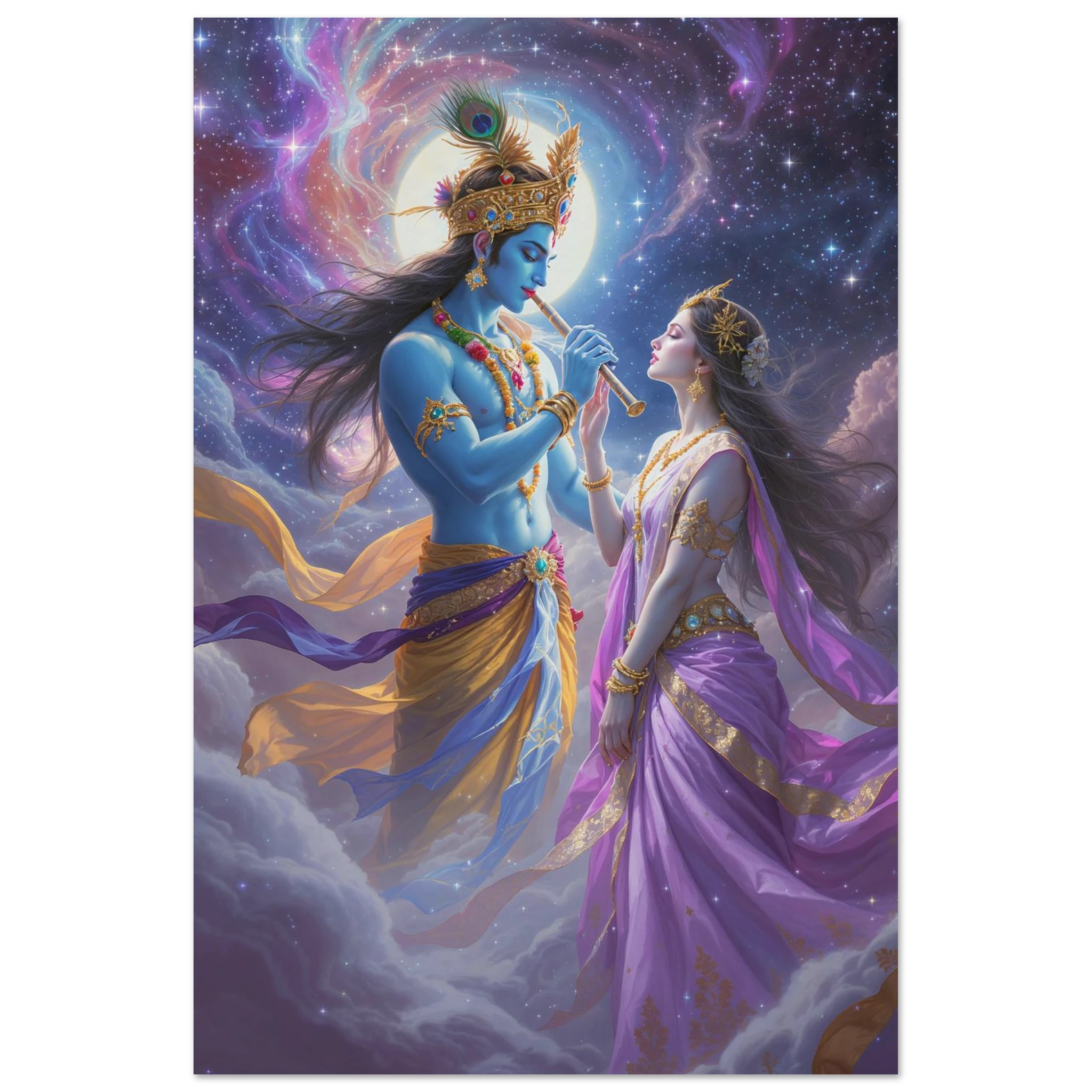 54278cda-7658-4e8d-af78-f9f4b78b02c9Ethereal Krishna Flute Art Print: Celestial Blue Figure, Radha Lavender Dress, Indian Art