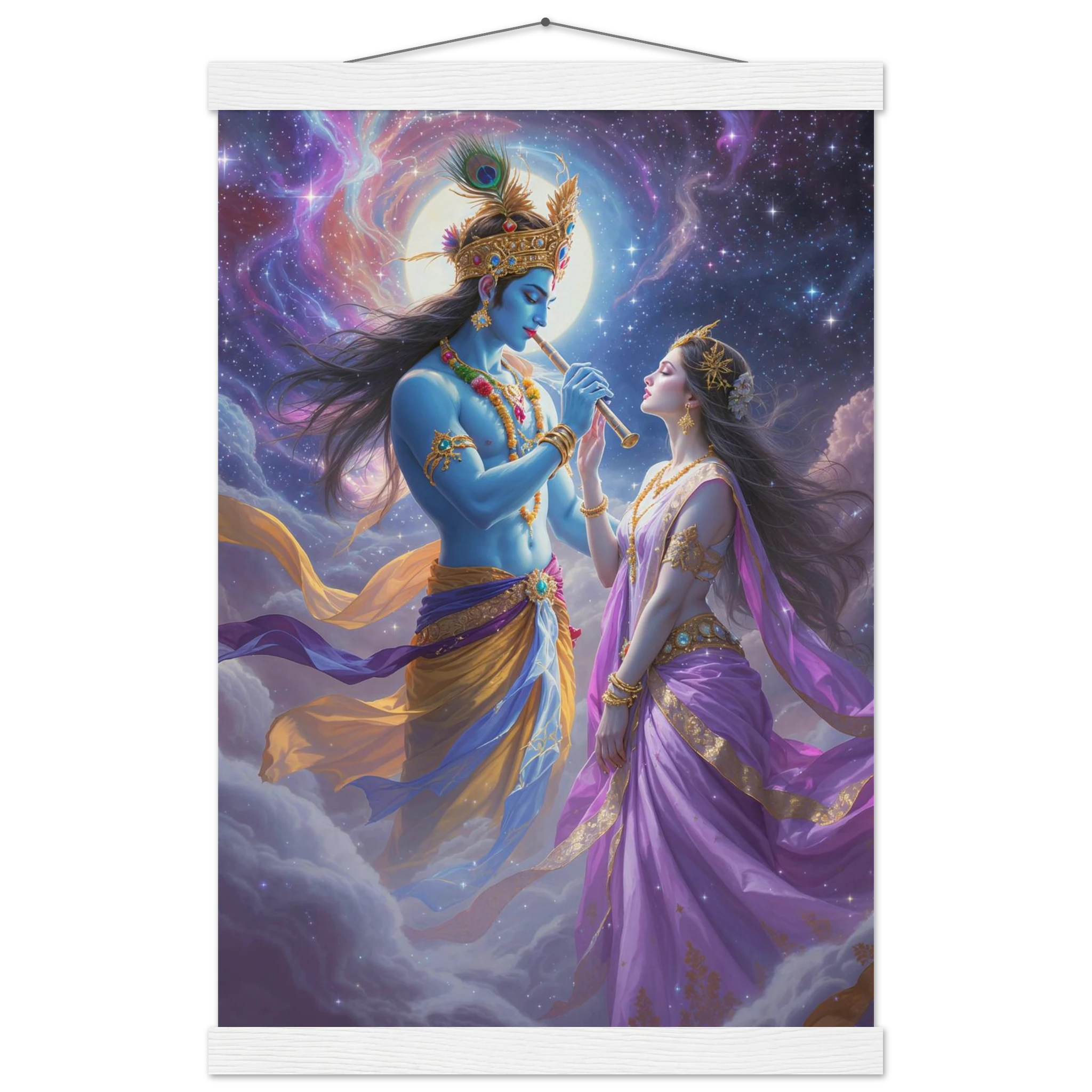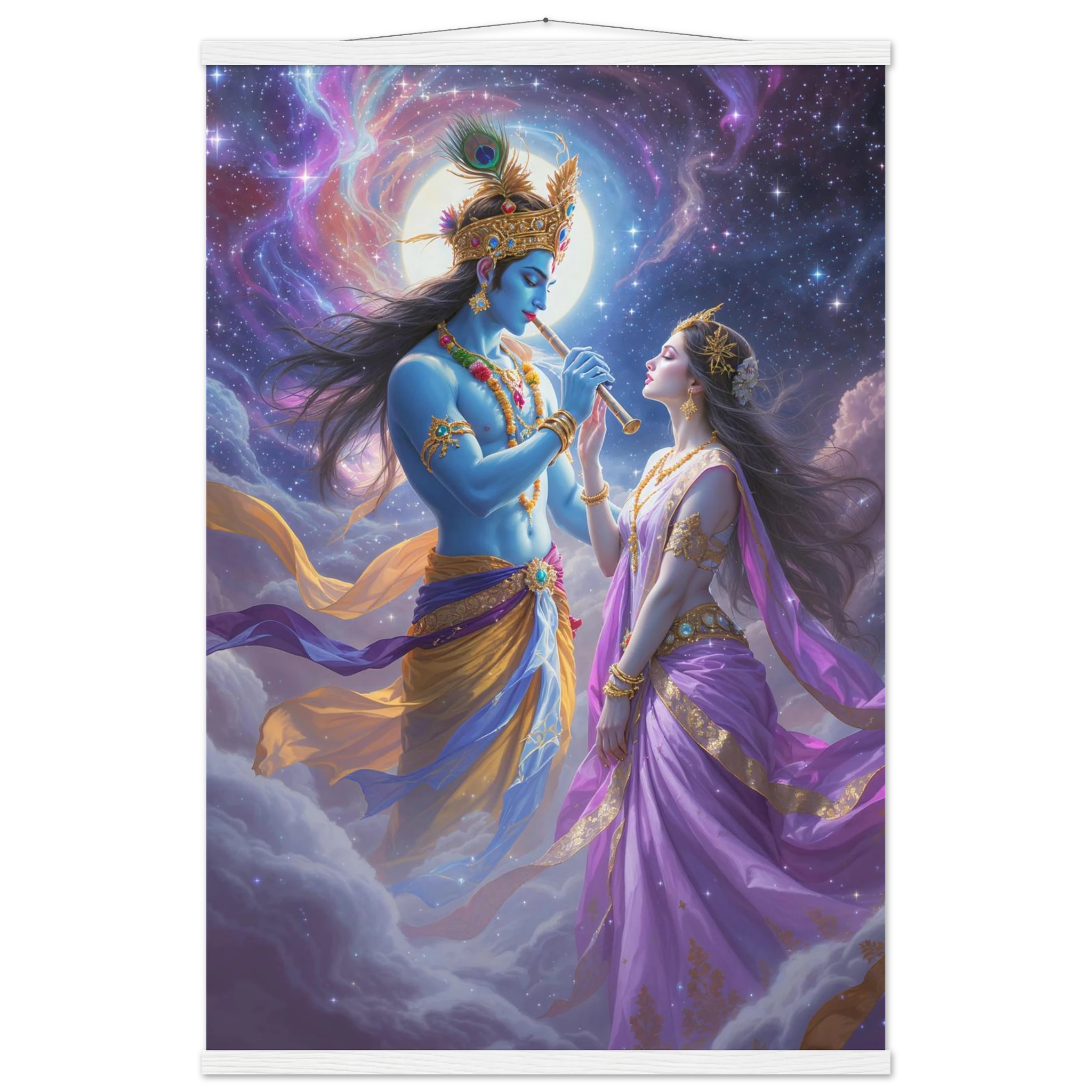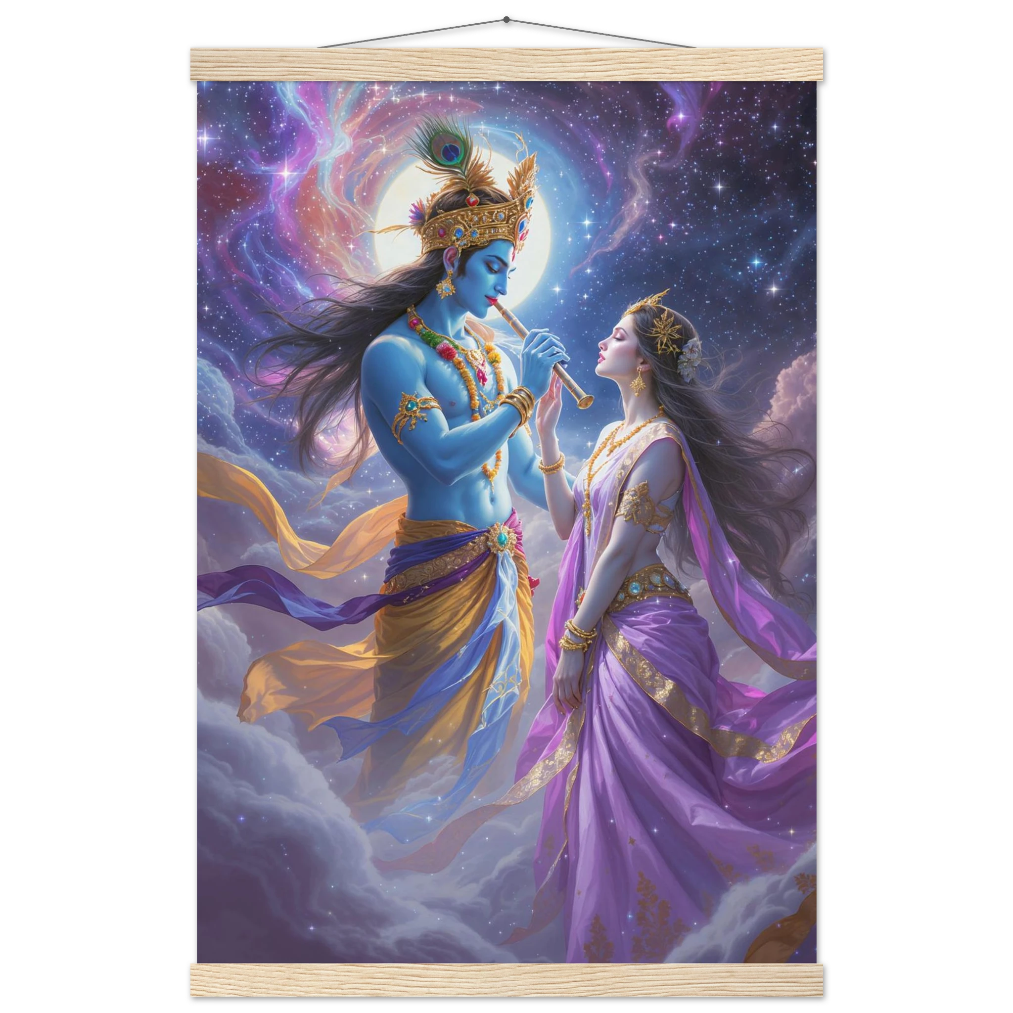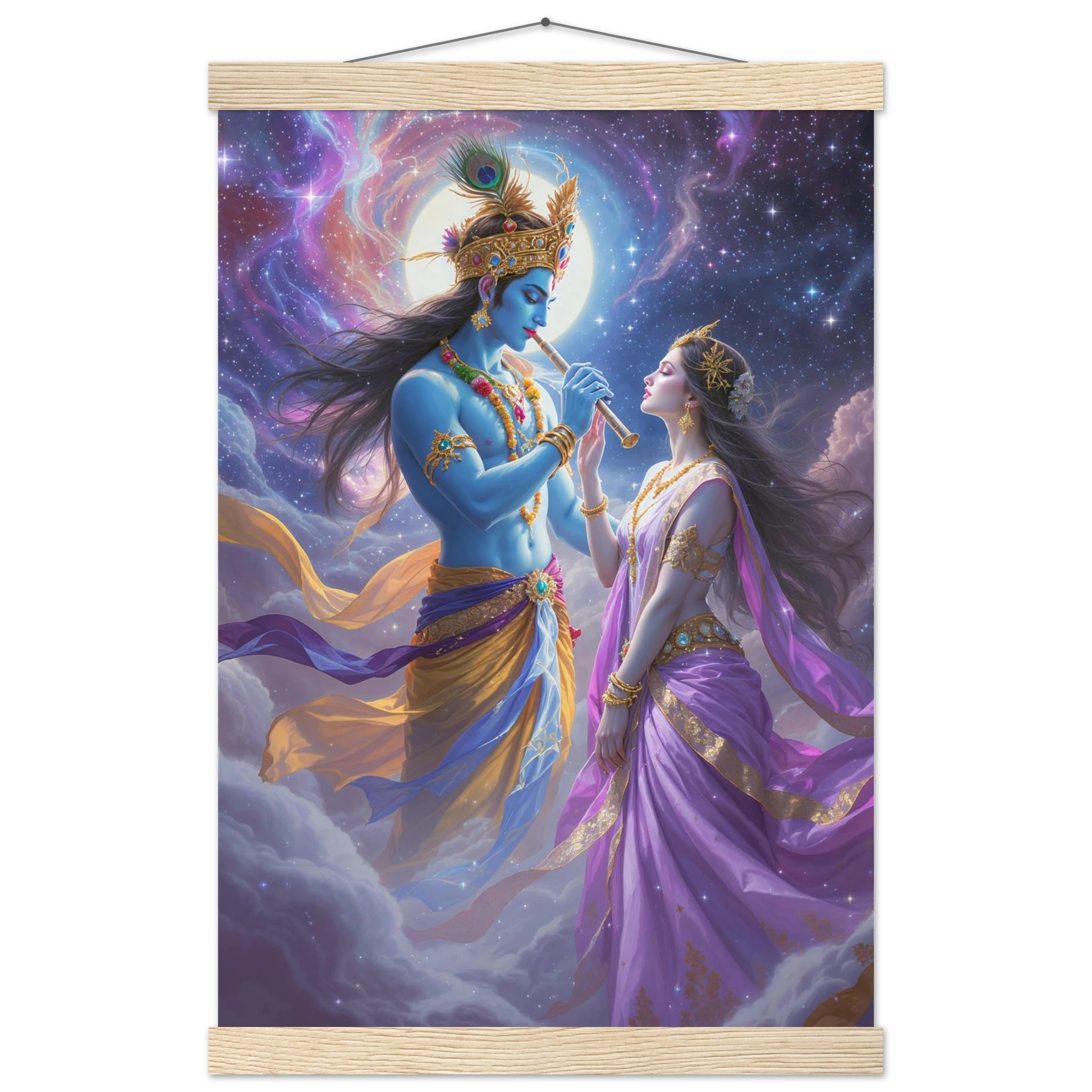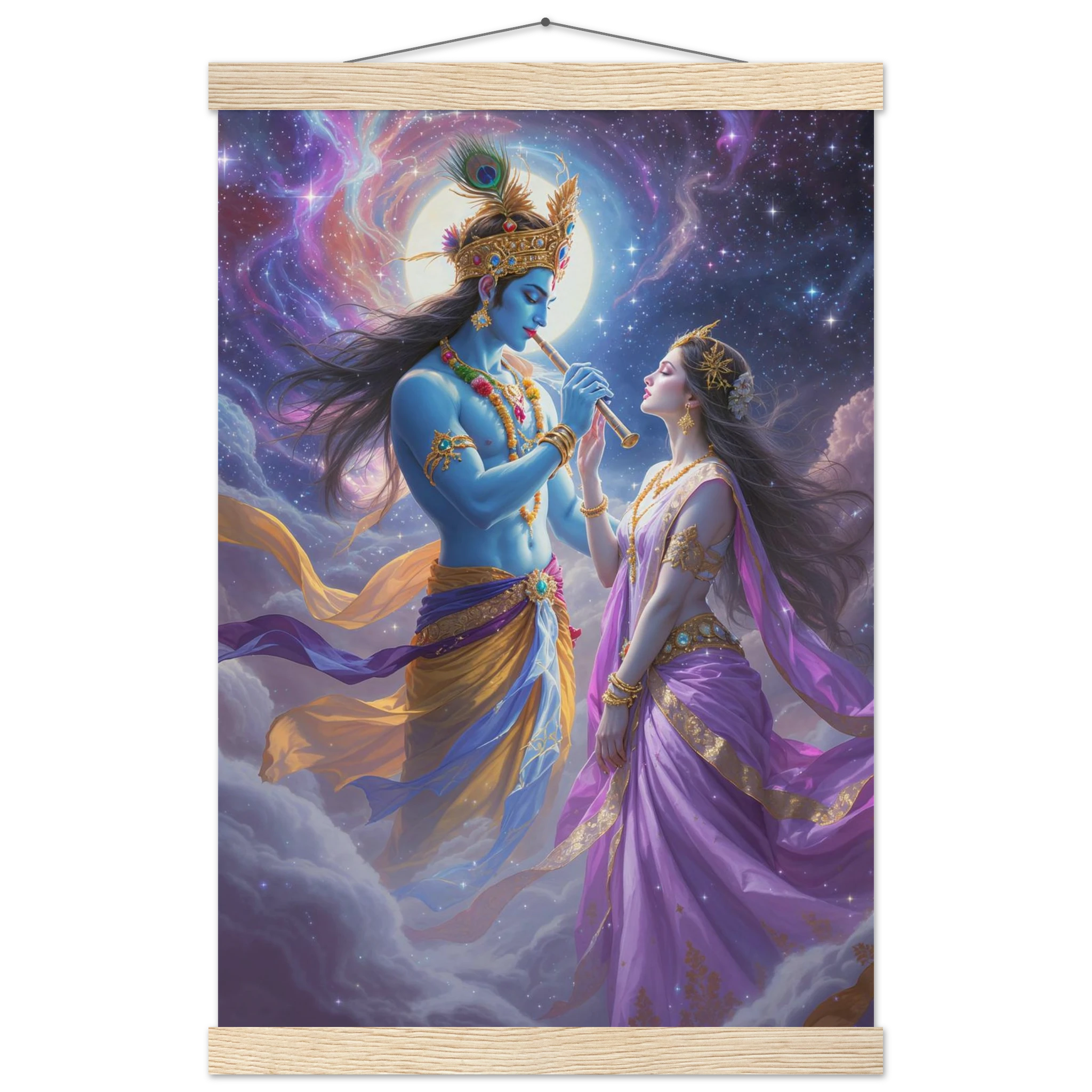 54278cda-7658-4e8d-af78-f9f4b78b02c9Ethereal Krishna Flute Art Print: Celestial Blue Figure, Radha Lavender Dress, Indian Art