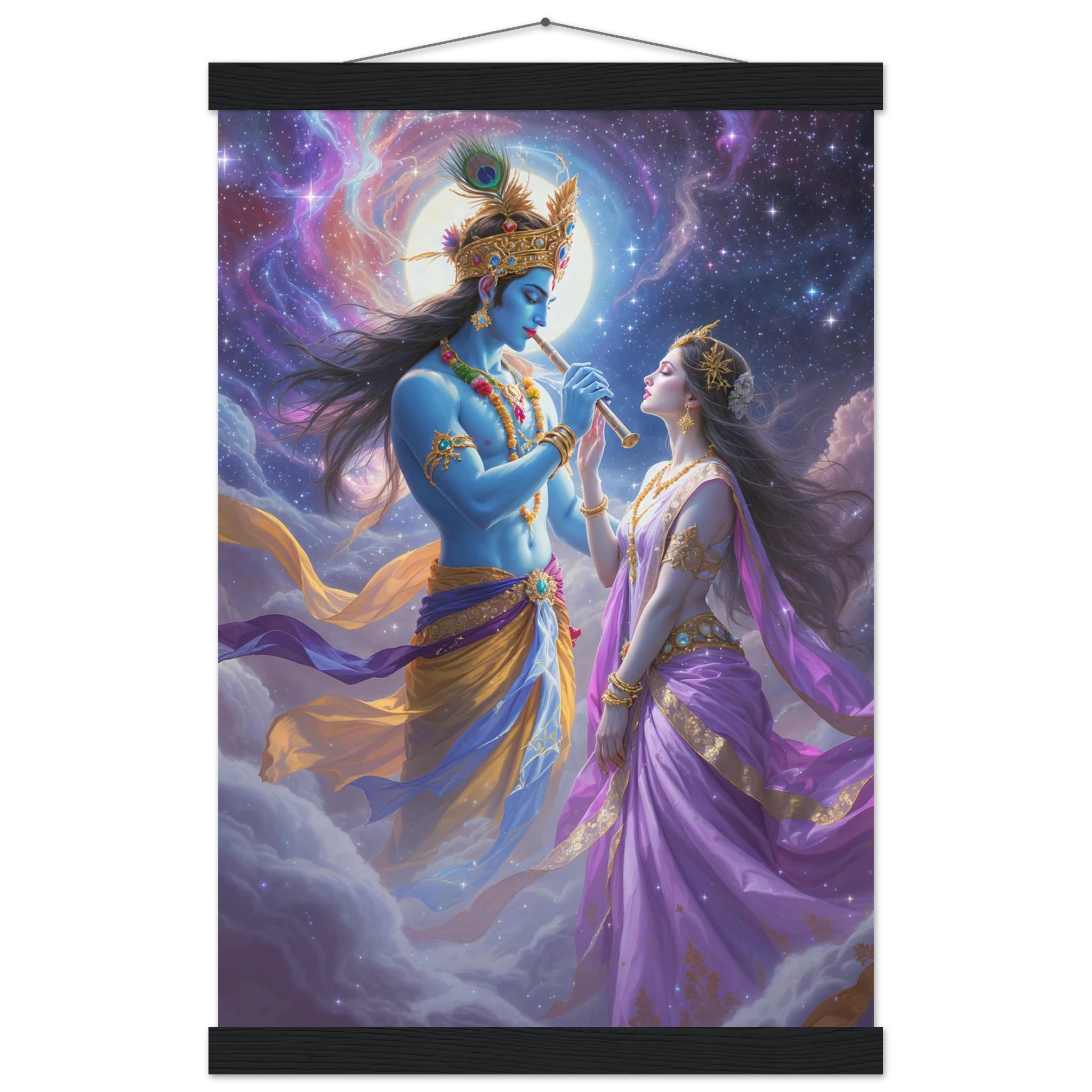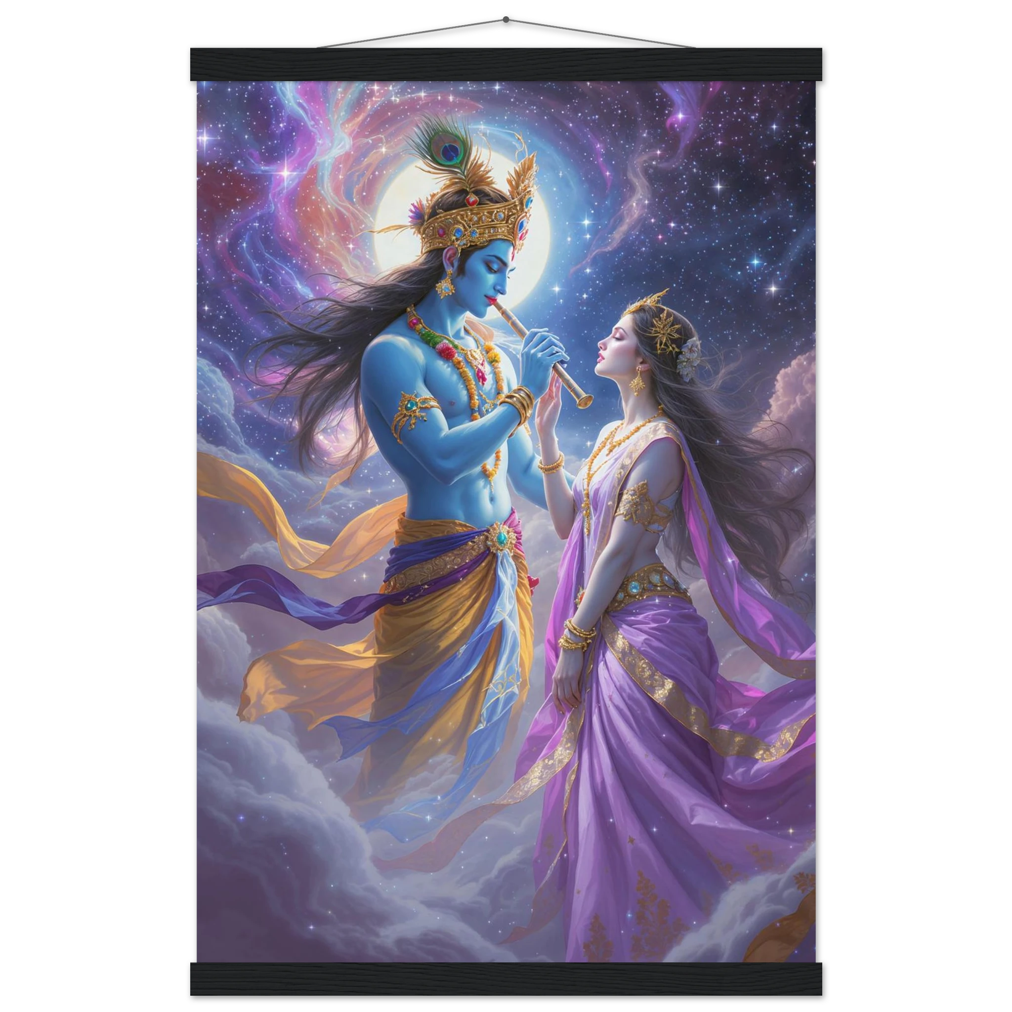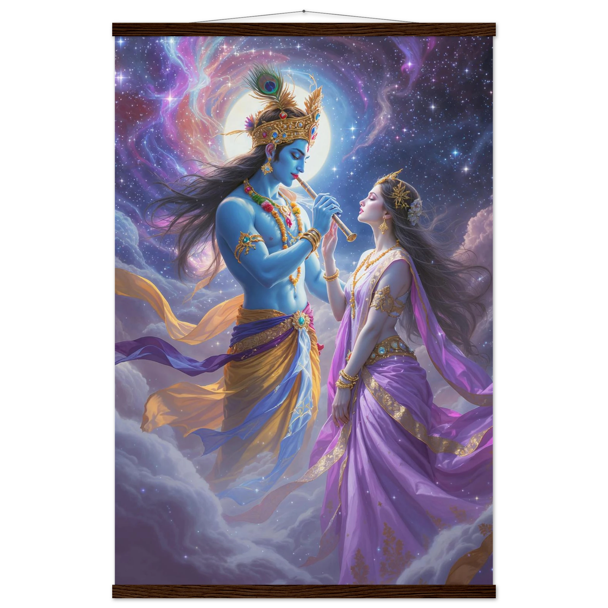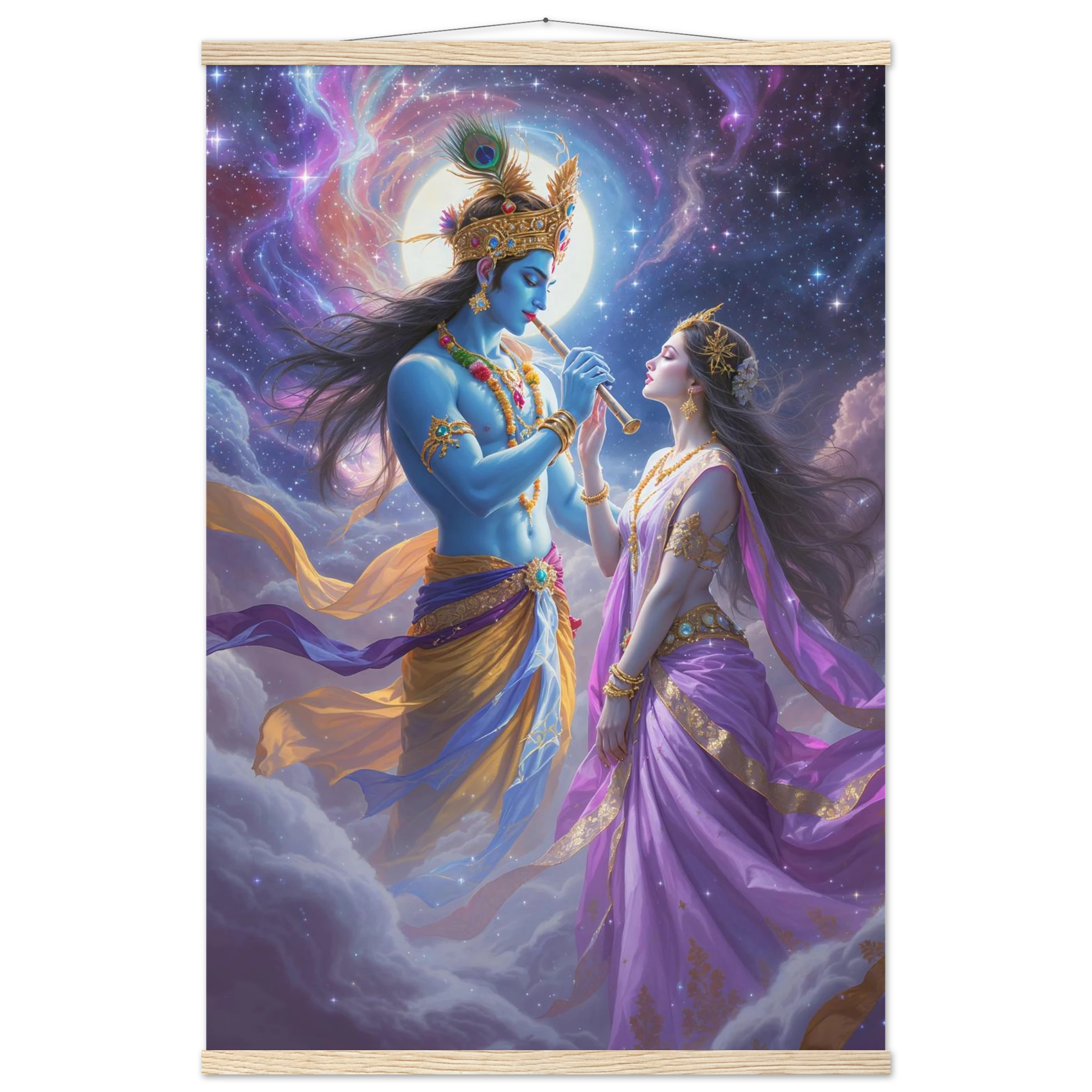 54278cda-7658-4e8d-af78-f9f4b78b02c9Ethereal Krishna Flute Art Print: Celestial Blue Figure, Radha Lavender Dress, Indian Art