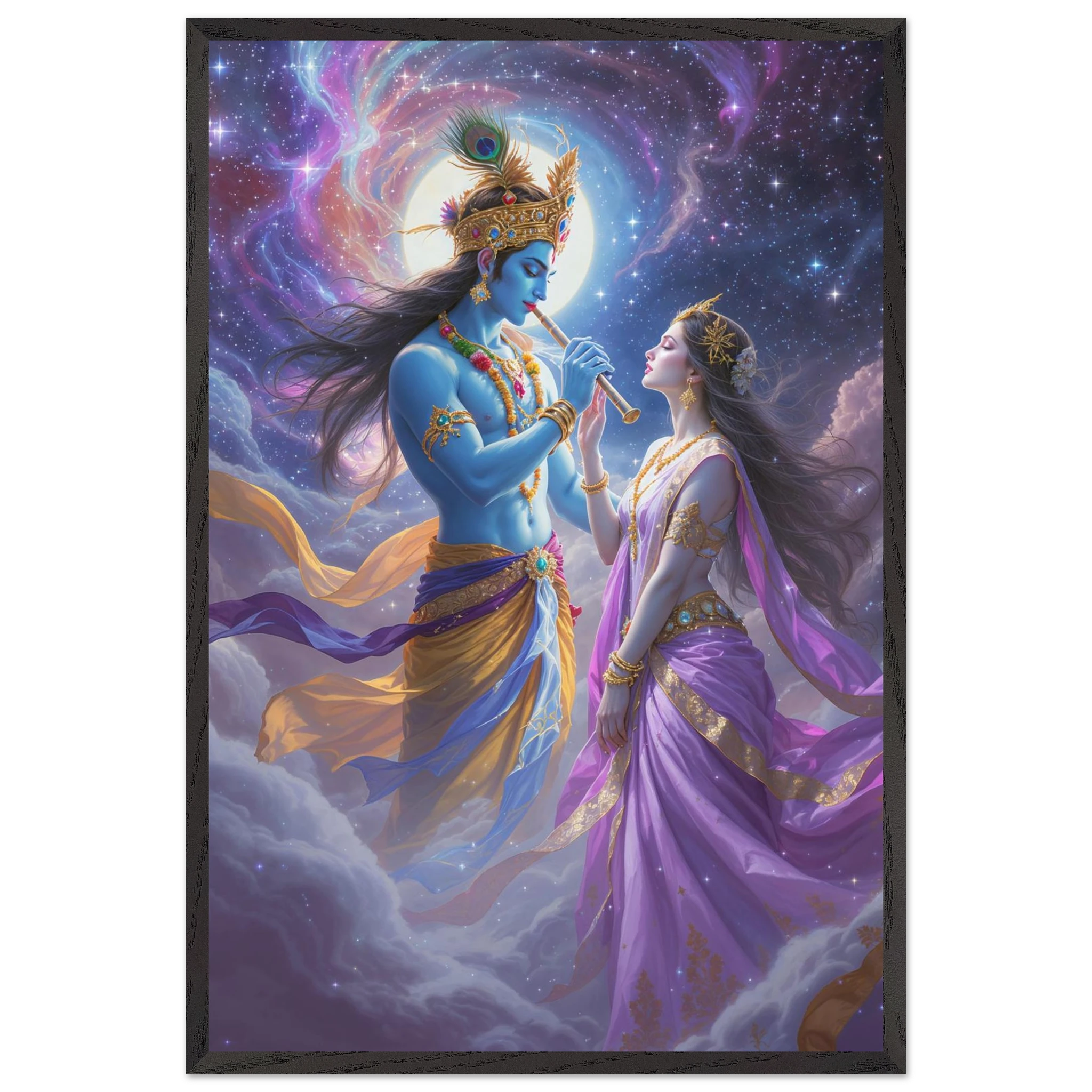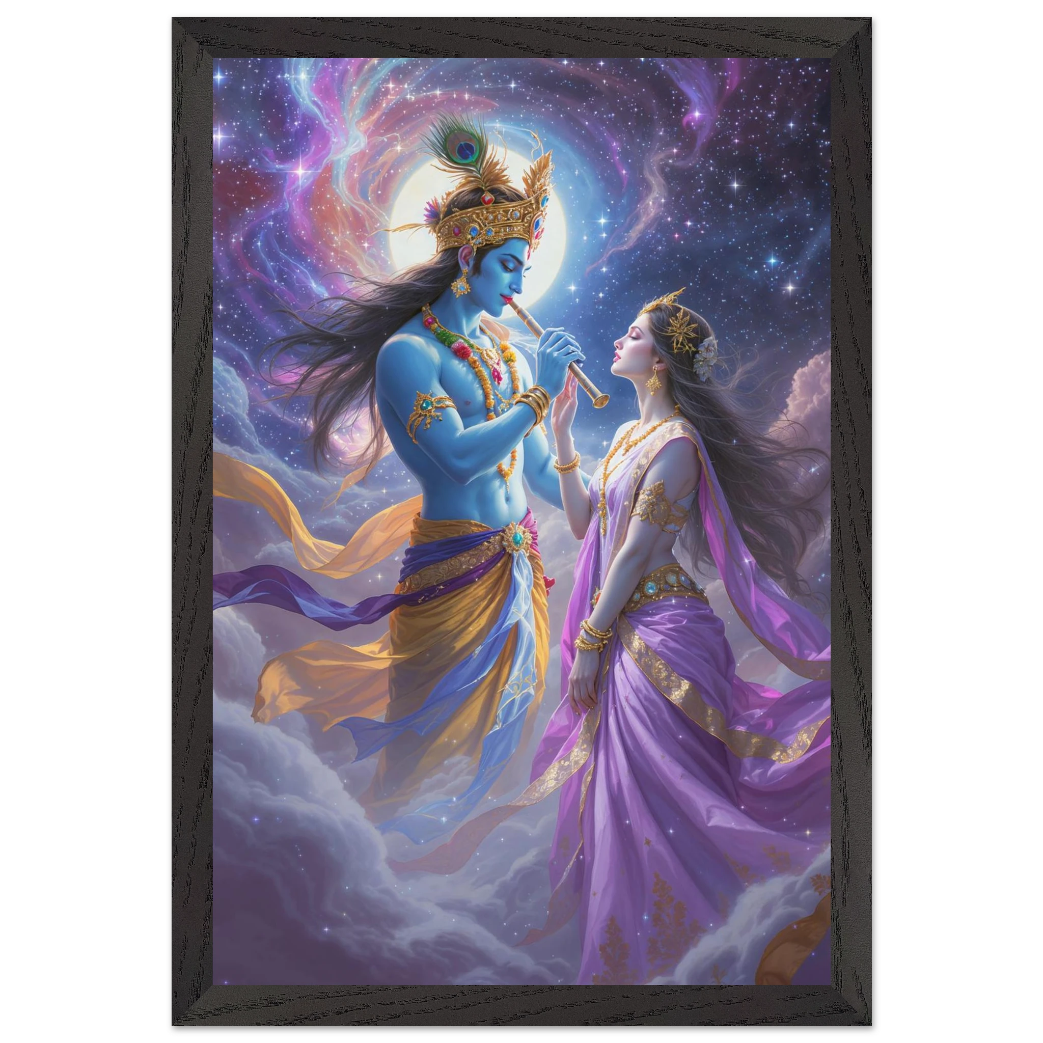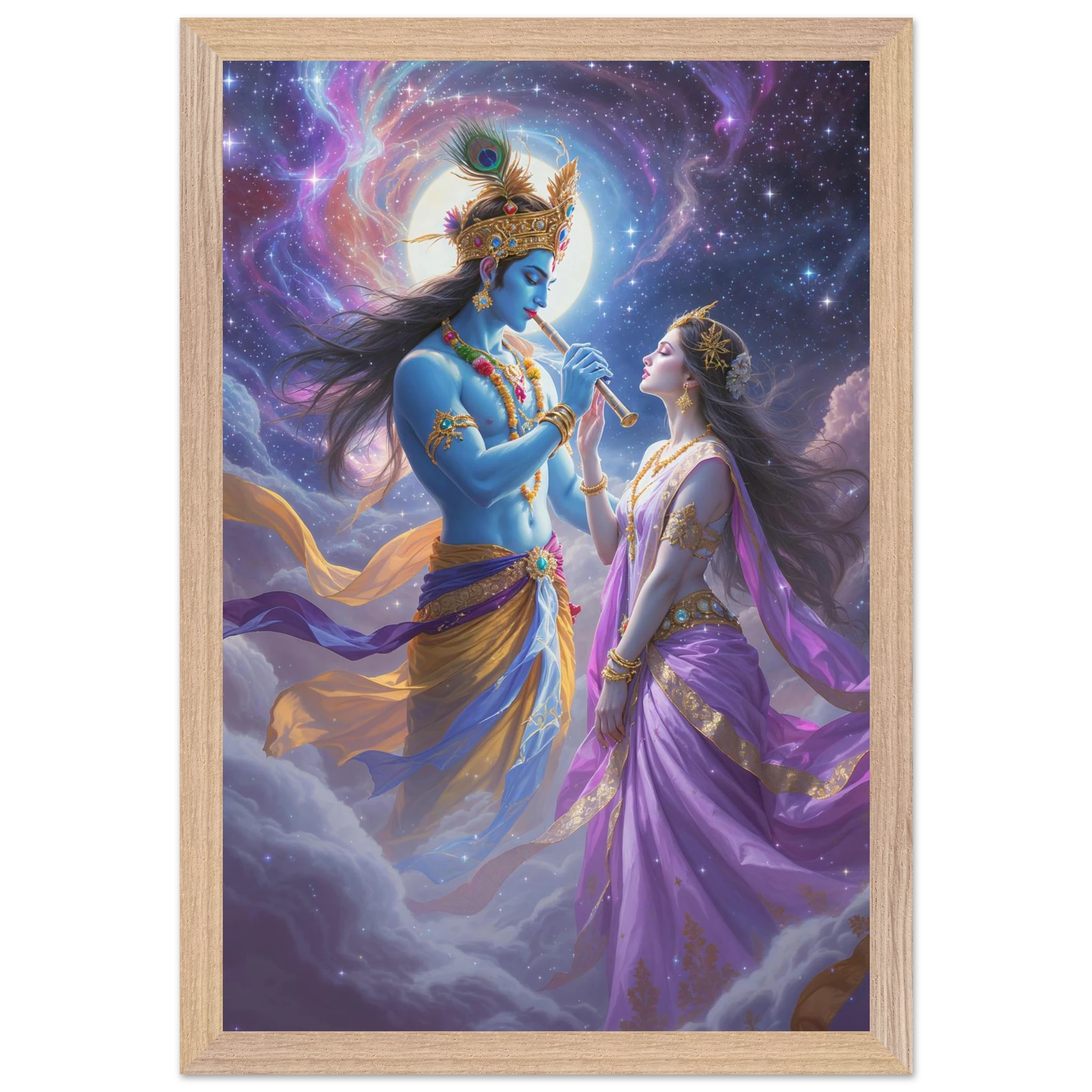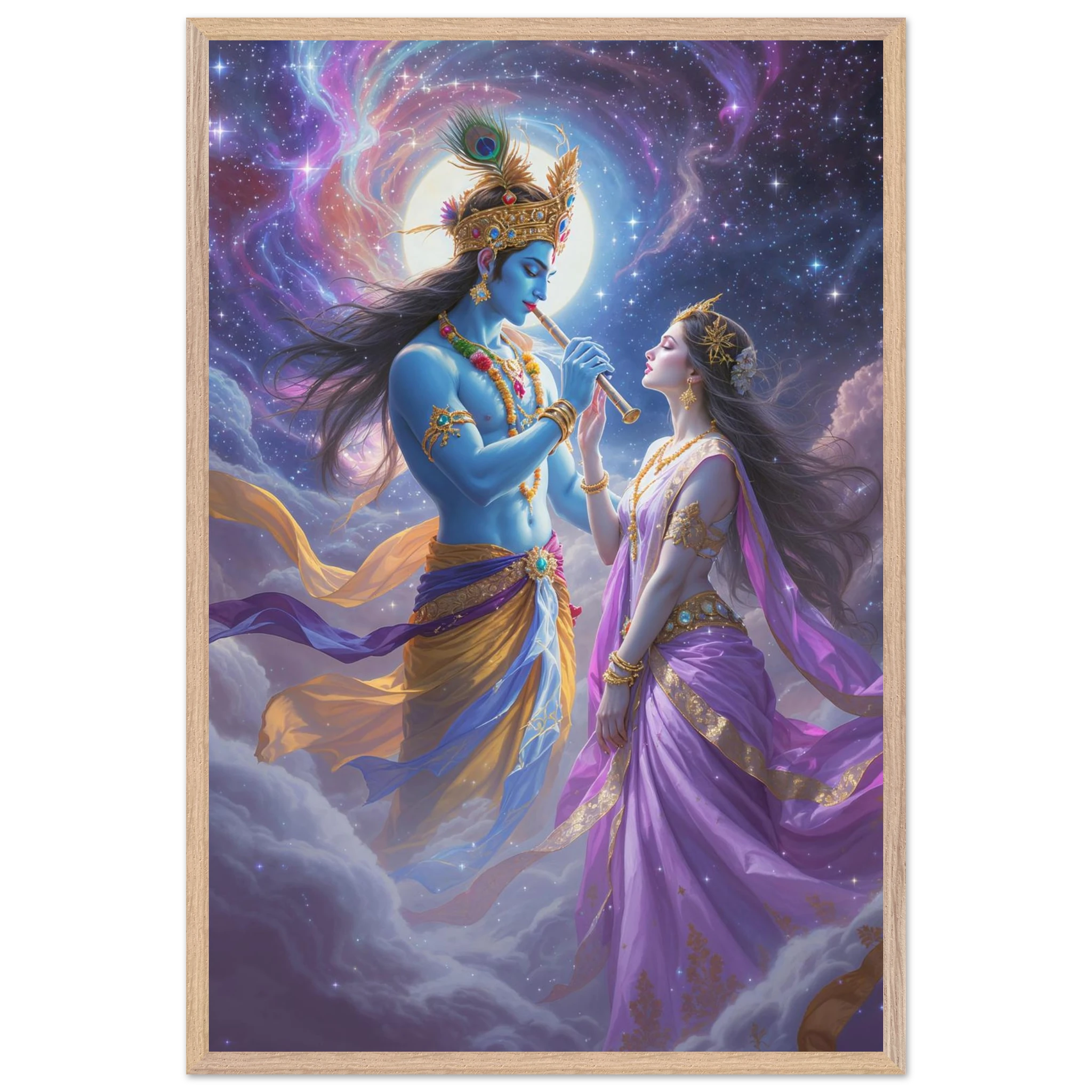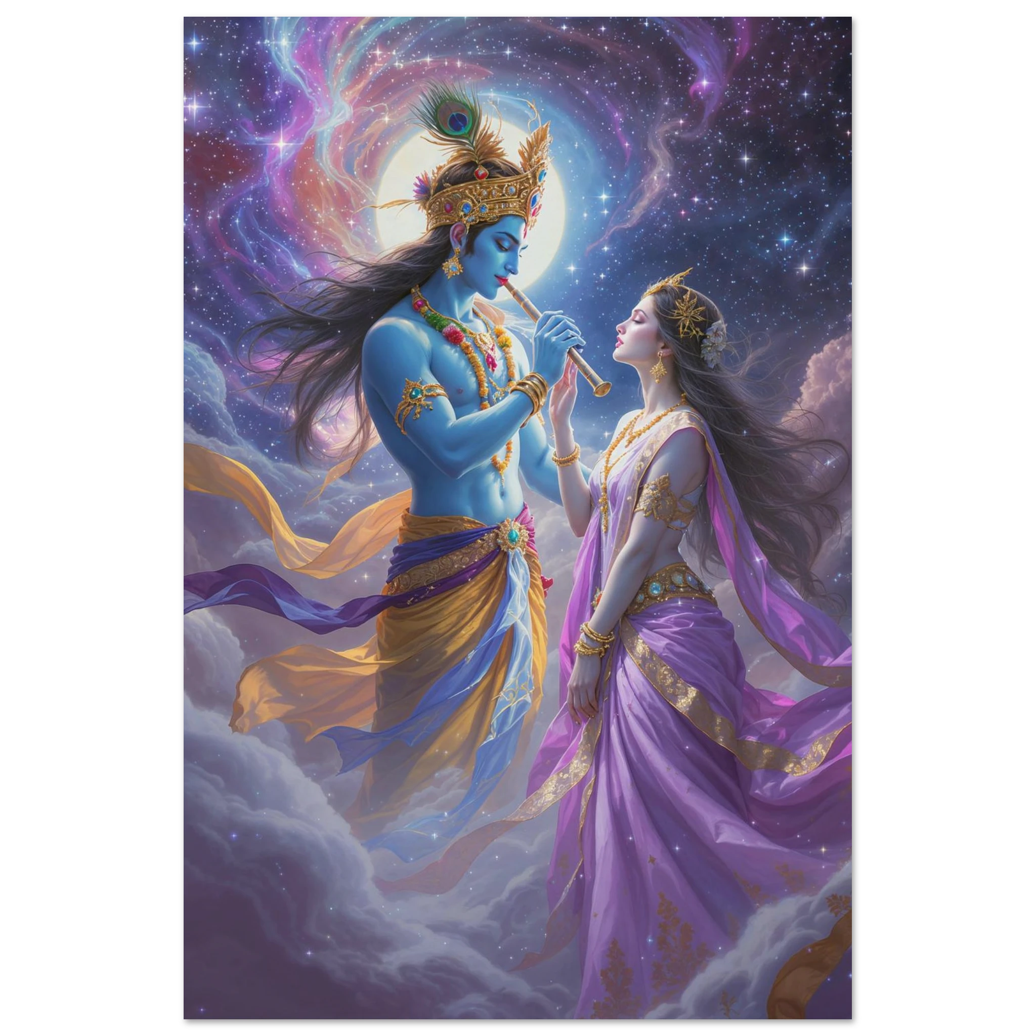 Step into a divine scene with this vibrant, ethereal digital painting inspired by Hindu mythology. The celestial figure, with striking blue skin and a gold peacock crown, serenely plays the flute while adorned in a flowing yellow dhoti. Opposite him, a fair-skinned figure, likely Radha, gazes up in admiration, dressed in a lavender lehenga intricately detailed with gold. The background is a breathtaking, swirling cosmic expanse of blues, purples, and pinks. This luminous and dynamic piece captures a moment of celestial love and mystical harmony, perfect for adding a sense of spirituality and vibrant colour to your home.