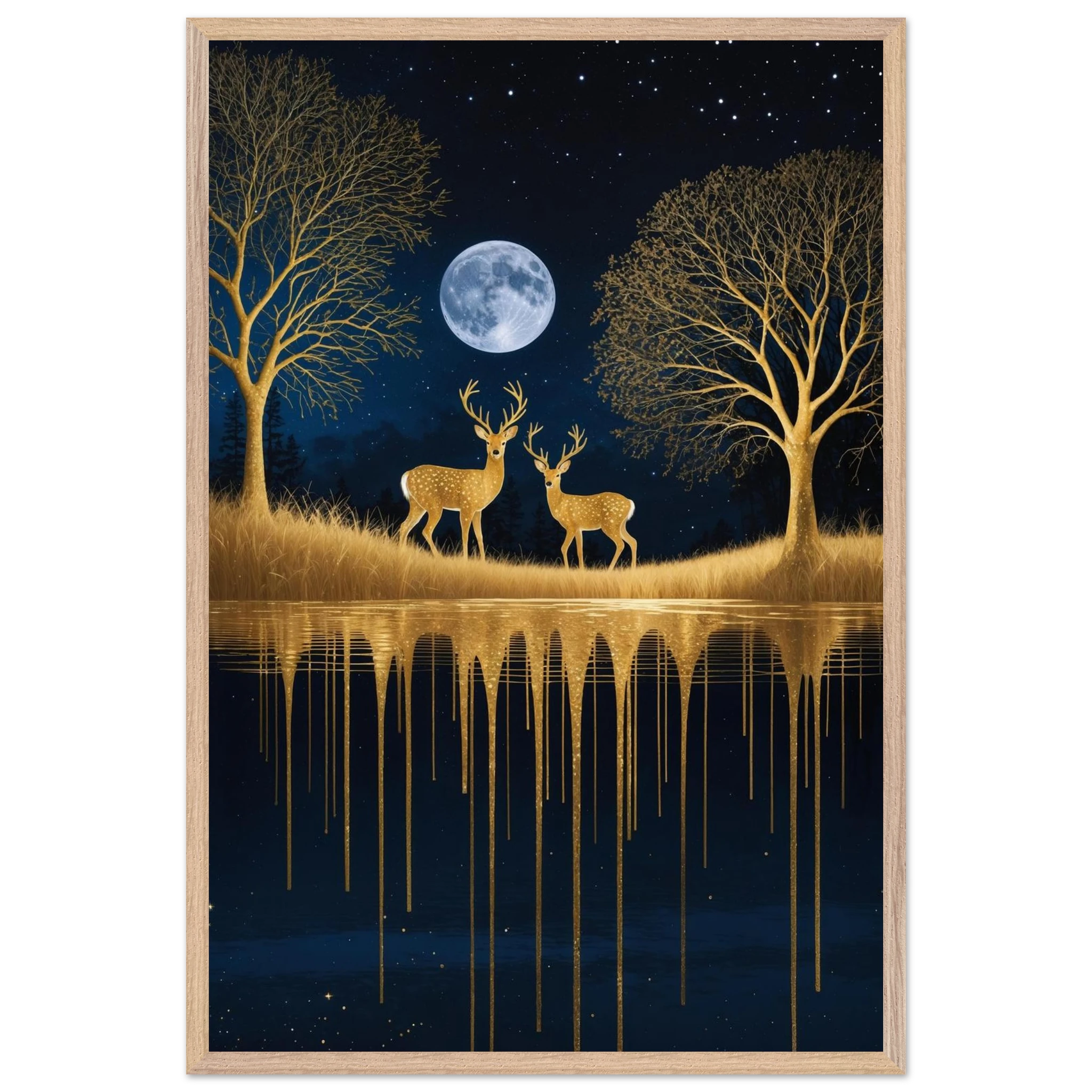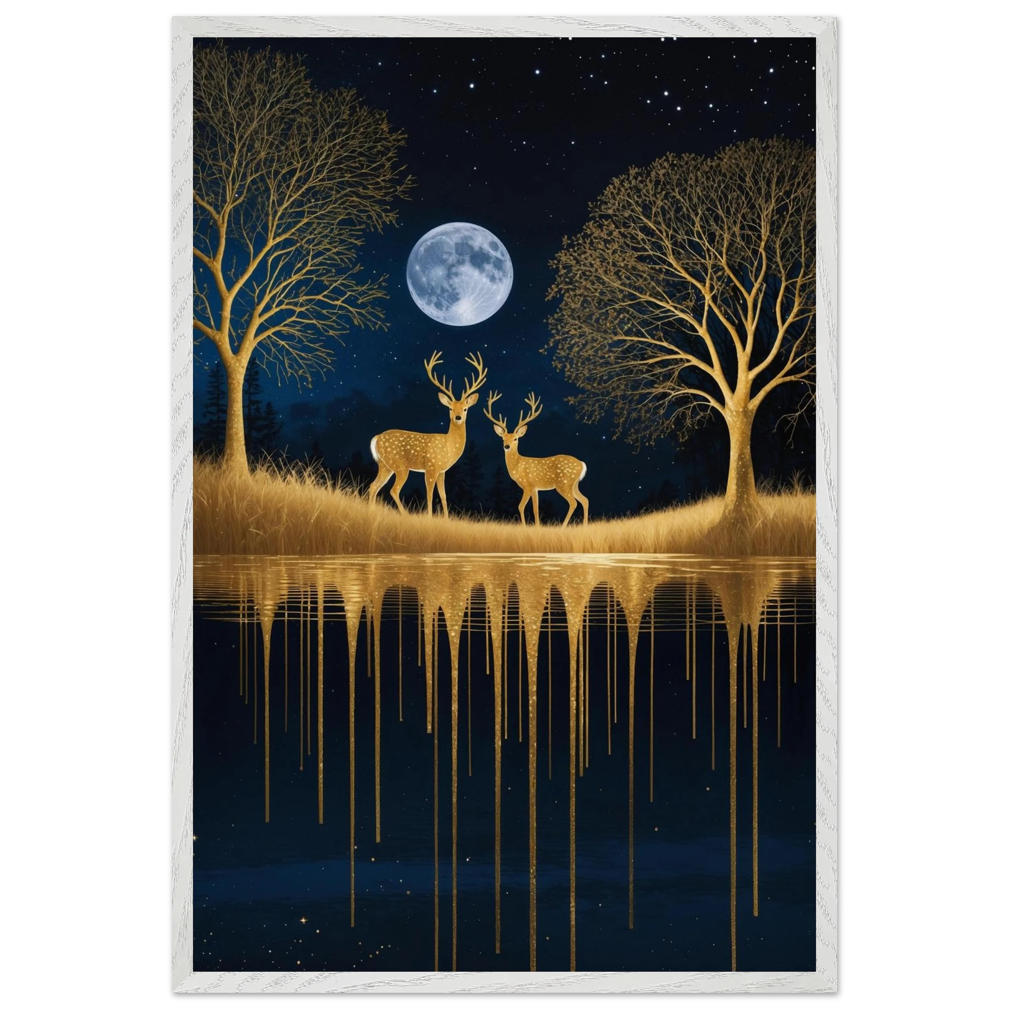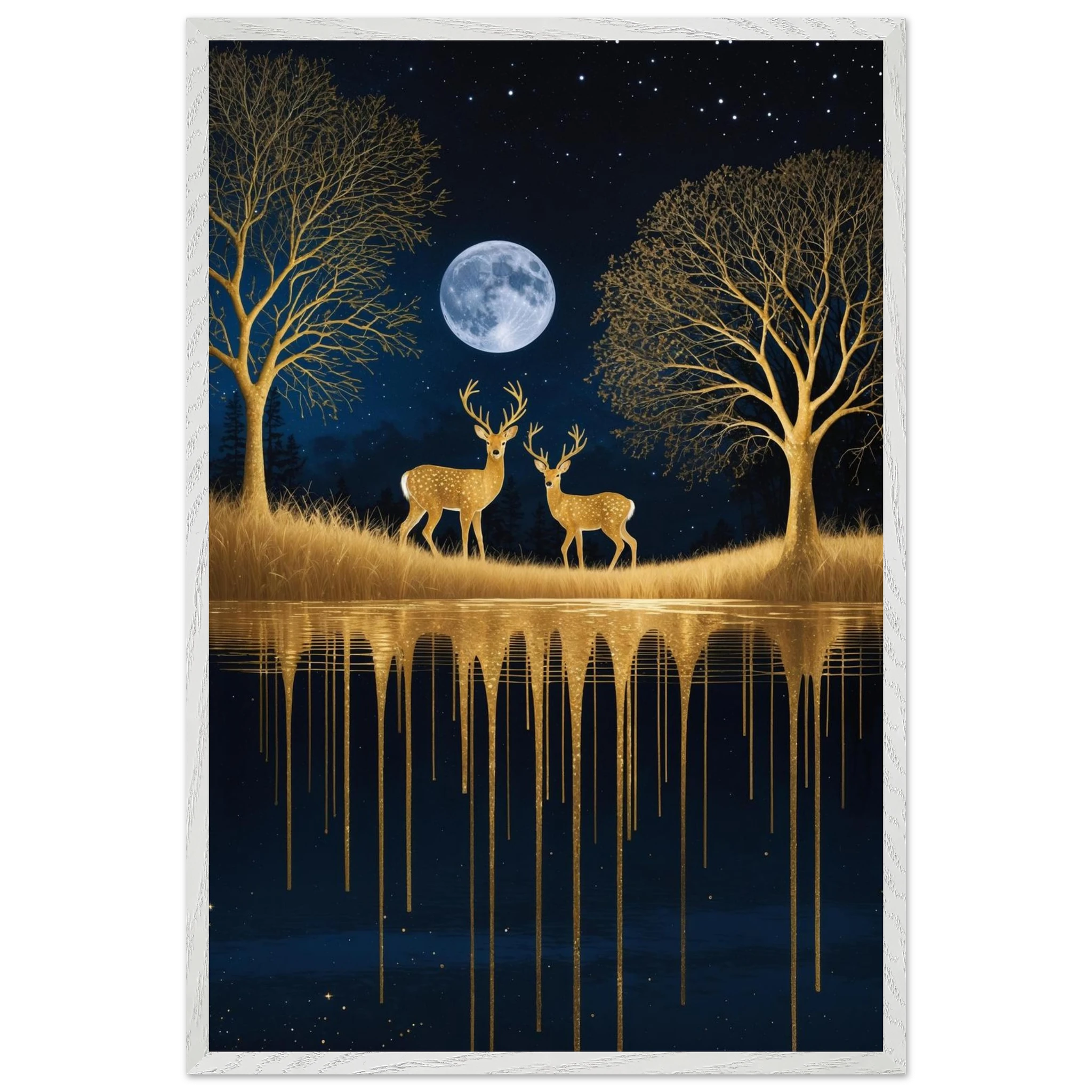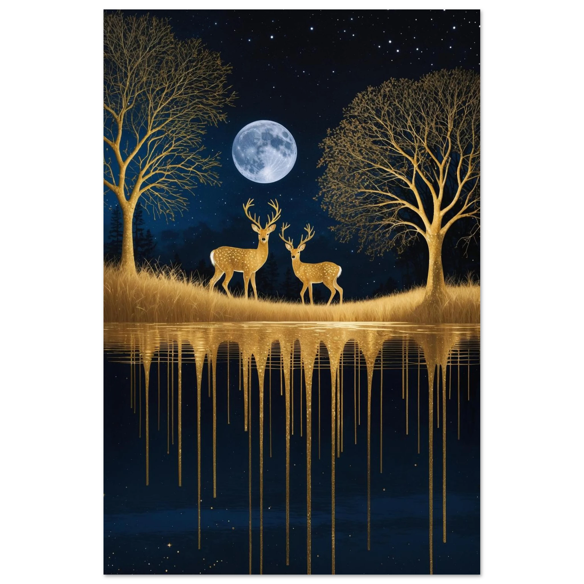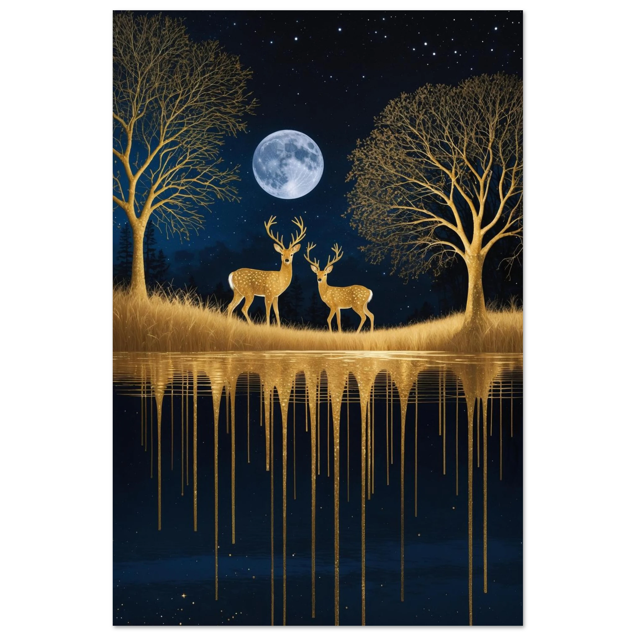 Step into a mystical, surreal night scene with this captivating vertical digital artwork. A vast, dark, starry sky is illuminated by a glowing full moon, creating a backdrop for intricate, leafless trees rendered in shimmering metallic gold. Two graceful gold deer stand poised on the golden terrain, reflecting in the tranquil body of water below, where golden drips enhance the ethereal effect. Dominated by a palette of deep blues and golds, this piece is both dramatic and serene, offering an imaginative, sophisticated focal point for modern decor.