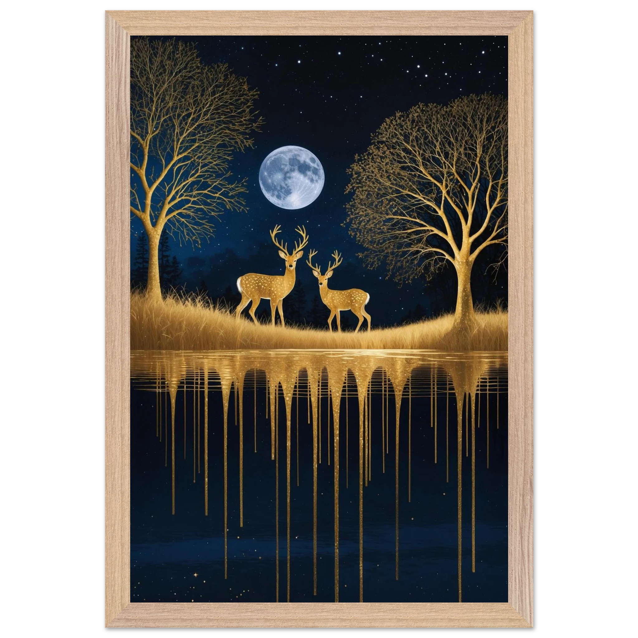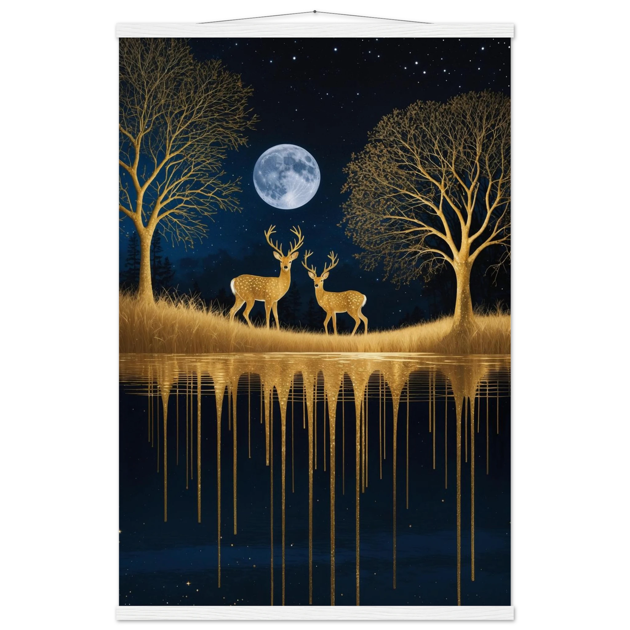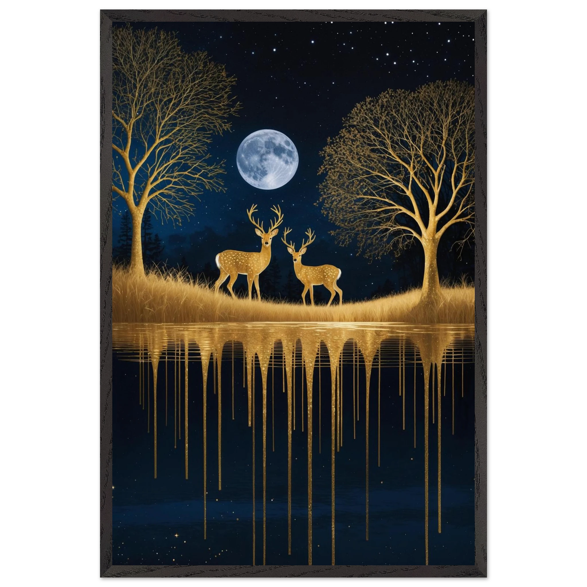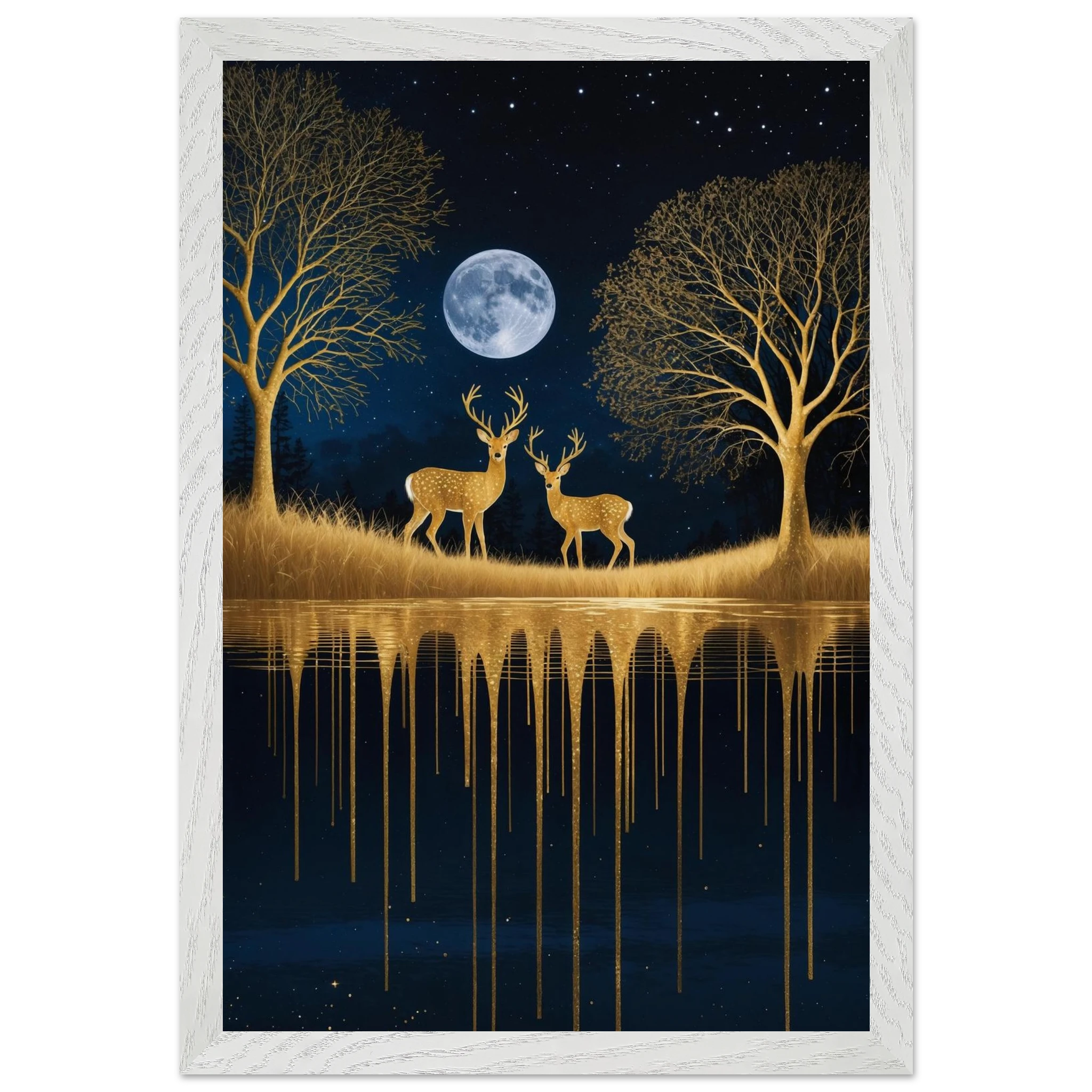 Step into a mystical, surreal night scene with this captivating vertical digital artwork. A vast, dark, starry sky is illuminated by a glowing full moon, creating a backdrop for intricate, leafless trees rendered in shimmering metallic gold. Two graceful gold deer stand poised on the golden terrain, reflecting in the tranquil body of water below, where golden drips enhance the ethereal effect. Dominated by a palette of deep blues and golds, this piece is both dramatic and serene, offering an imaginative, sophisticated focal point for modern decor.