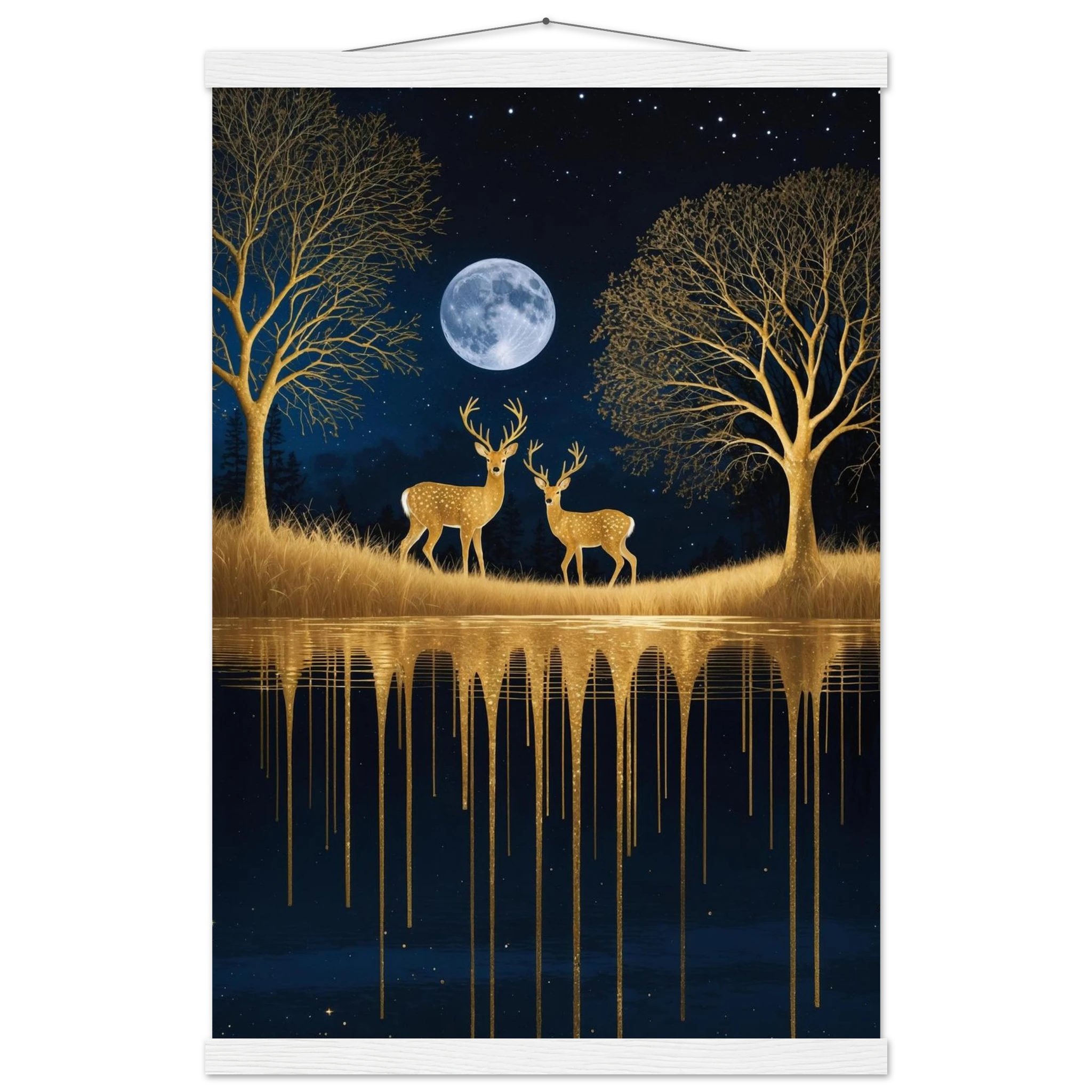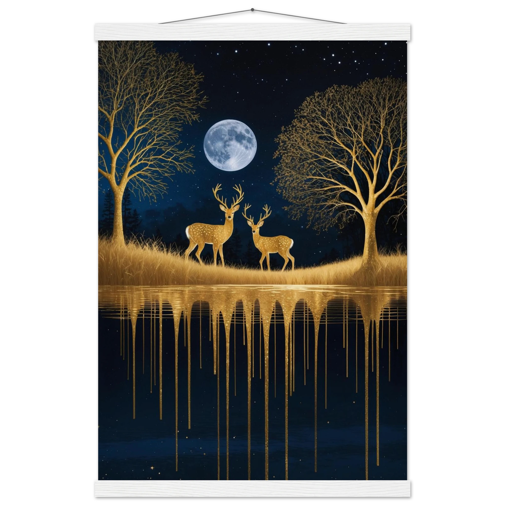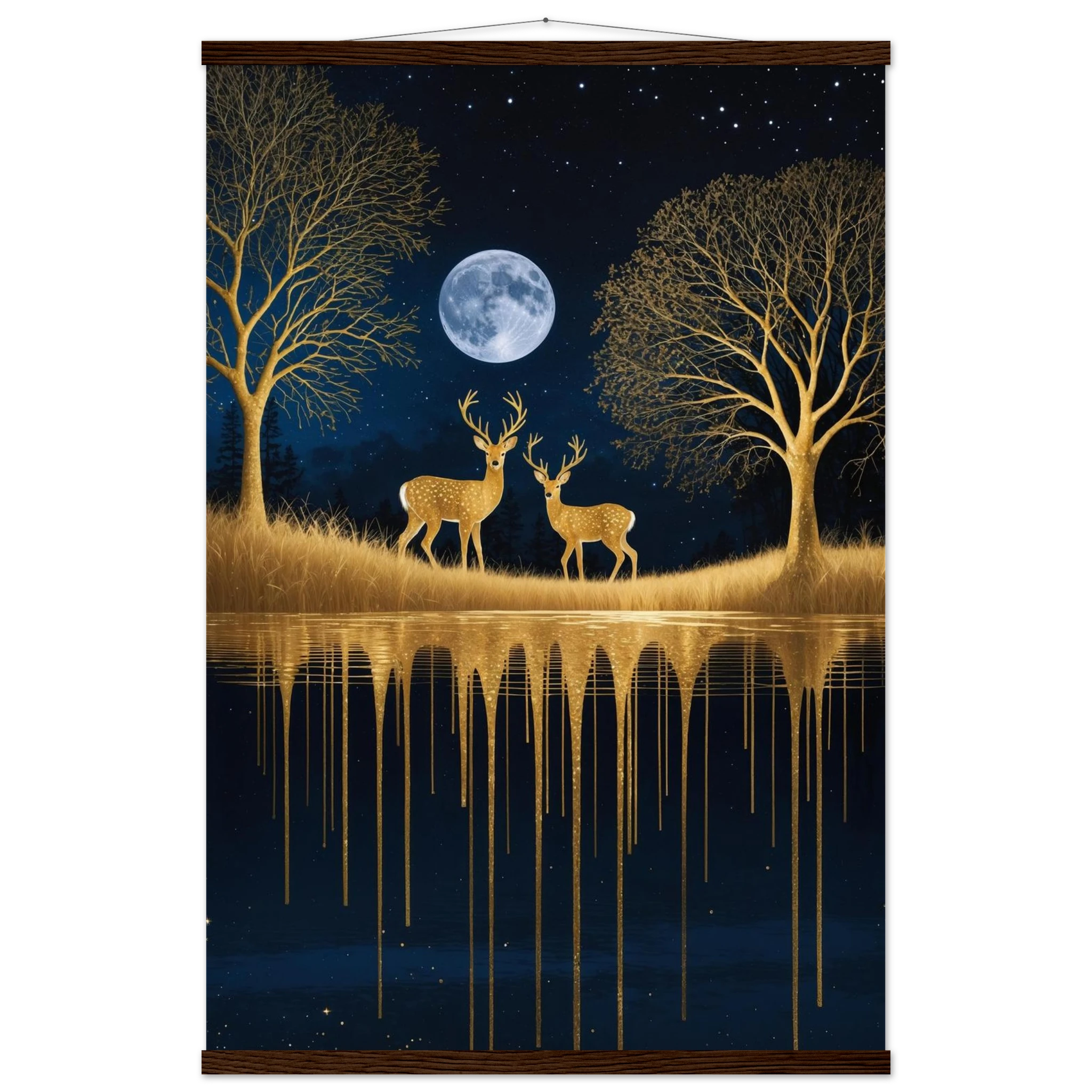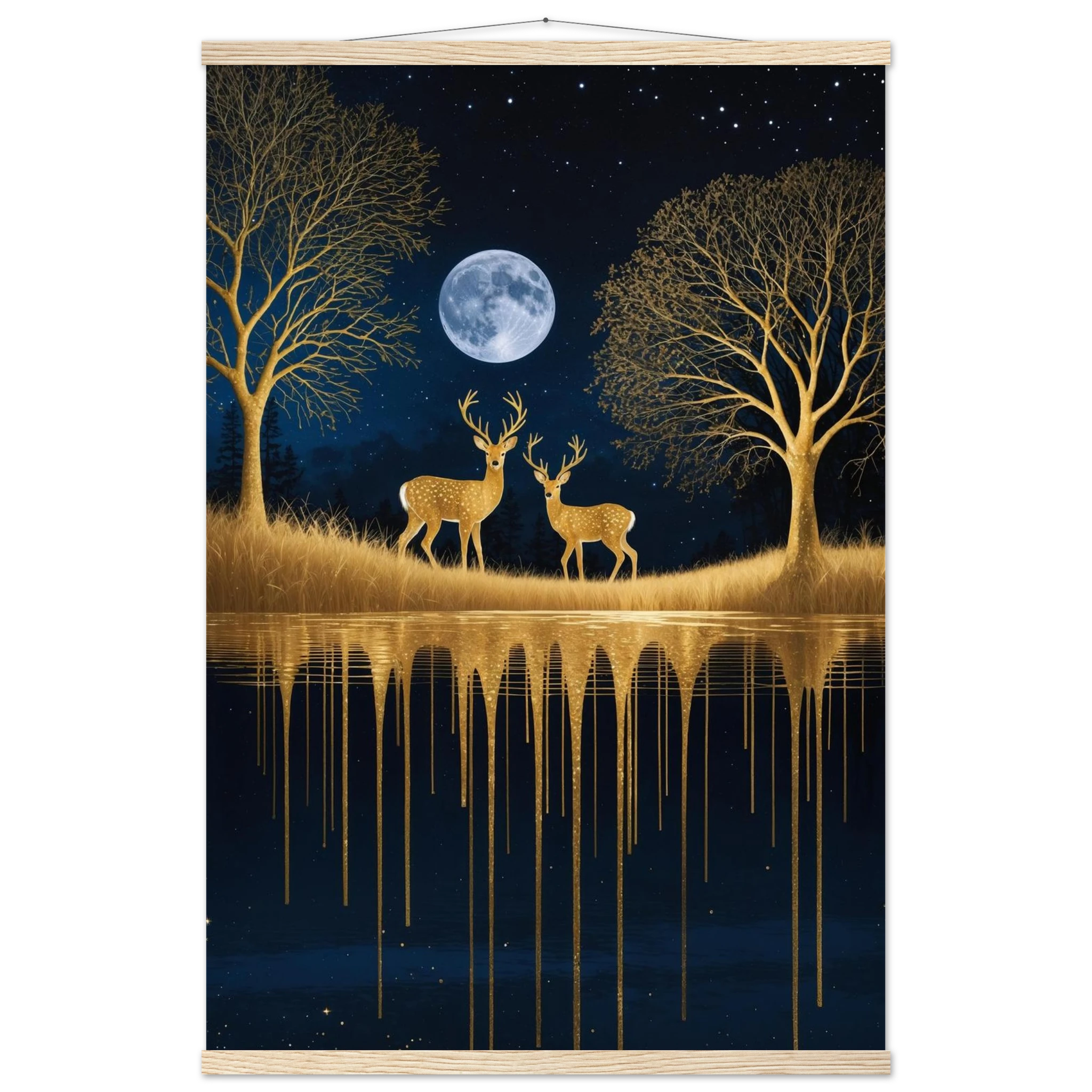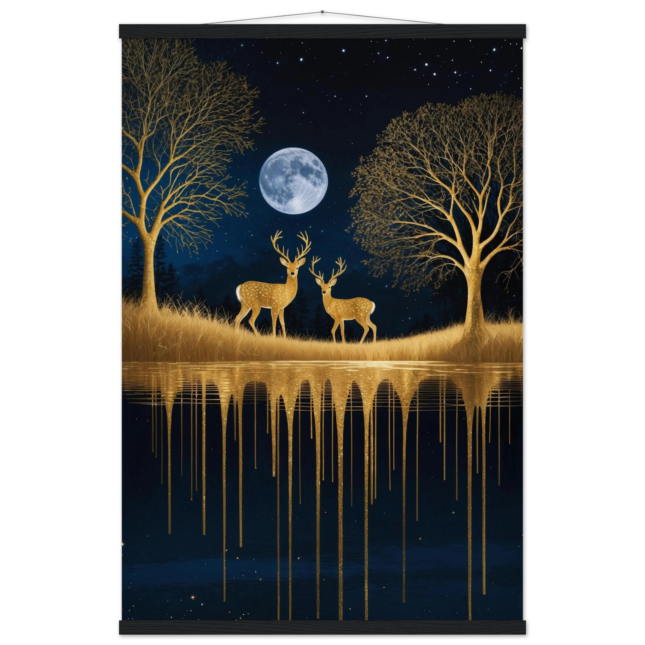 Step into a mystical, surreal night scene with this captivating vertical digital artwork. A vast, dark, starry sky is illuminated by a glowing full moon, creating a backdrop for intricate, leafless trees rendered in shimmering metallic gold. Two graceful gold deer stand poised on the golden terrain, reflecting in the tranquil body of water below, where golden drips enhance the ethereal effect. Dominated by a palette of deep blues and golds, this piece is both dramatic and serene, offering an imaginative, sophisticated focal point for modern decor.