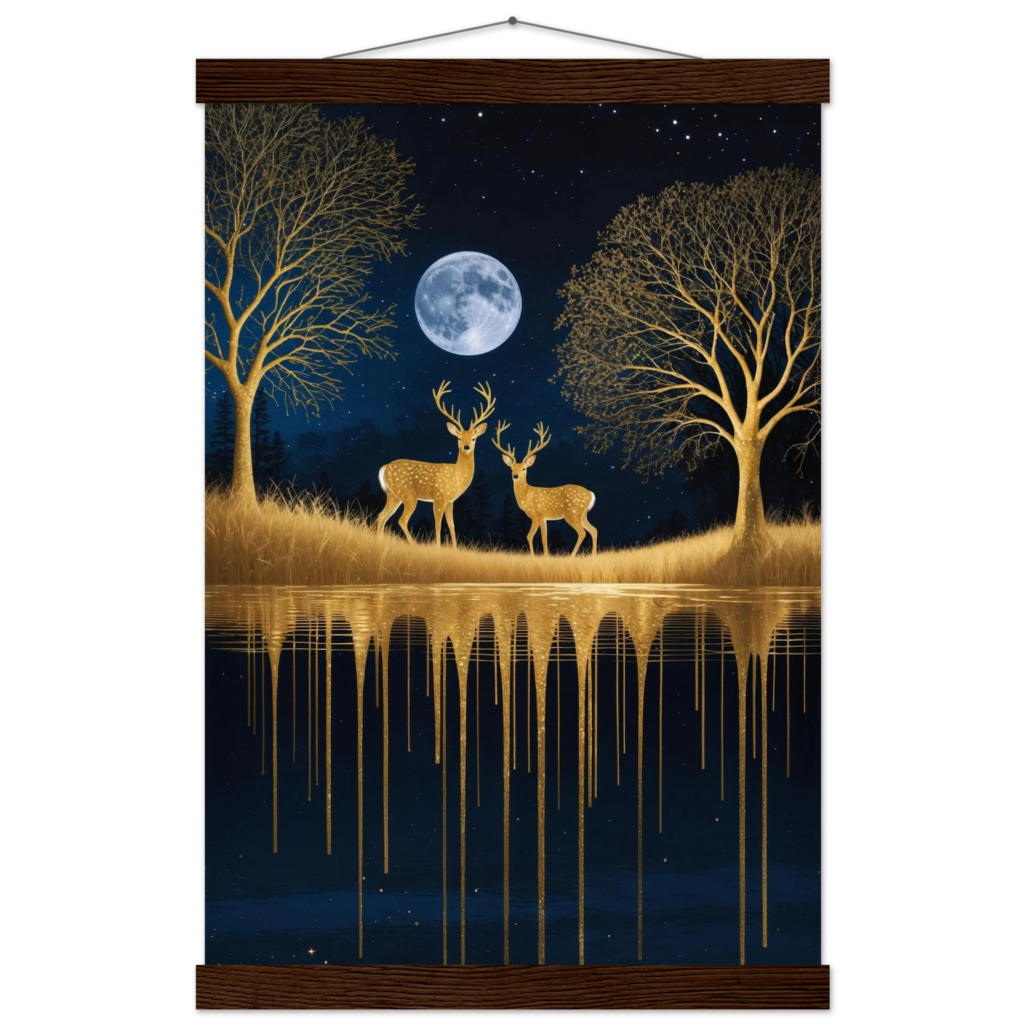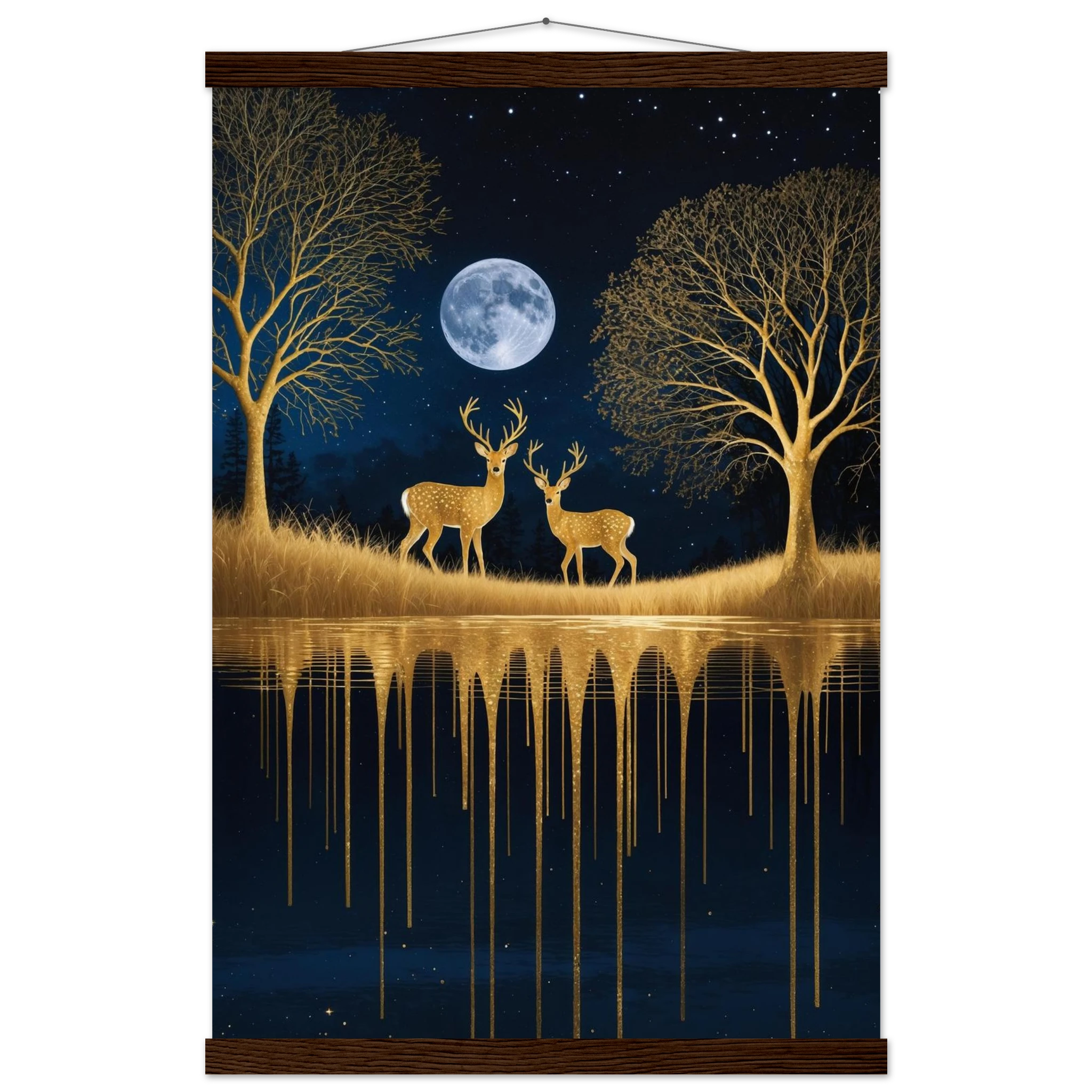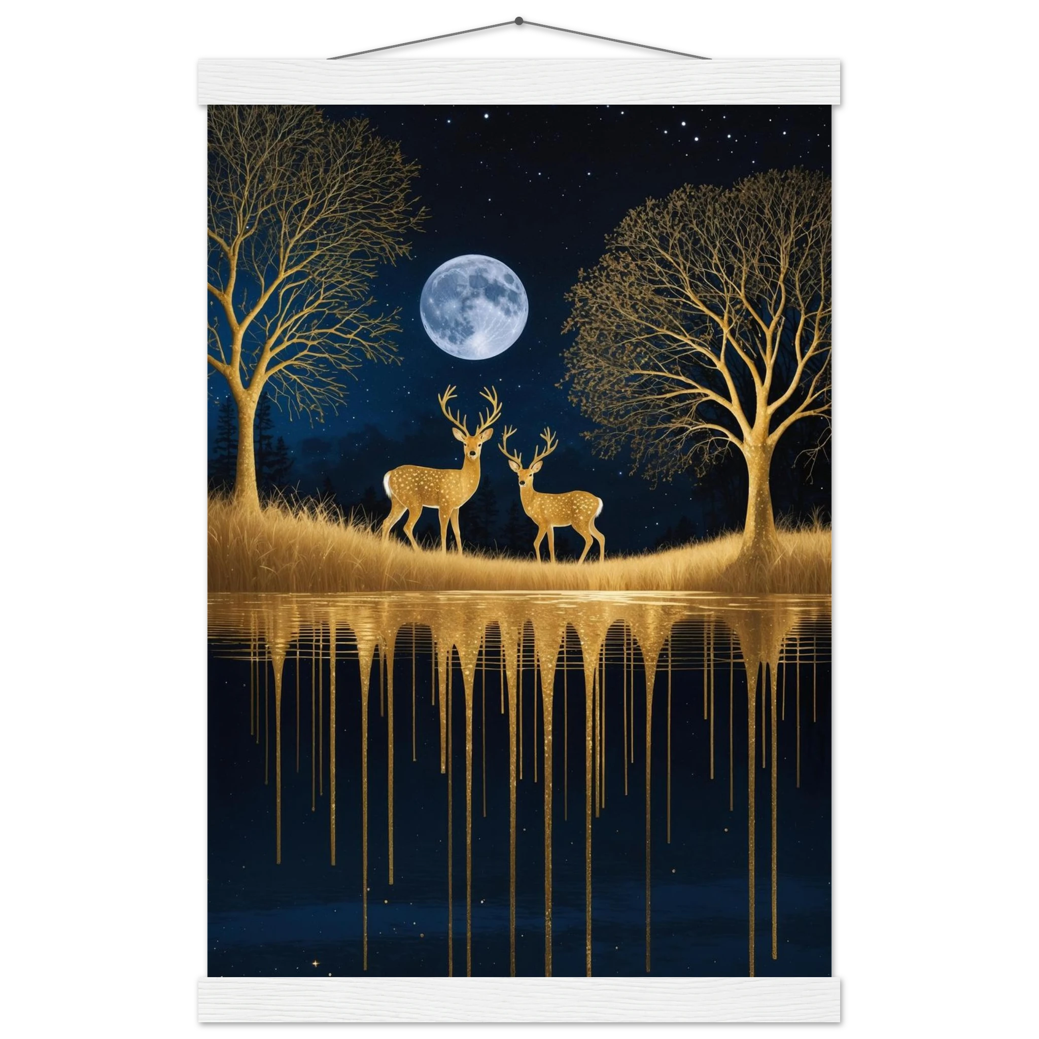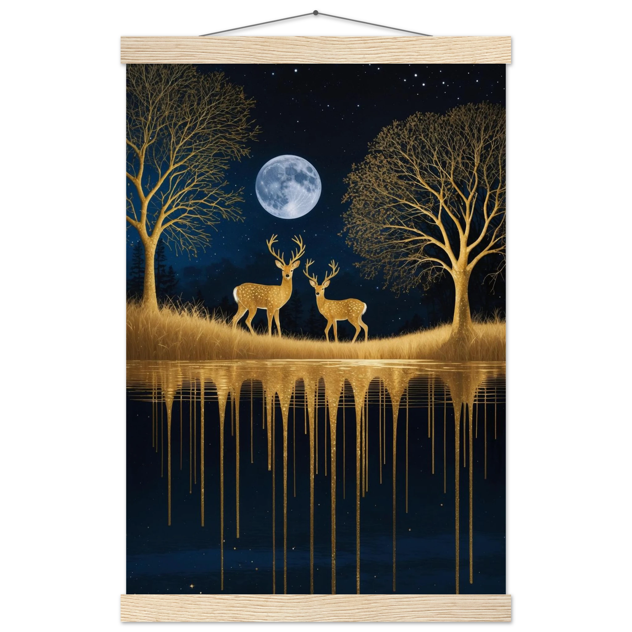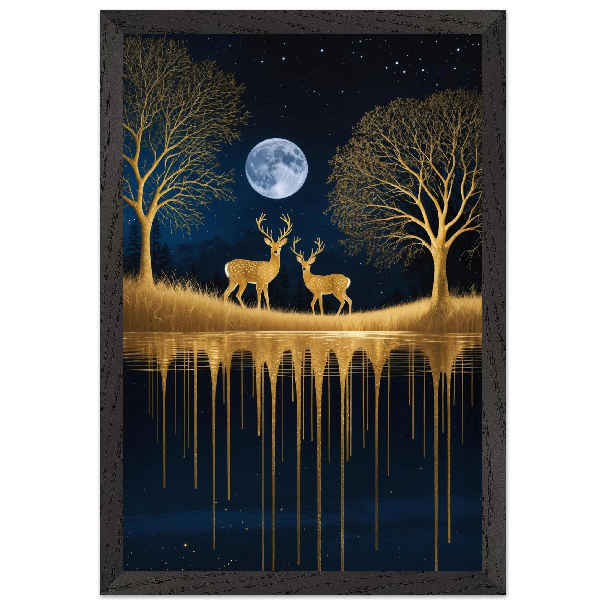 Step into a mystical, surreal night scene with this captivating vertical digital artwork. A vast, dark, starry sky is illuminated by a glowing full moon, creating a backdrop for intricate, leafless trees rendered in shimmering metallic gold. Two graceful gold deer stand poised on the golden terrain, reflecting in the tranquil body of water below, where golden drips enhance the ethereal effect. Dominated by a palette of deep blues and golds, this piece is both dramatic and serene, offering an imaginative, sophisticated focal point for modern decor.