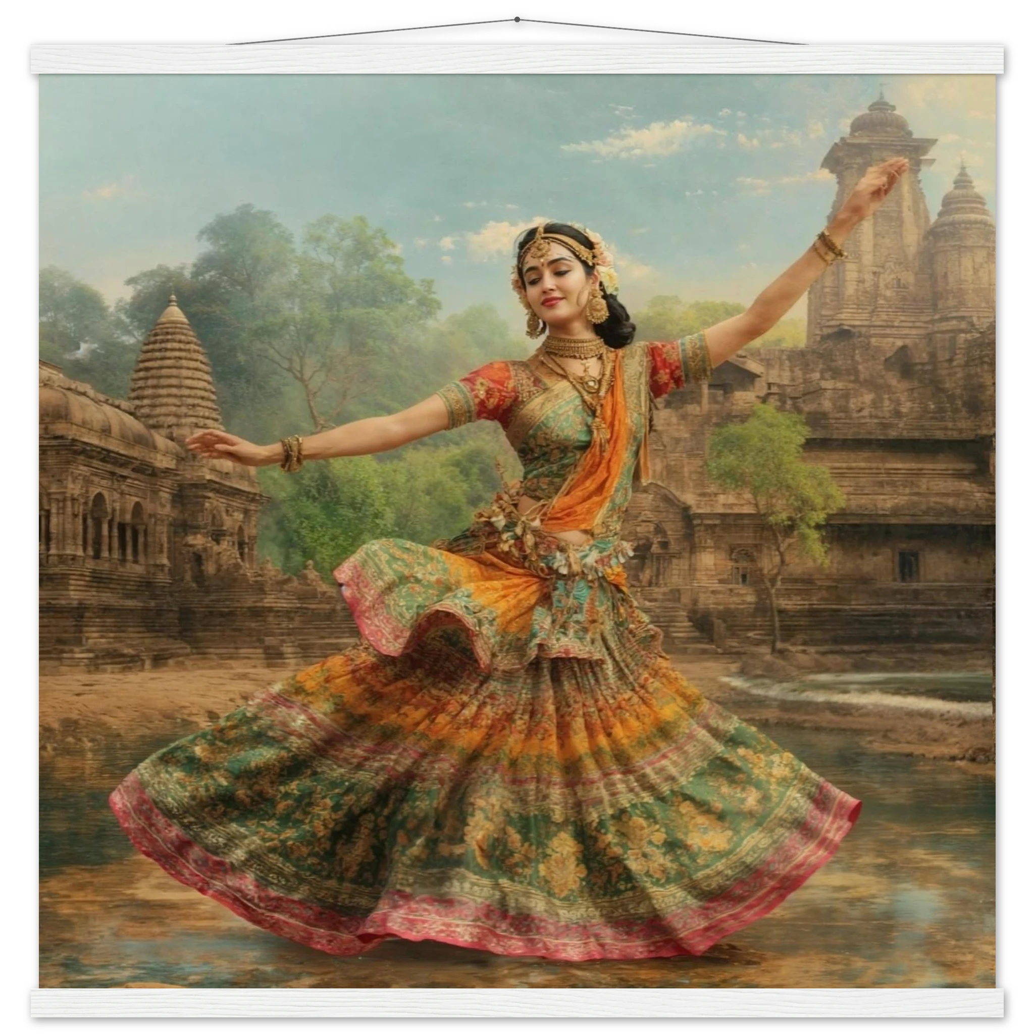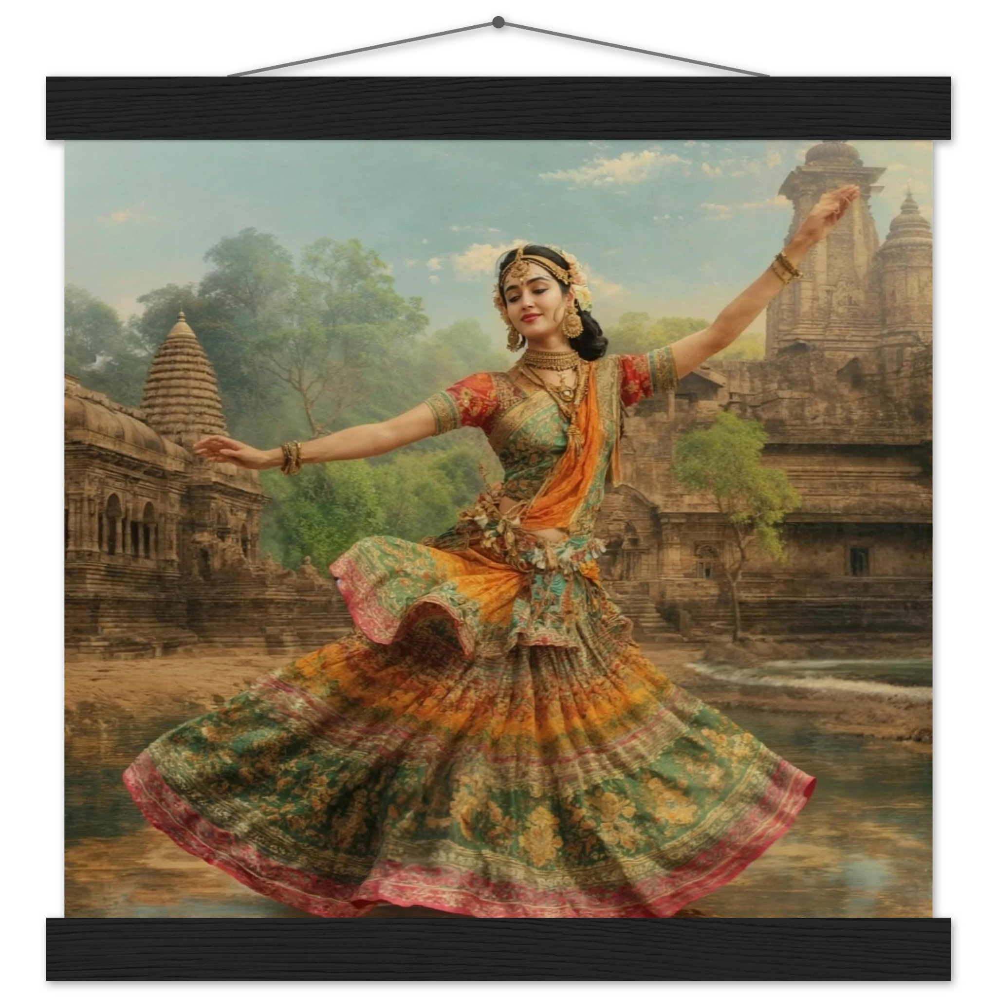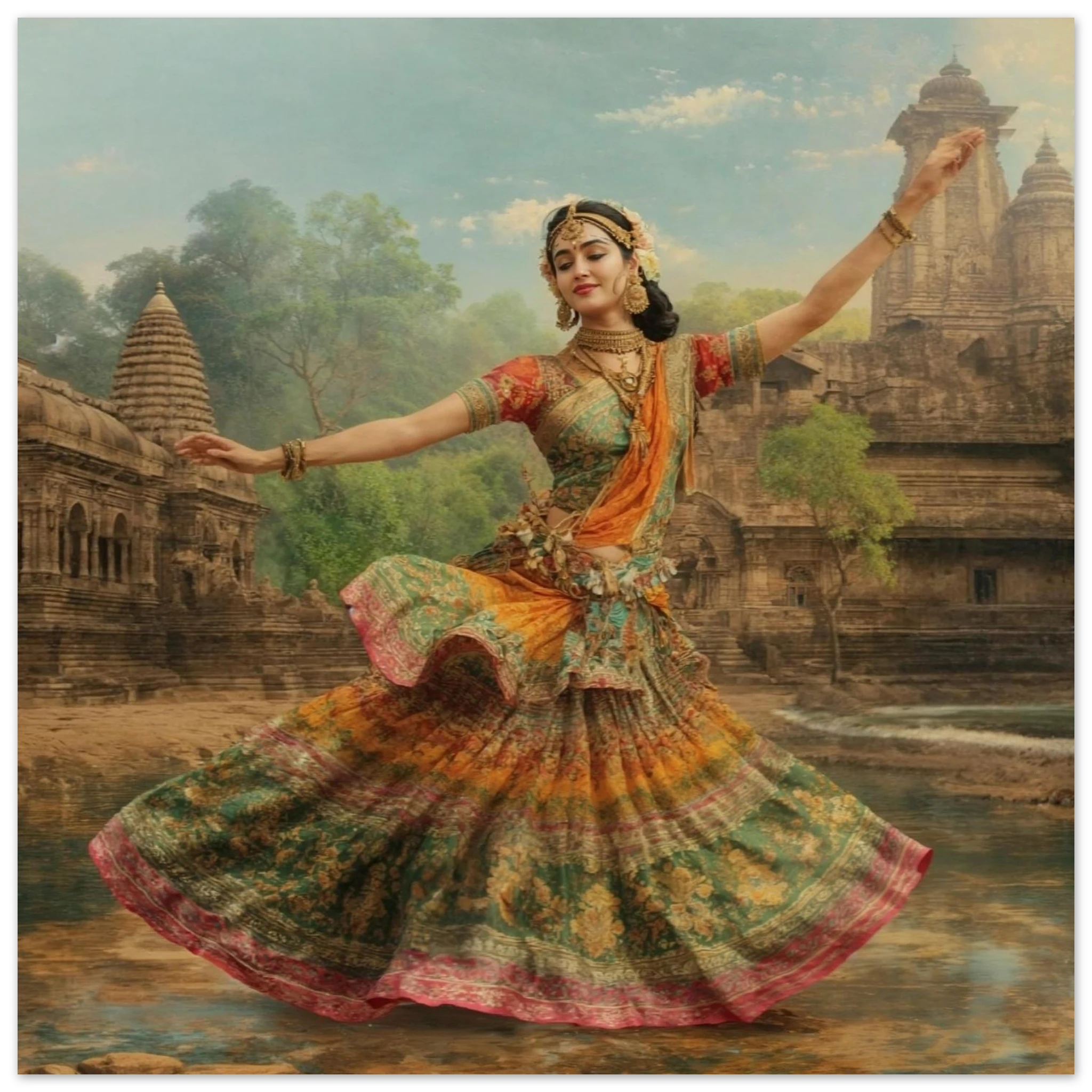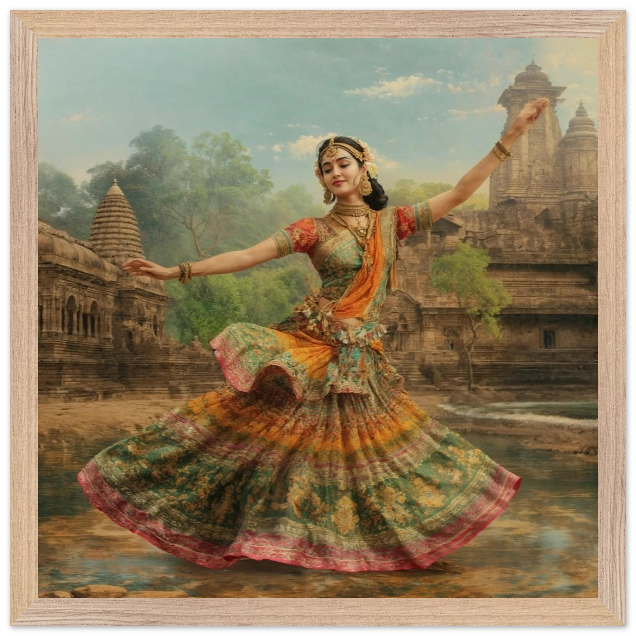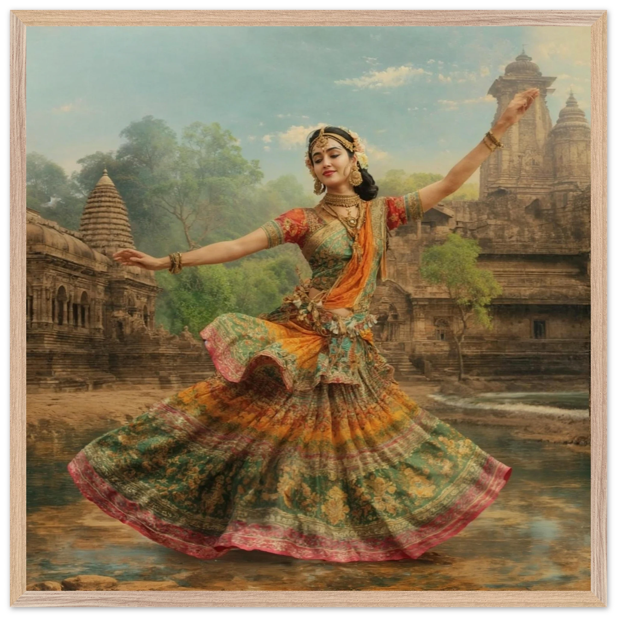 This vibrant art print captures a graceful Indian dancer in a dynamic pose, adorned in a colourful, flowing dress and ornate jewellery. Set against a serene temple and lush greenery, the painting, with its serene expression and intricate details, beautifully conveys a sense of cultural and ethereal beauty. Perfect for art lovers of Indian traditional dance.Â