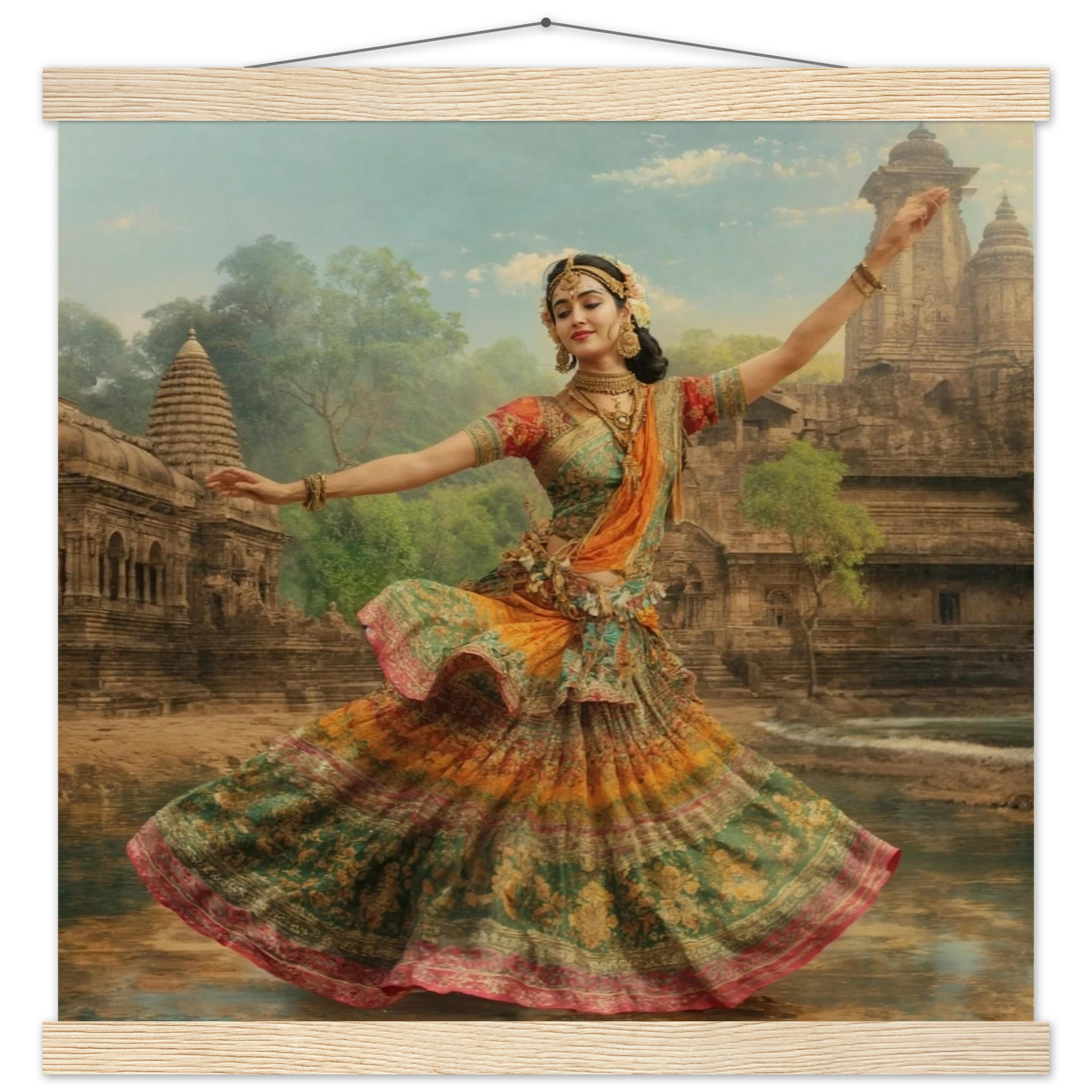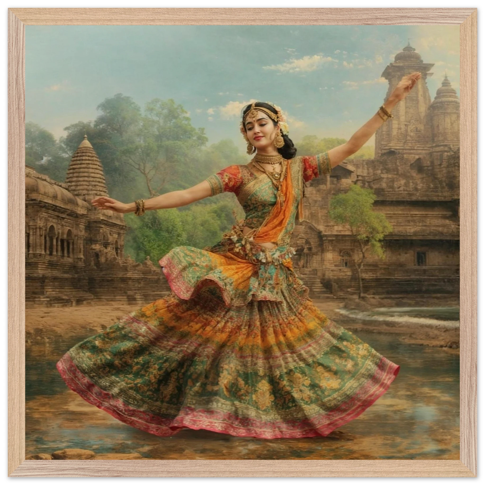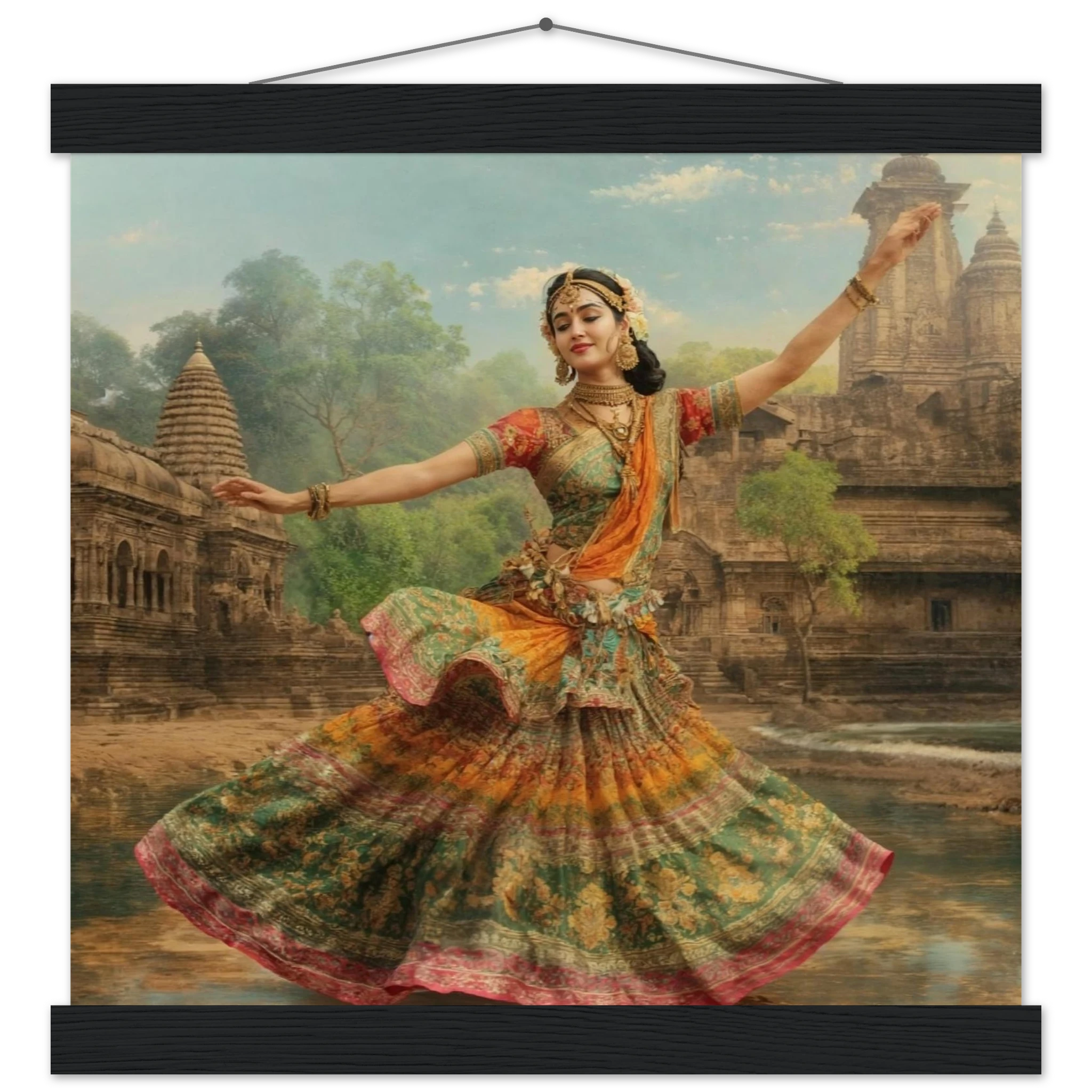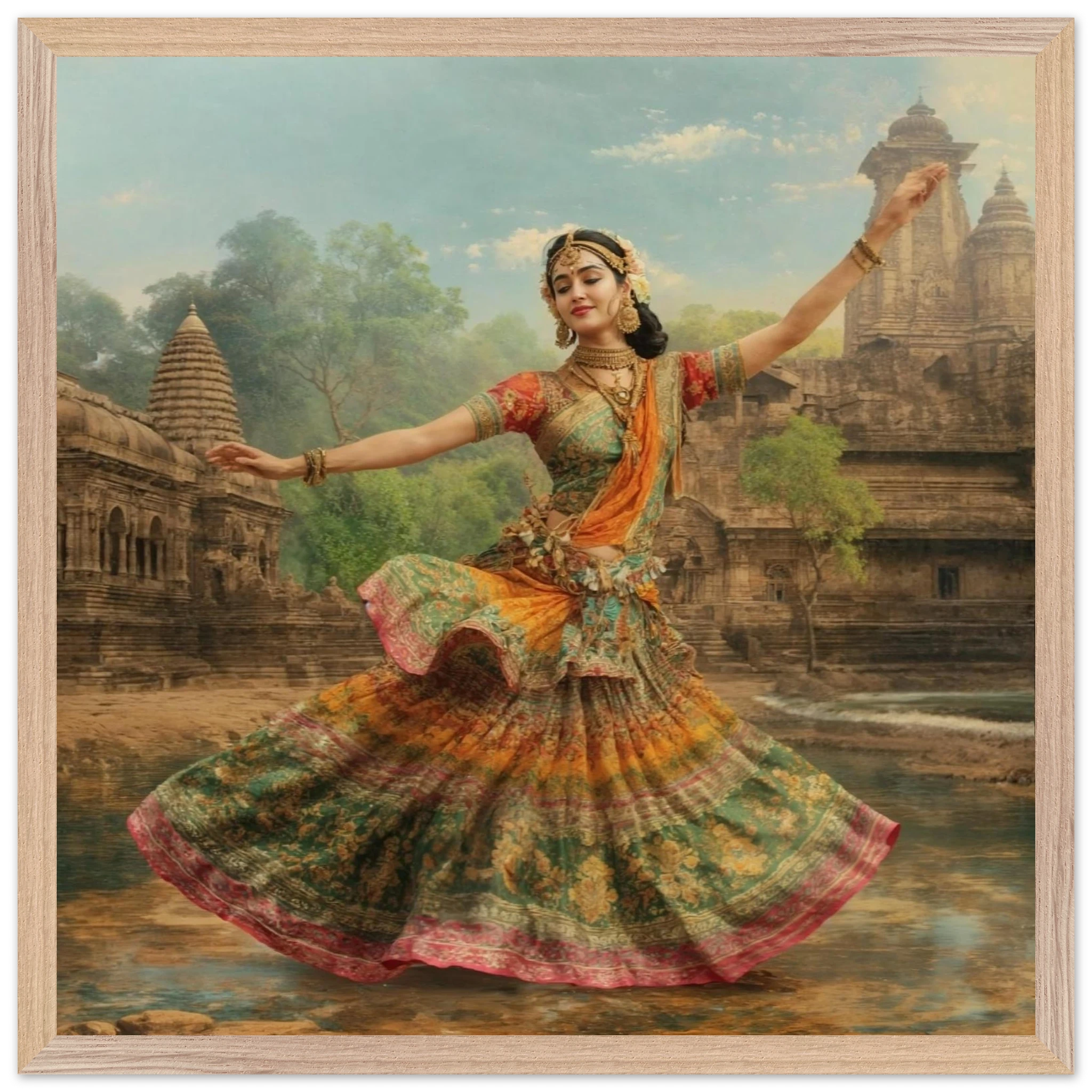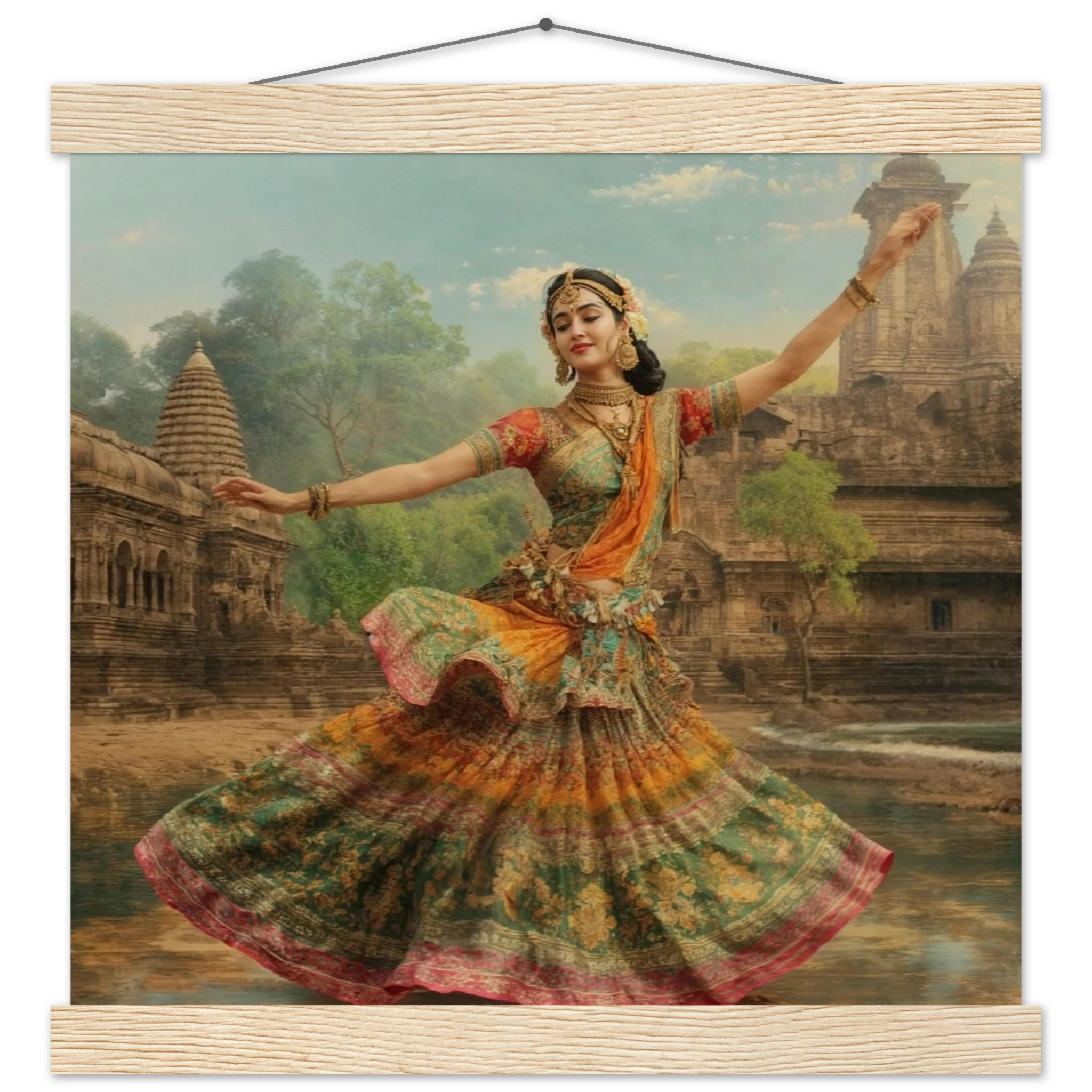 This vibrant art print captures a graceful Indian dancer in a dynamic pose, adorned in a colourful, flowing dress and ornate jewellery. Set against a serene temple and lush greenery, the painting, with its serene expression and intricate details, beautifully conveys a sense of cultural and ethereal beauty. Perfect for art lovers of Indian traditional dance.Â