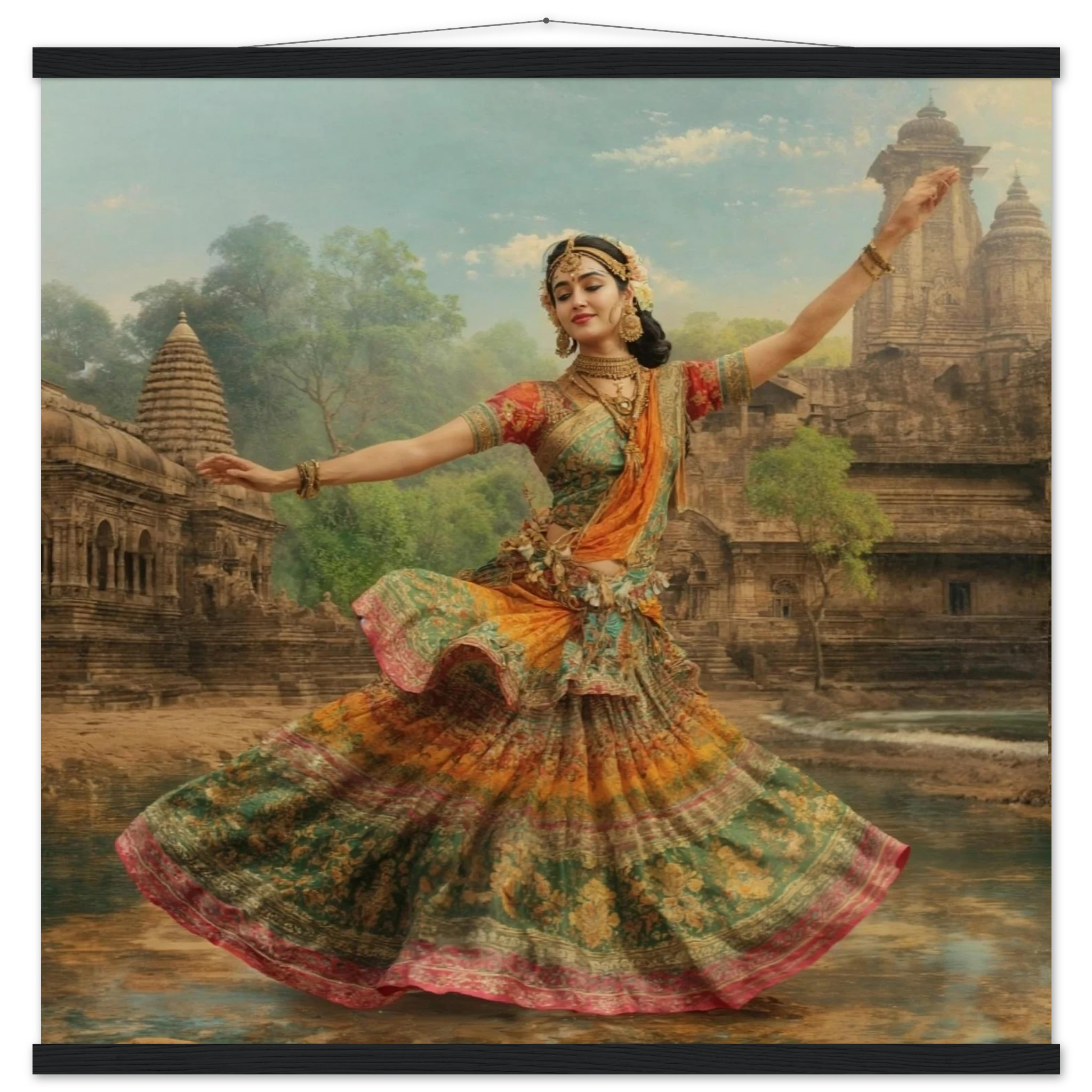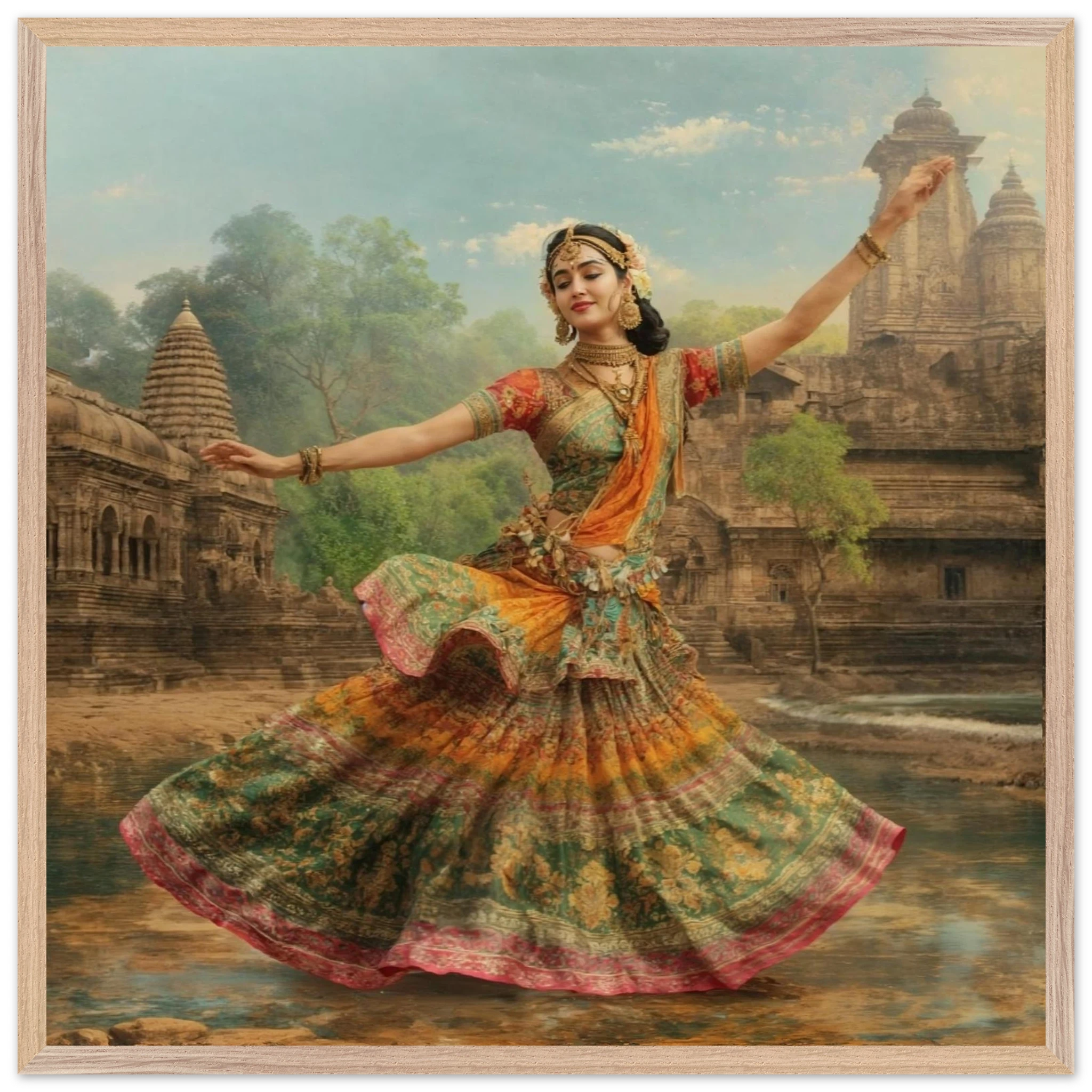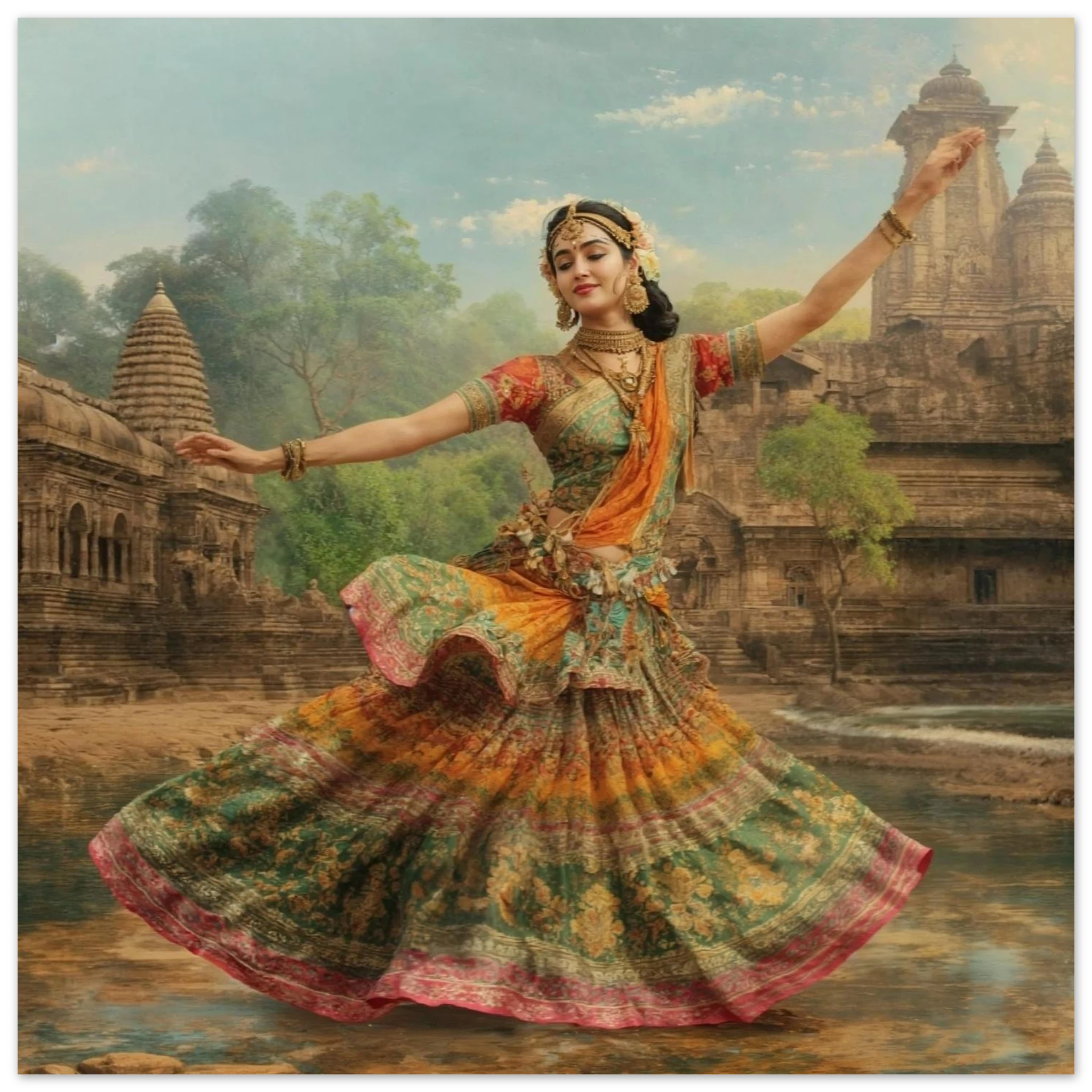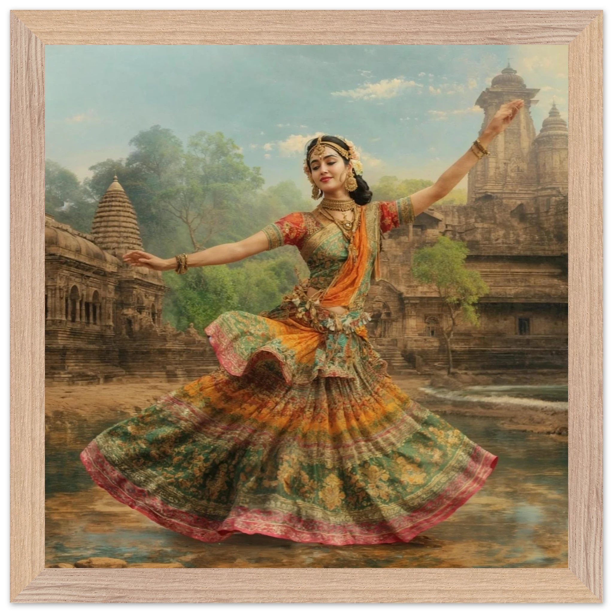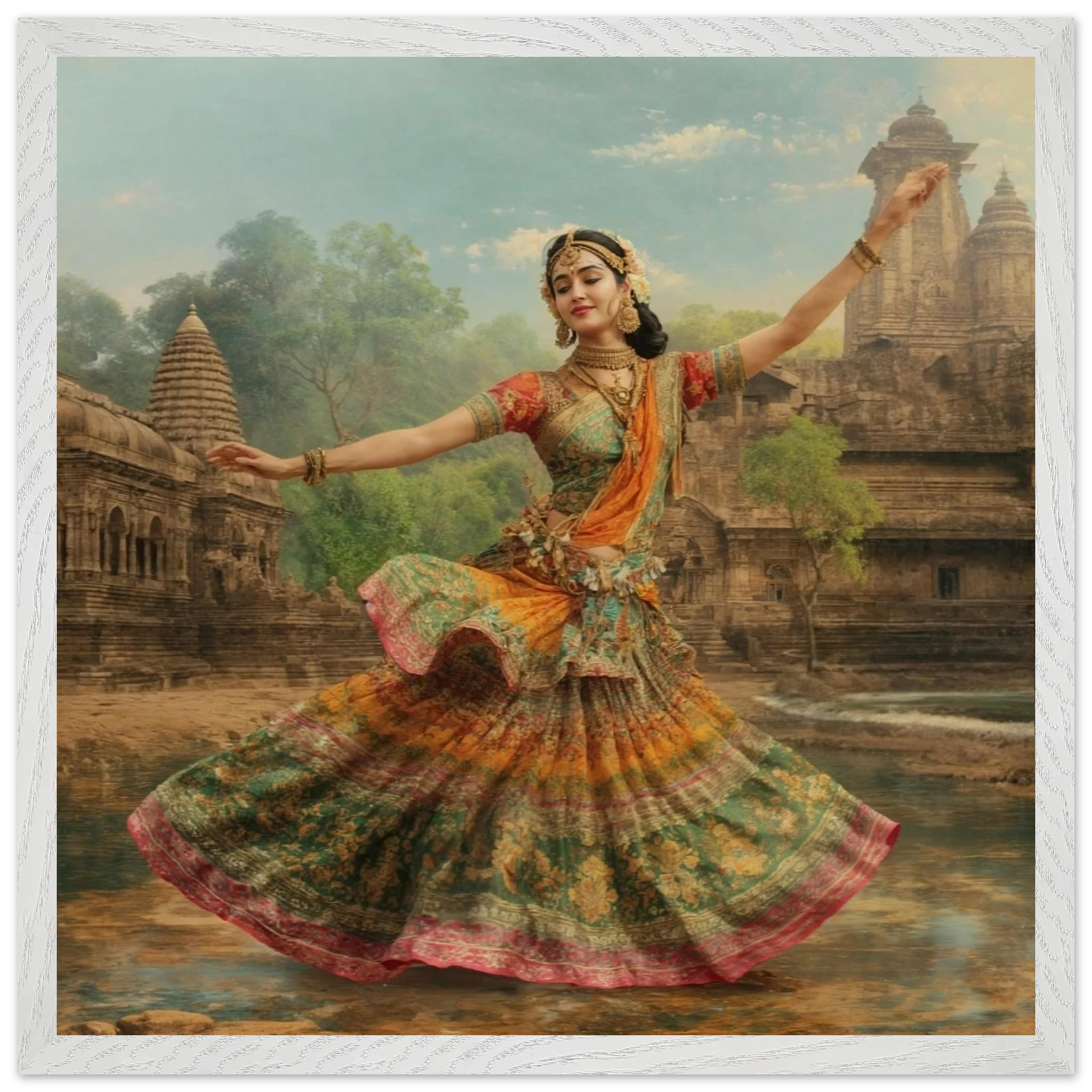 This vibrant art print captures a graceful Indian dancer in a dynamic pose, adorned in a colourful, flowing dress and ornate jewellery. Set against a serene temple and lush greenery, the painting, with its serene expression and intricate details, beautifully conveys a sense of cultural and ethereal beauty. Perfect for art lovers of Indian traditional dance.Â