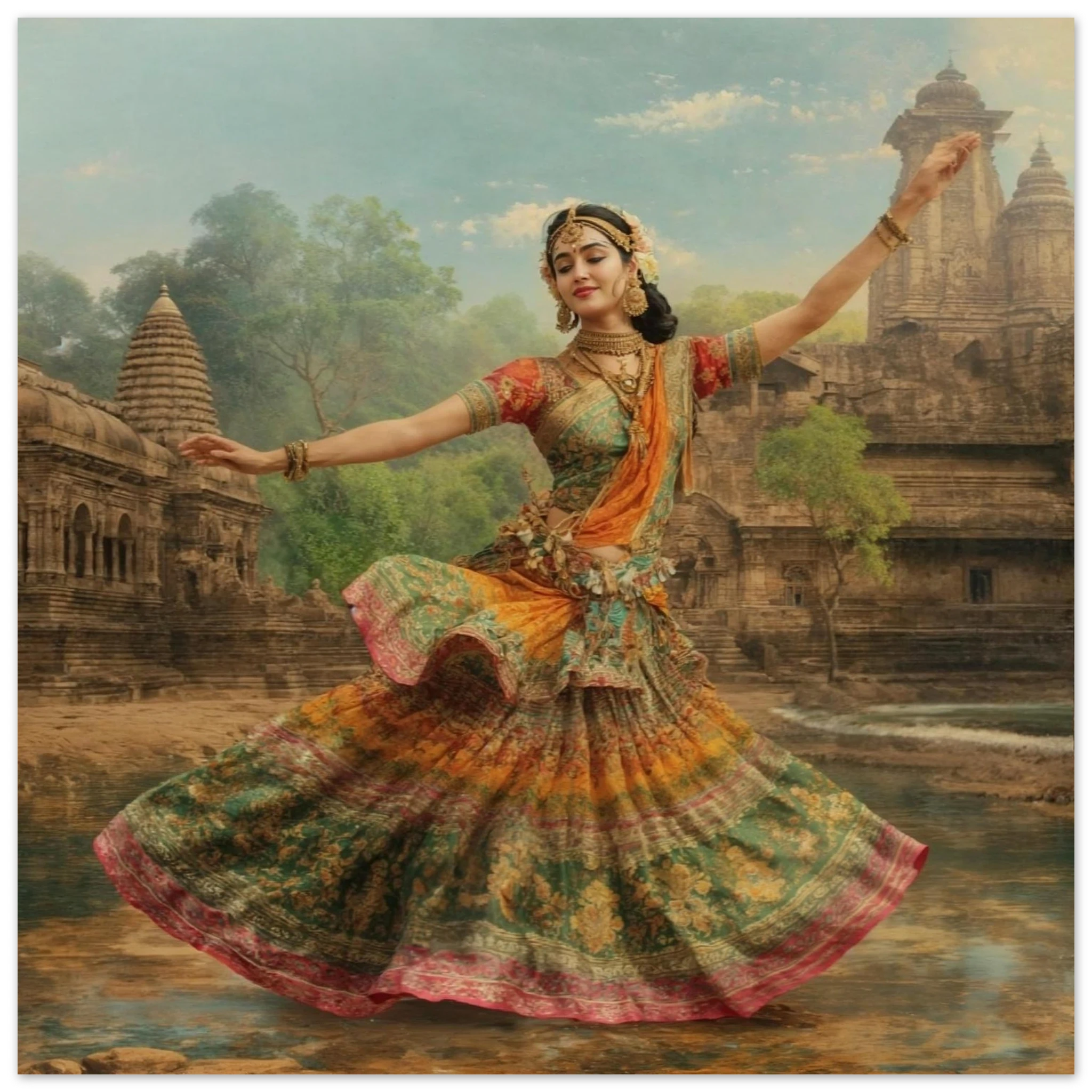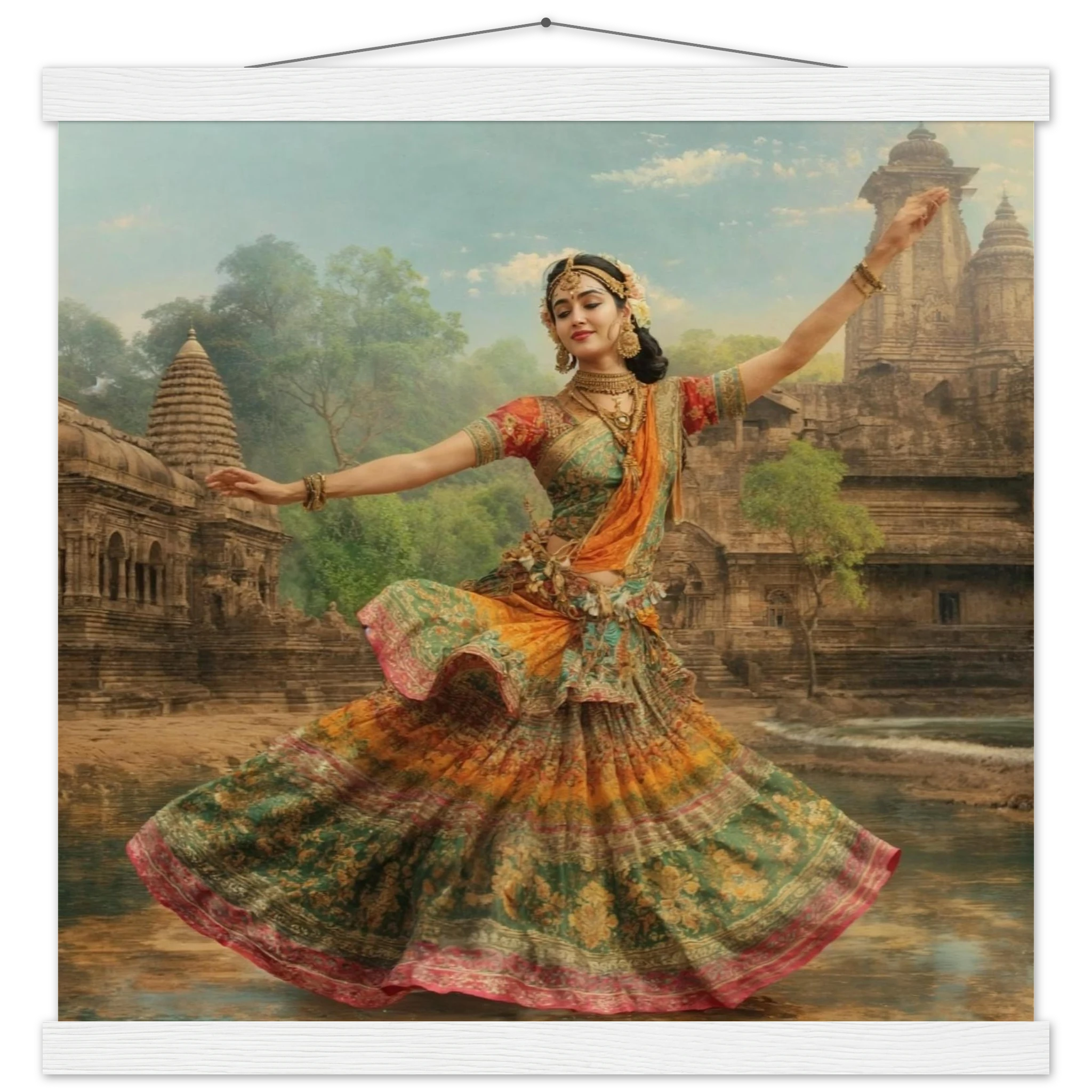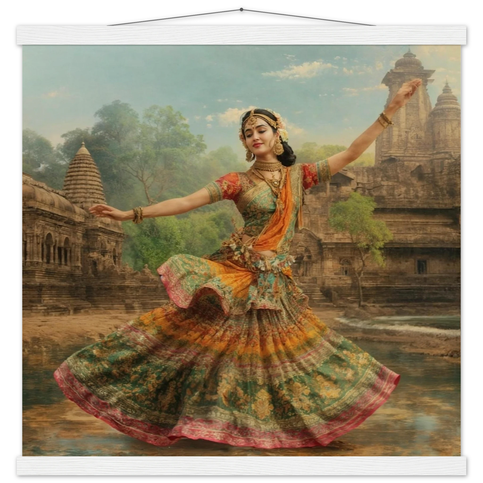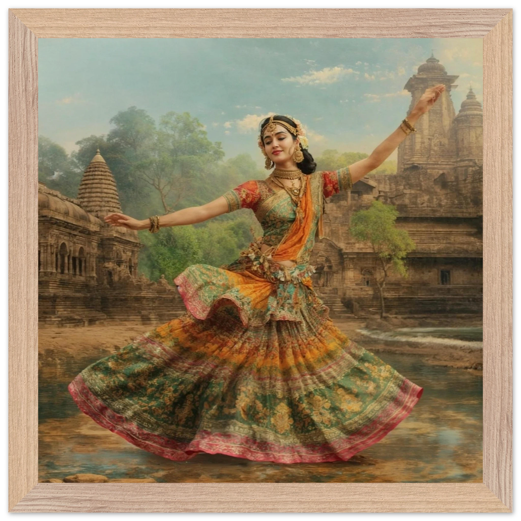 This vibrant art print captures a graceful Indian dancer in a dynamic pose, adorned in a colourful, flowing dress and ornate jewellery. Set against a serene temple and lush greenery, the painting, with its serene expression and intricate details, beautifully conveys a sense of cultural and ethereal beauty. Perfect for art lovers of Indian traditional dance.Â
