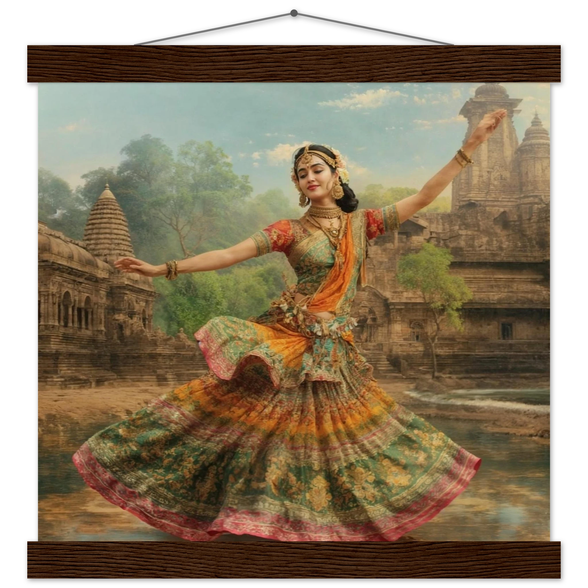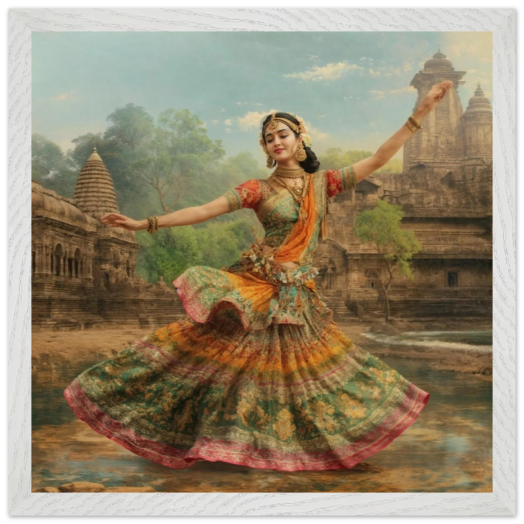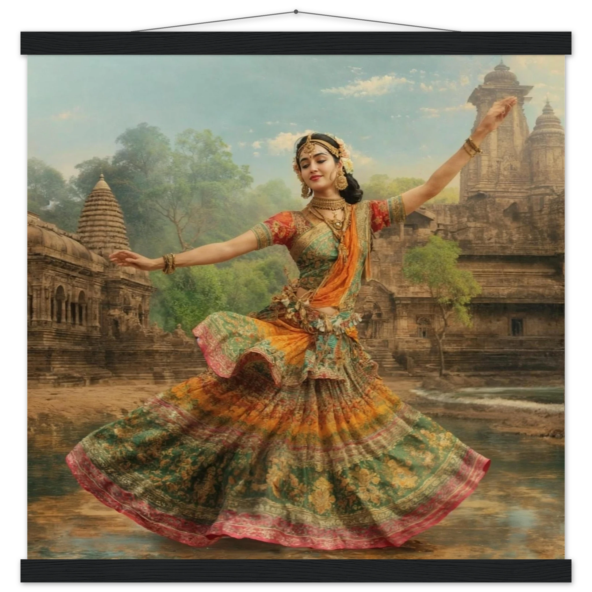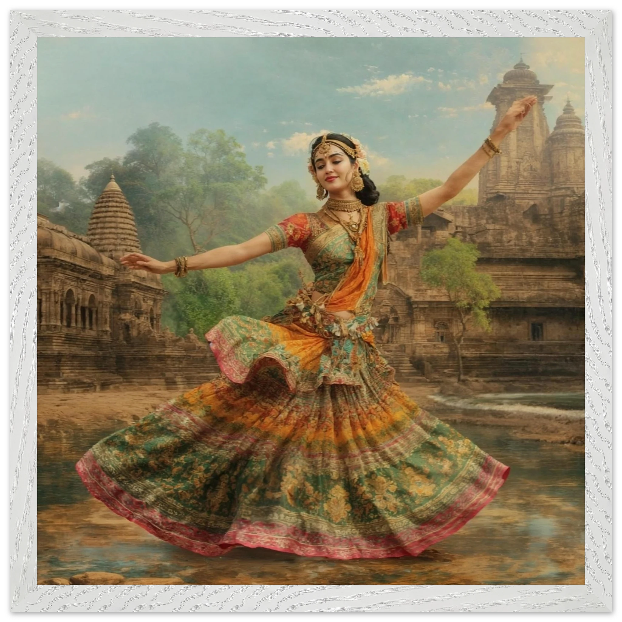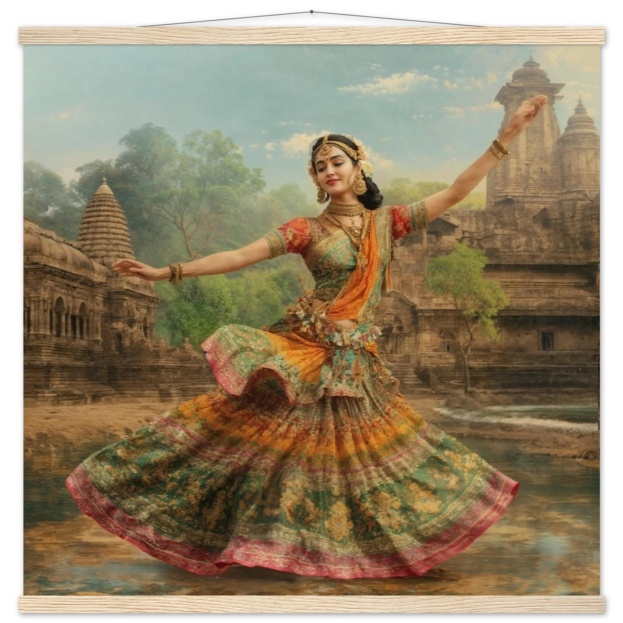 This vibrant art print captures a graceful Indian dancer in a dynamic pose, adorned in a colourful, flowing dress and ornate jewellery. Set against a serene temple and lush greenery, the painting, with its serene expression and intricate details, beautifully conveys a sense of cultural and ethereal beauty. Perfect for art lovers of Indian traditional dance.Â