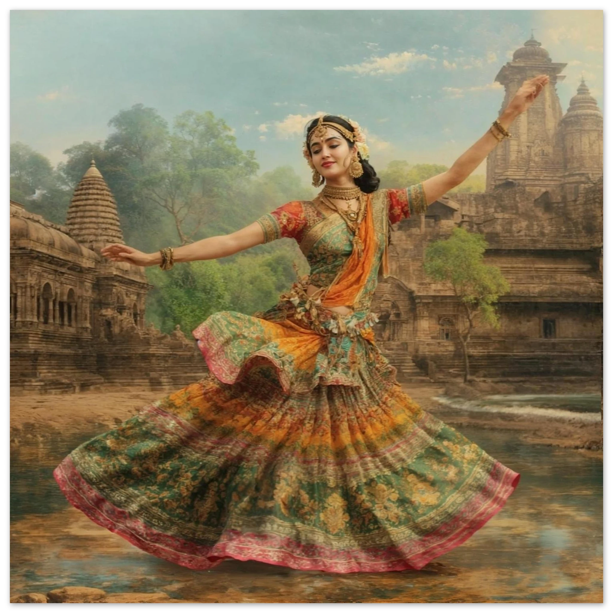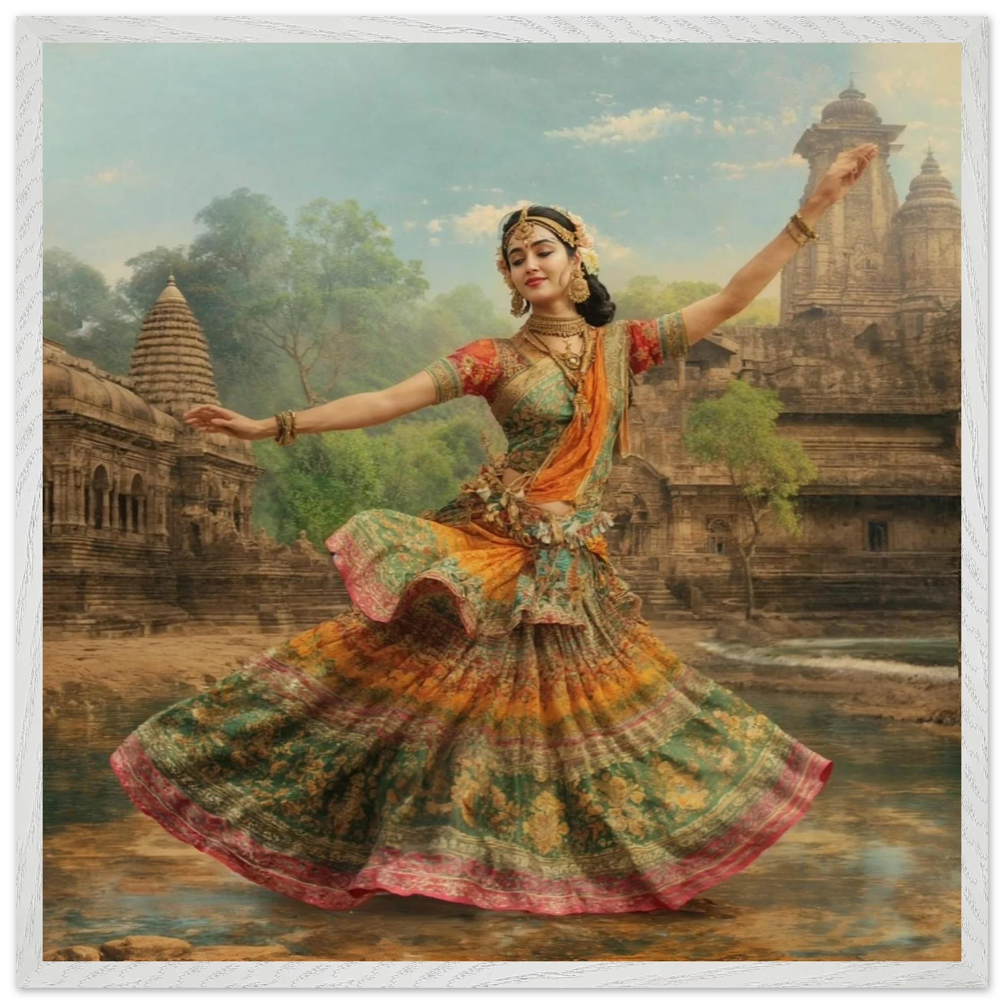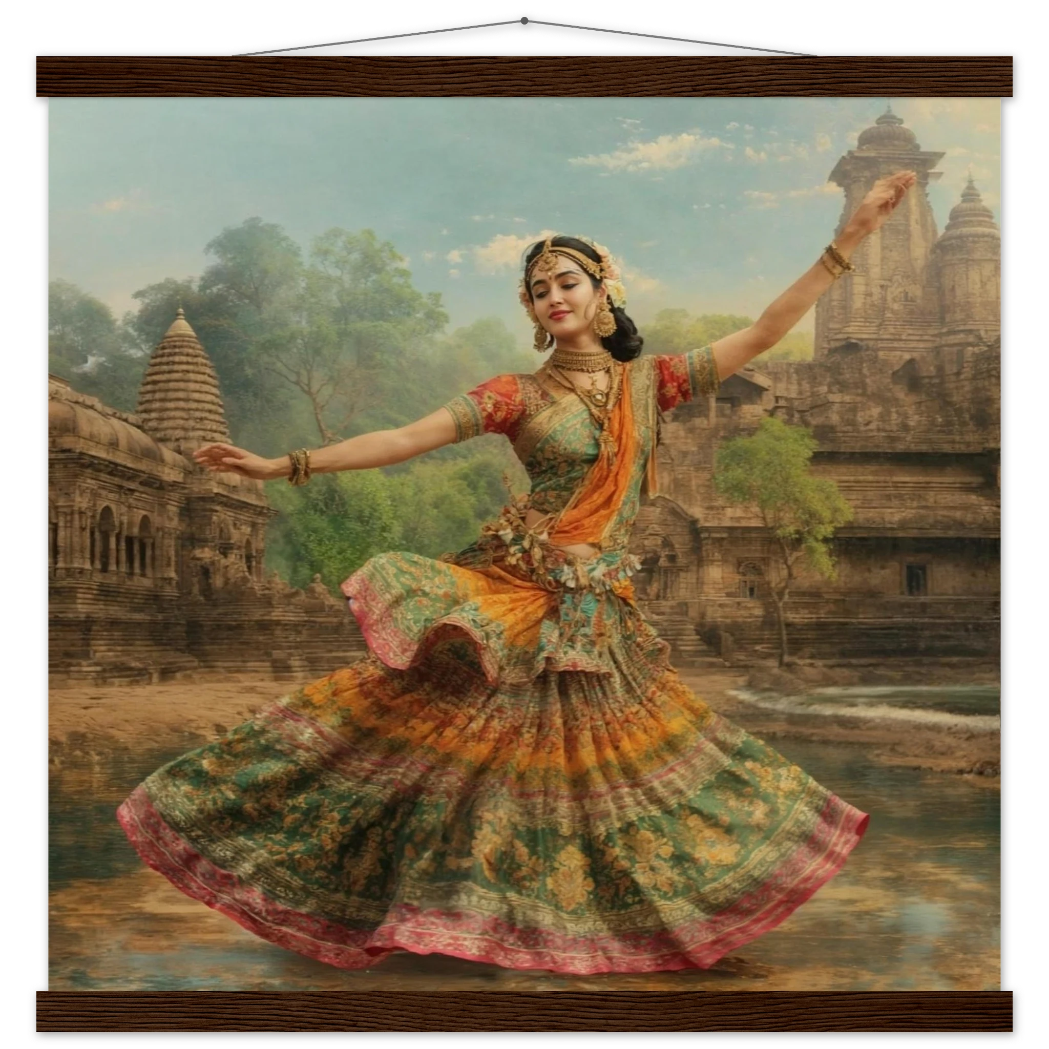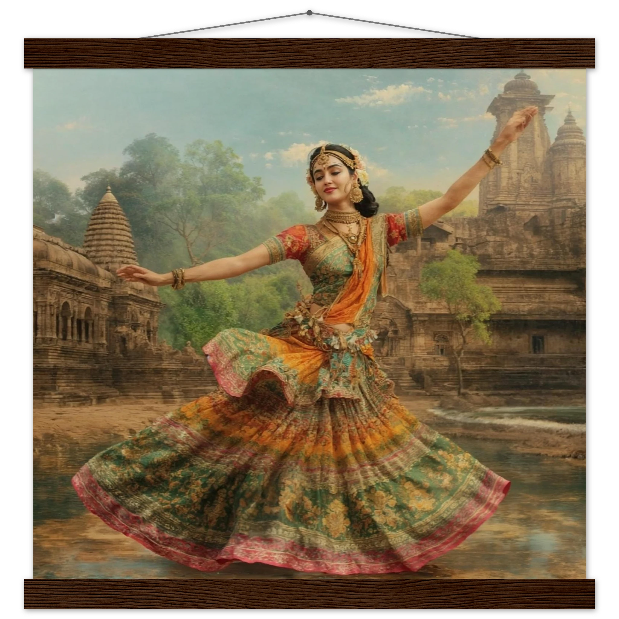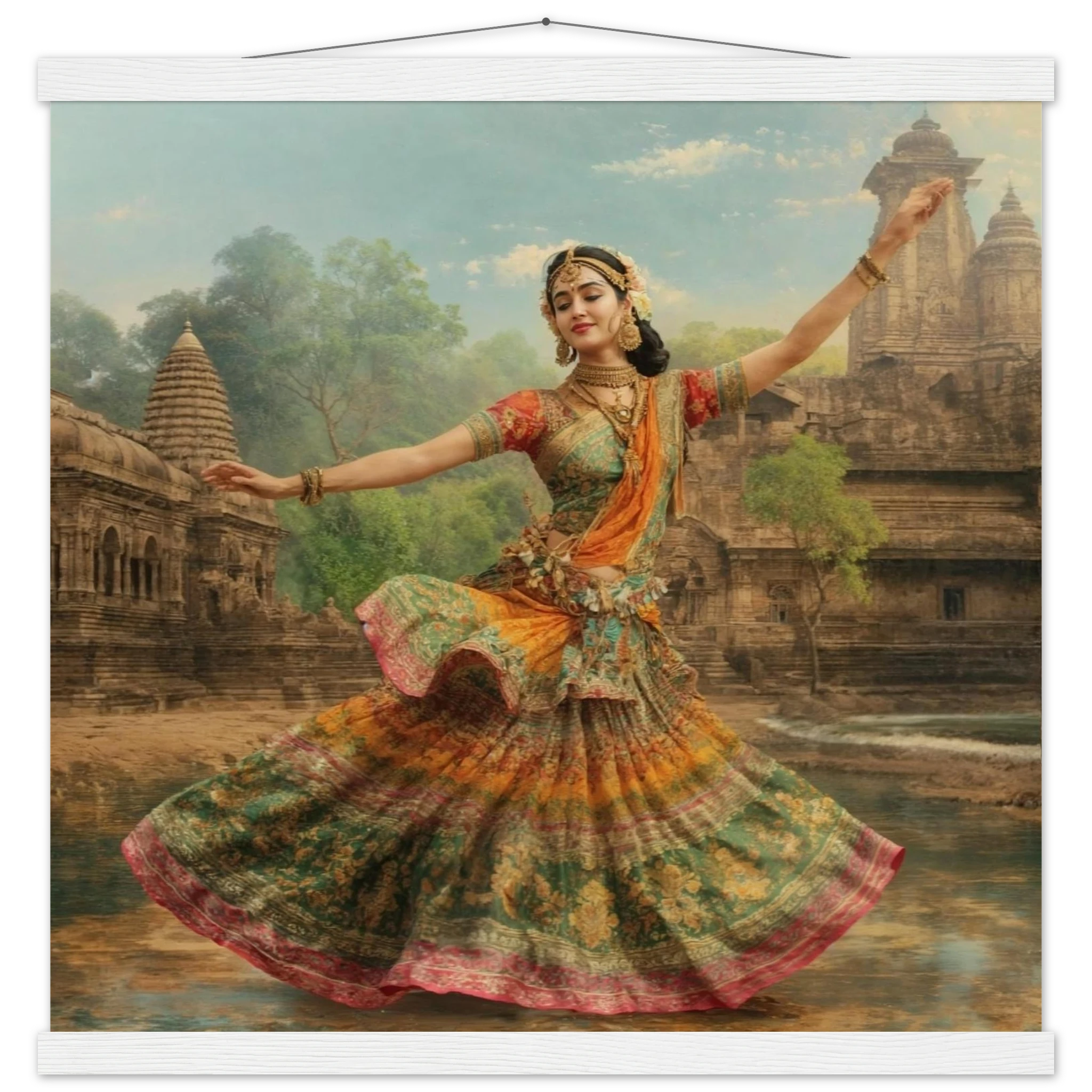 This vibrant art print captures a graceful Indian dancer in a dynamic pose, adorned in a colourful, flowing dress and ornate jewellery. Set against a serene temple and lush greenery, the painting, with its serene expression and intricate details, beautifully conveys a sense of cultural and ethereal beauty. Perfect for art lovers of Indian traditional dance.Â