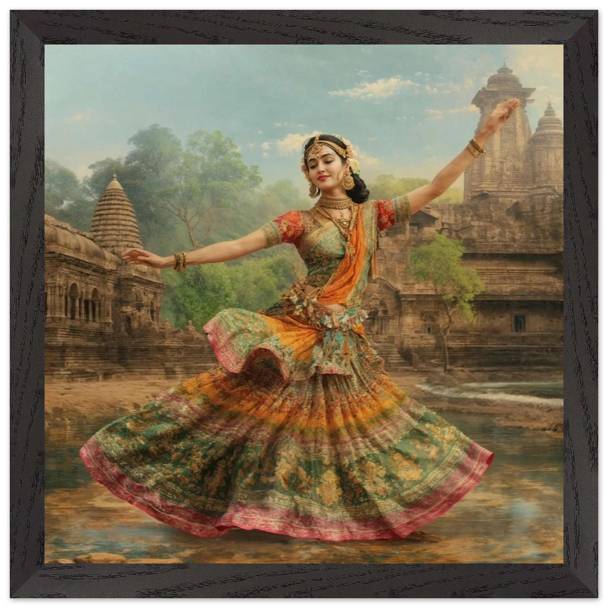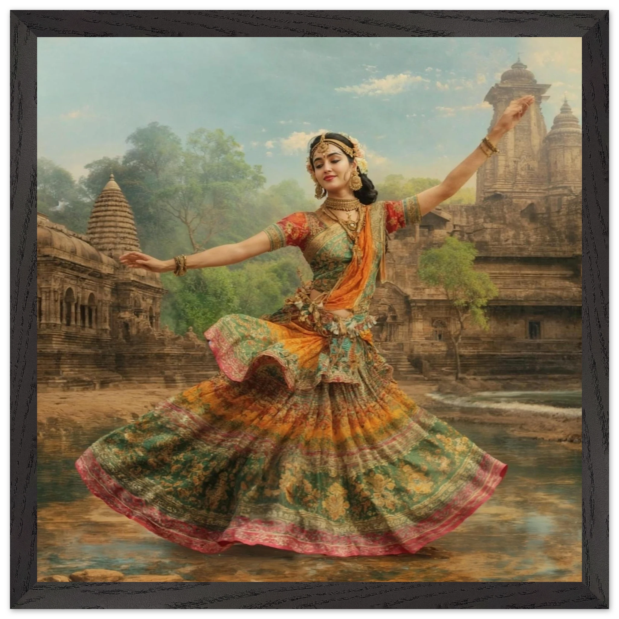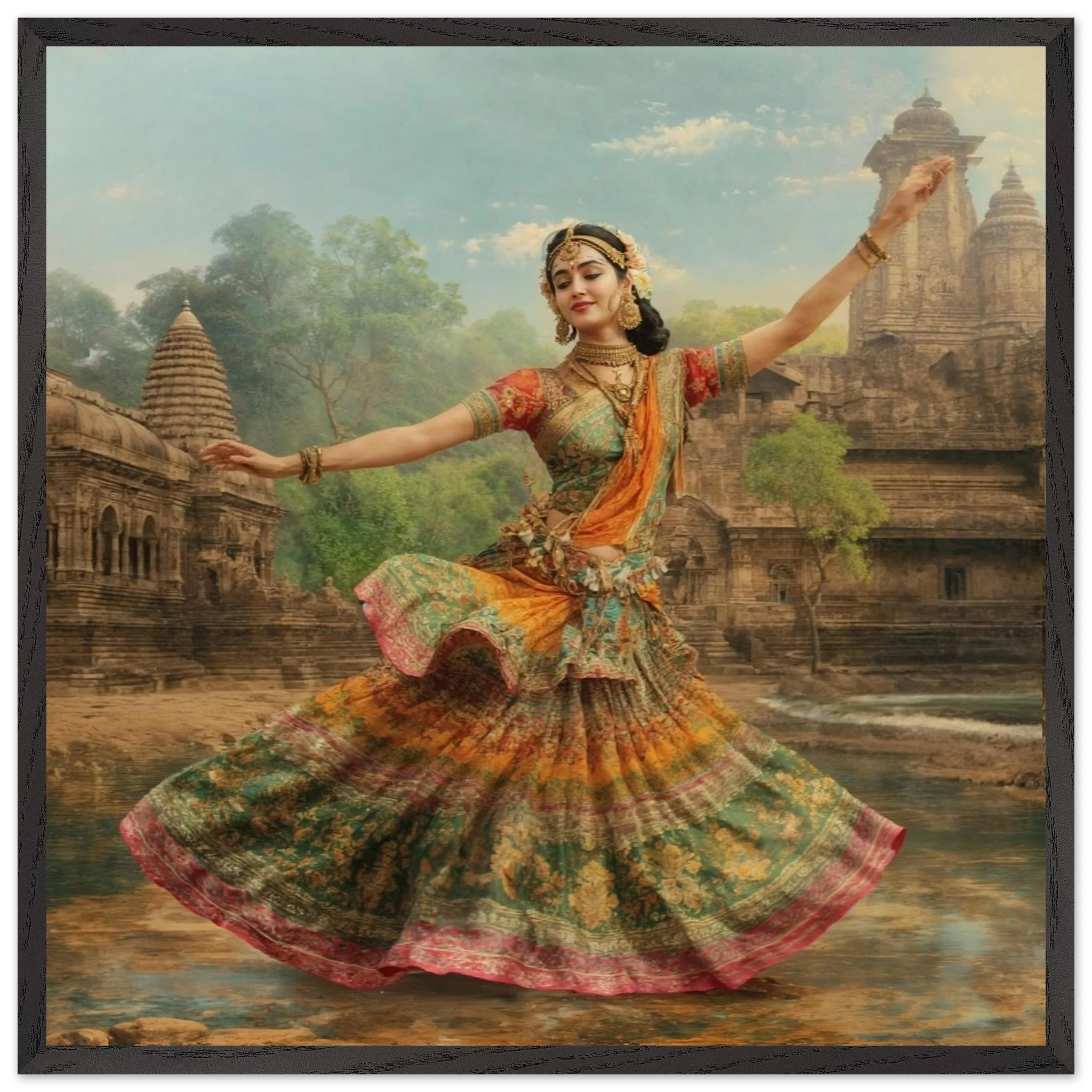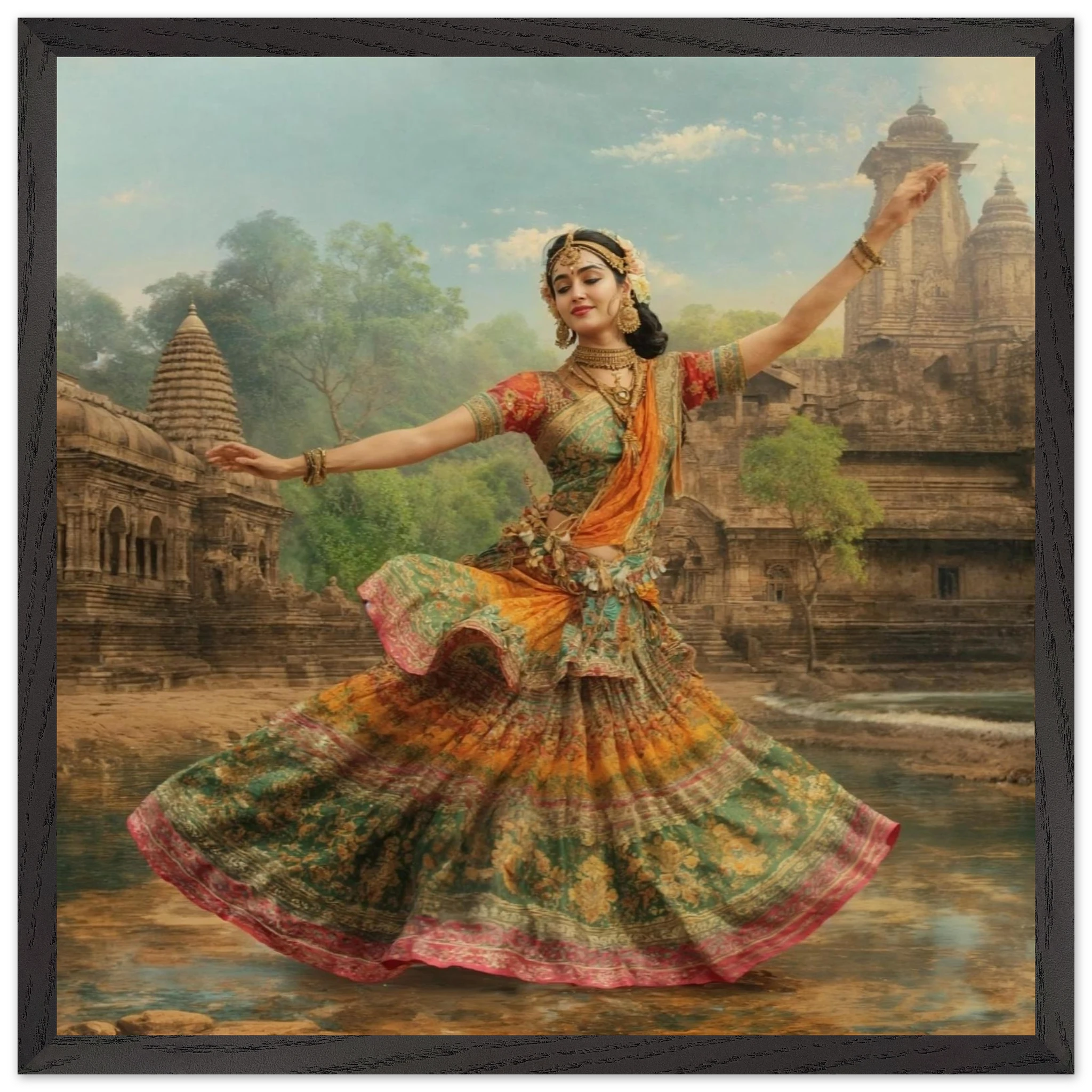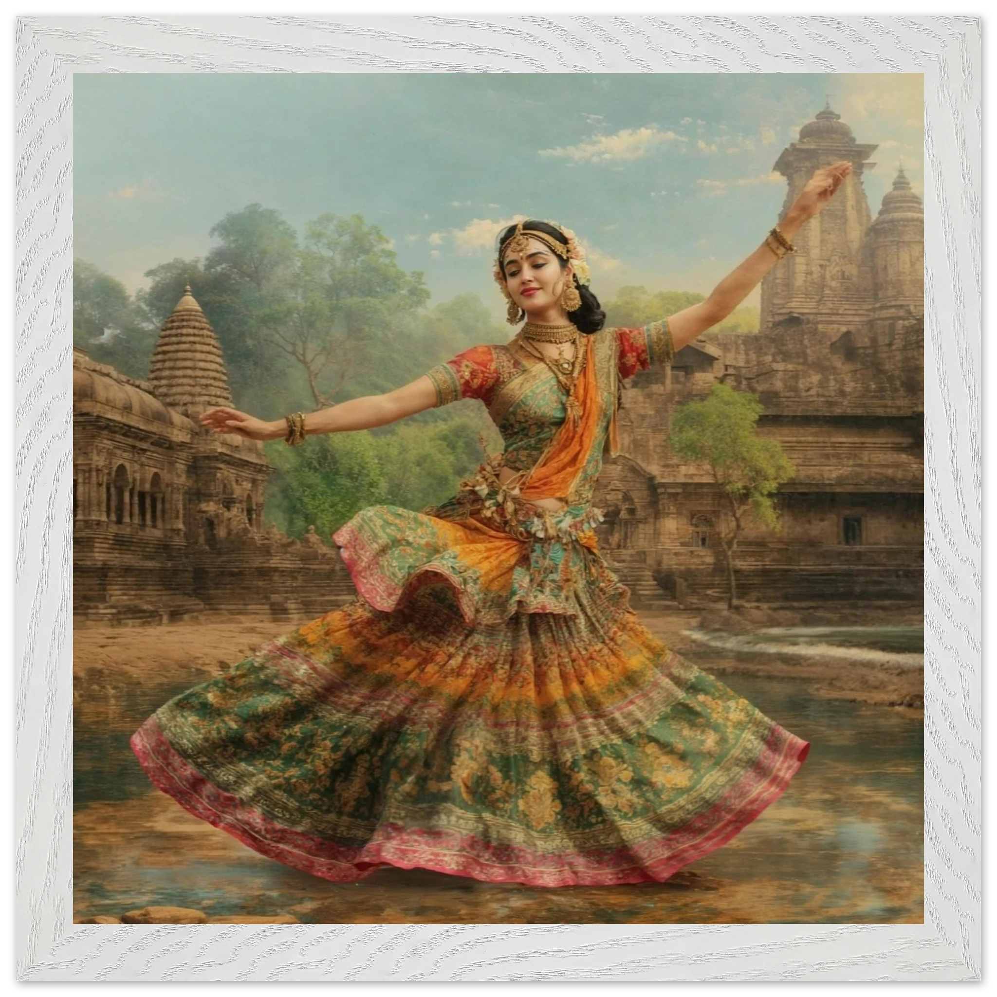 This vibrant art print captures a graceful Indian dancer in a dynamic pose, adorned in a colourful, flowing dress and ornate jewellery. Set against a serene temple and lush greenery, the painting, with its serene expression and intricate details, beautifully conveys a sense of cultural and ethereal beauty. Perfect for art lovers of Indian traditional dance.Â