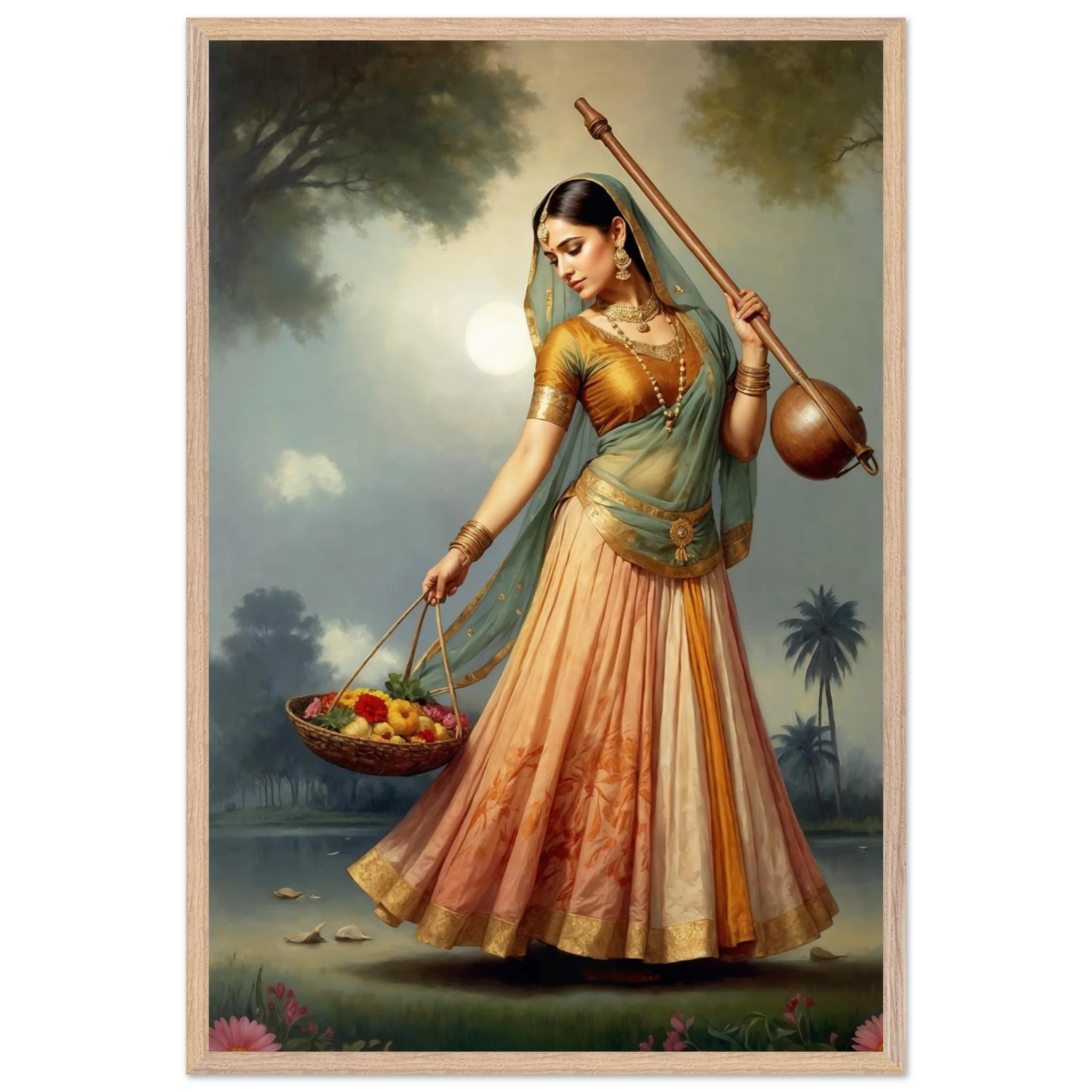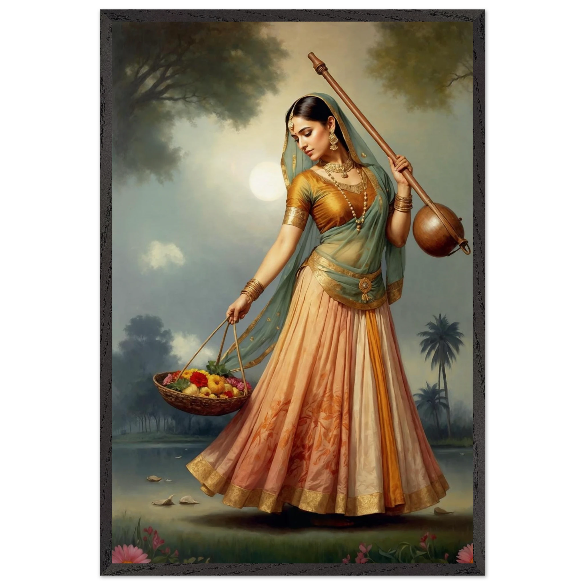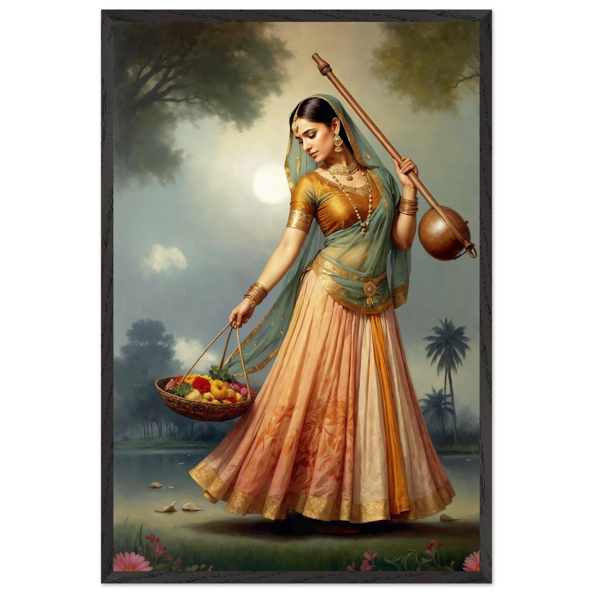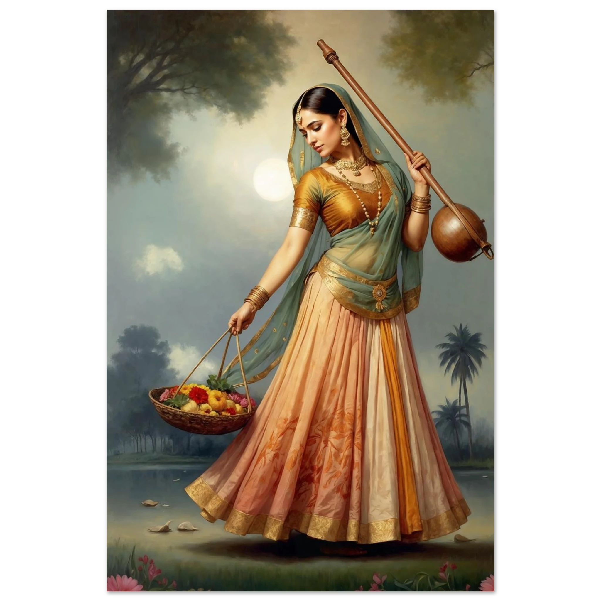 Graceful Indian woman in traditional dress with a musical instrument and flowers, bathed in the soft glow of morning. A serene art print for timeless beauty in your space. Available in Poster, Framed Poster and Poster with hanger.