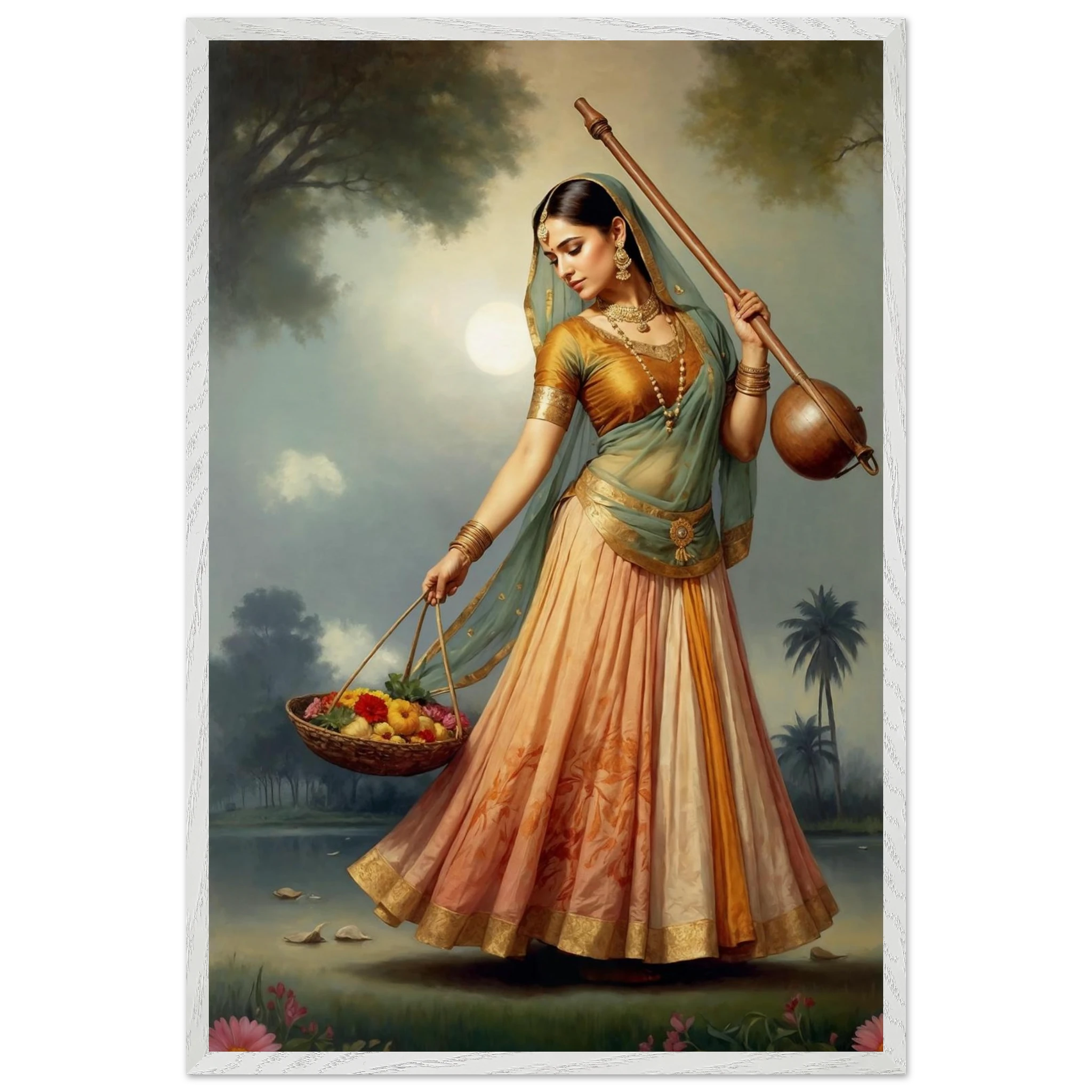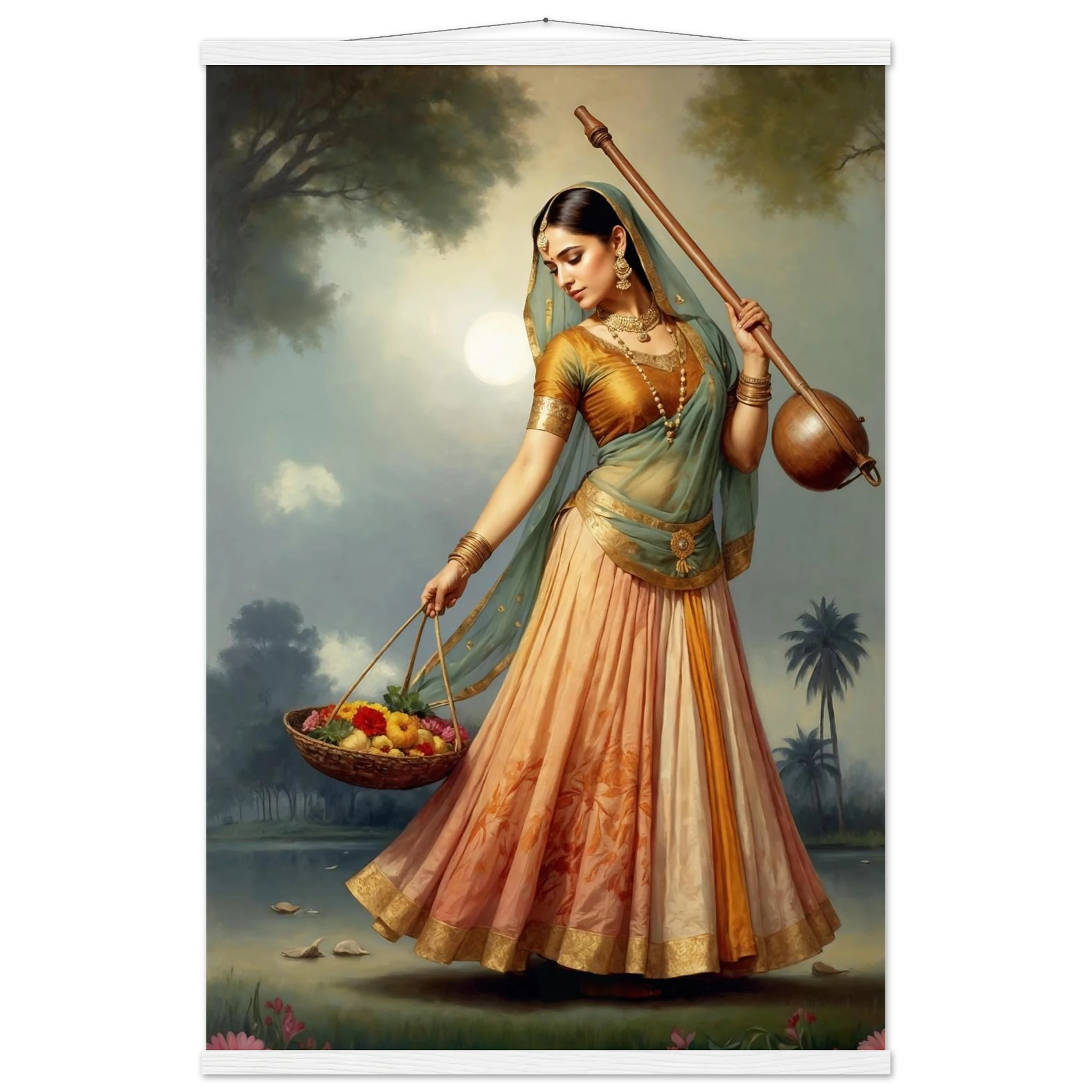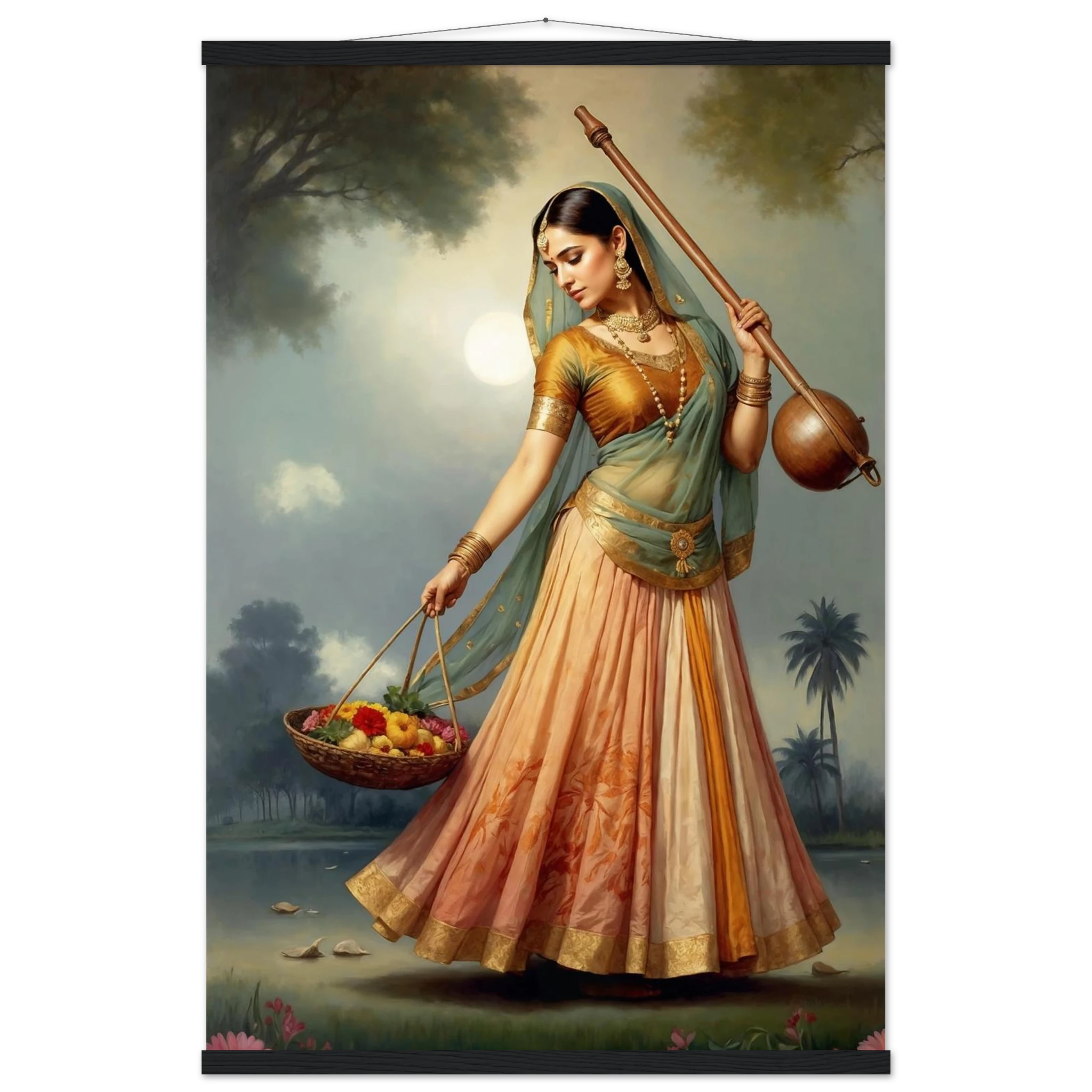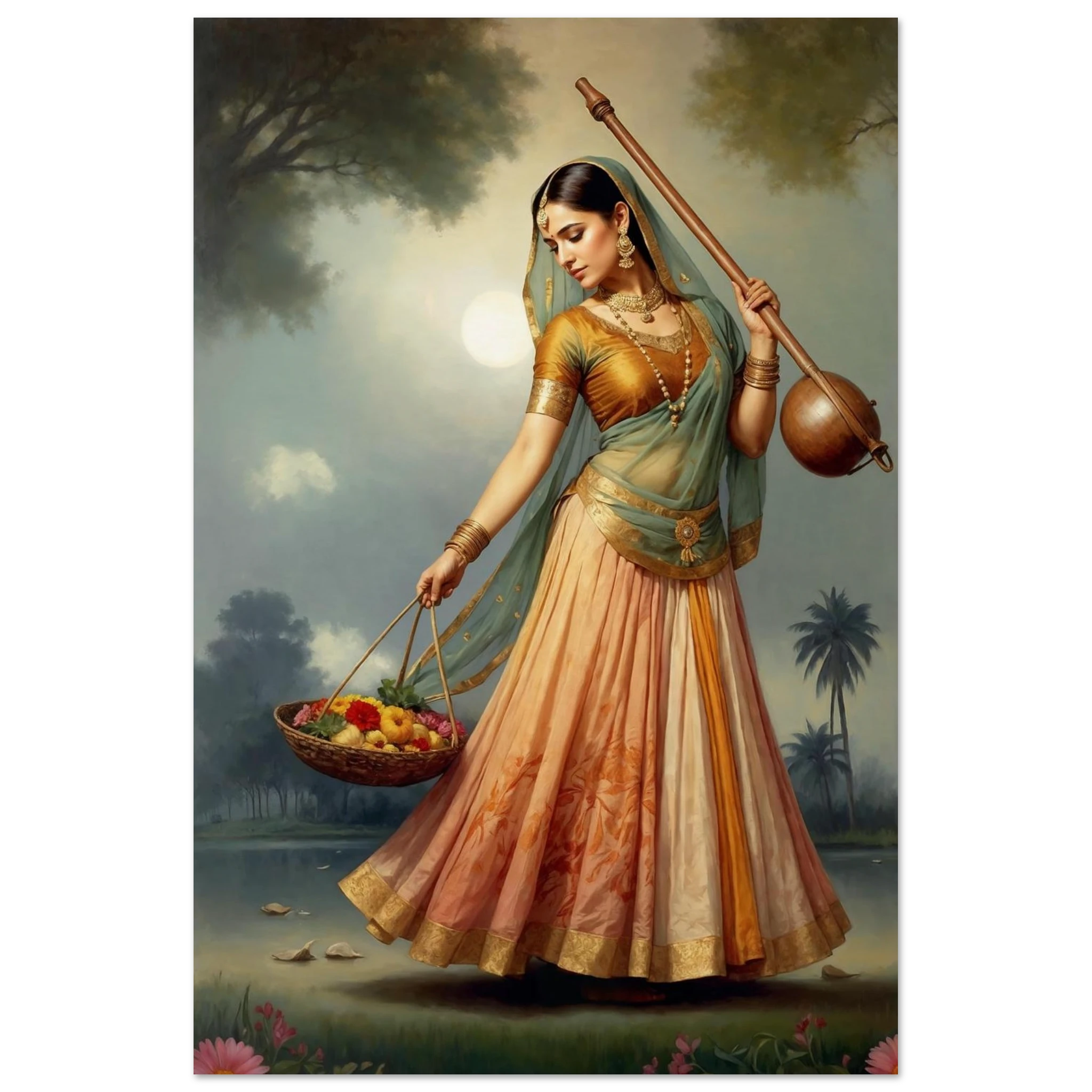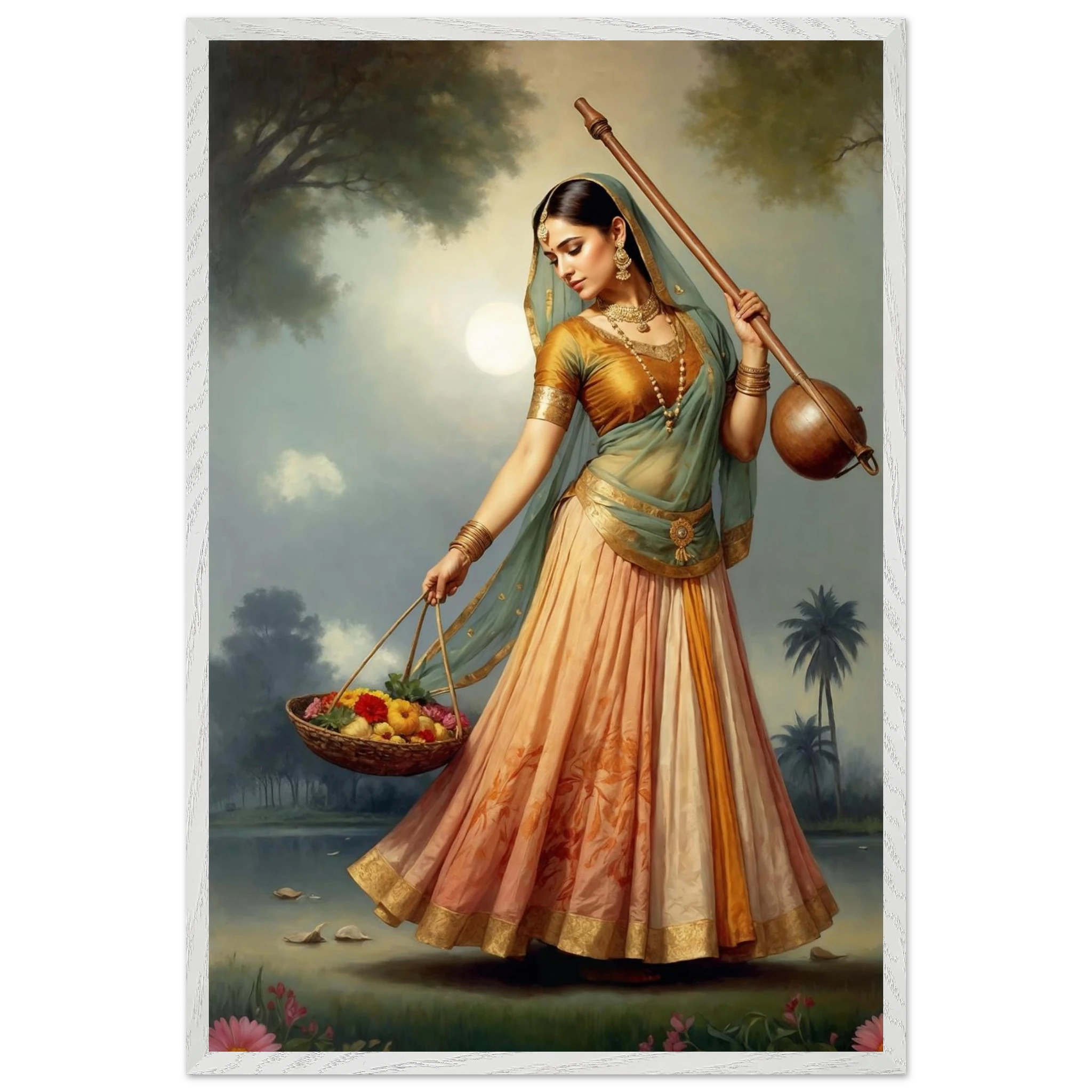 Graceful Indian woman in traditional dress with a musical instrument and flowers, bathed in the soft glow of morning. A serene art print for timeless beauty in your space. Available in Poster, Framed Poster and Poster with hanger.