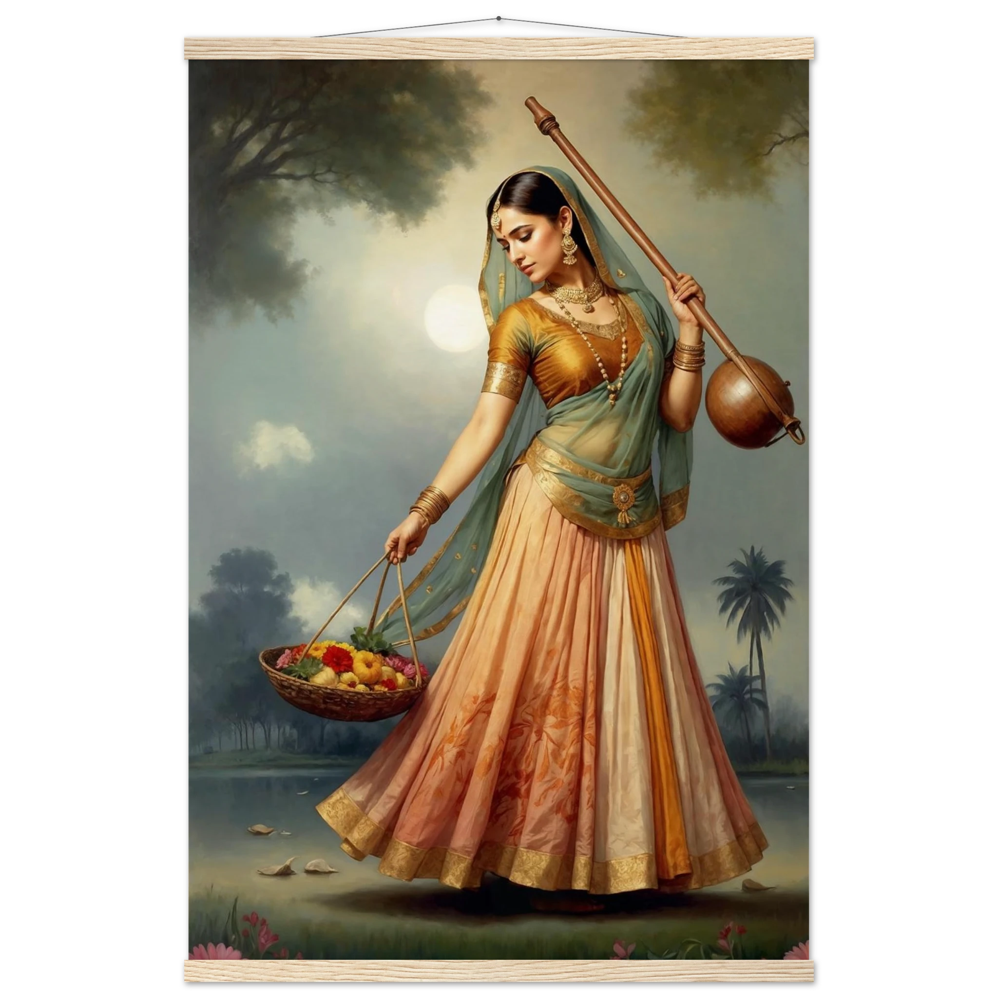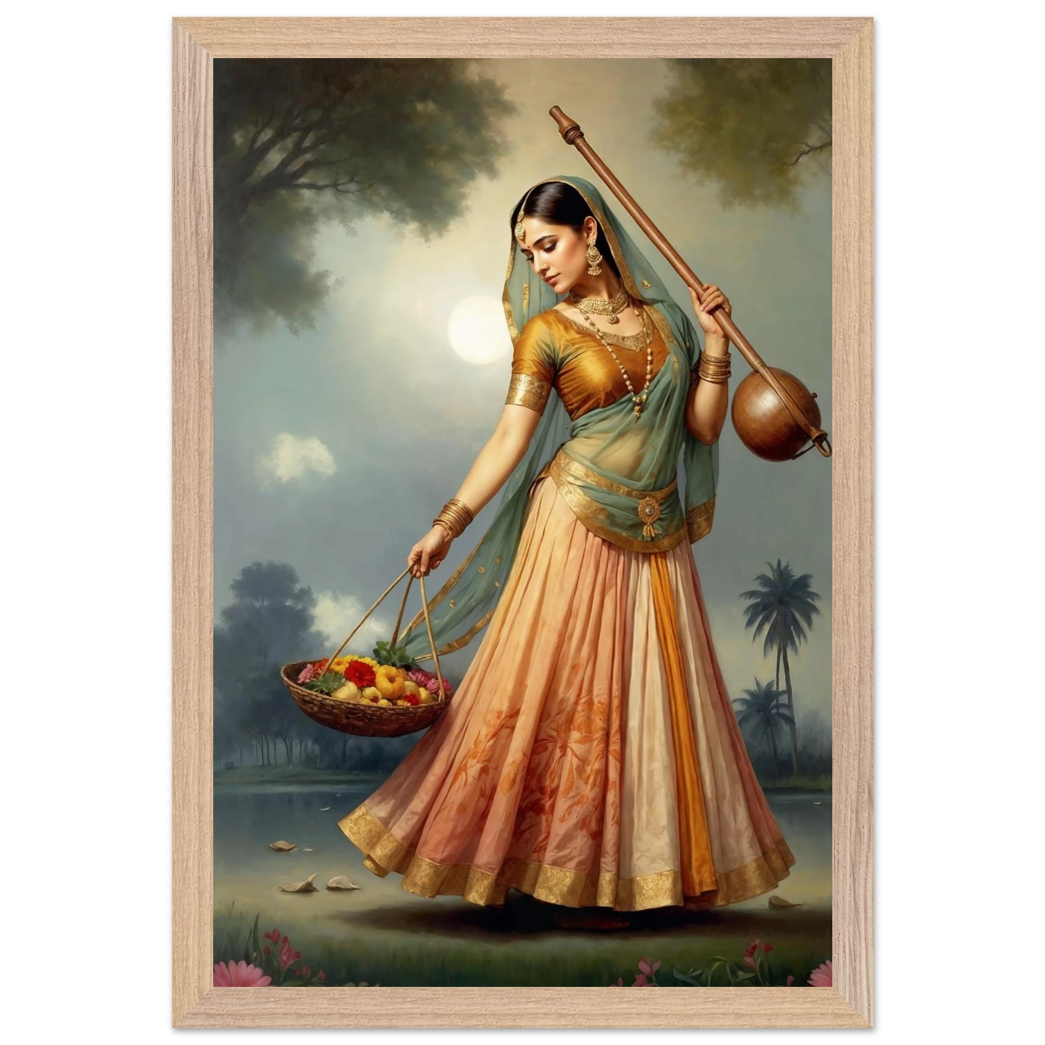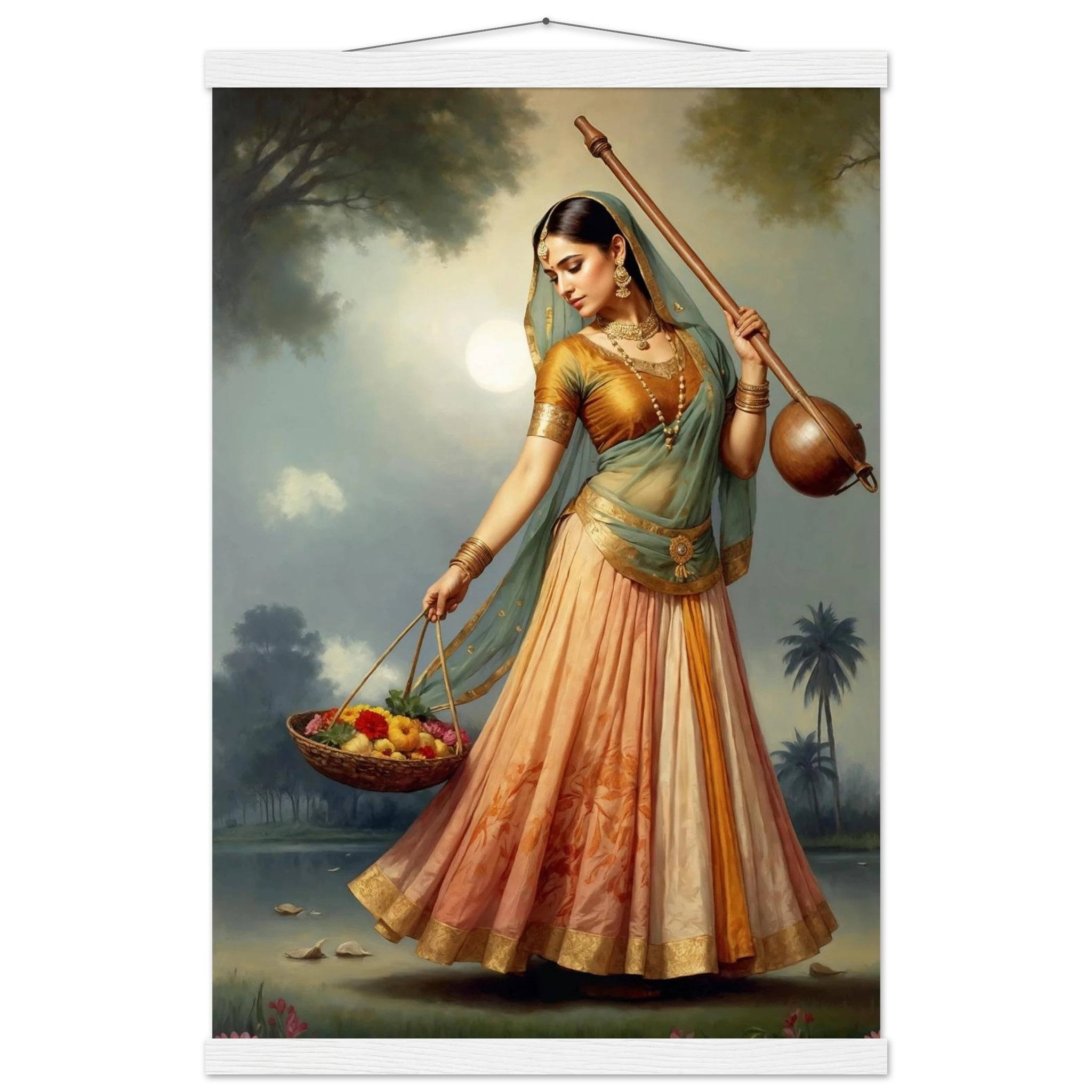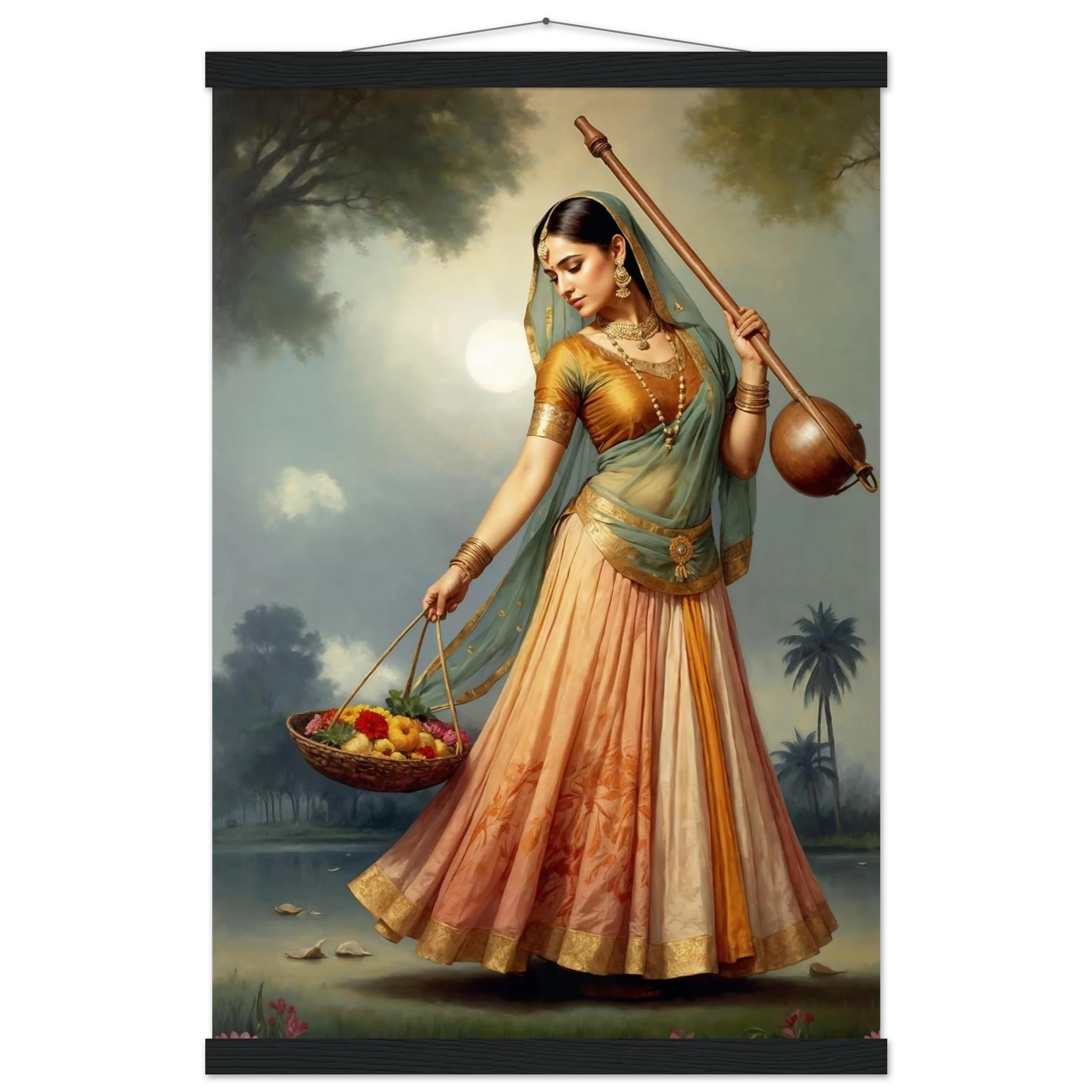 Graceful Indian woman in traditional dress with a musical instrument and flowers, bathed in the soft glow of morning. A serene art print for timeless beauty in your space. Available in Poster, Framed Poster and Poster with hanger.