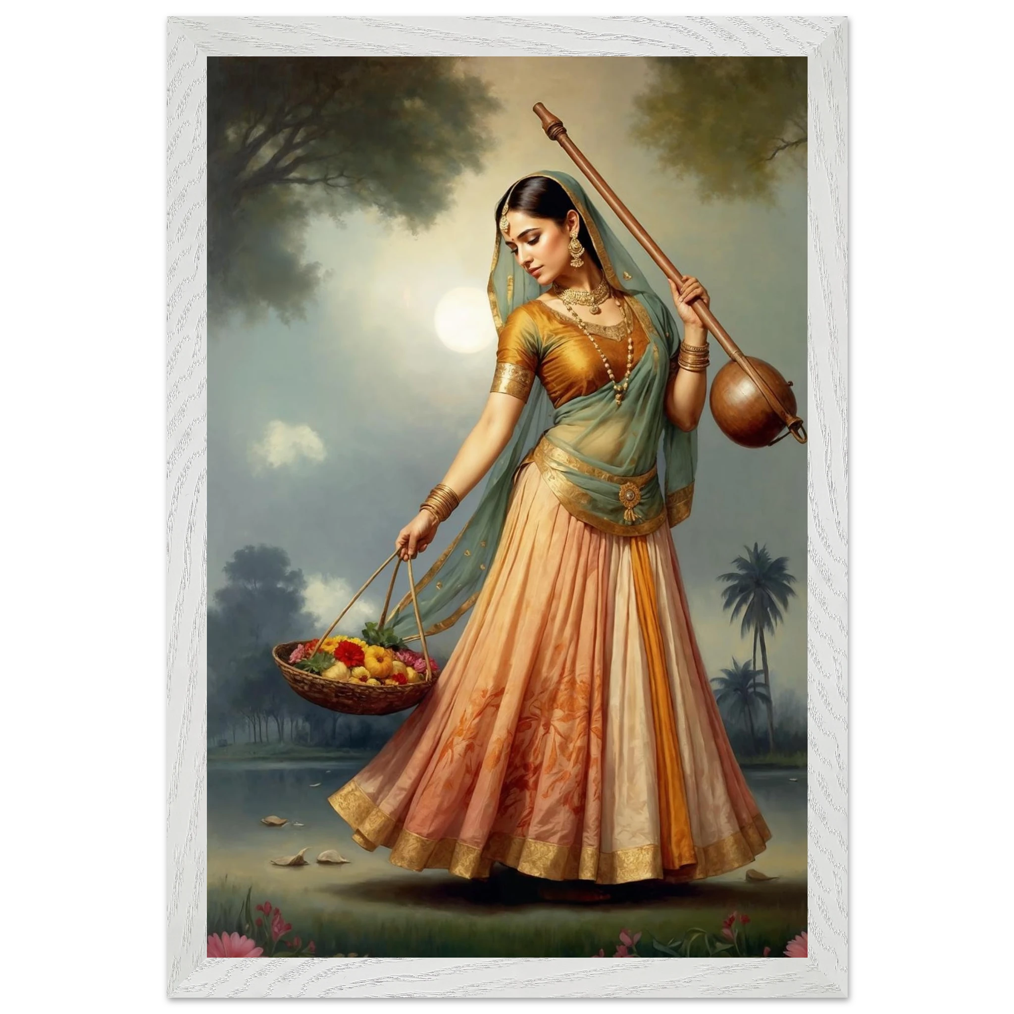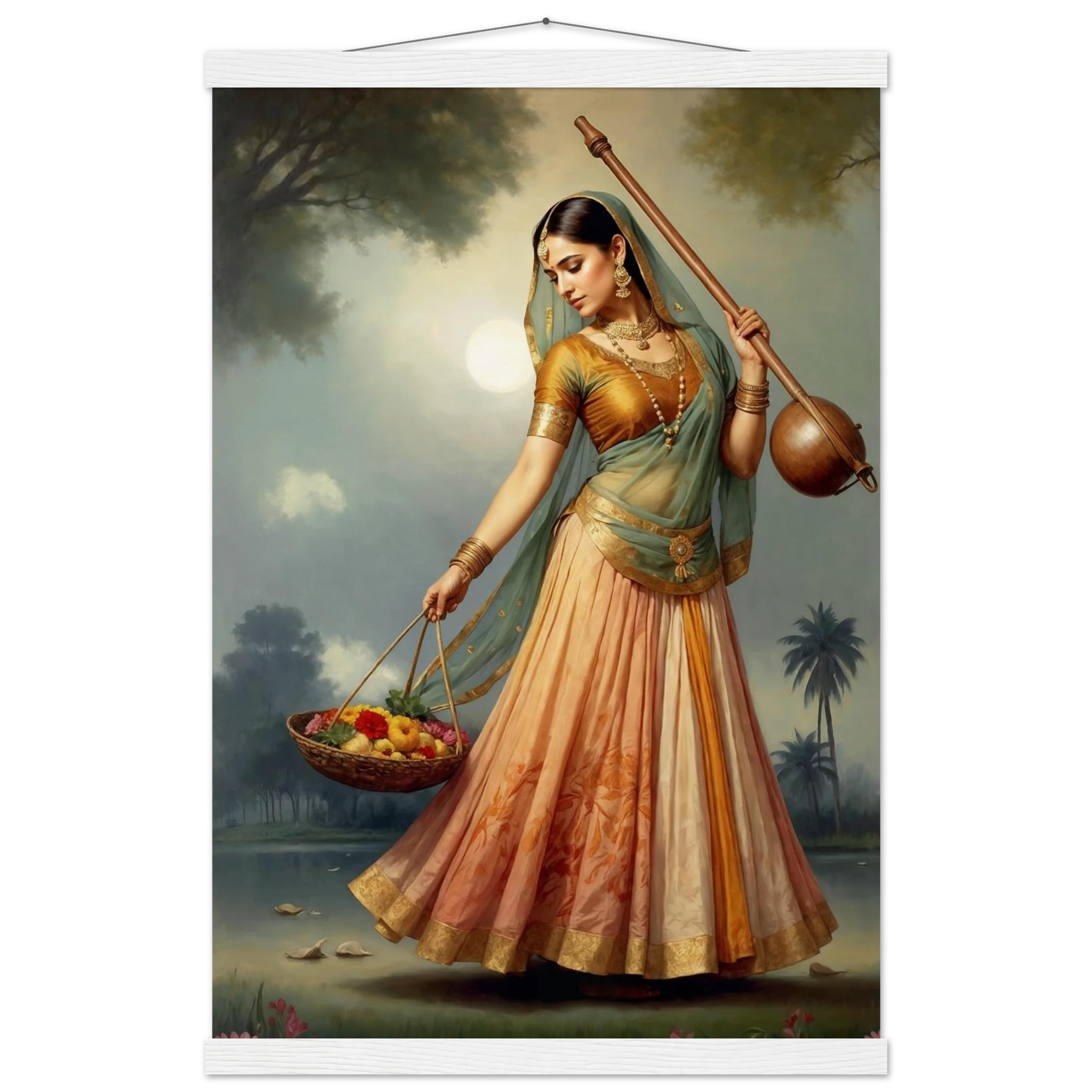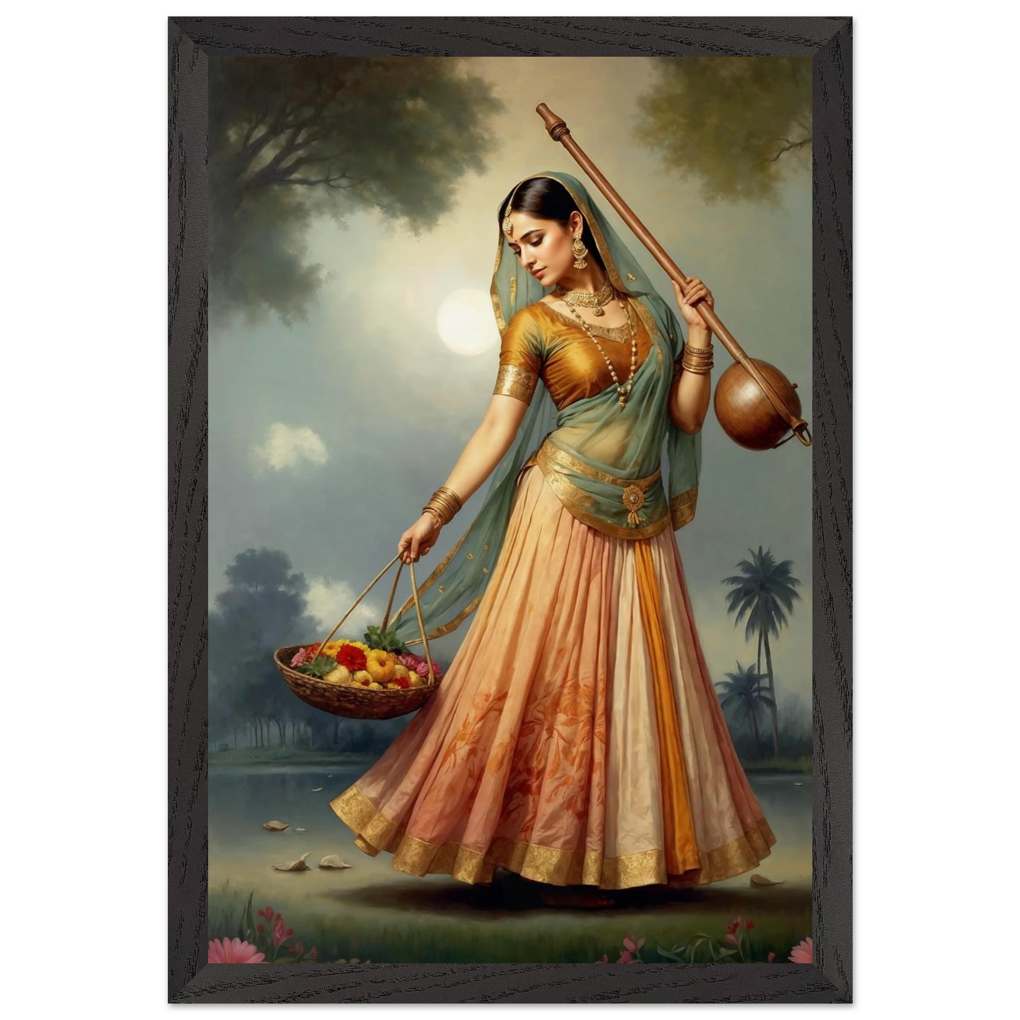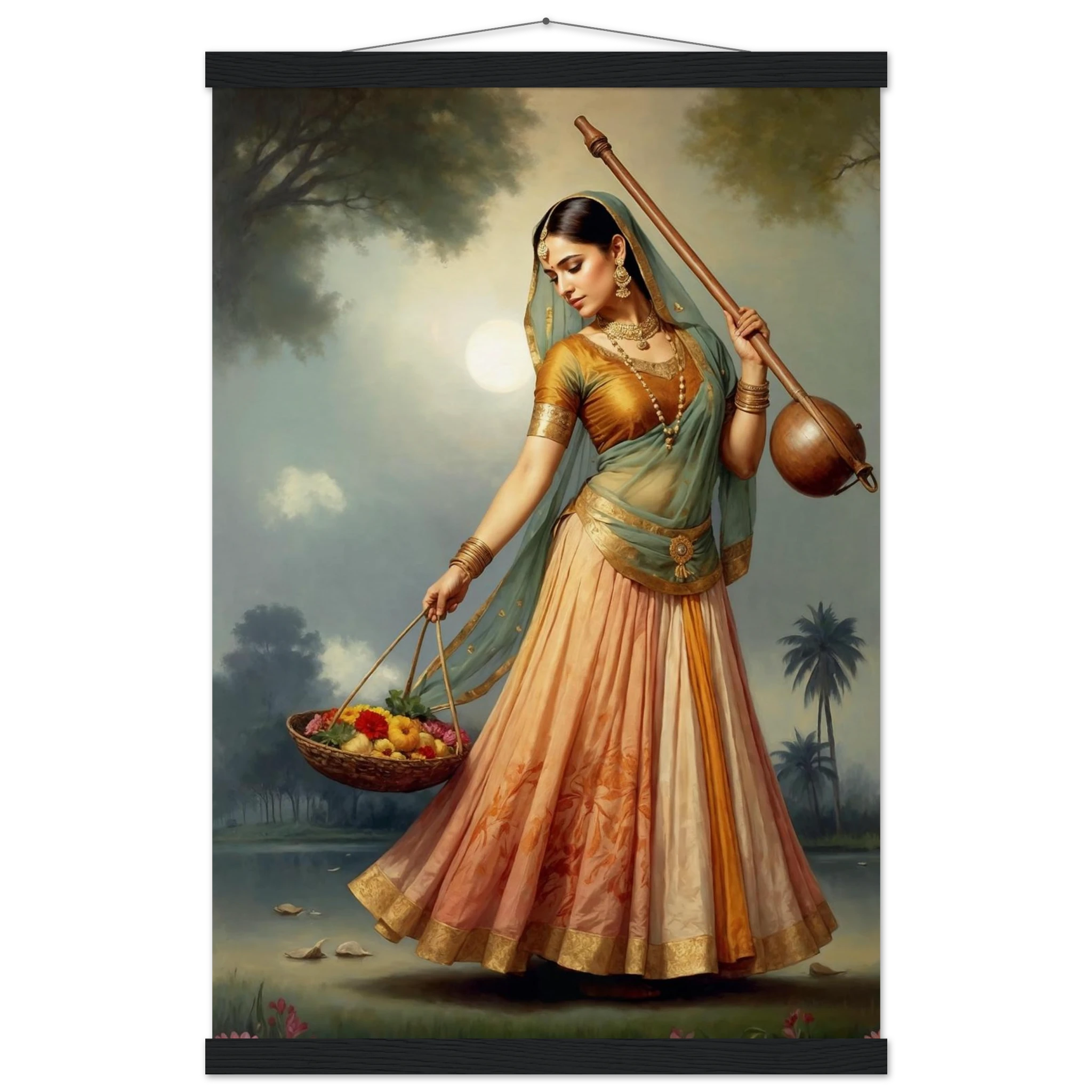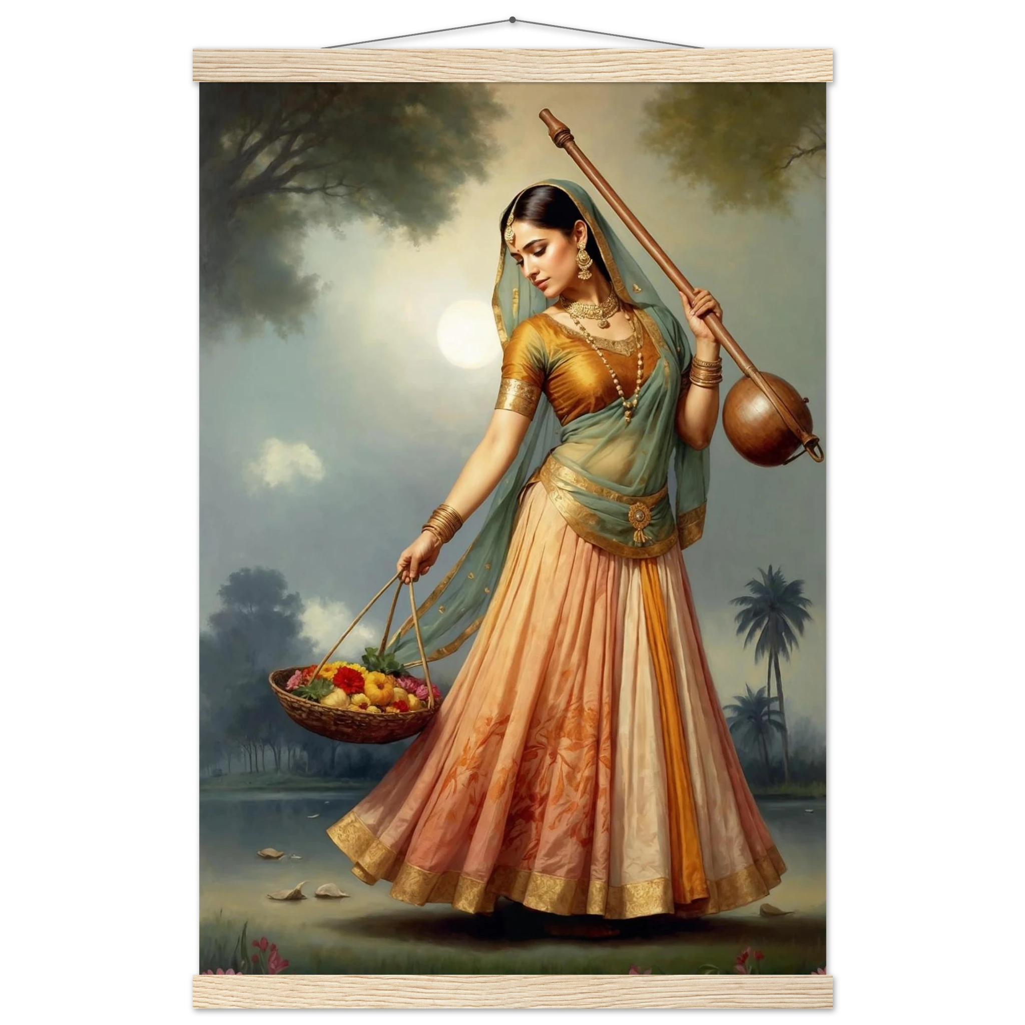 Graceful Indian woman in traditional dress with a musical instrument and flowers, bathed in the soft glow of morning. A serene art print for timeless beauty in your space. Available in Poster, Framed Poster and Poster with hanger.