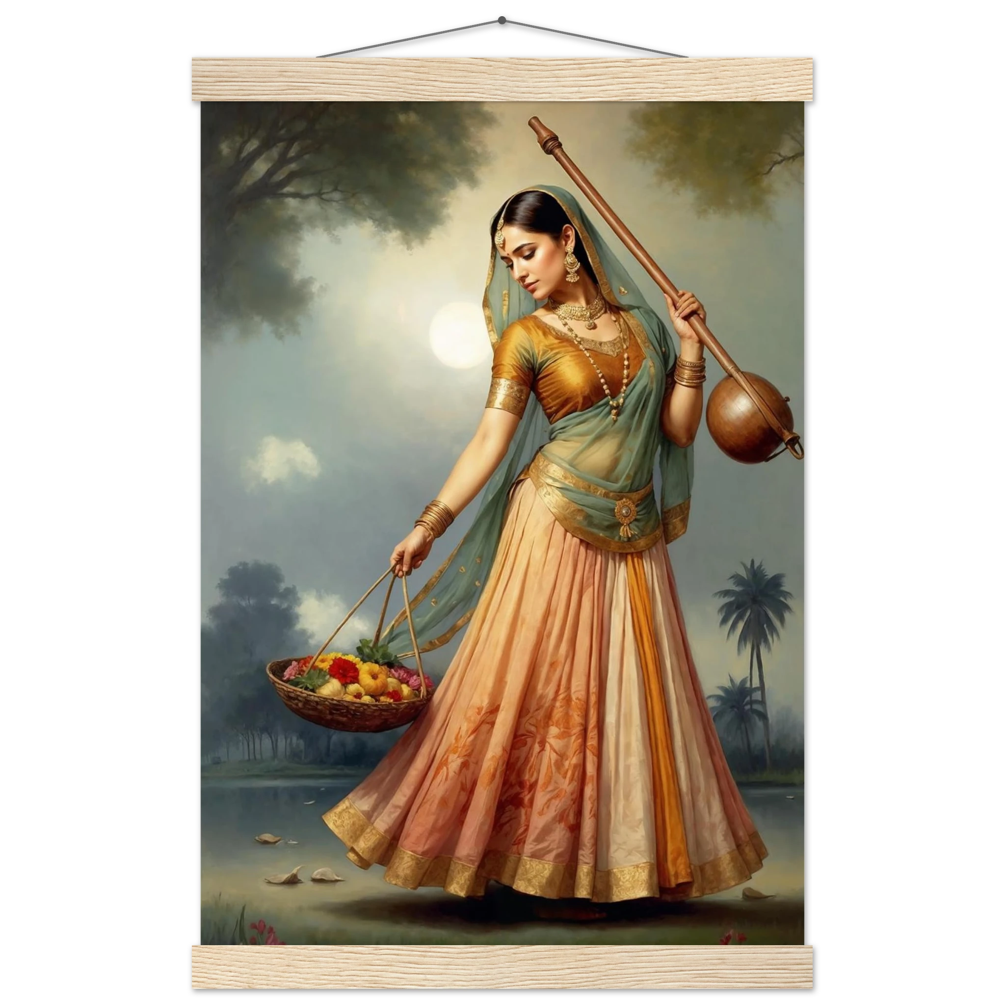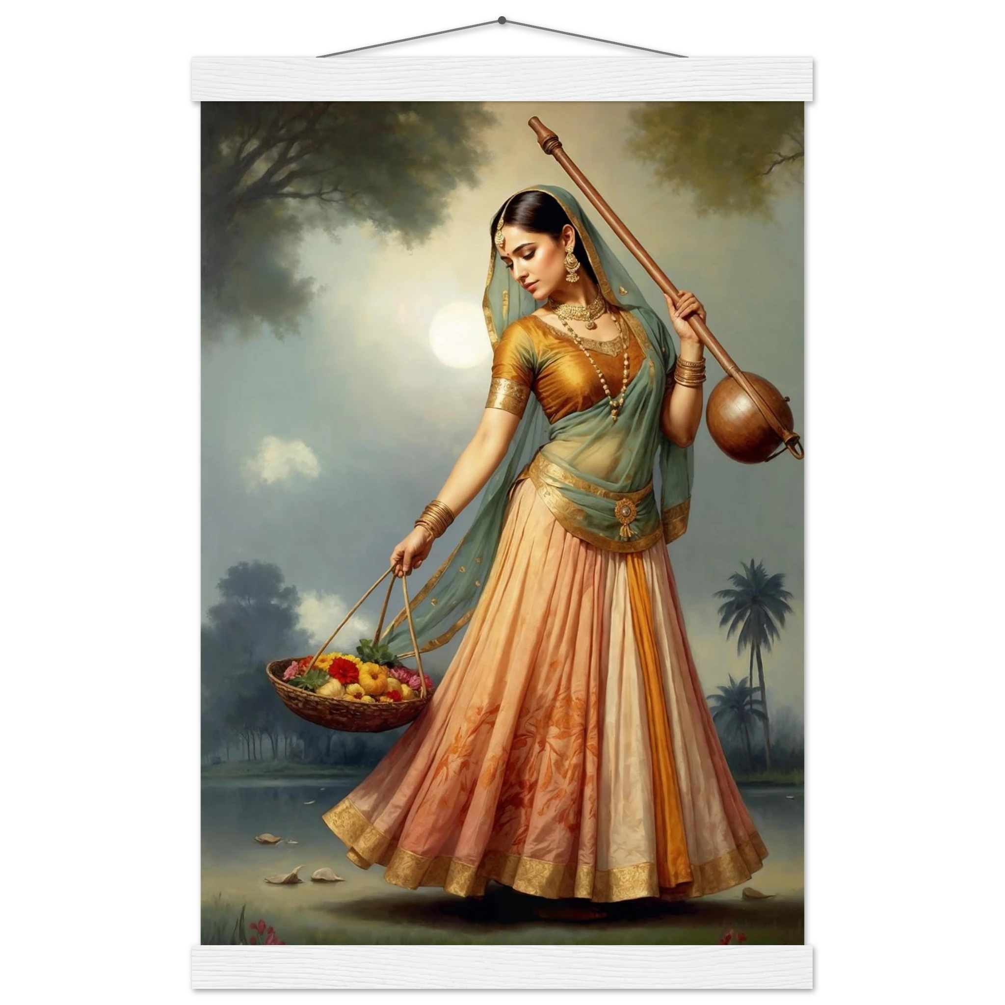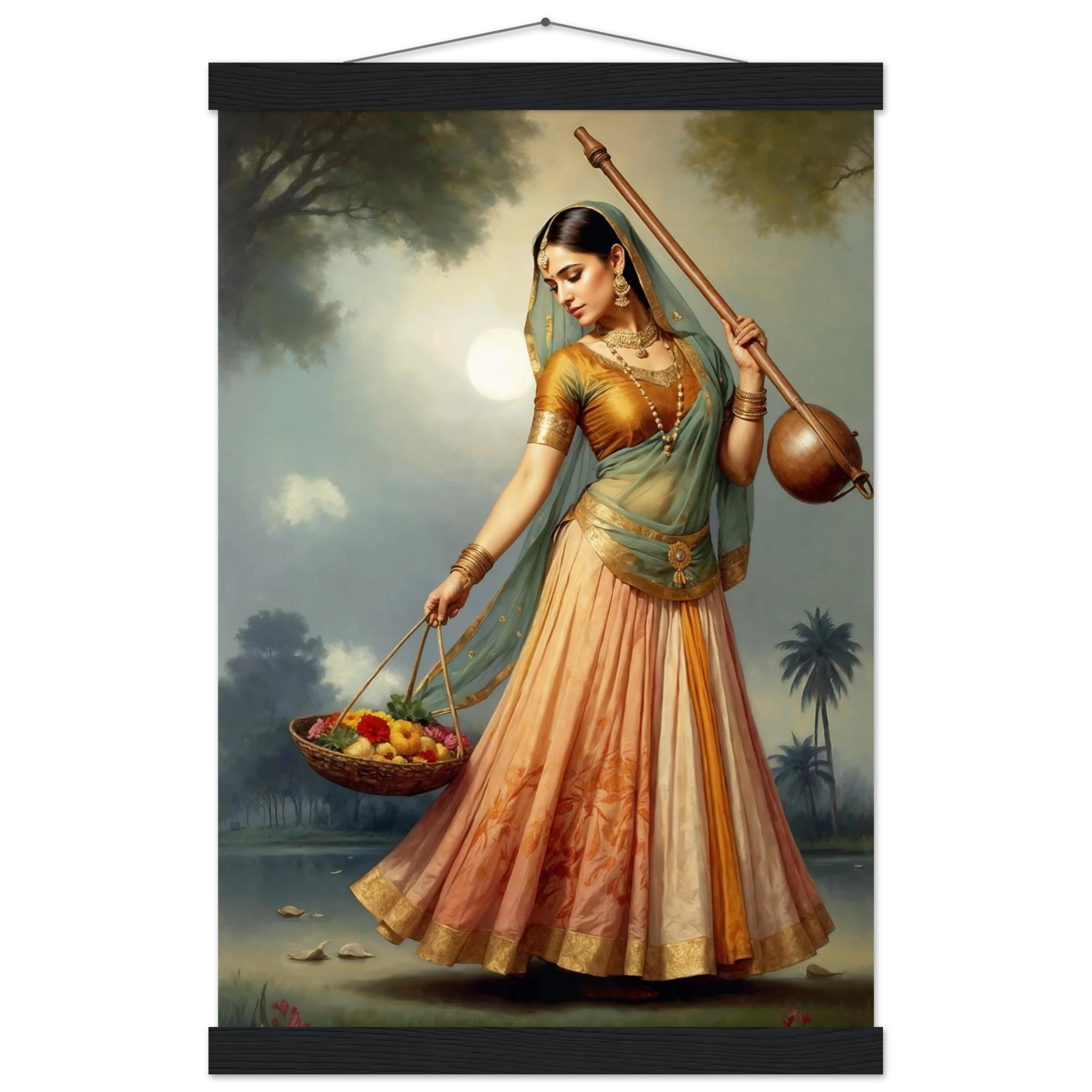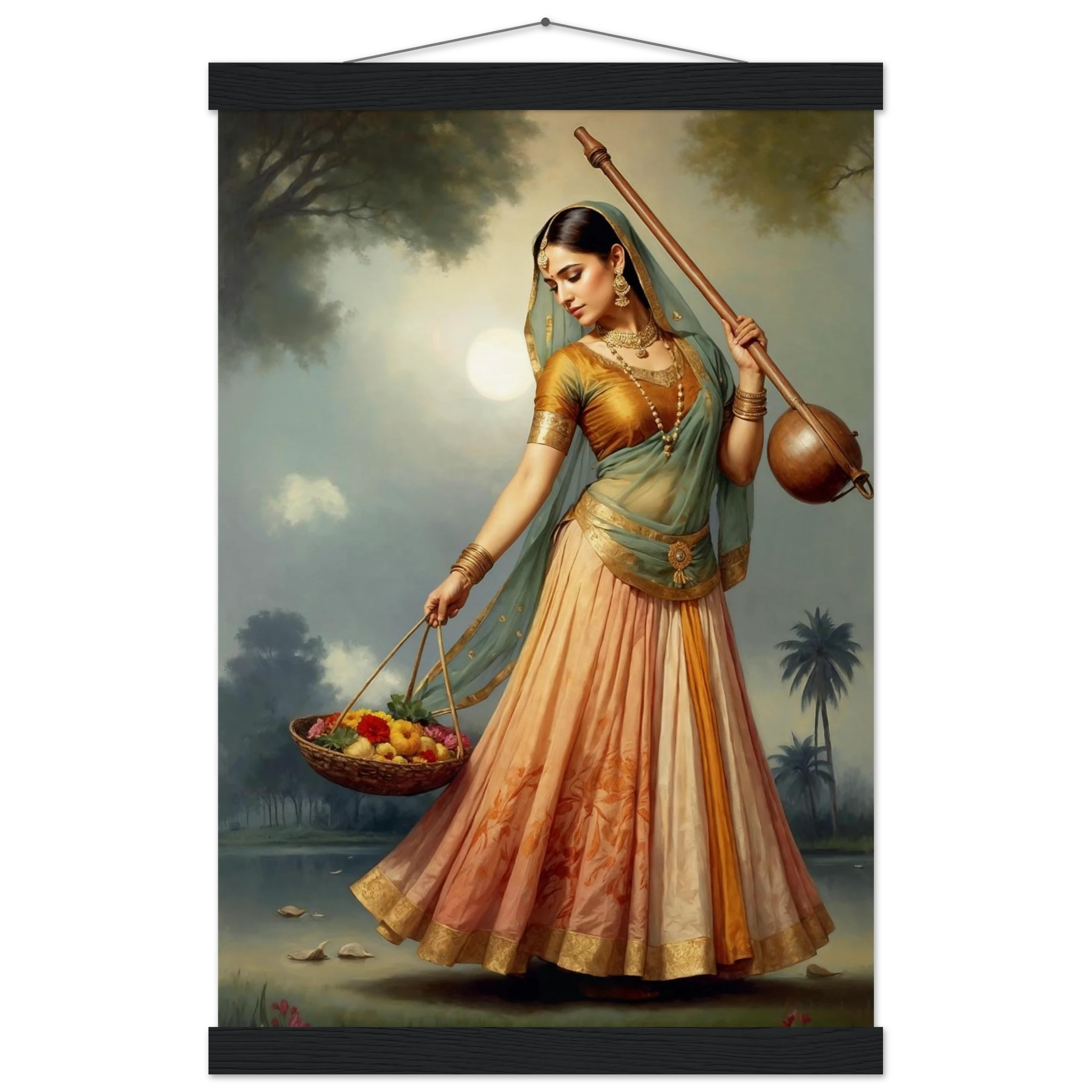 Graceful Indian woman in traditional dress with a musical instrument and flowers, bathed in the soft glow of morning. A serene art print for timeless beauty in your space. Available in Poster, Framed Poster and Poster with hanger.