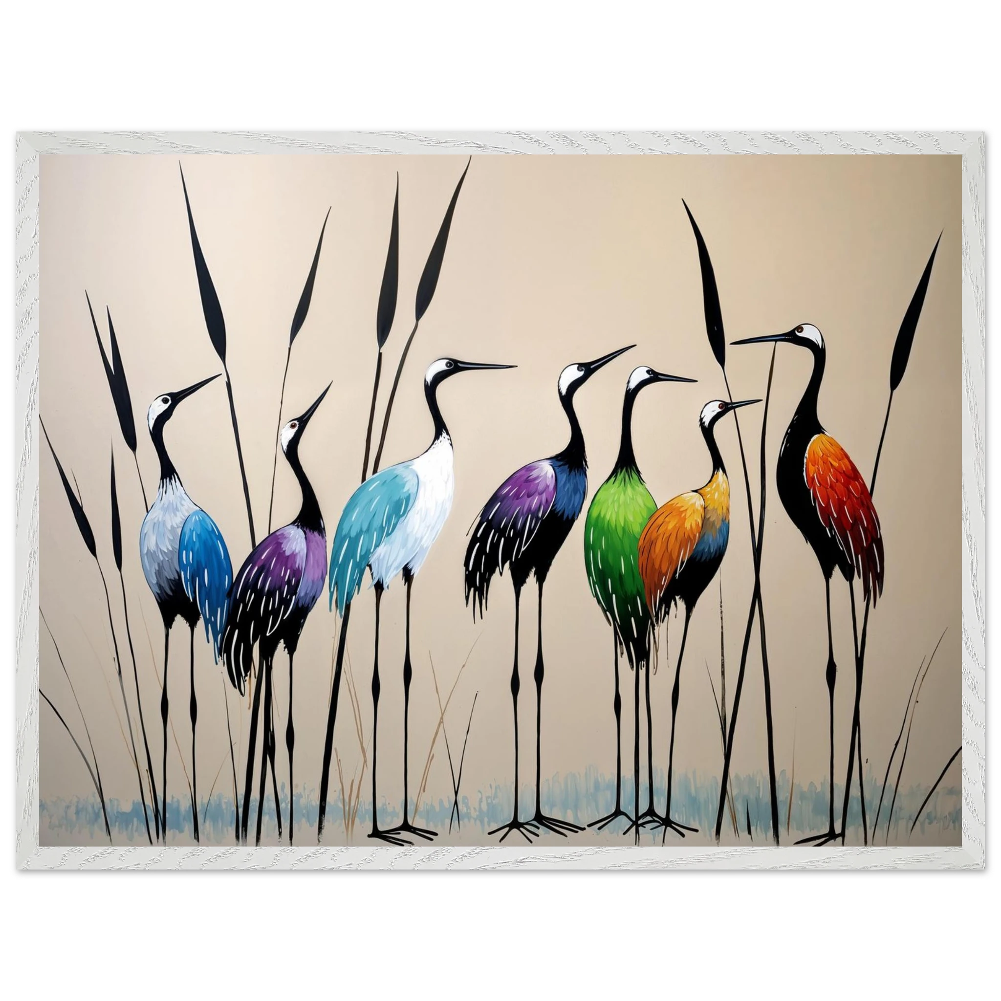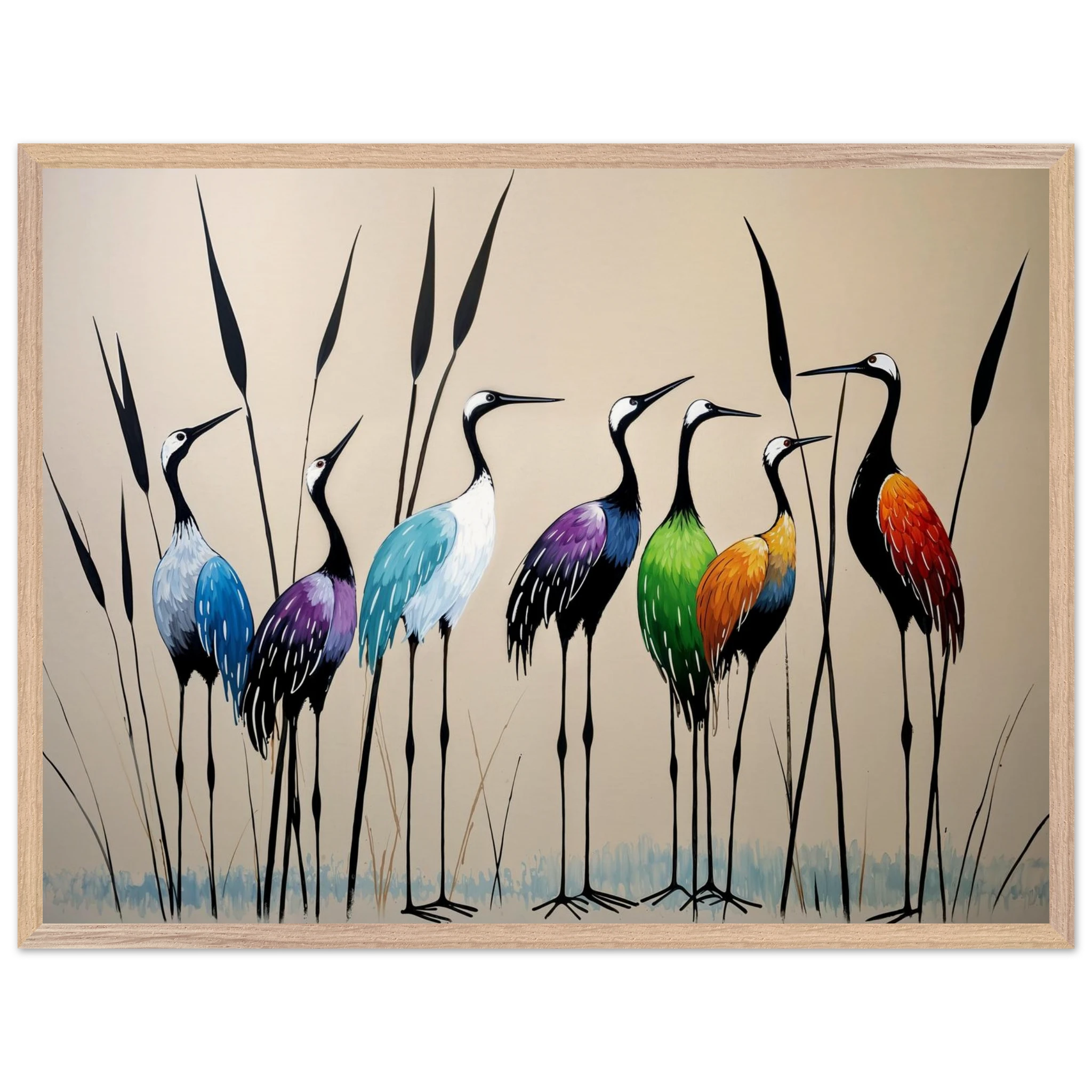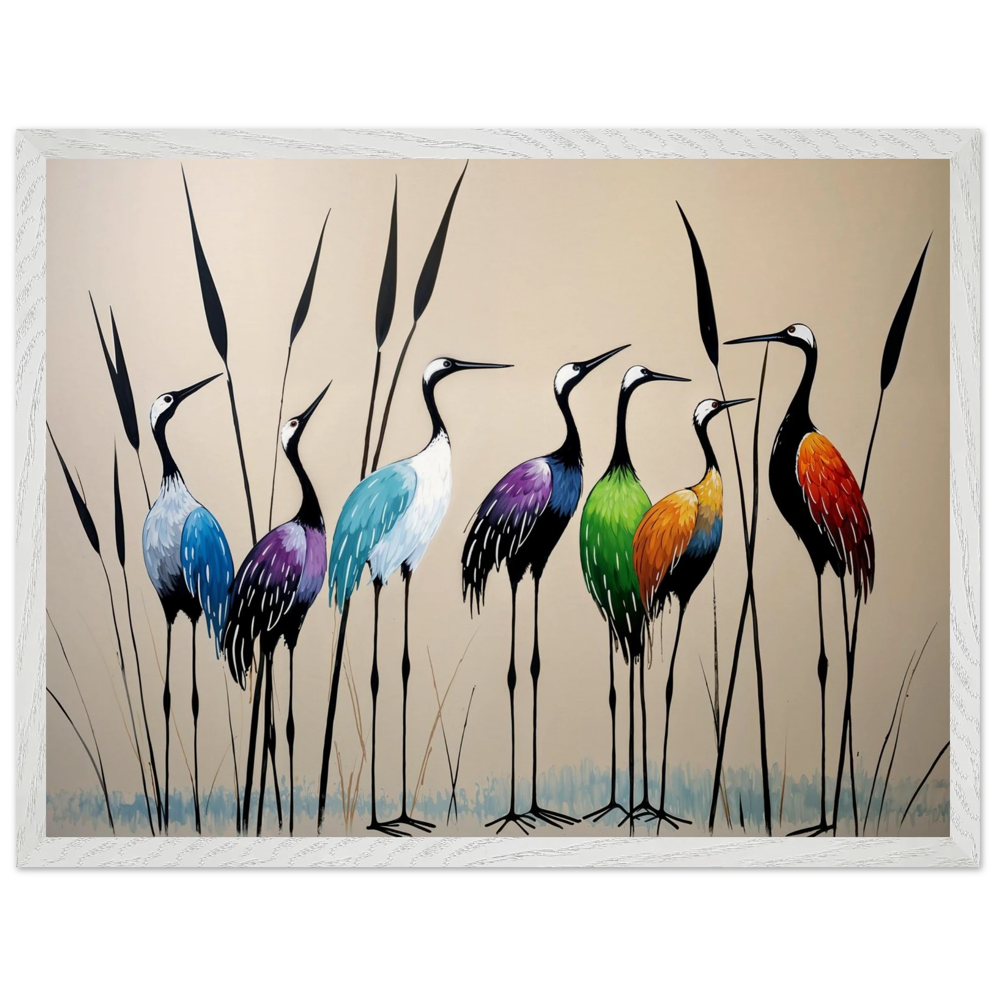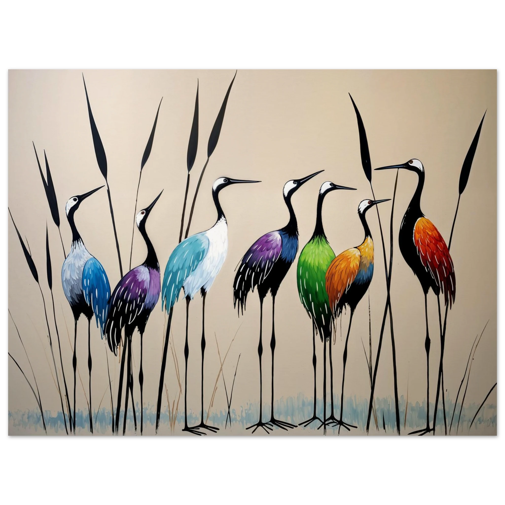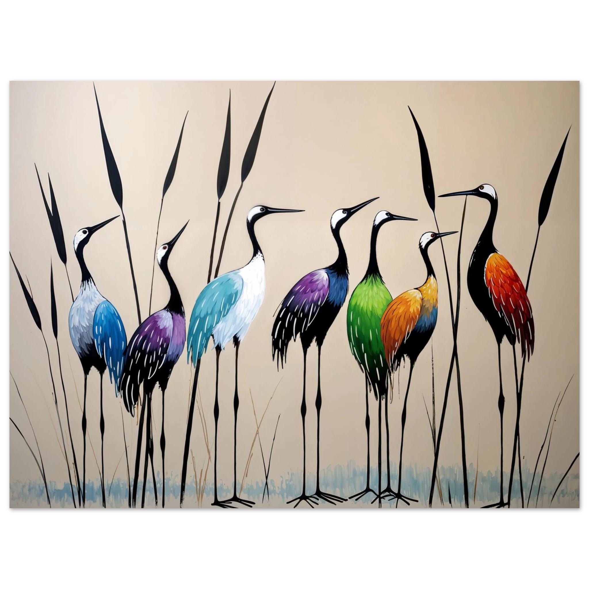 Bring a touch of minimalist elegance to your decor with this striking abstract crane painting. A graceful line of slender cranes strides across the canvas, depicted in a vibrant spectrum of colours including deep blues, purples, greens, and warm reds. The stylised forms and bold colour-blocking create a dynamic, harmonious composition that focuses purely on form and energy. Interspersed with thin reeds, this modern artwork captures the grace of the crane in an imaginative and sophisticated style. Perfect for adding a colourful, abstract statement to your living room or office.