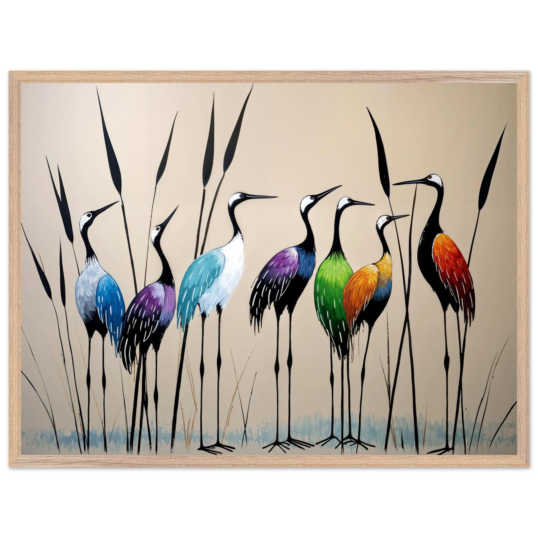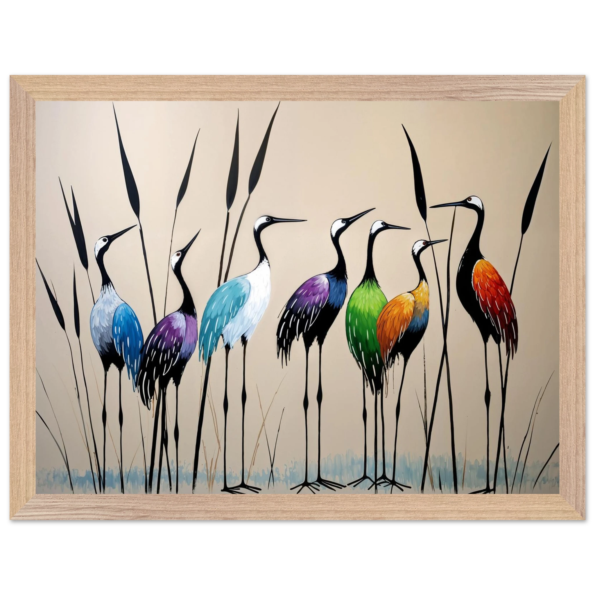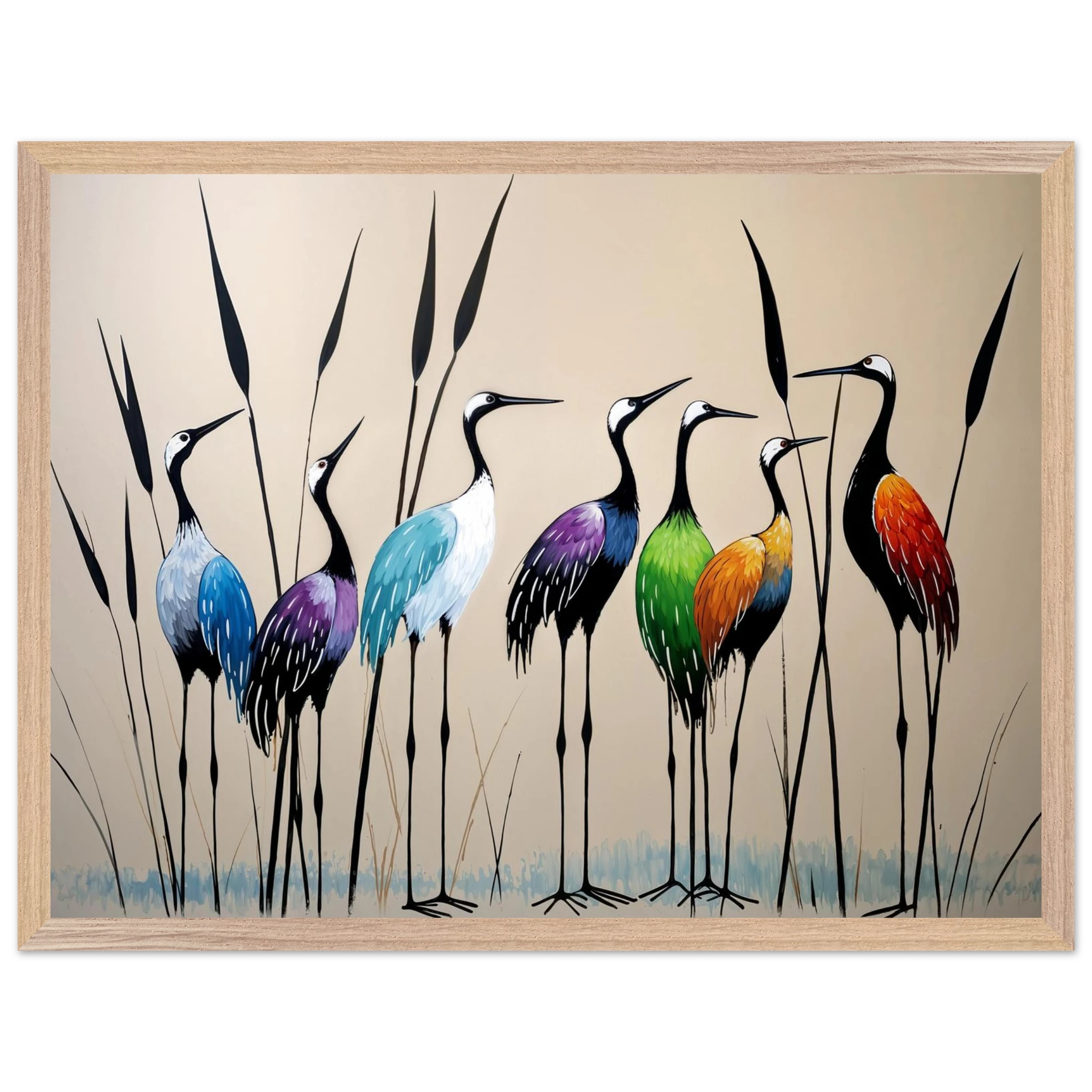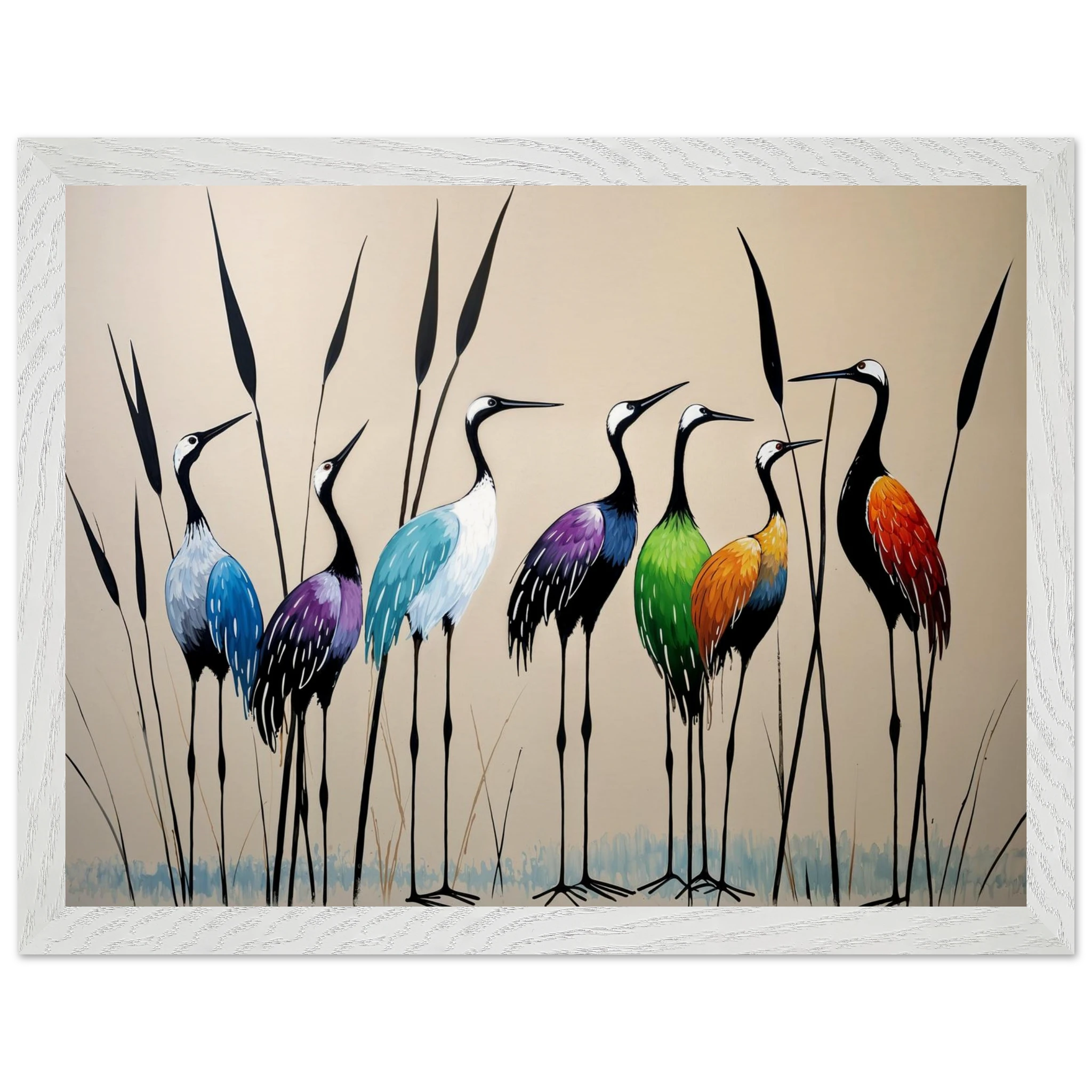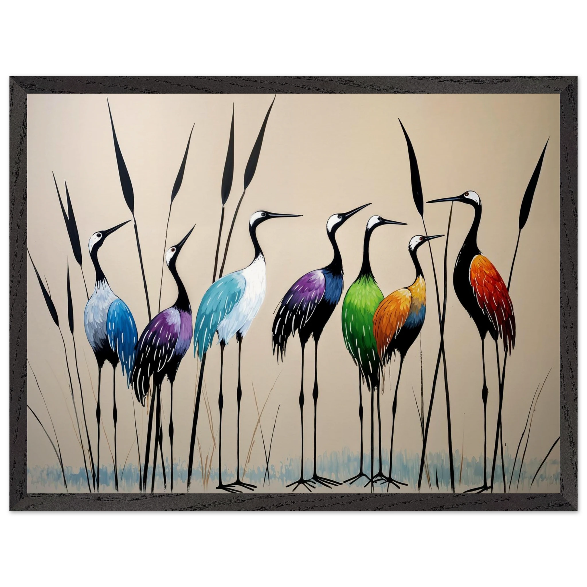 Bring a touch of minimalist elegance to your decor with this striking abstract crane painting. A graceful line of slender cranes strides across the canvas, depicted in a vibrant spectrum of colours including deep blues, purples, greens, and warm reds. The stylised forms and bold colour-blocking create a dynamic, harmonious composition that focuses purely on form and energy. Interspersed with thin reeds, this modern artwork captures the grace of the crane in an imaginative and sophisticated style. Perfect for adding a colourful, abstract statement to your living room or office.