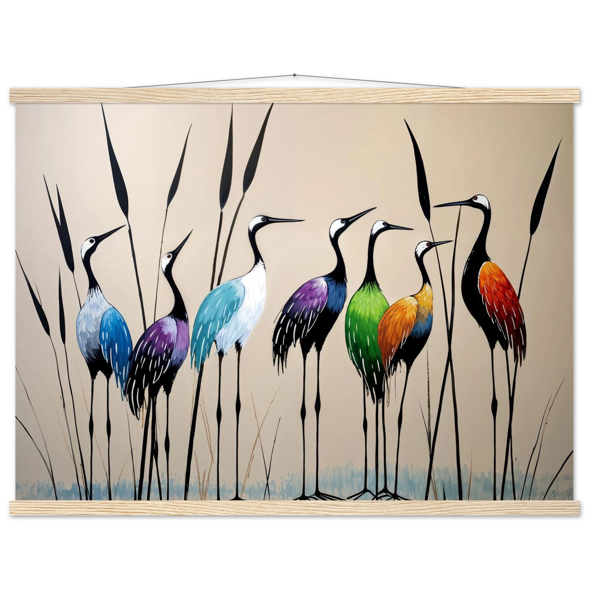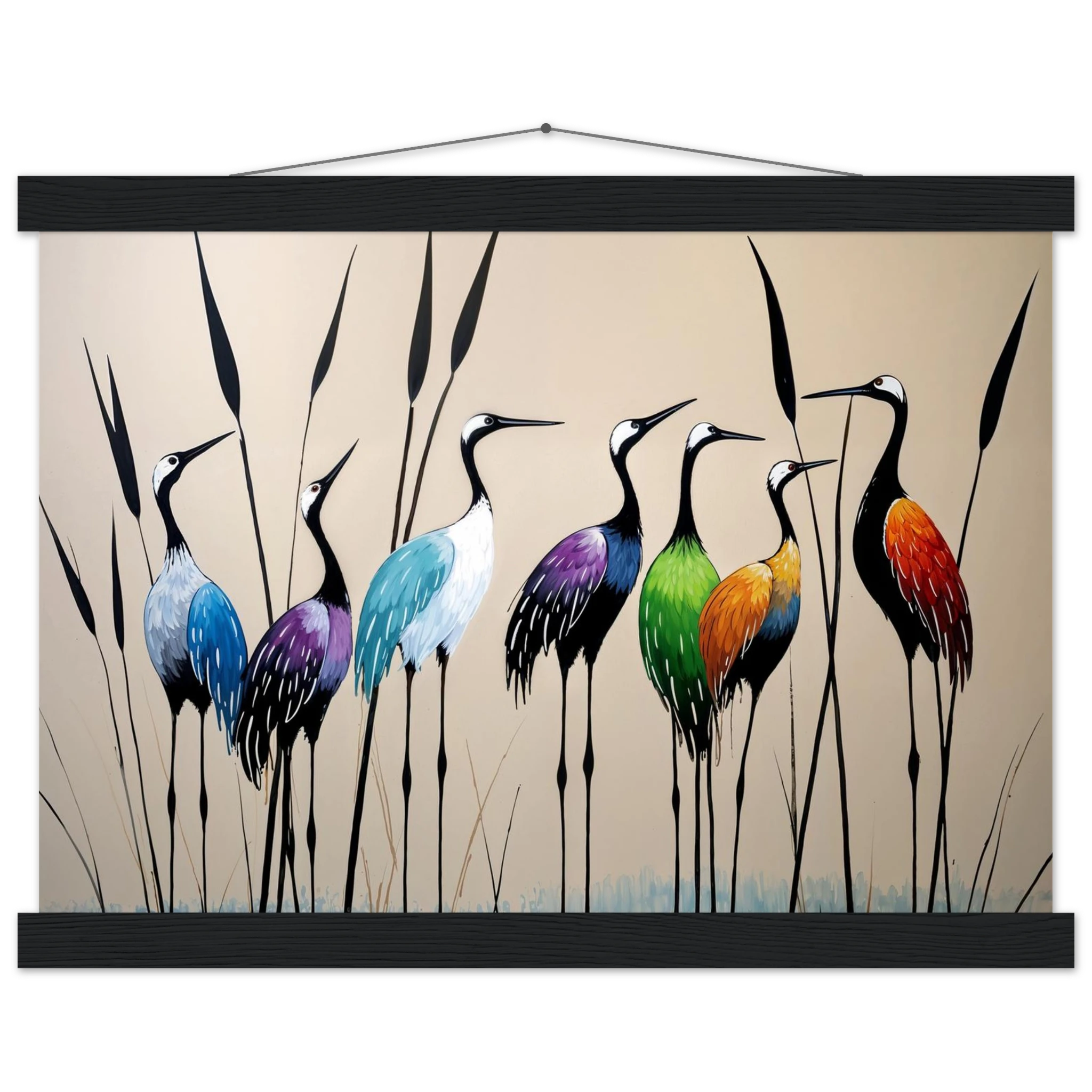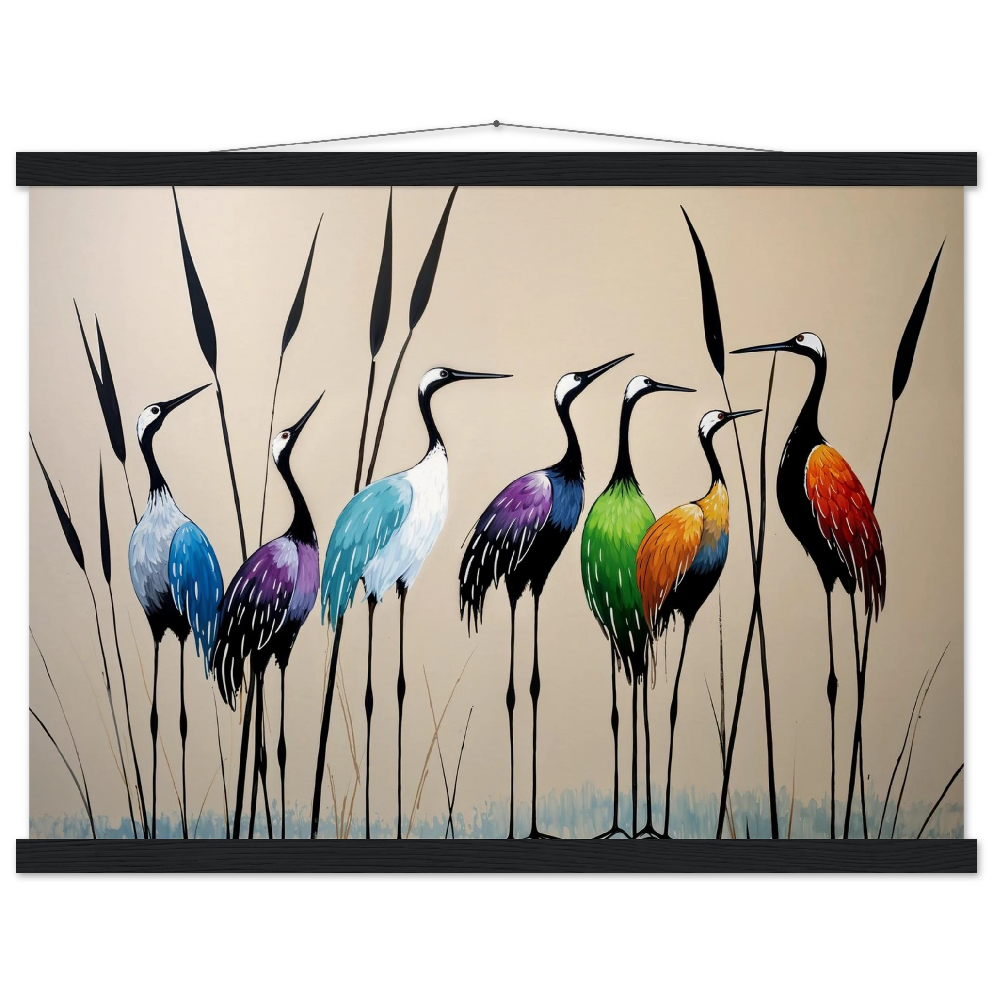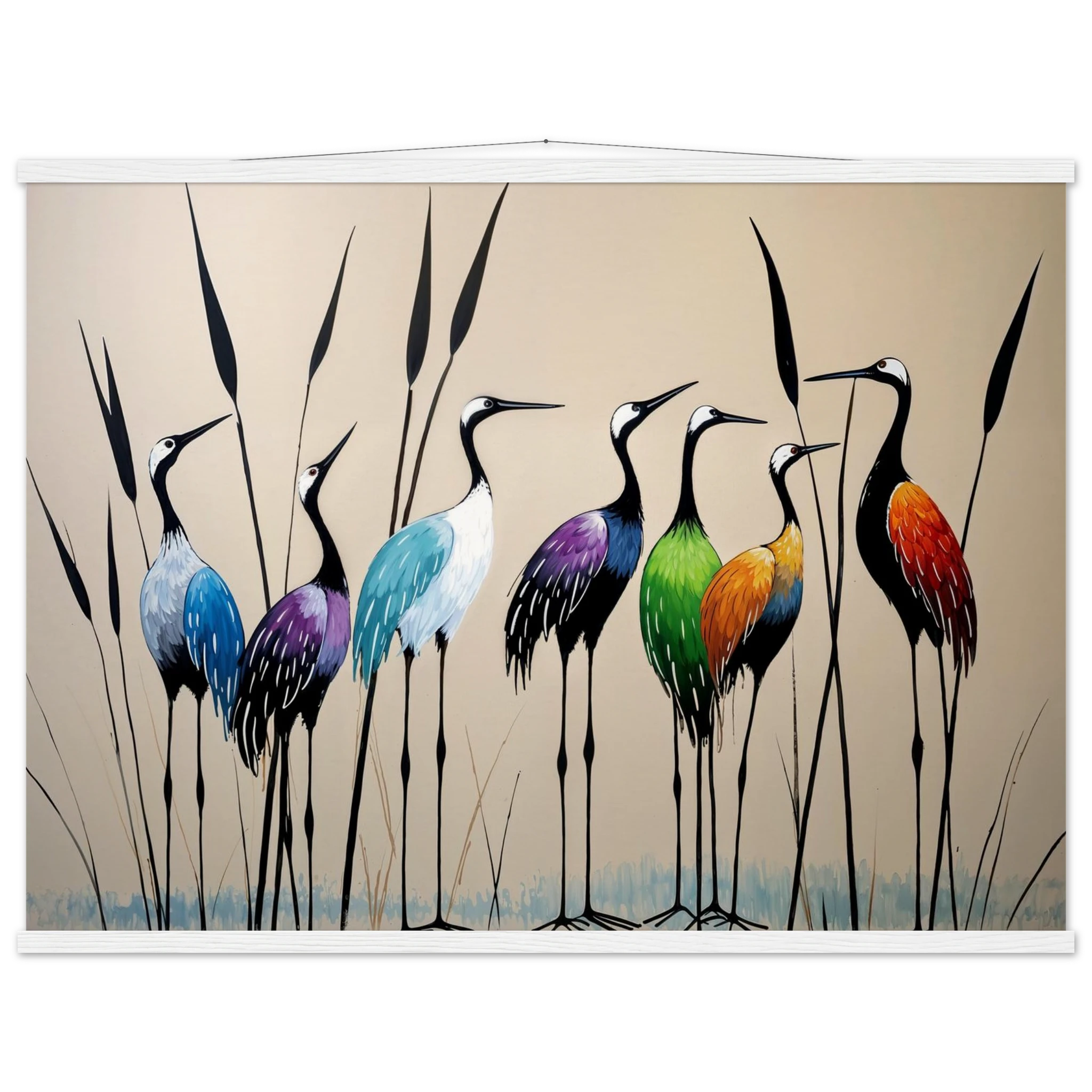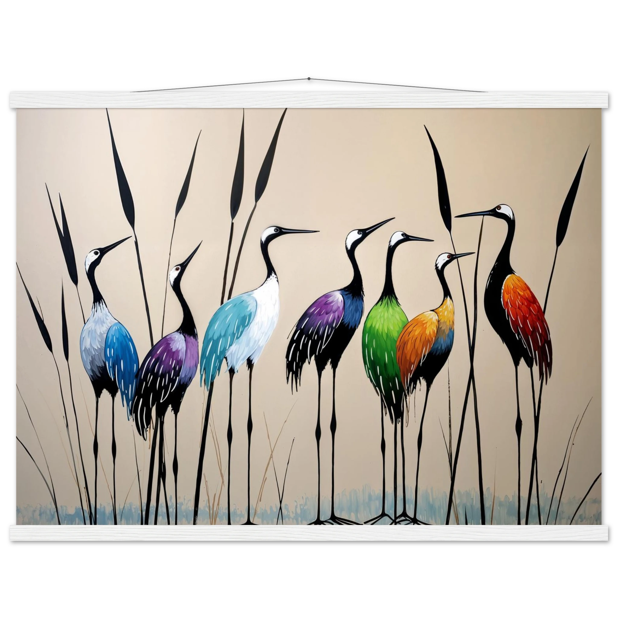 Bring a touch of minimalist elegance to your decor with this striking abstract crane painting. A graceful line of slender cranes strides across the canvas, depicted in a vibrant spectrum of colours including deep blues, purples, greens, and warm reds. The stylised forms and bold colour-blocking create a dynamic, harmonious composition that focuses purely on form and energy. Interspersed with thin reeds, this modern artwork captures the grace of the crane in an imaginative and sophisticated style. Perfect for adding a colourful, abstract statement to your living room or office.