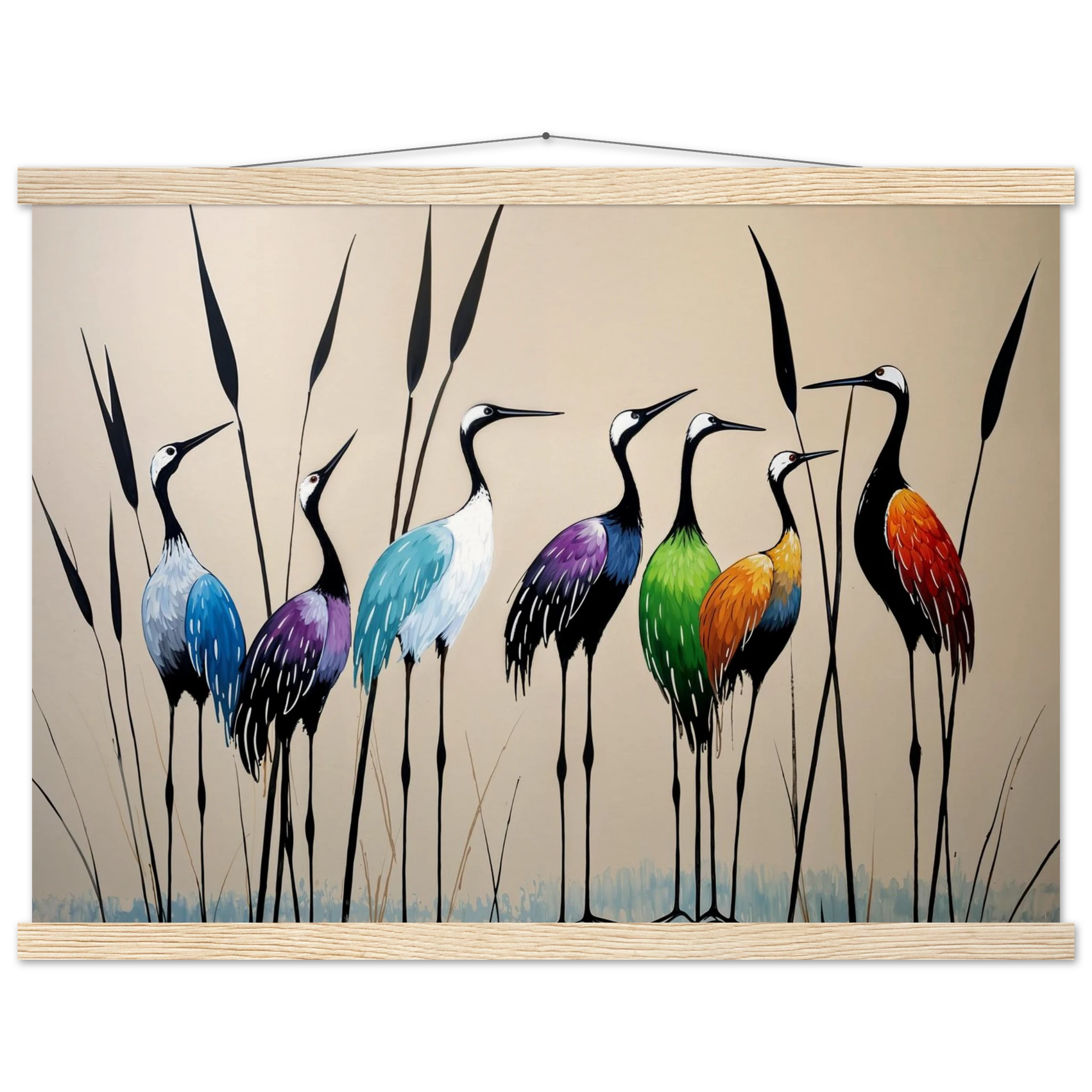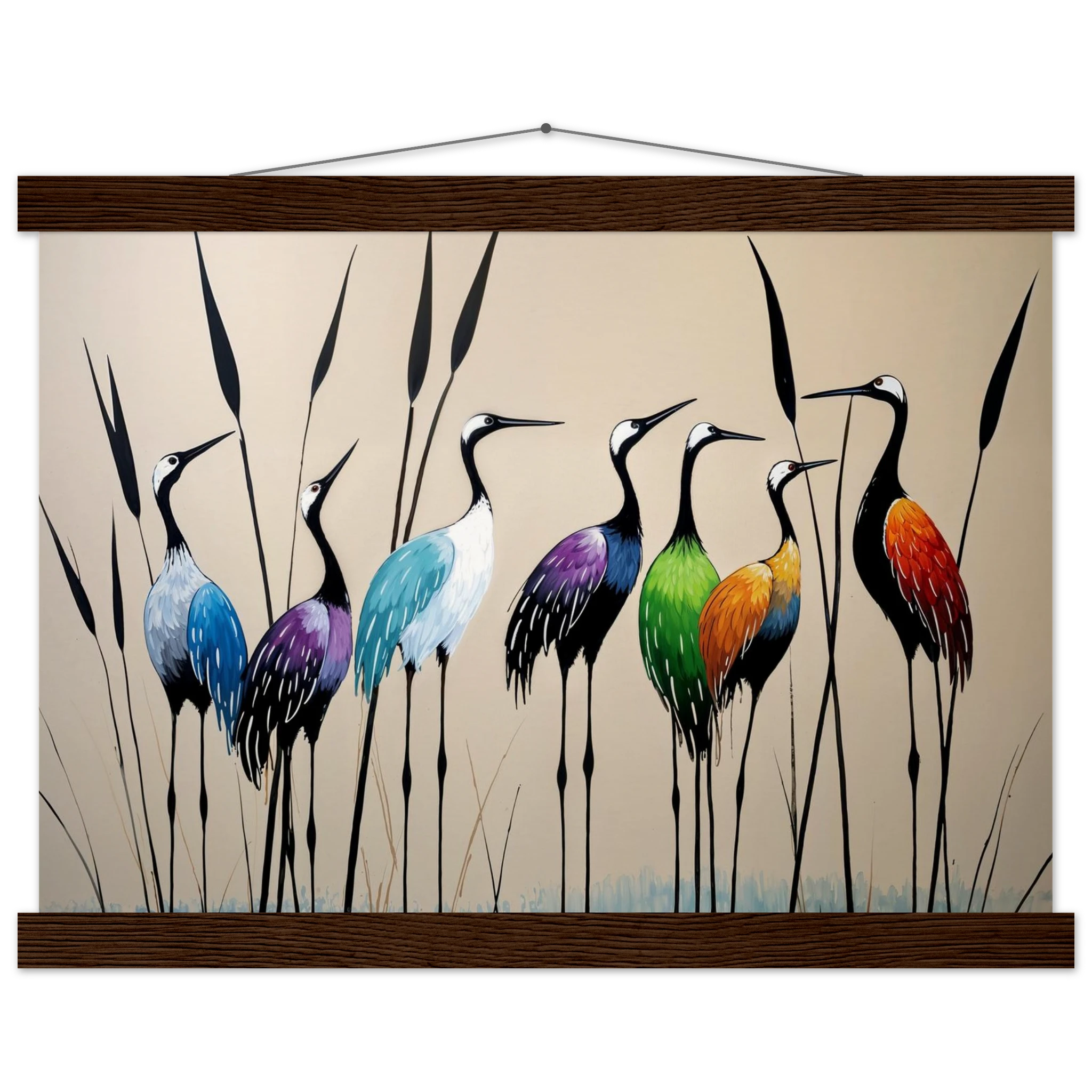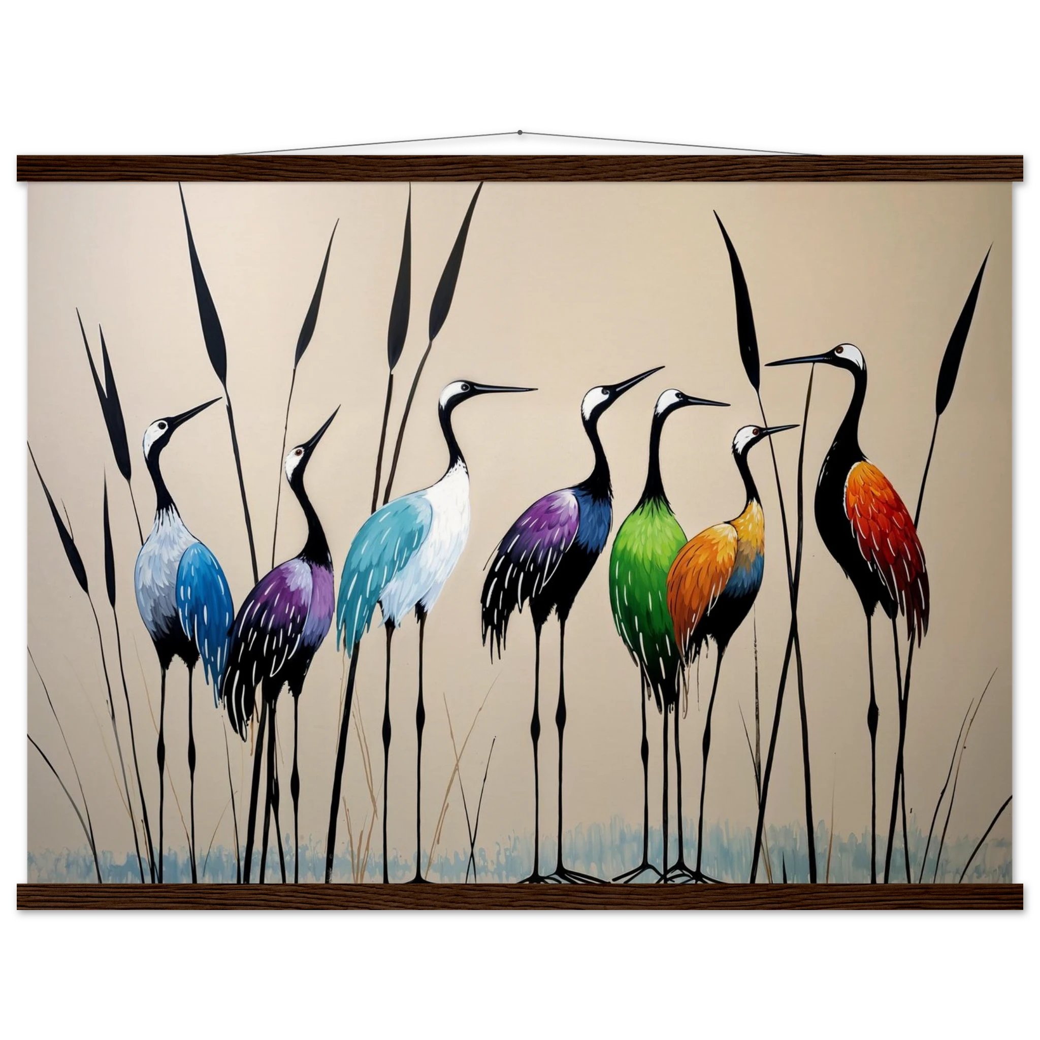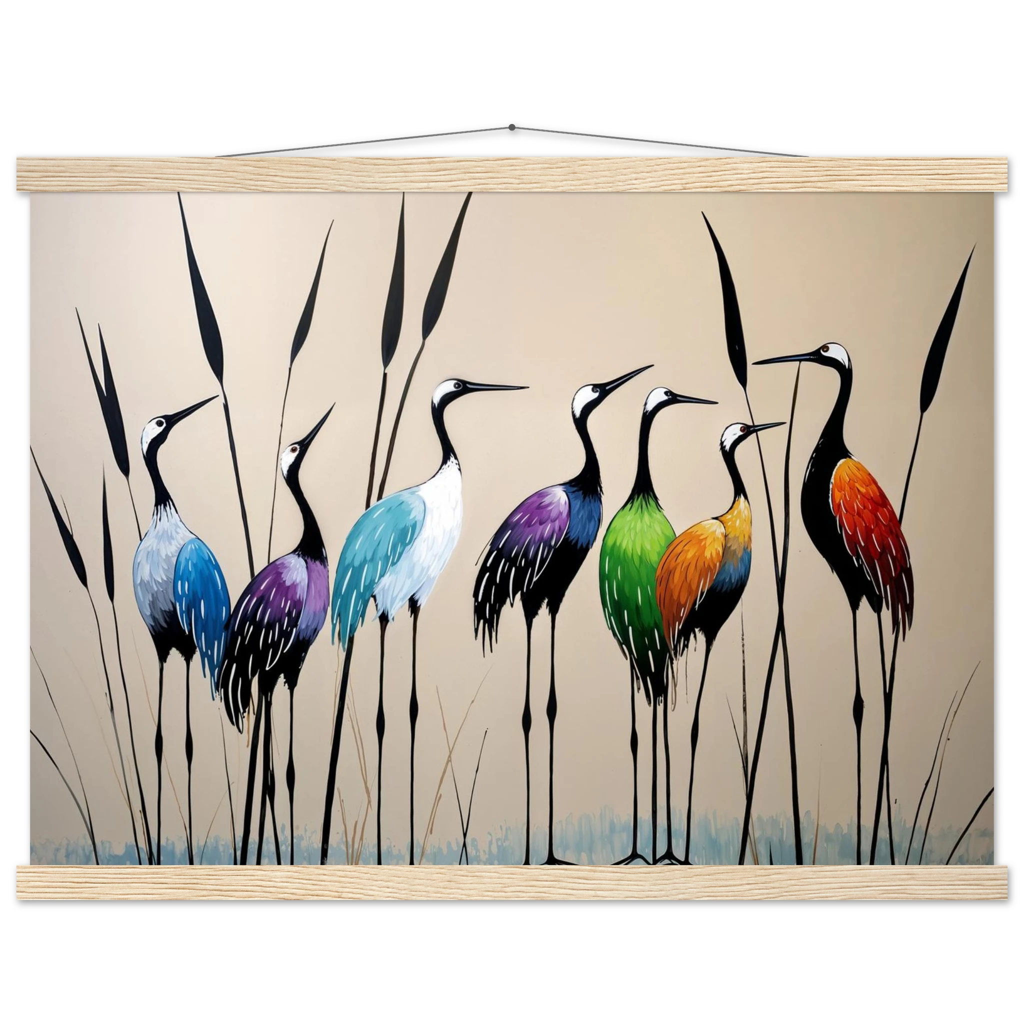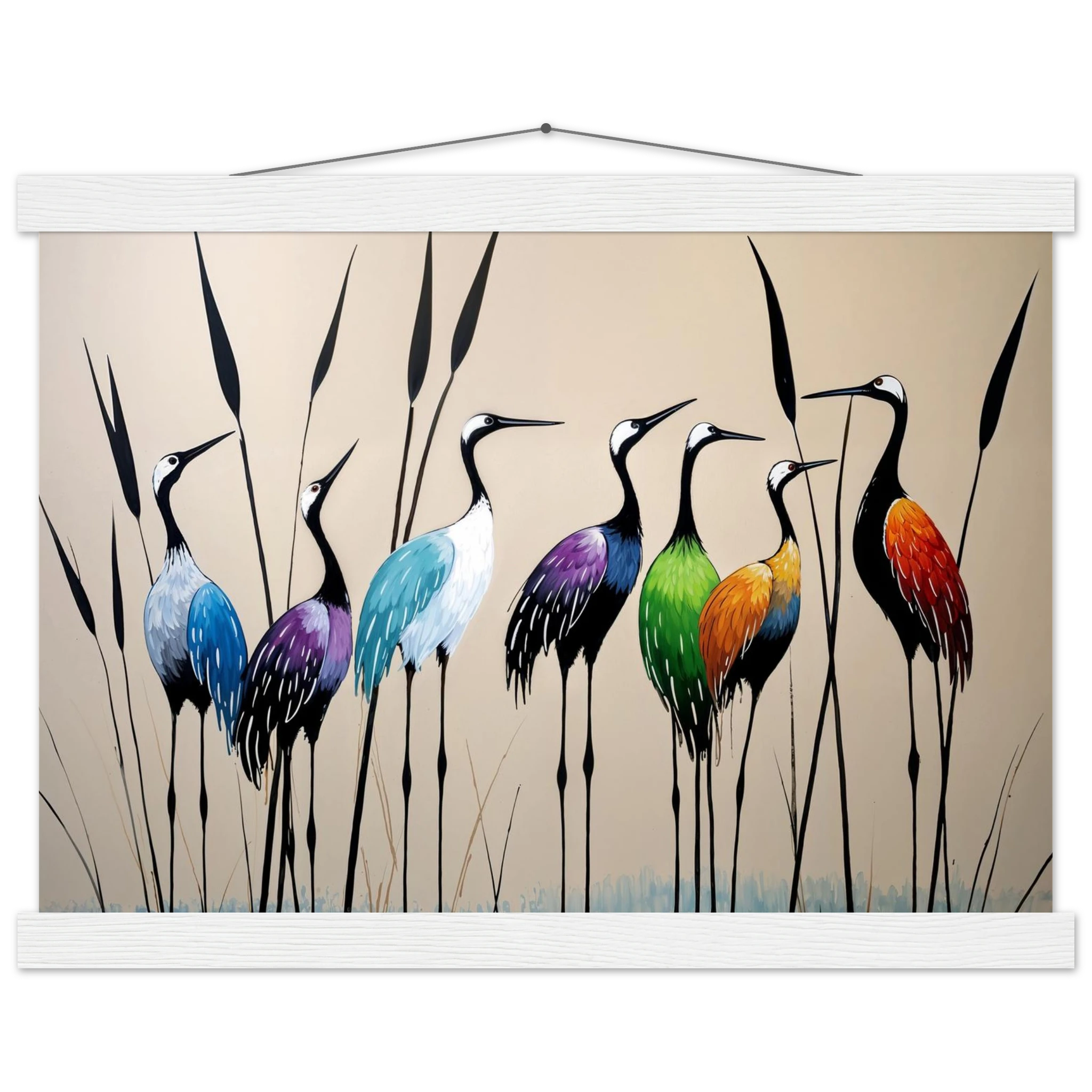 Bring a touch of minimalist elegance to your decor with this striking abstract crane painting. A graceful line of slender cranes strides across the canvas, depicted in a vibrant spectrum of colours including deep blues, purples, greens, and warm reds. The stylised forms and bold colour-blocking create a dynamic, harmonious composition that focuses purely on form and energy. Interspersed with thin reeds, this modern artwork captures the grace of the crane in an imaginative and sophisticated style. Perfect for adding a colourful, abstract statement to your living room or office.
