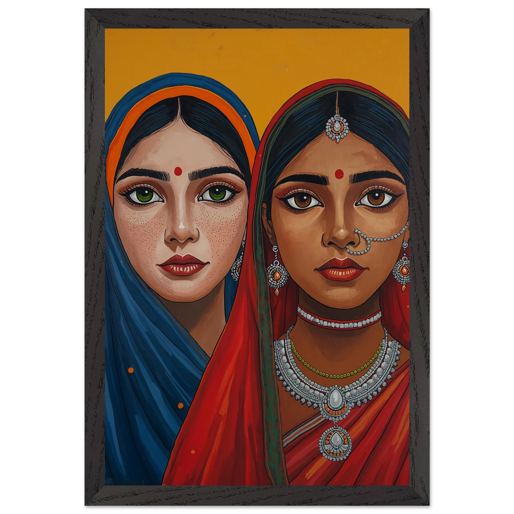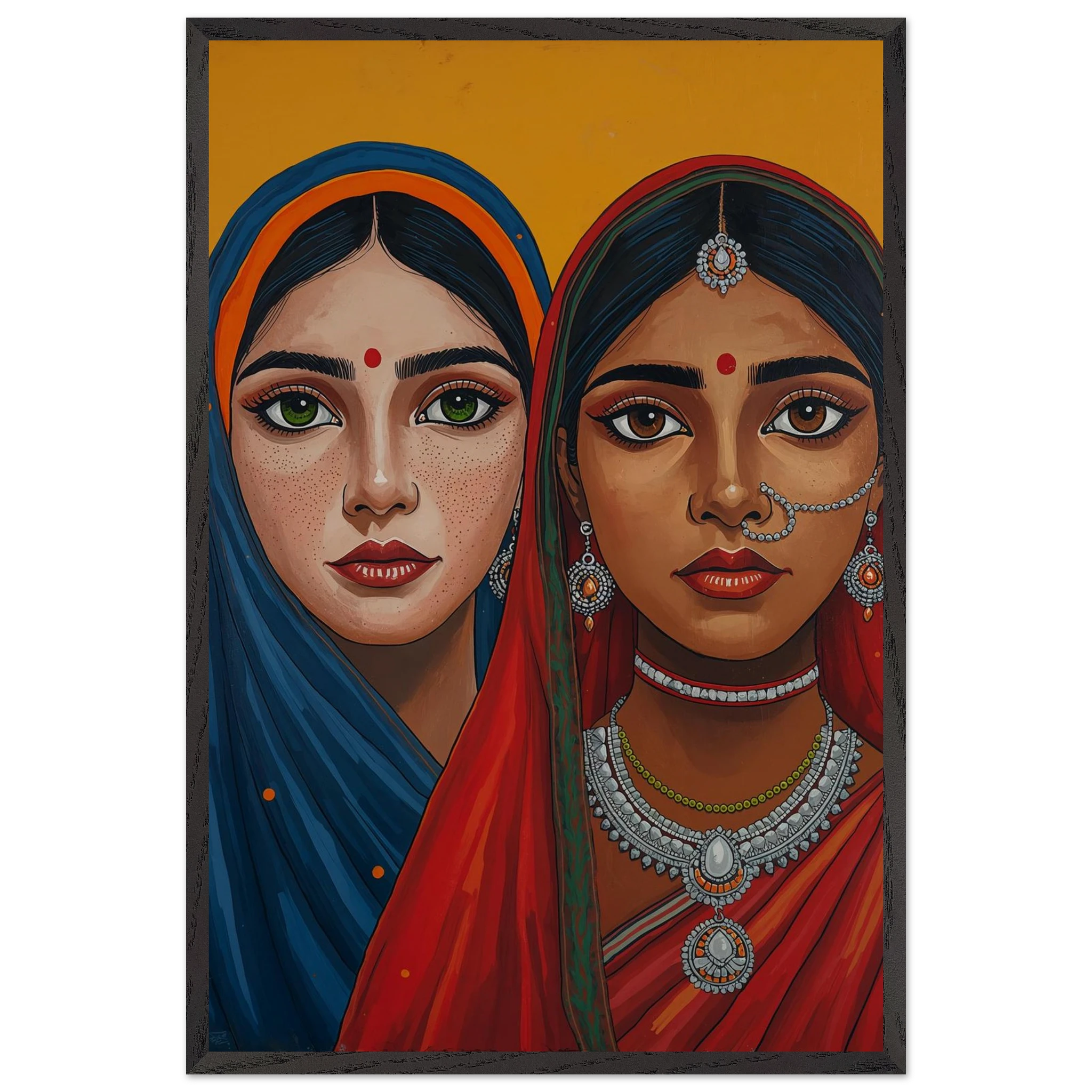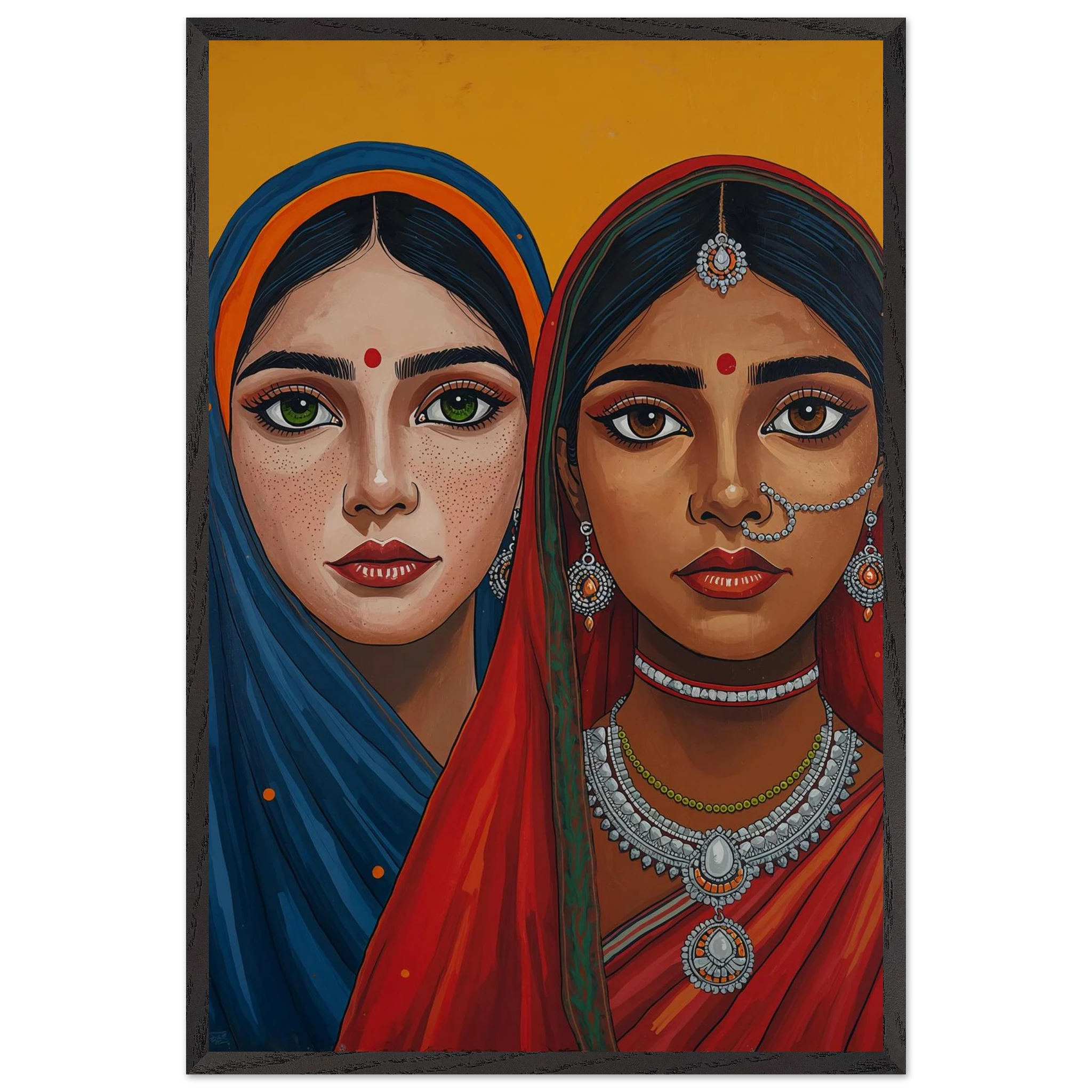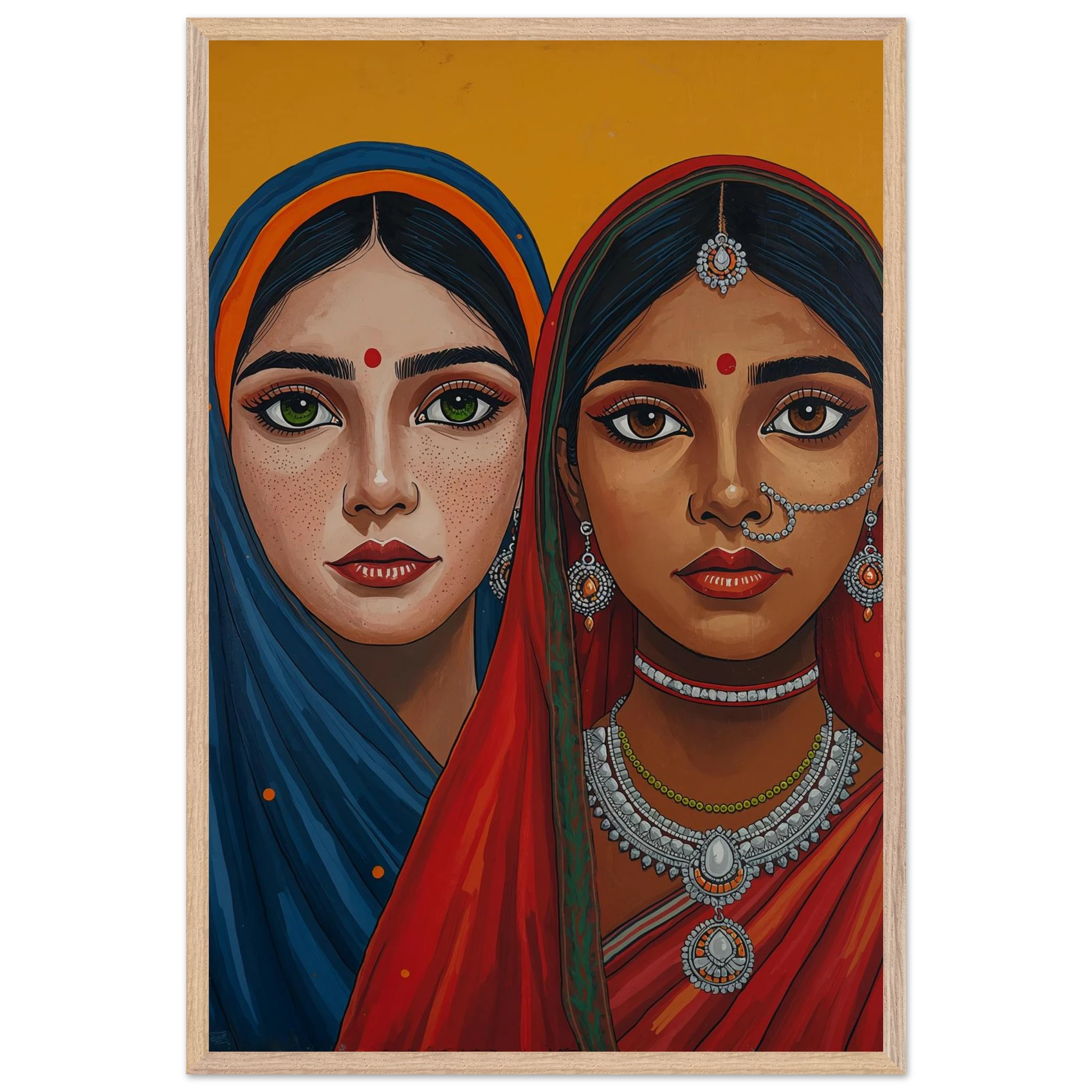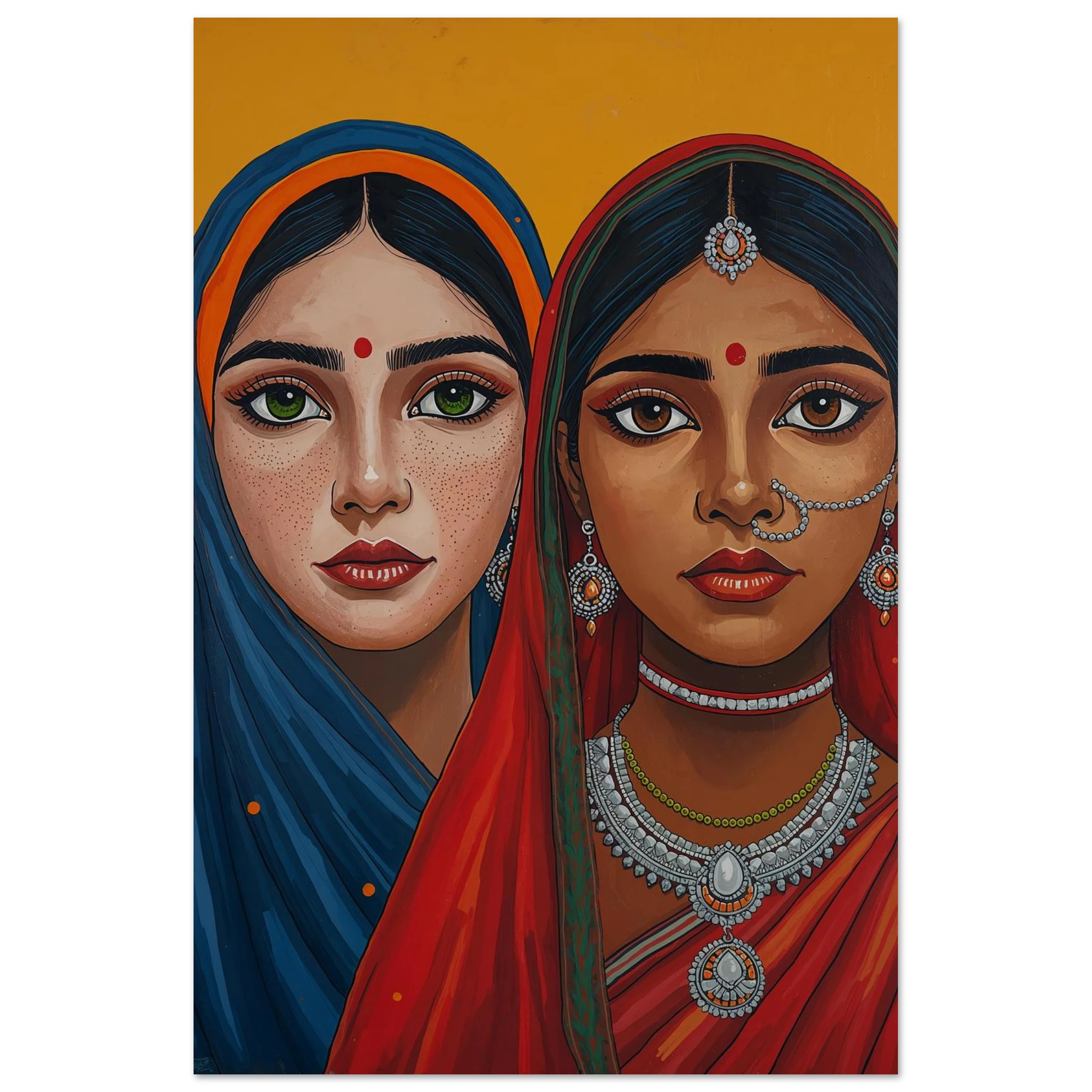 The woman on the left is draped in a deep blue headscarf with an orange border, her large green eyes complemented by intricate silver earrings and necklaces. Beside her, the second woman wears a vivid red headscarf with a green border, featuring a traditional silver nose ring and matching jewellery. Both subjects, with their rich brown skin tones and sacred red bindis, exude a sense of grace and pride. This modern ethnic masterpiece is the perfect addition to a home that values cultural storytelling, vibrant colours, and the timeless elegance of Indian tradition.