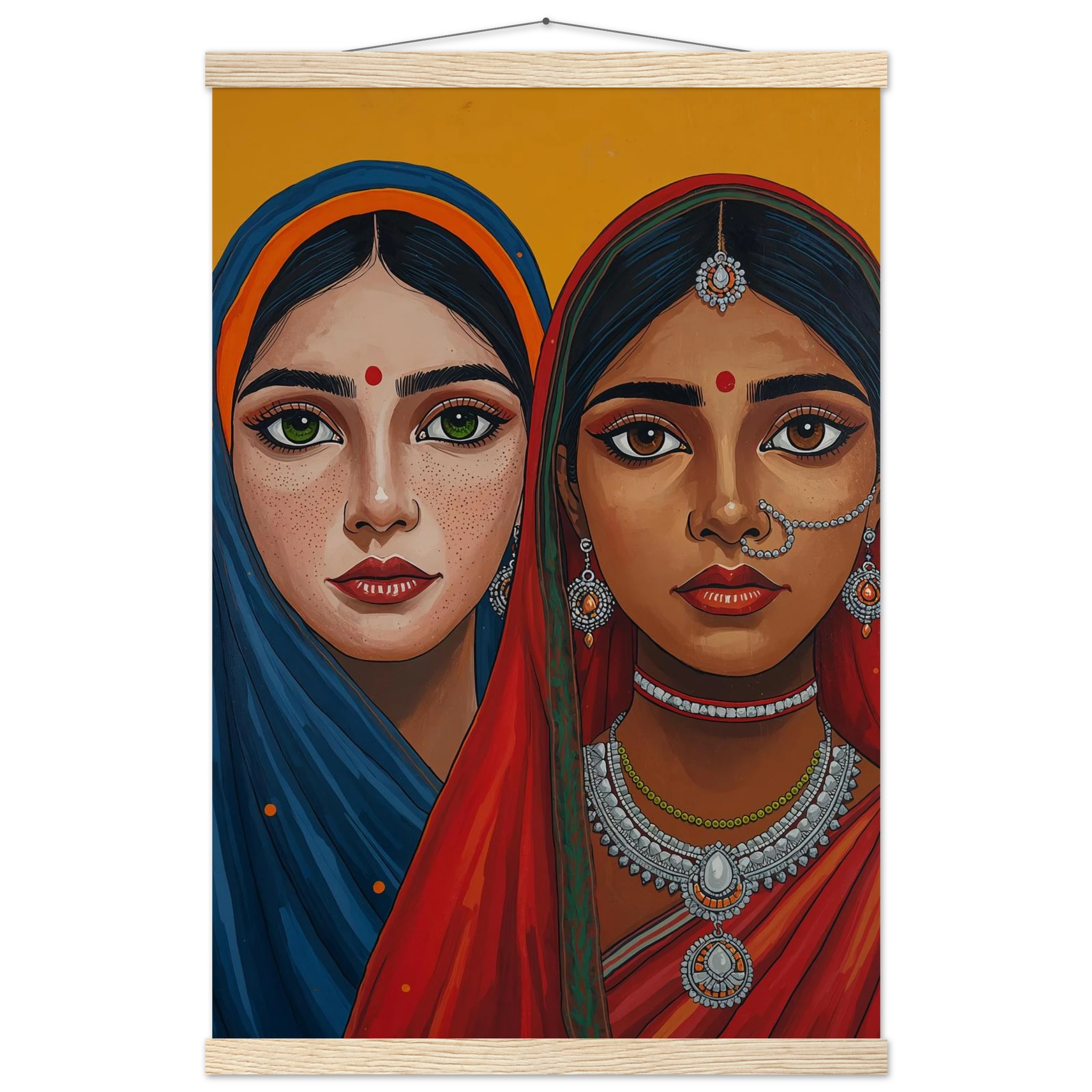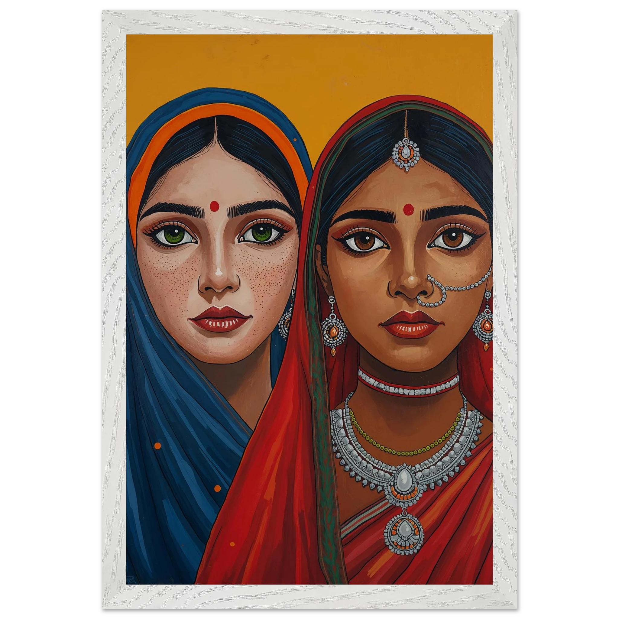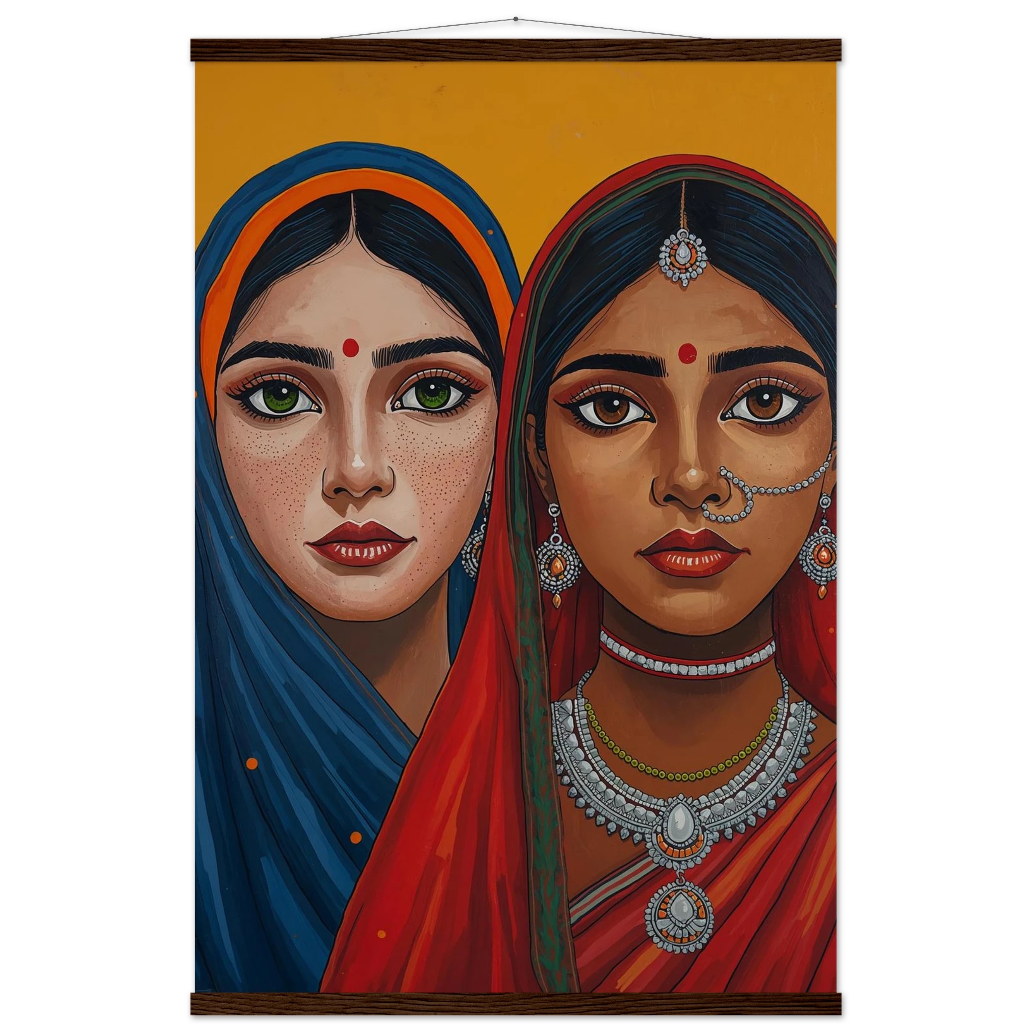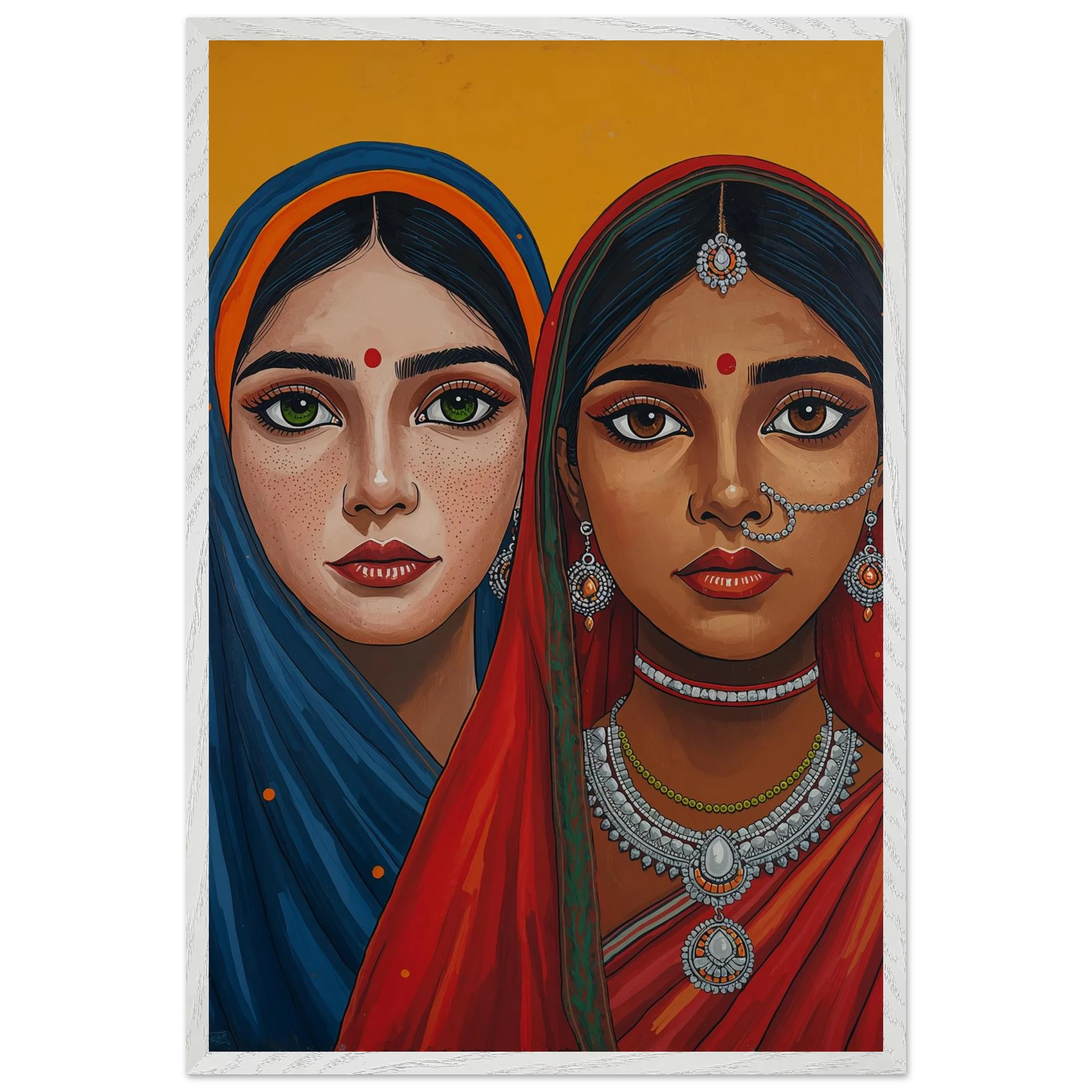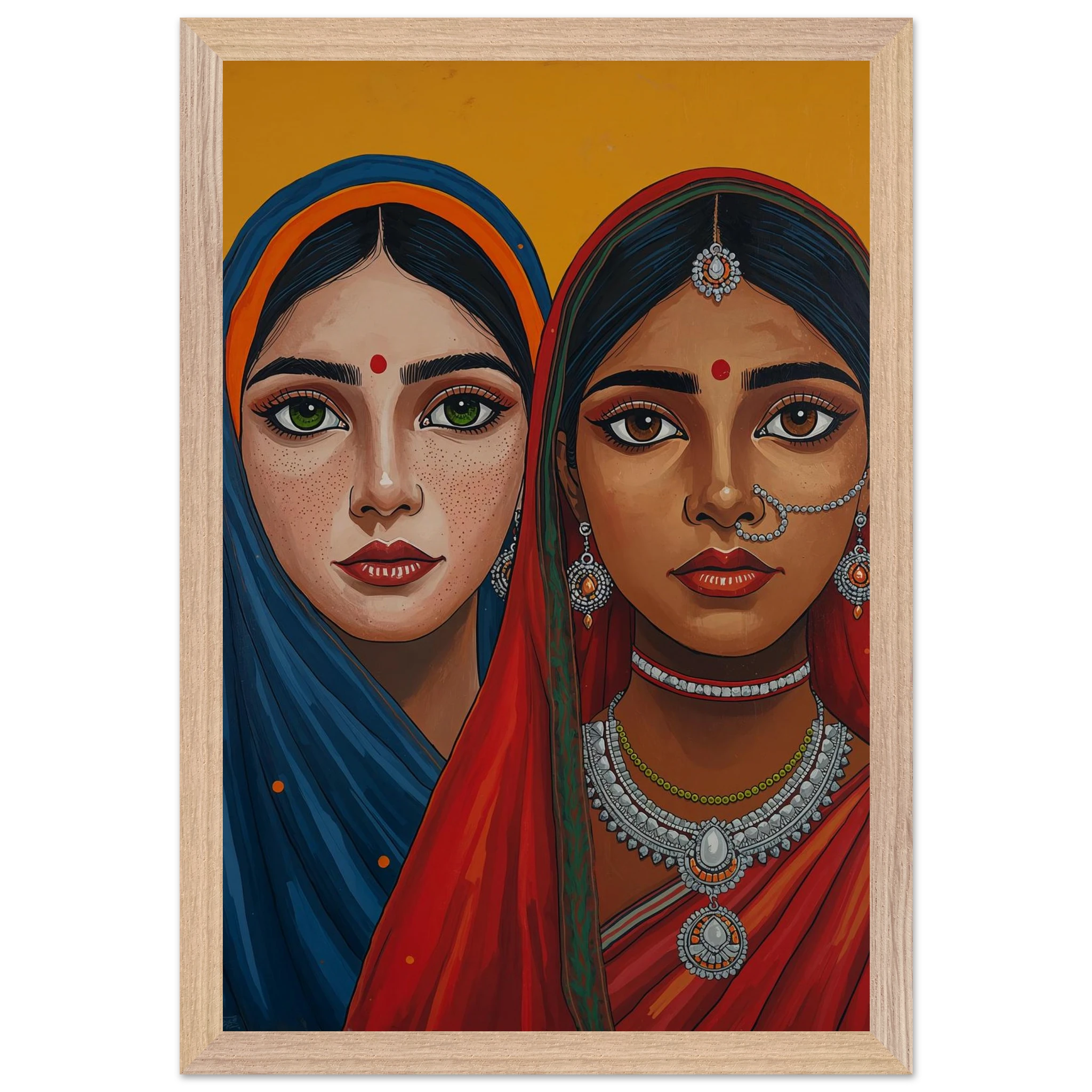 The woman on the left is draped in a deep blue headscarf with an orange border, her large green eyes complemented by intricate silver earrings and necklaces. Beside her, the second woman wears a vivid red headscarf with a green border, featuring a traditional silver nose ring and matching jewellery. Both subjects, with their rich brown skin tones and sacred red bindis, exude a sense of grace and pride. This modern ethnic masterpiece is the perfect addition to a home that values cultural storytelling, vibrant colours, and the timeless elegance of Indian tradition.