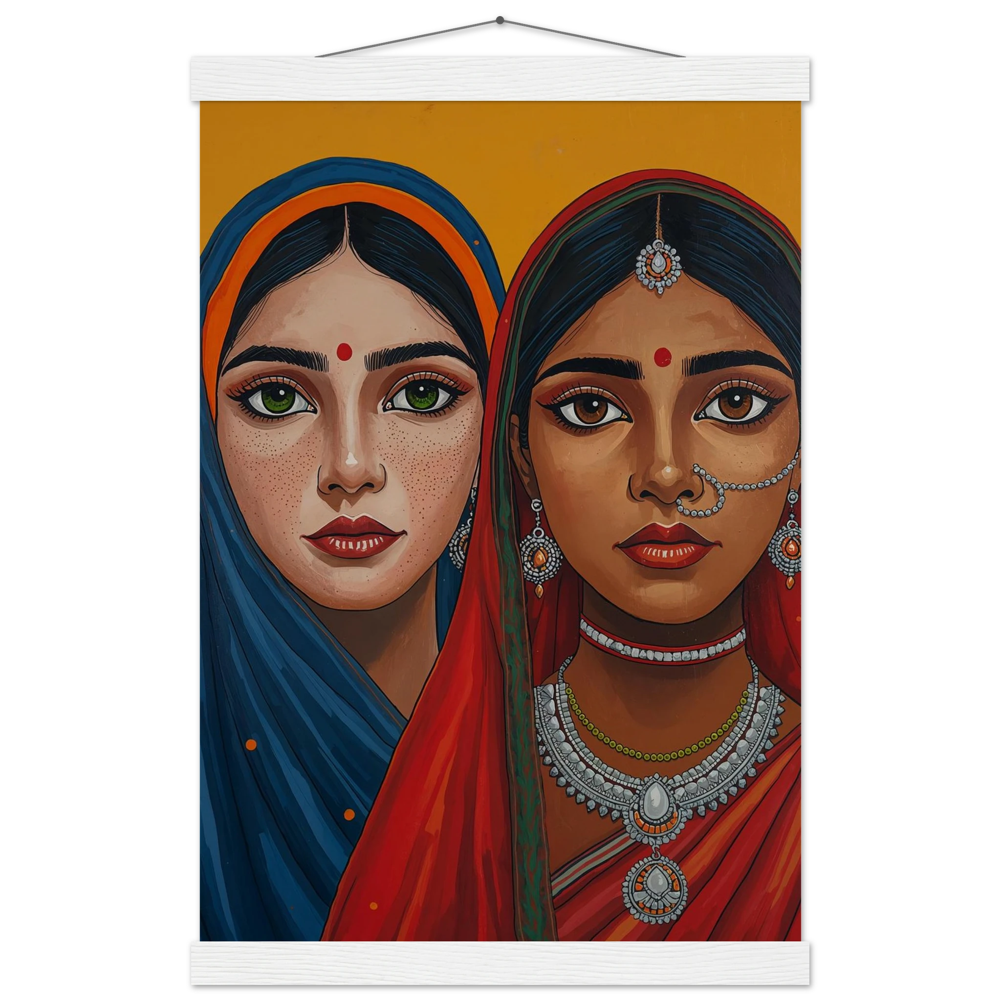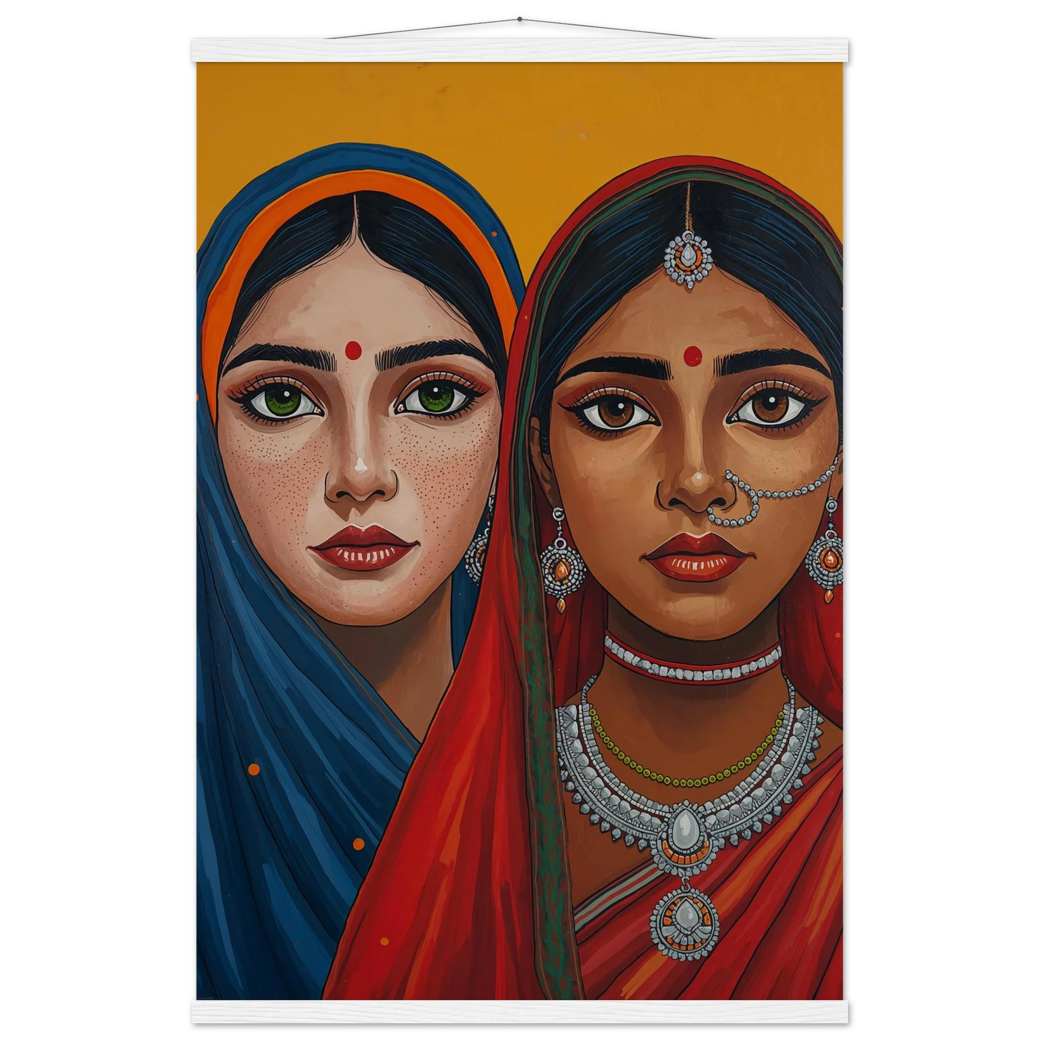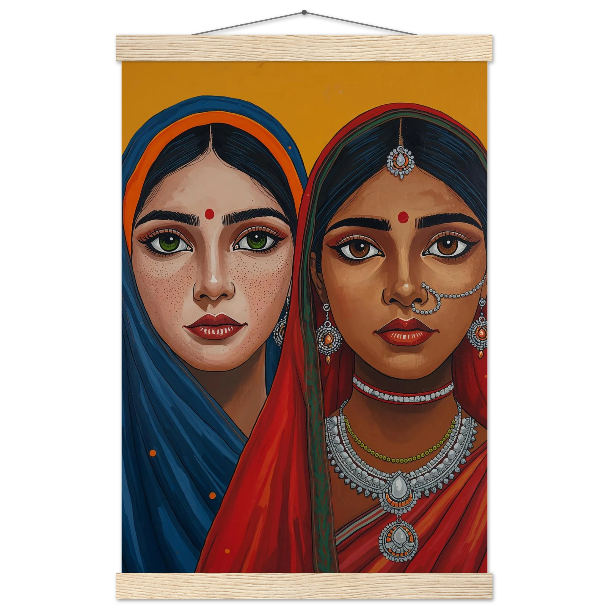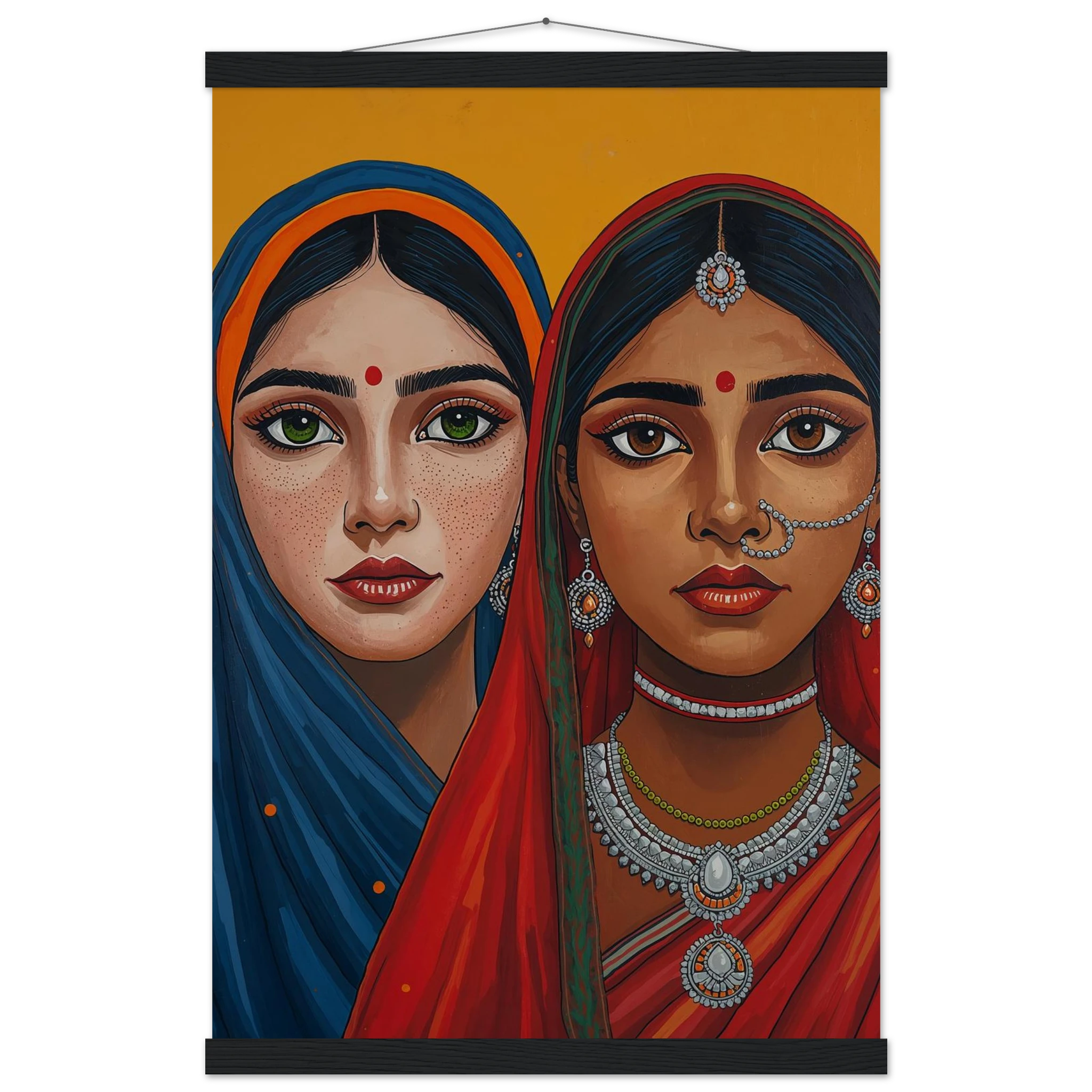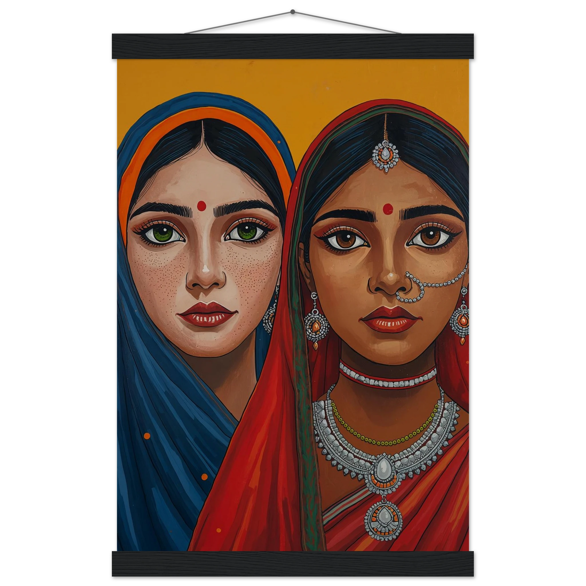 The woman on the left is draped in a deep blue headscarf with an orange border, her large green eyes complemented by intricate silver earrings and necklaces. Beside her, the second woman wears a vivid red headscarf with a green border, featuring a traditional silver nose ring and matching jewellery. Both subjects, with their rich brown skin tones and sacred red bindis, exude a sense of grace and pride. This modern ethnic masterpiece is the perfect addition to a home that values cultural storytelling, vibrant colours, and the timeless elegance of Indian tradition.