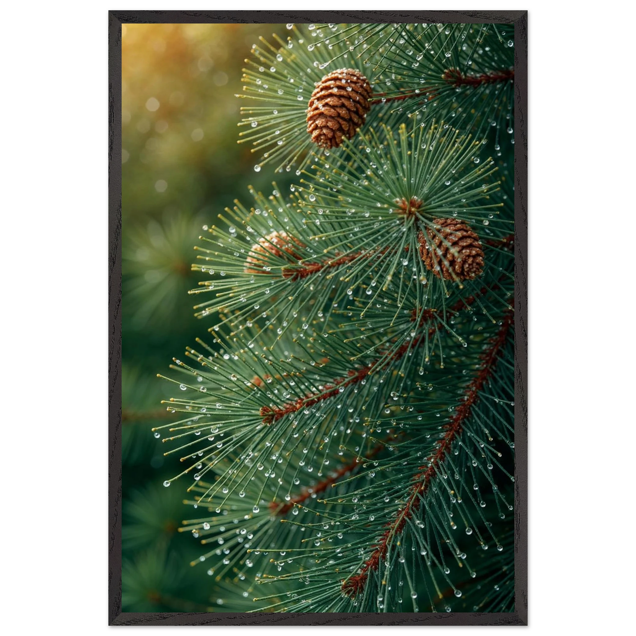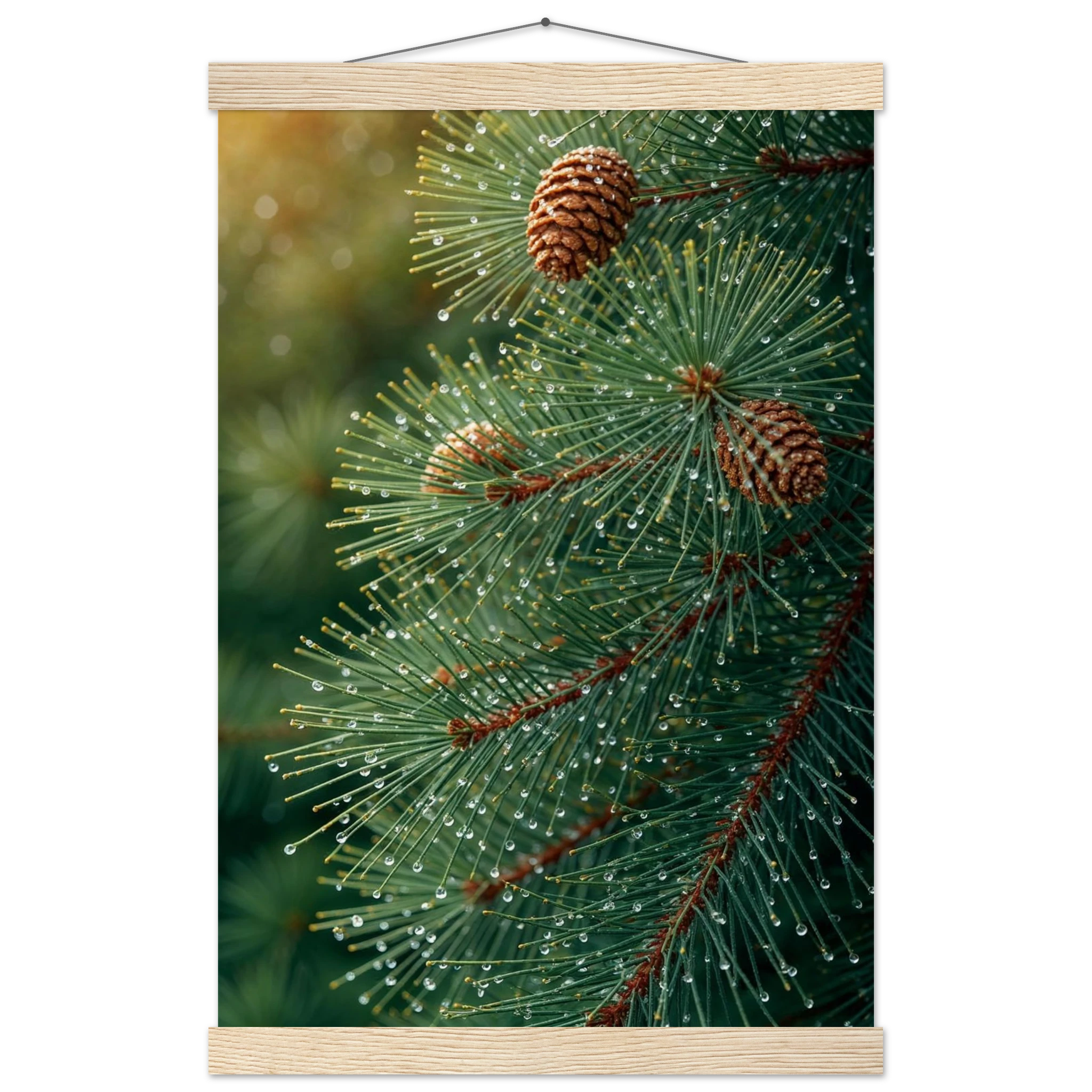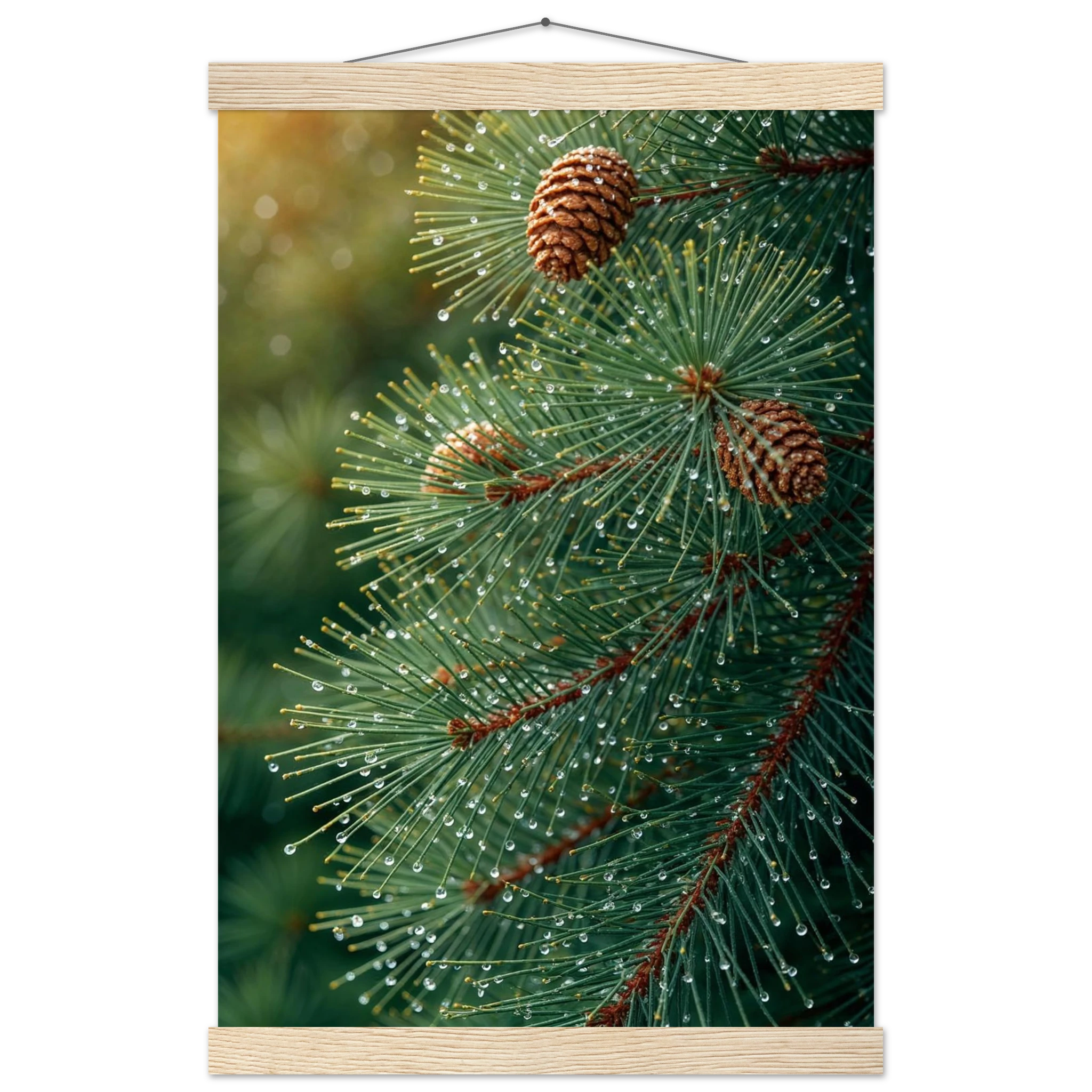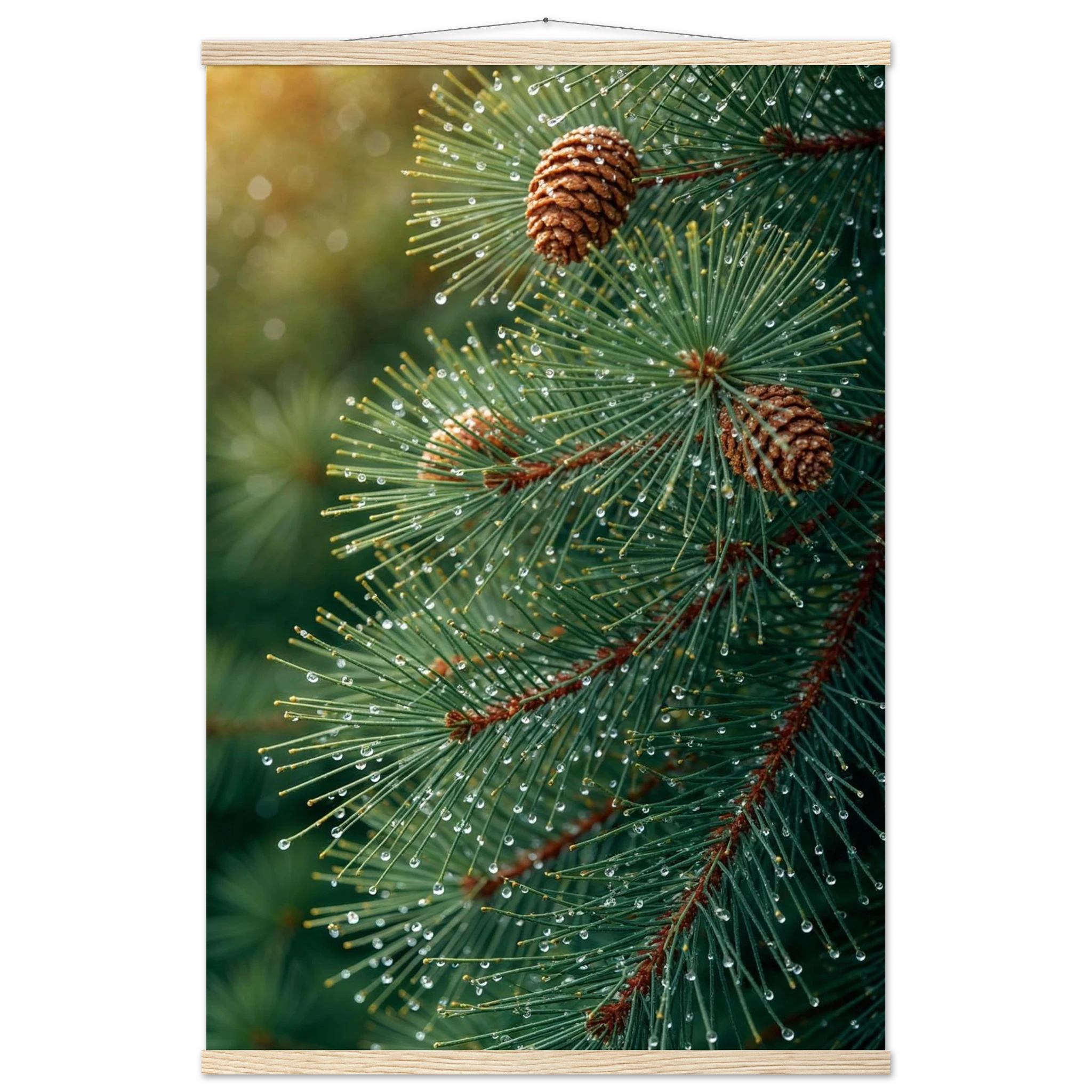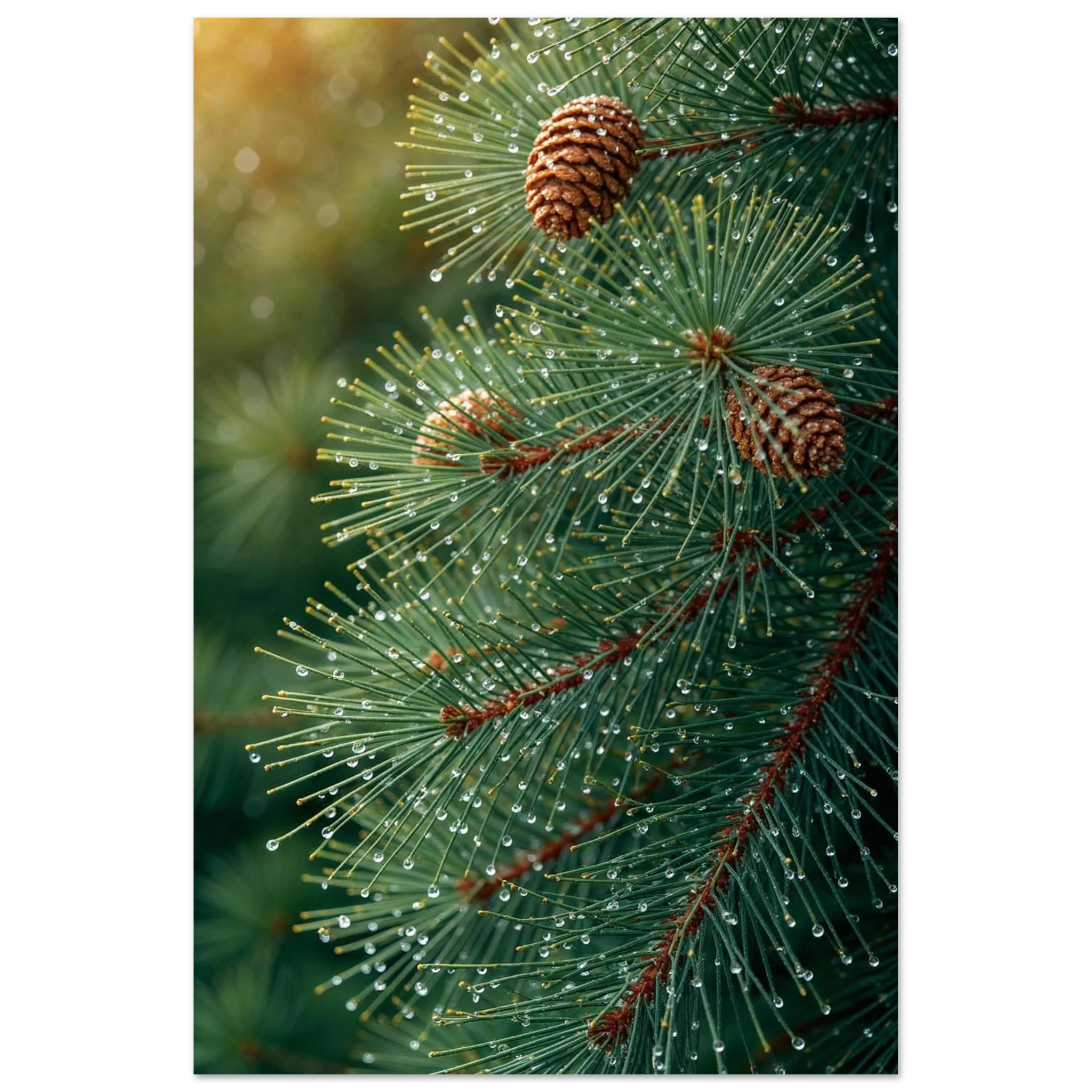 Pine Tree Branch Close Up: Vibrant Green Needles, Dewy Water Droplets, Rustic Nature Wall Art